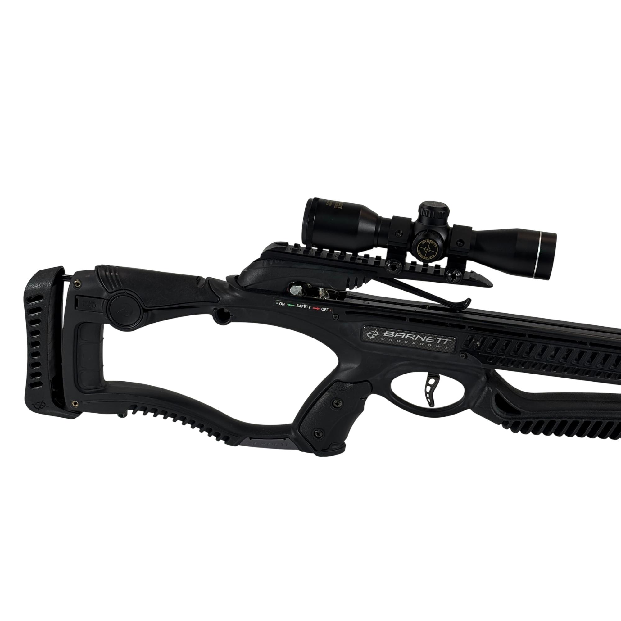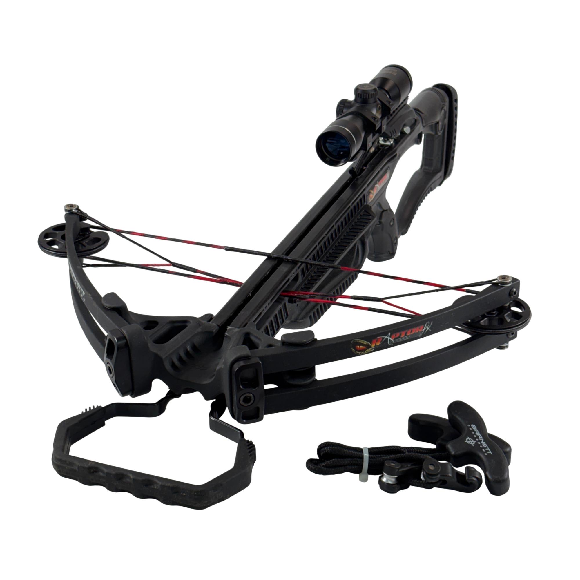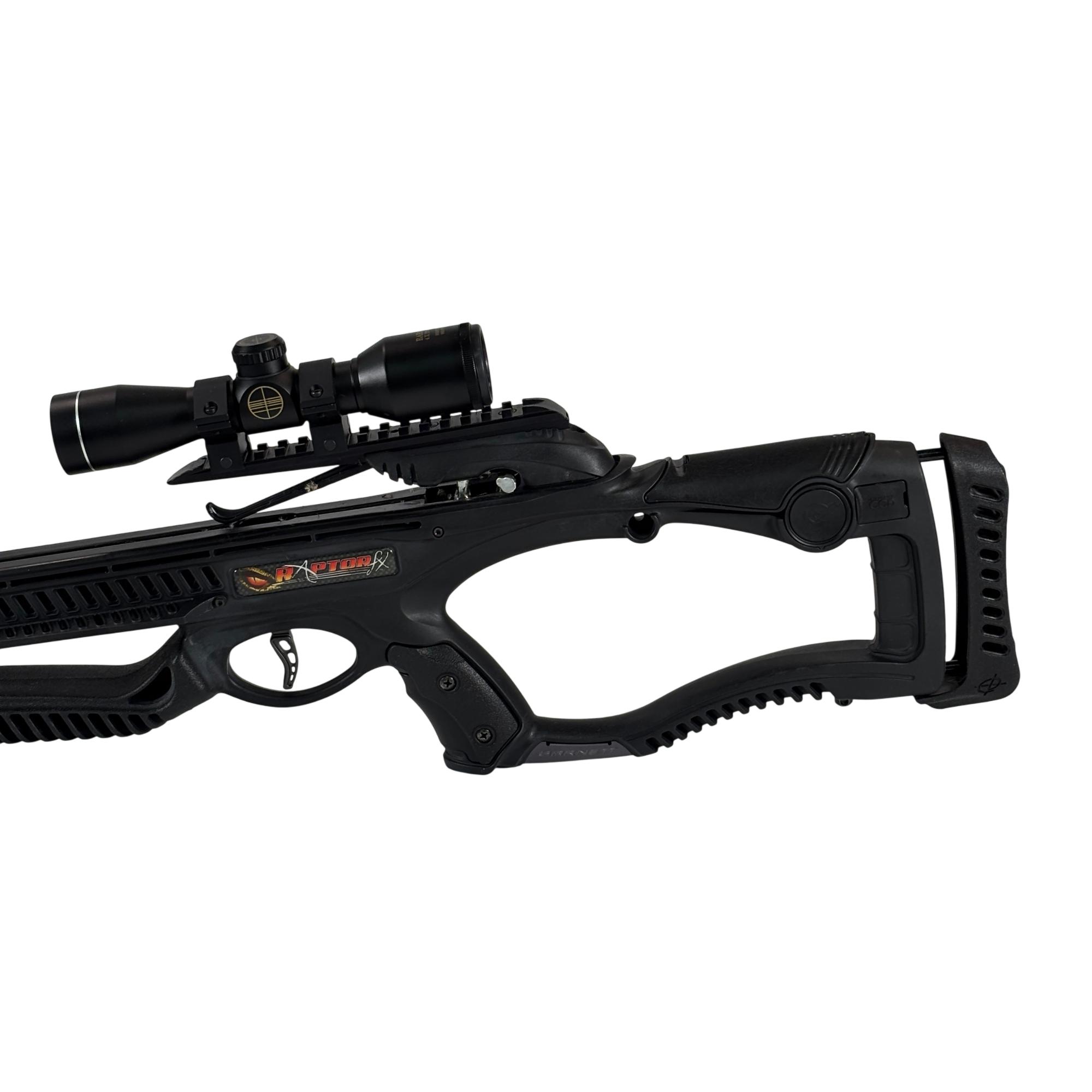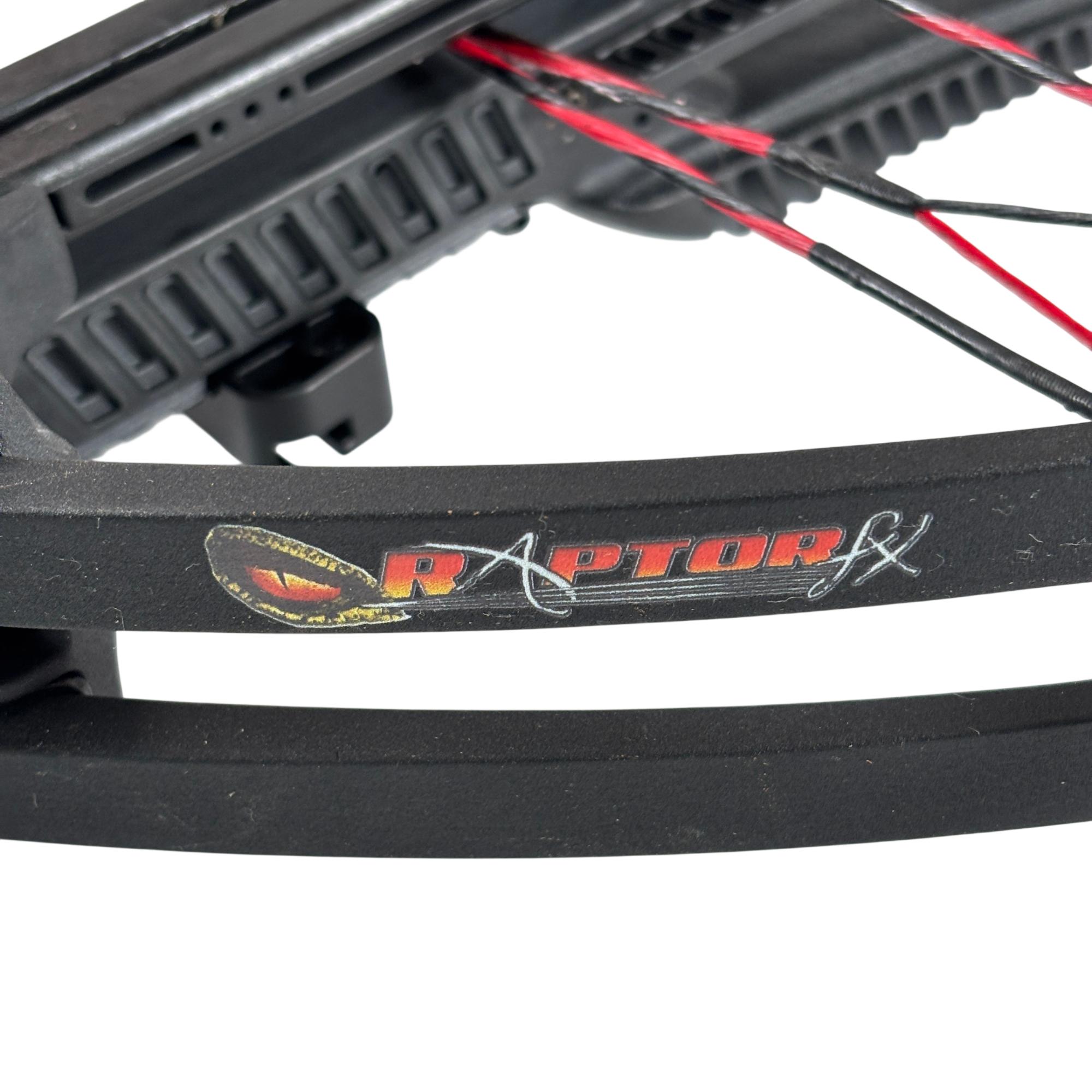 The Barnett Raptor FX compound crossbow is a lightweight and compact hunting crossbow designed for new and smaller-stature shooters without sacrificing performance. With a 150 lb draw weight, it delivers speeds up to 330 fps and strong kinetic energy through an efficient cam system and shorter power stroke that makes cocking easier. Safety-focused features like a pass-through foregrip and finger reminders, along with an adjustable butt pad and Picatinny rail, provide comfort, control, and adaptability for a wide range of users.