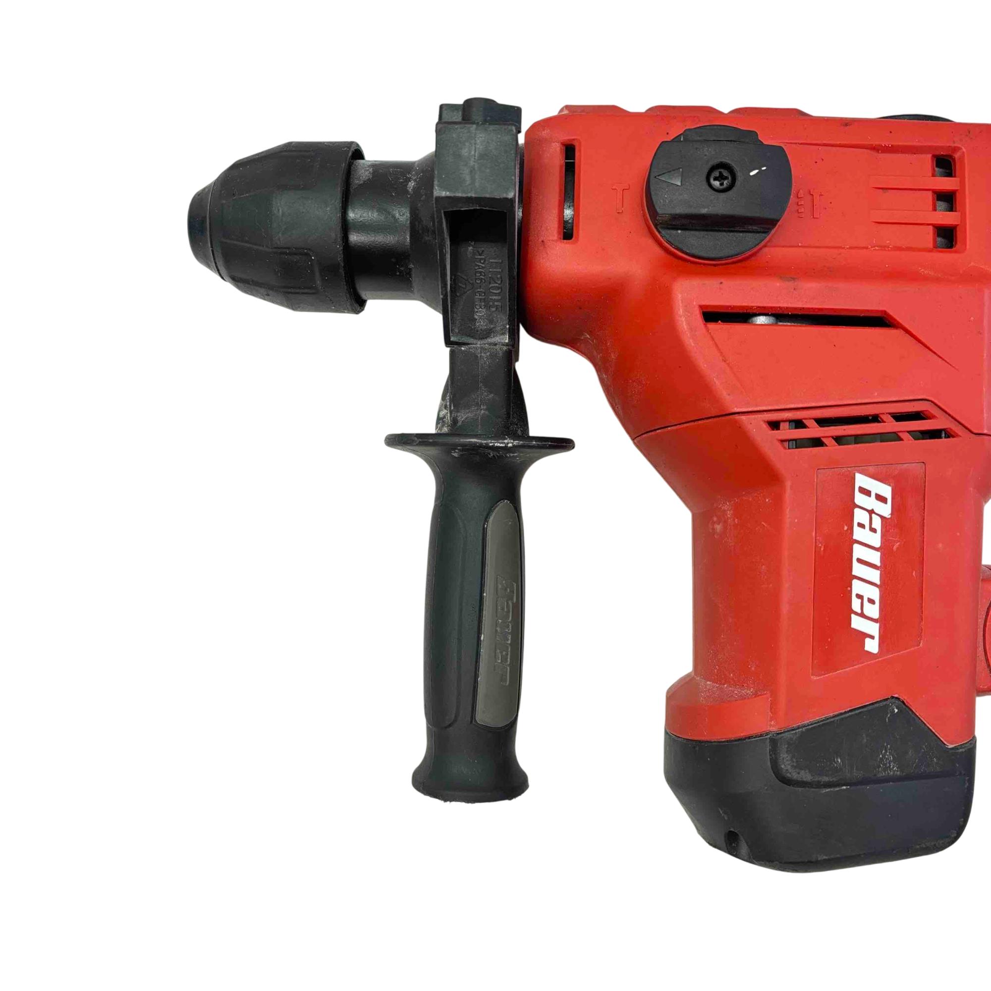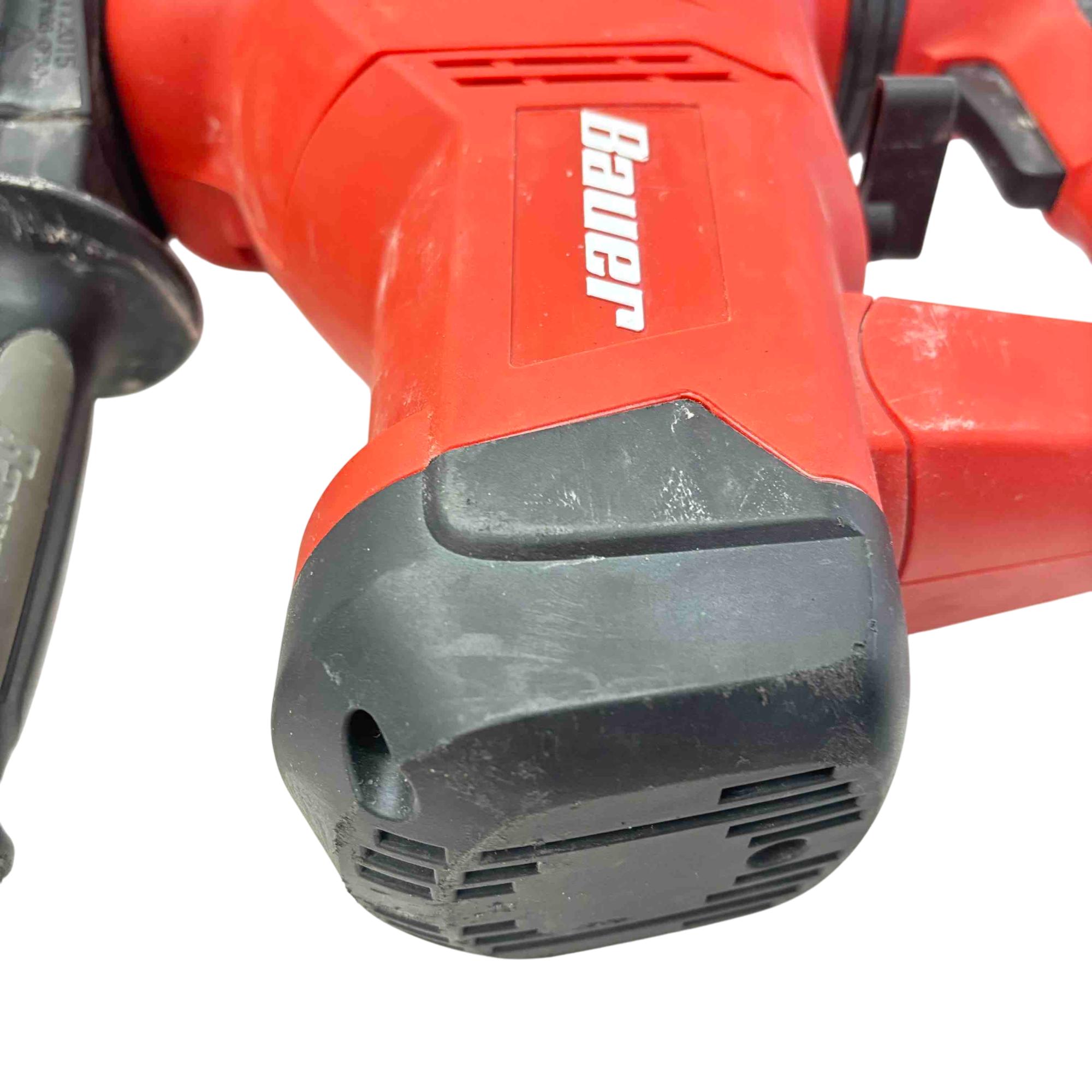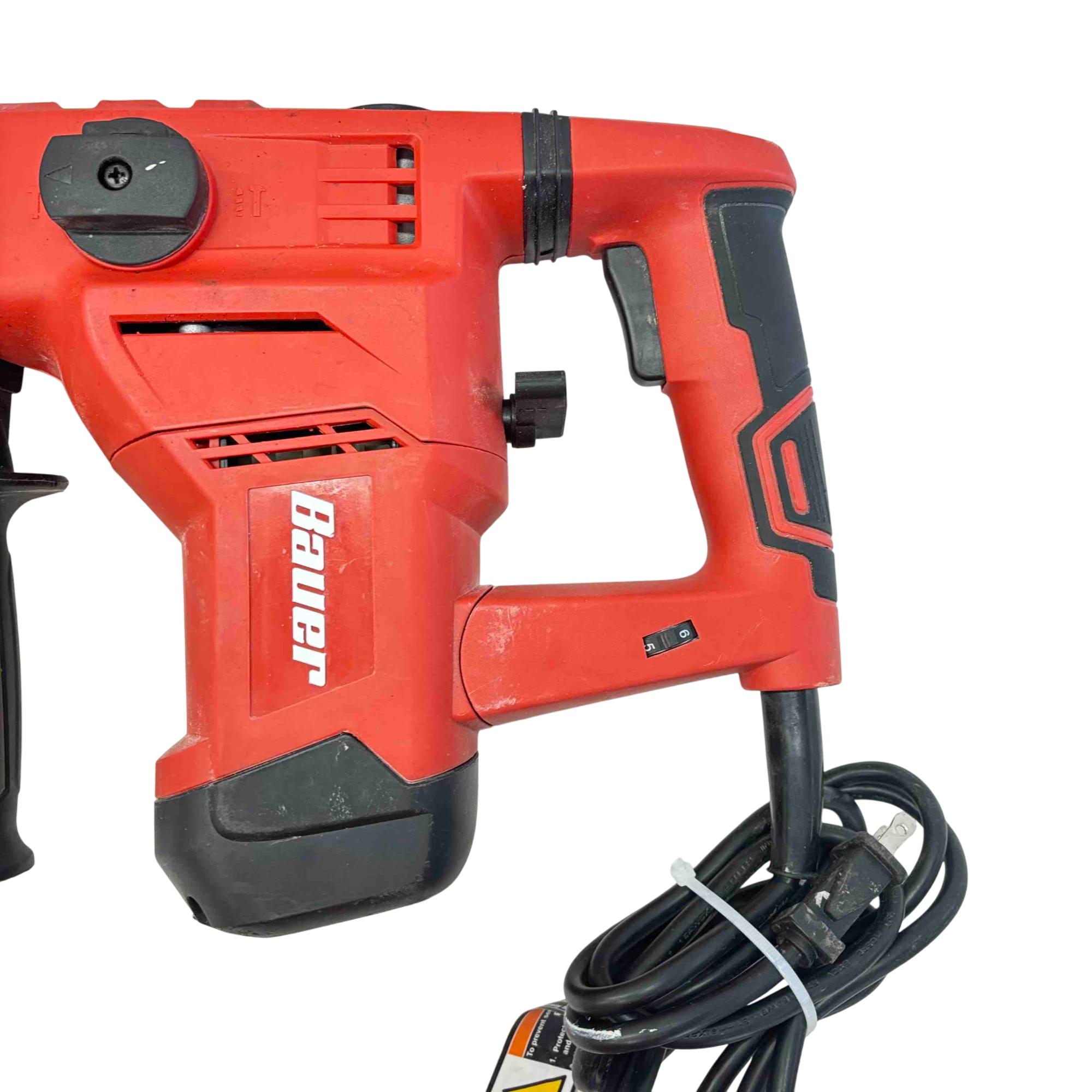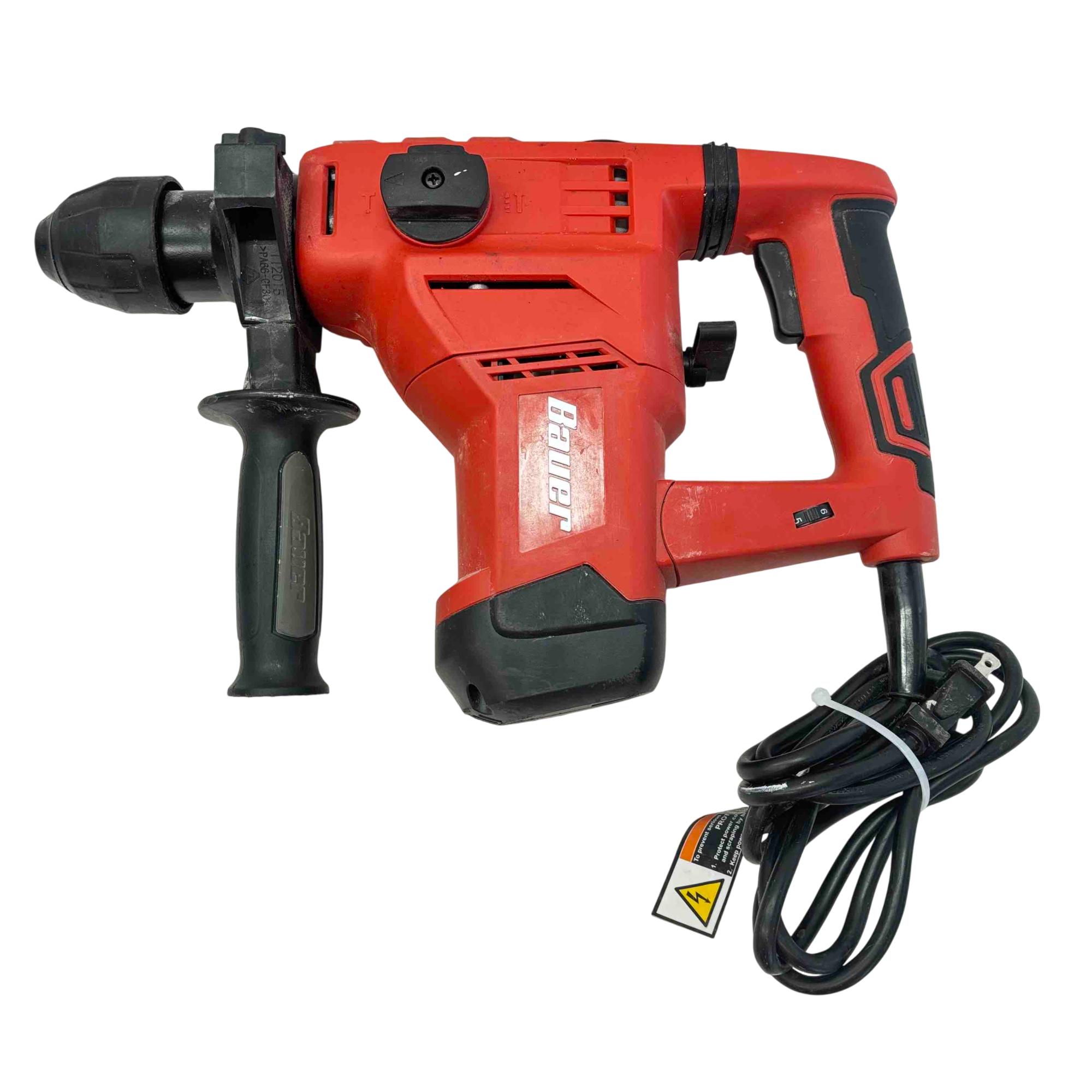 Bauer Rotary Hammer Drill is pre-owned and in good working condition with scratches and marks on the body of the tool from previous use. Drill has been tested and works well