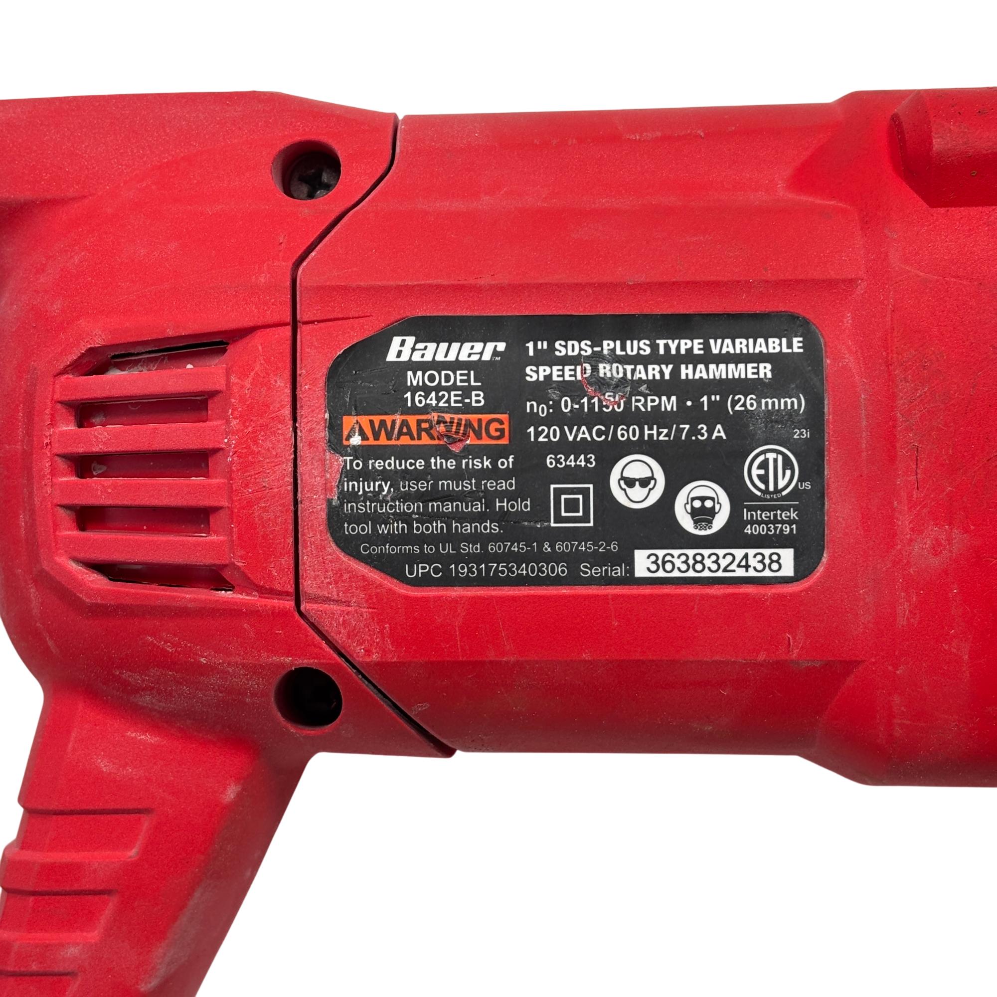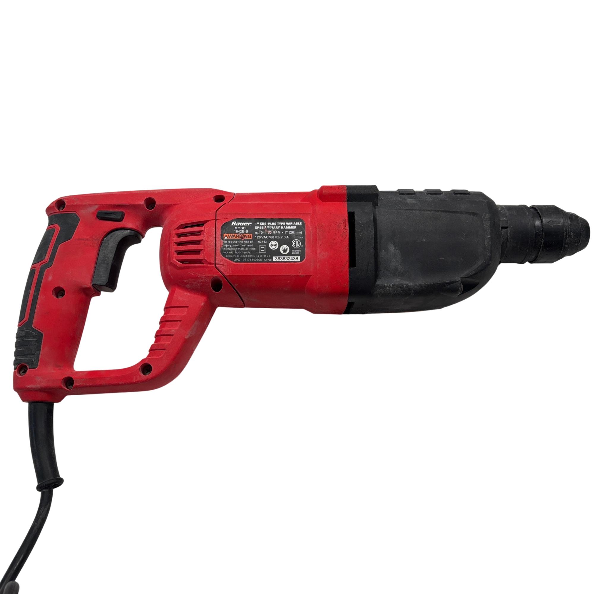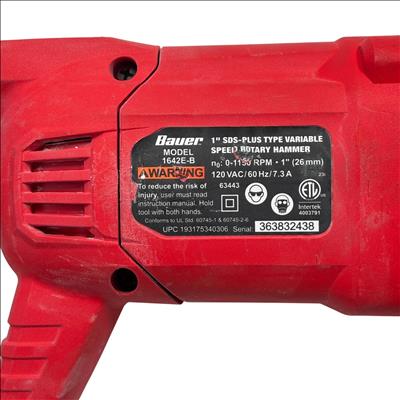 The Bauer 1642E-B 7.3A 1" SDS-Plus Variable-Speed Corded Rotary Hammer delivers powerful and precise performance for heavy-duty drilling and chiseling applications. Featuring a 7.3 amp motor with and SDS-Plus chuck system, it allows quick bit changes and variable speed control for versatility in concrete, brick, and masonry work. This rotary hammer is designed with ergonomic handling and durability to enhance productivity on demanding job sites.