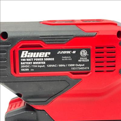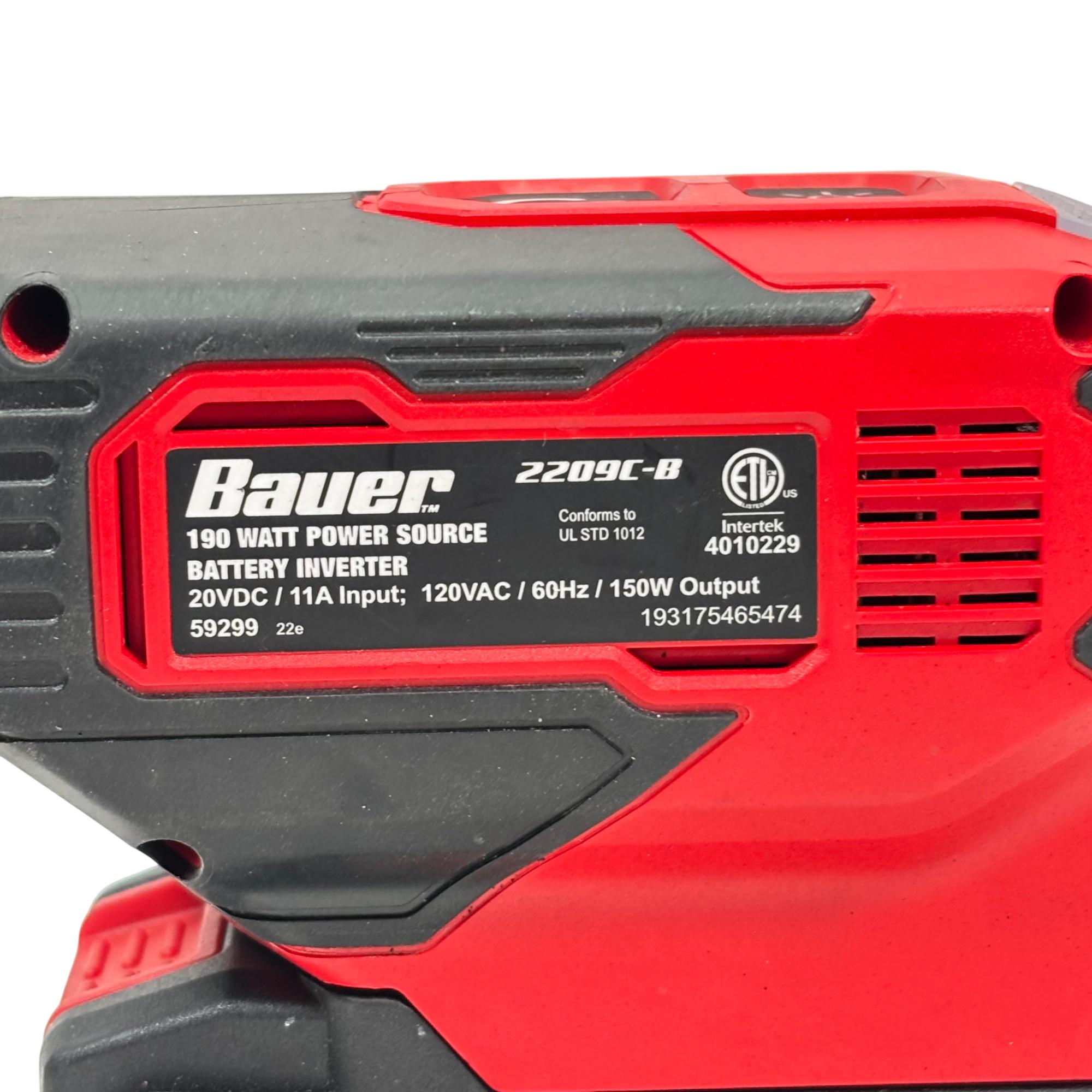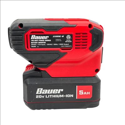Bauer 2209C-B 20V 190-Watt Power Source Battery Inverter delivers reliable power conversion with a compact and durable design featuring a red and black finish. Equipped with a powerful 5Ah lithium-ion battery, this inverter efficiently supports various electronic devices and tools, making it ideal for on-the-go power needs and remote work environments.