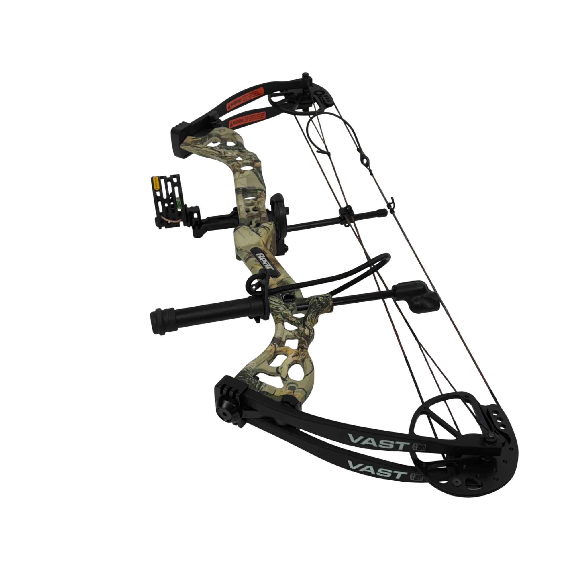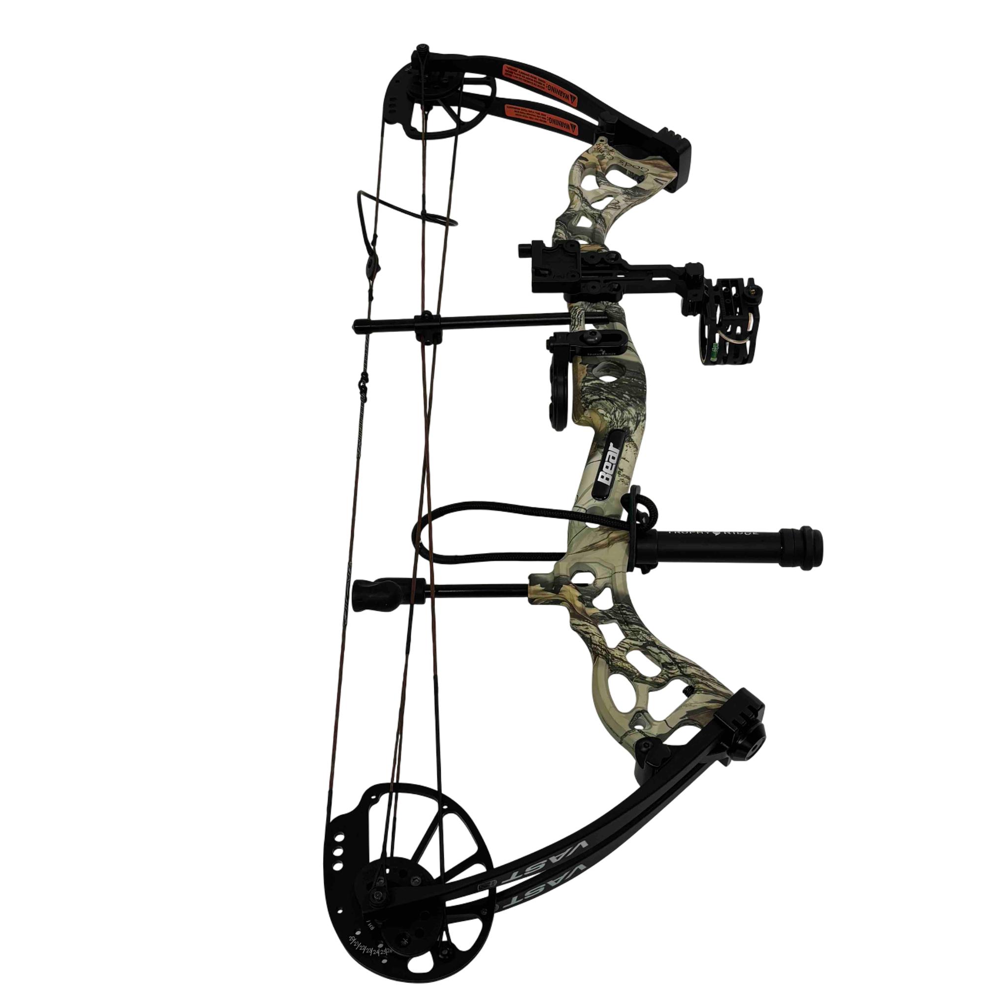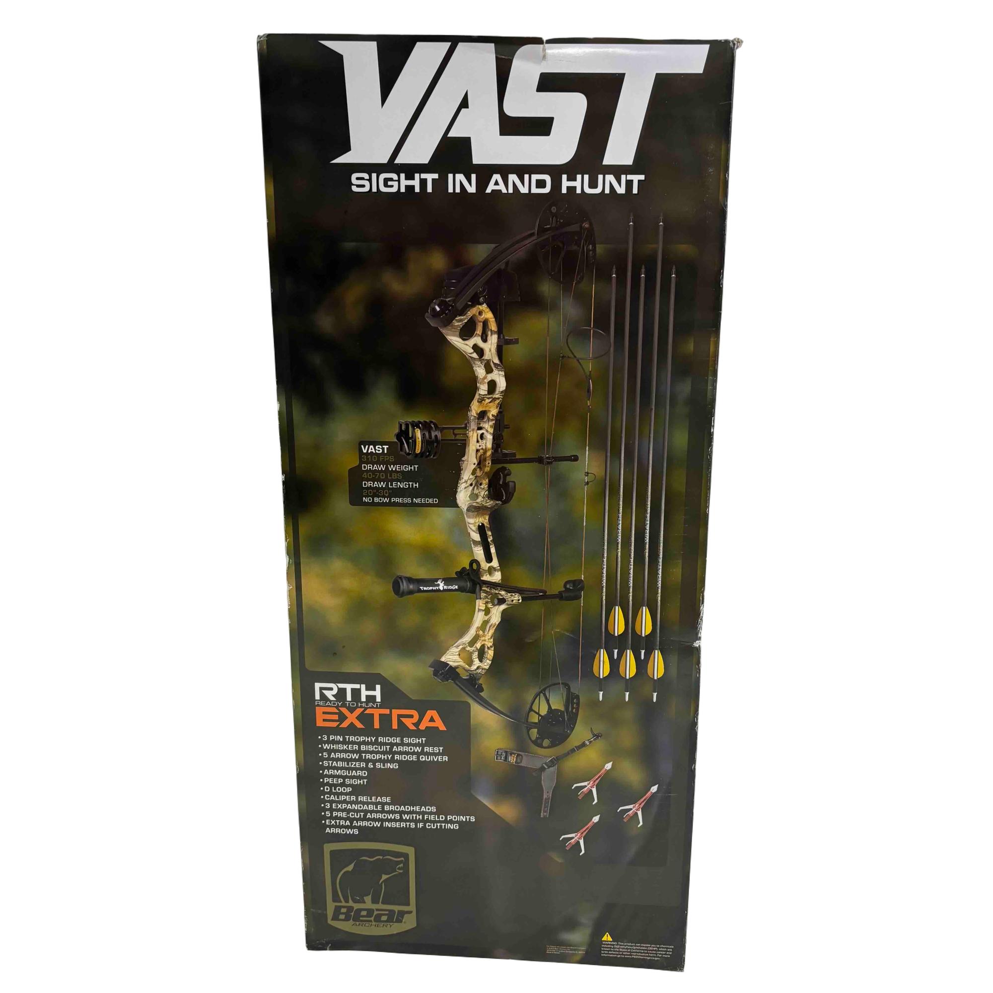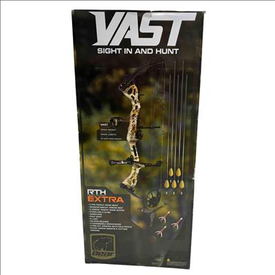 Experience the thrill of the hunt with the Bear Archery Vast RTH Extra Compound Bow Kit. This high-performance, Ready-to-Hunt package features an adjustable 40-70lbs draw weight and a 20"-30" draw length, reaching up to 310 FPS.