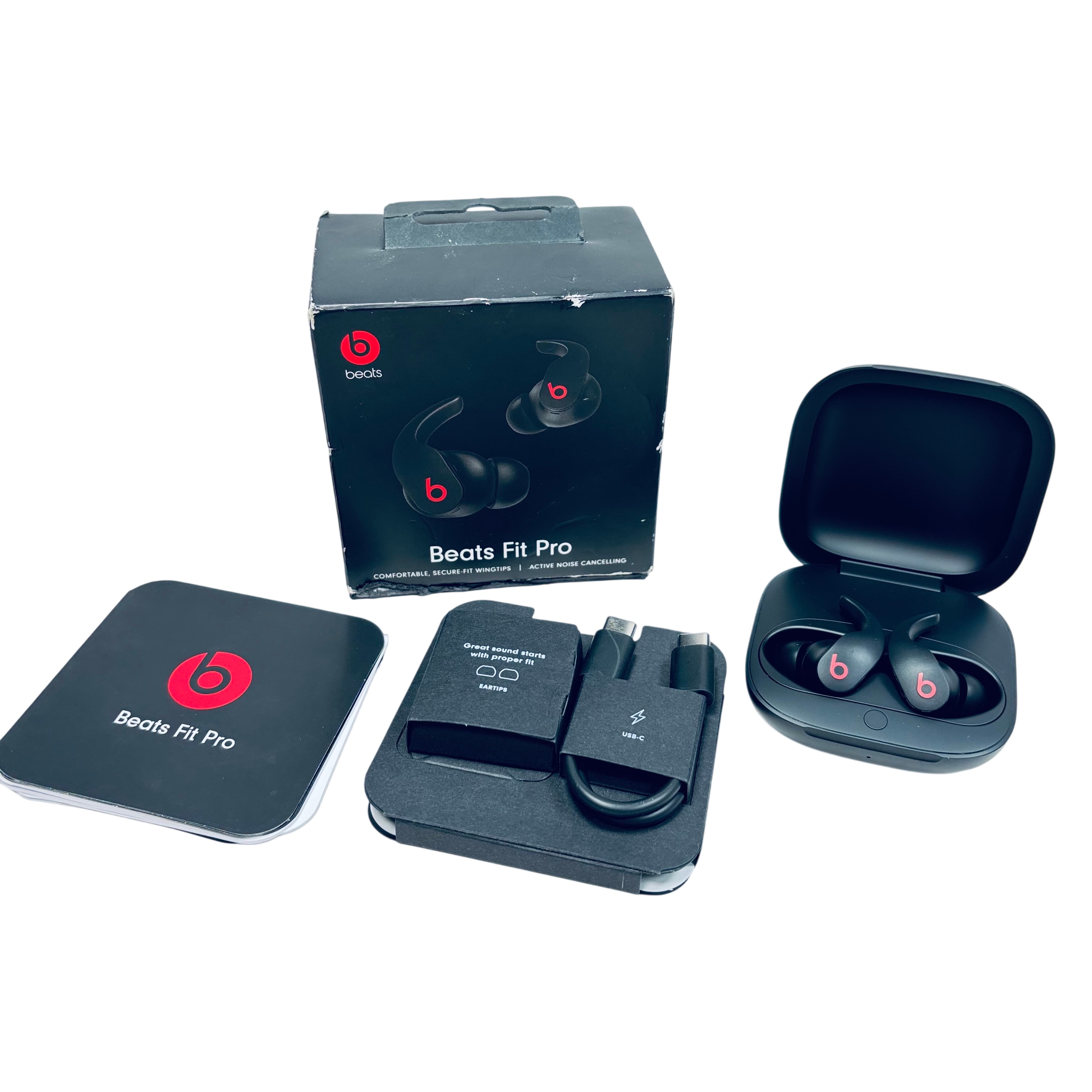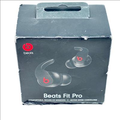Beats Fit Pro True Wireless Bluetooth Earbuds (Model A2578) deliver premium sound quality with active noise cancelling and a comfortable, secure-fit design featuring wingtip ear tips. These black earbuds offer up to 6 hours of listening time on a single charge, with an additional 18 hours provided by the included USB-C charging case for a total of 24 hours of playback. The package includes the earbuds, a USB-C charging cable, multiple ear tips, and a compact charging case, making them ideal for daily use, workouts, and travel.