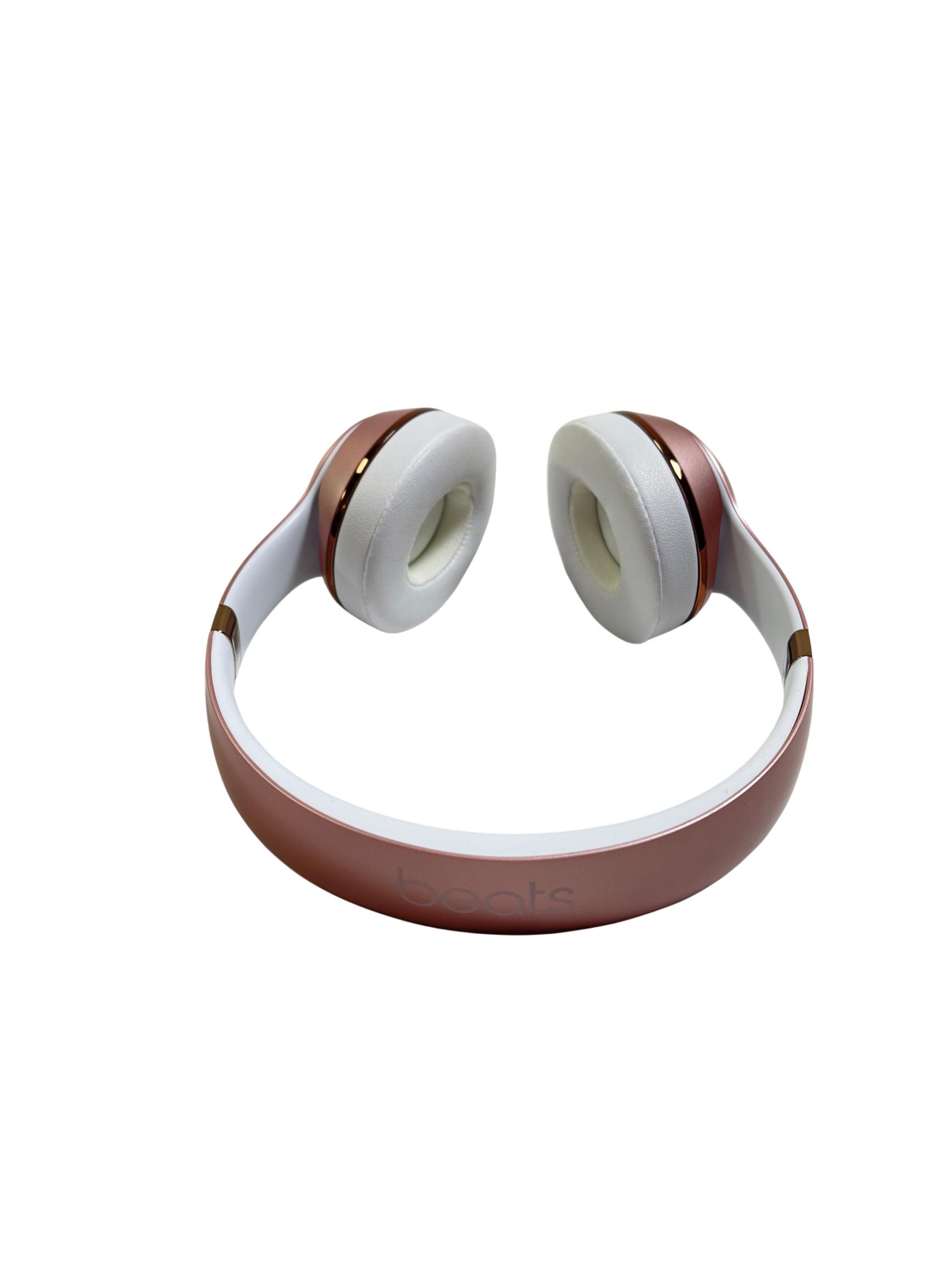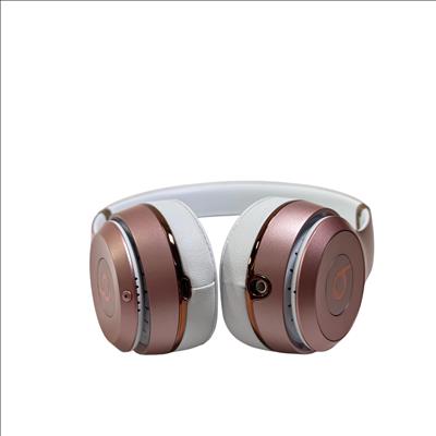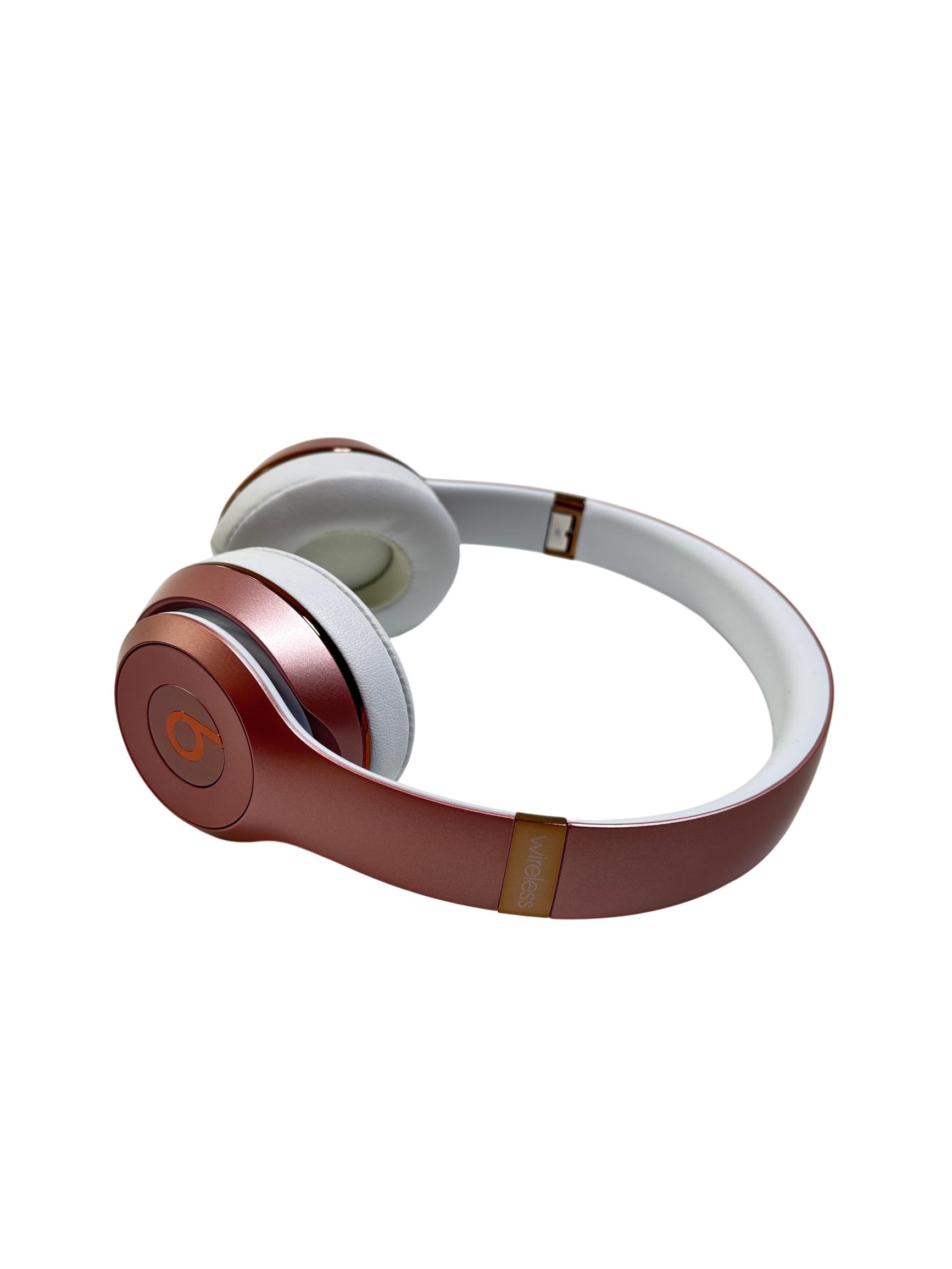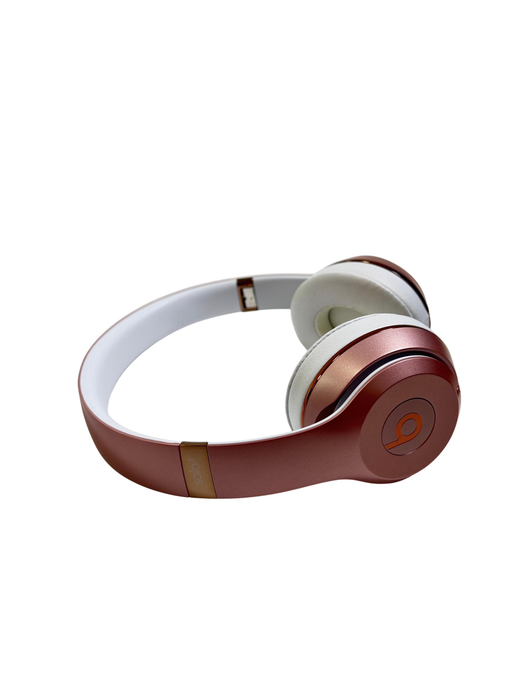 Beats Solo3 Wireless On-Ear Headphones Model A1796 in rose gold feature a sleek design with a combination of metal and polished finishes, delivering high-quality sound with Bluetooth connectivity. These on-ear headphones provide a comfortable fit and are designed to offer rich audio performance with clear mids and deep bass, making them ideal for everyday listening and commuting.
