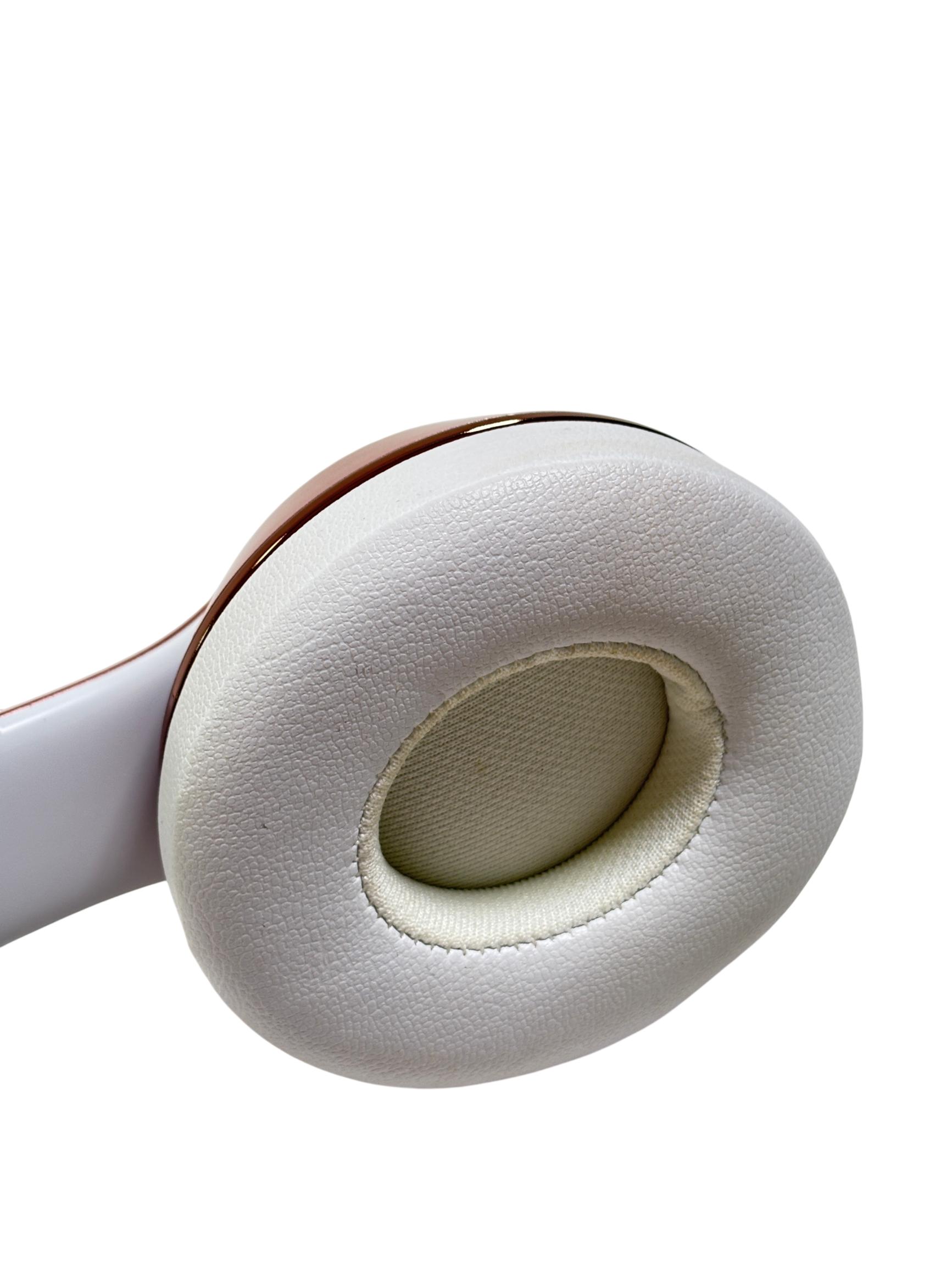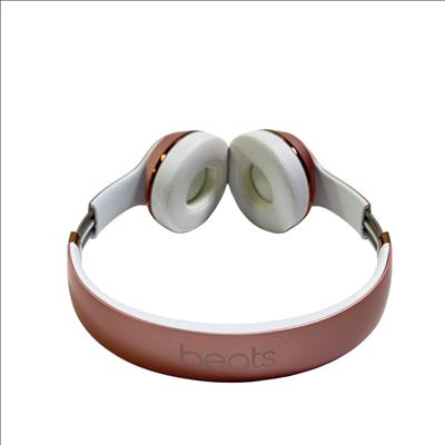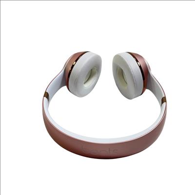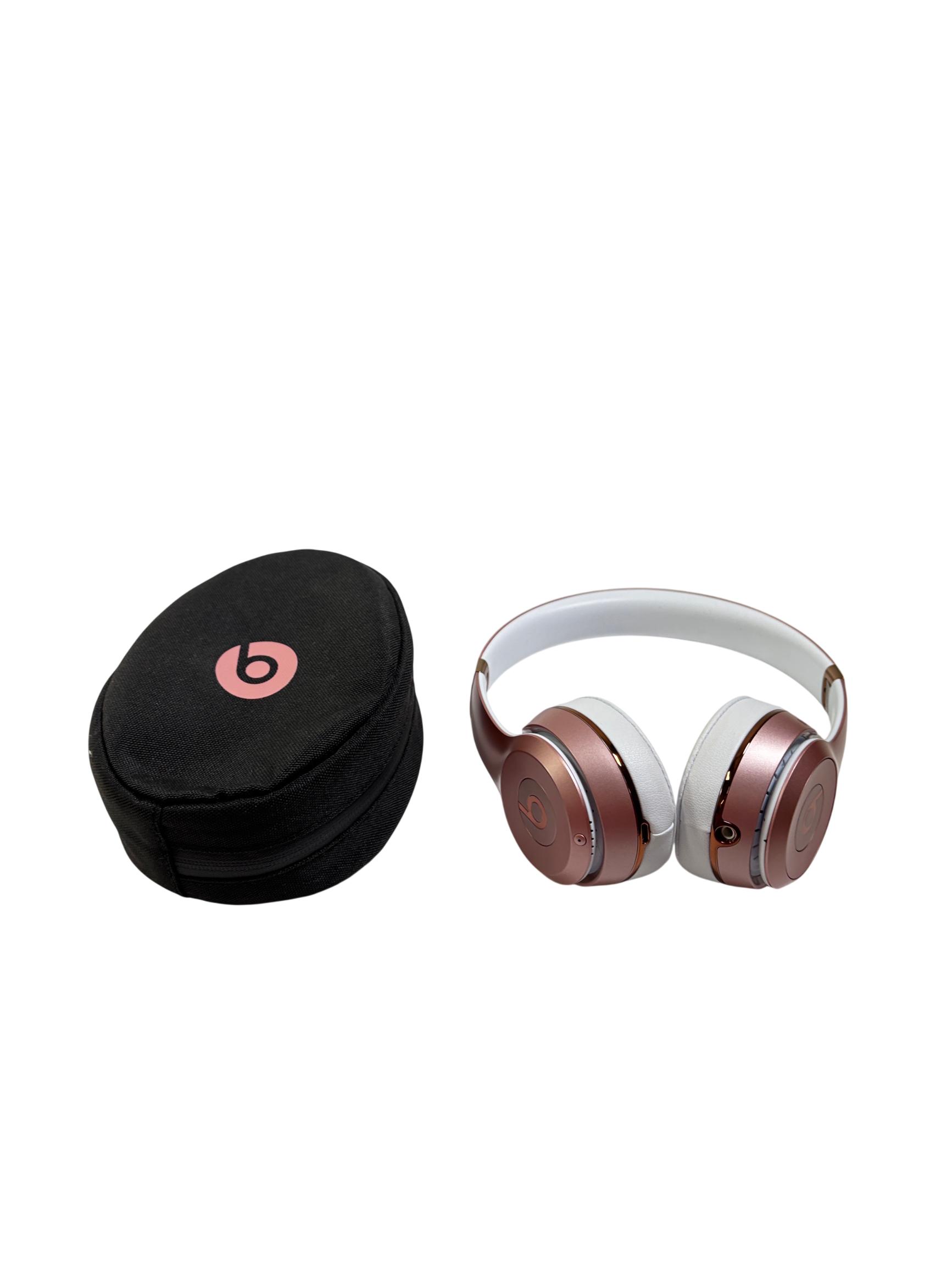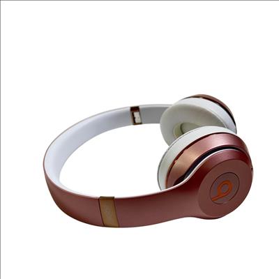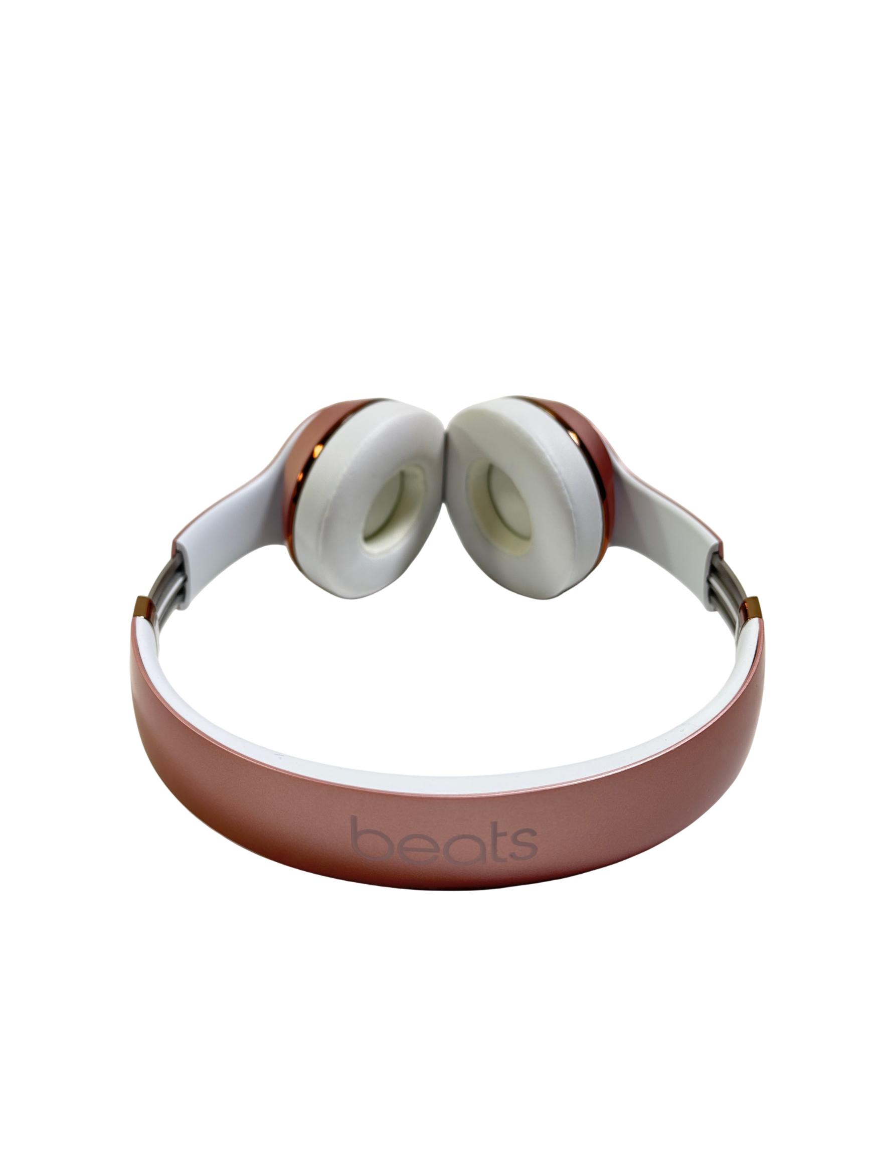 Beats Solo3 Wireless On-Ear Headphones Model A1796 in rose gold feature a sleek design with a combination of metal and polished finishes, delivering high-quality sound with Bluetooth connectivity. These on-ear headphones provide a comfortable fit and are designed to offer rich audio performance with clear mids and deep bass, making them ideal for everyday listening and commuting.