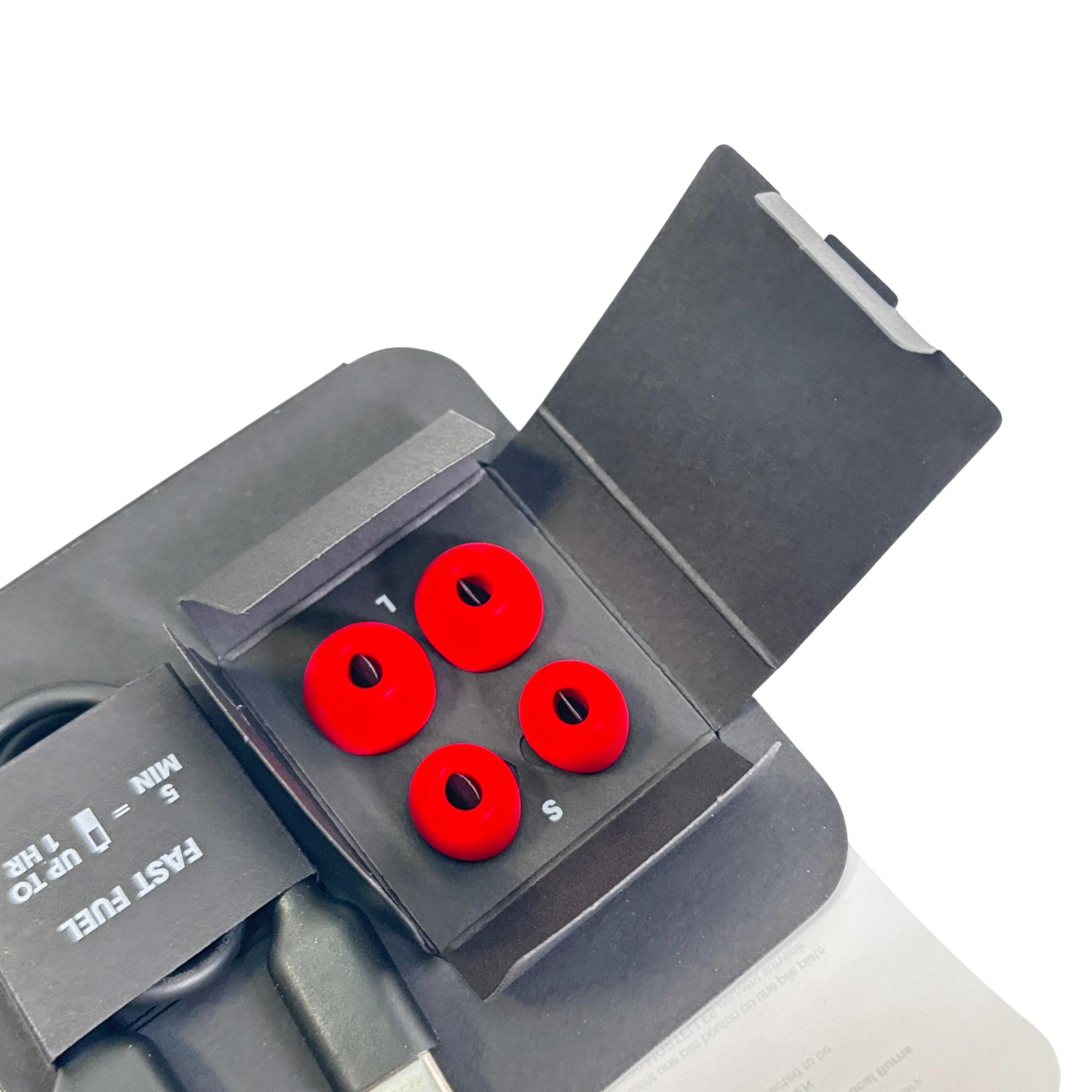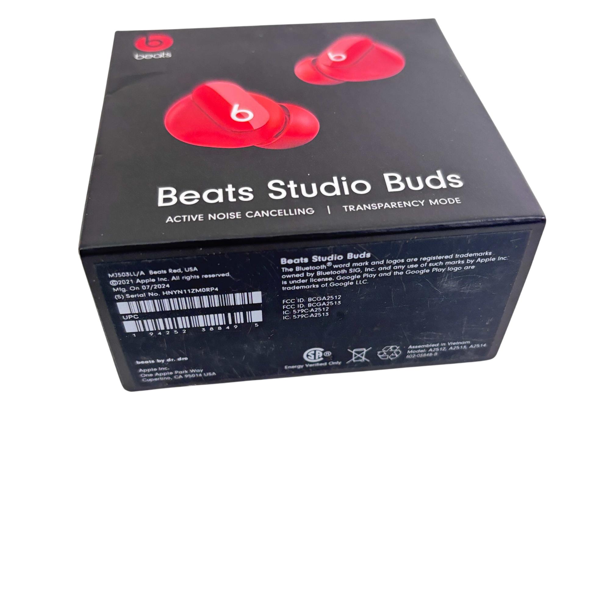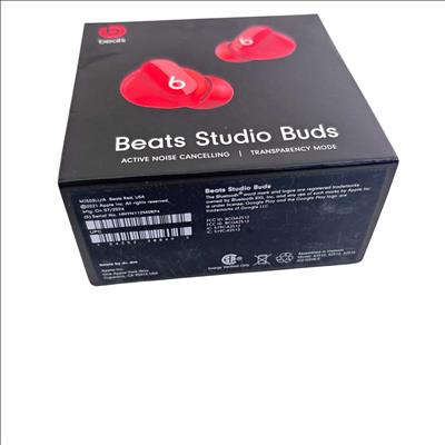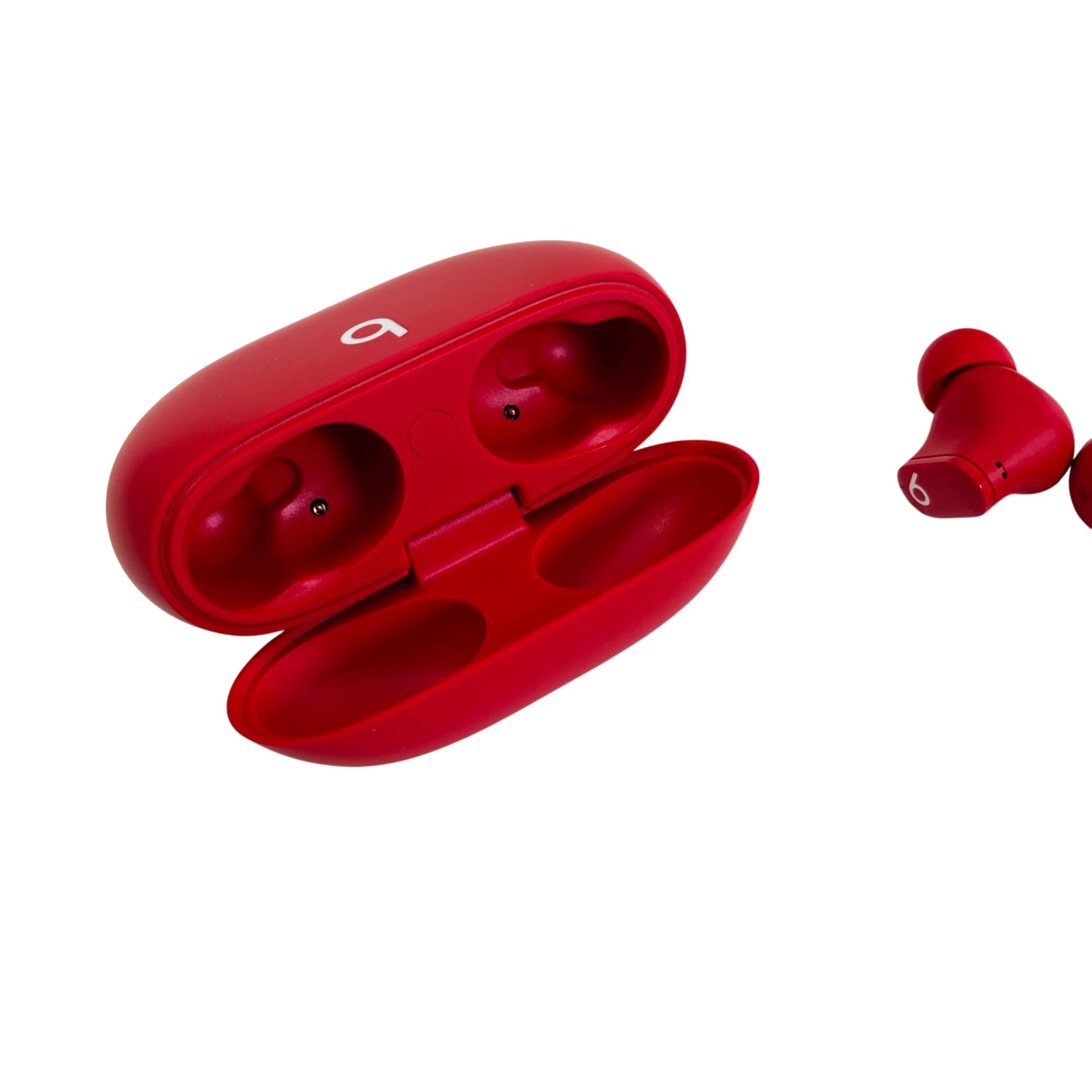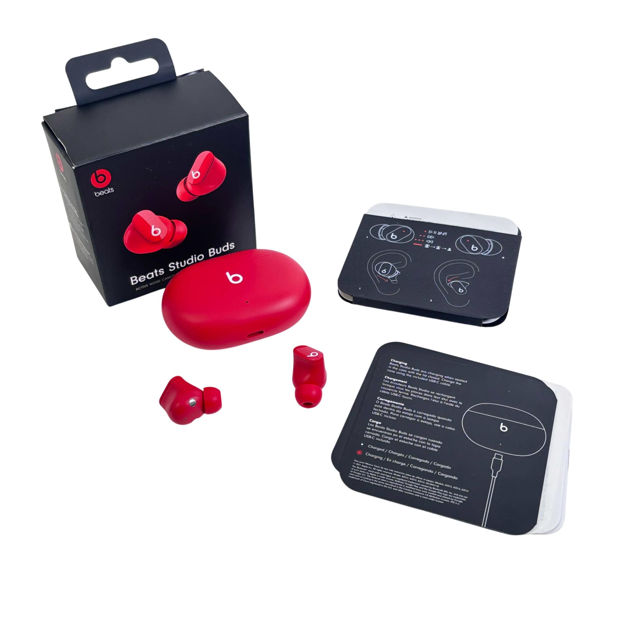Beats Studio Buds True Wireless Earbuds in vibrant red offer active noise cancelling and transparency mode for an immersive listening experience. Designed for comfort and secure fit, these earbuds feature Bluetooth wireless connectivity and deliver rich, high-quality sound suitable for everyday use.