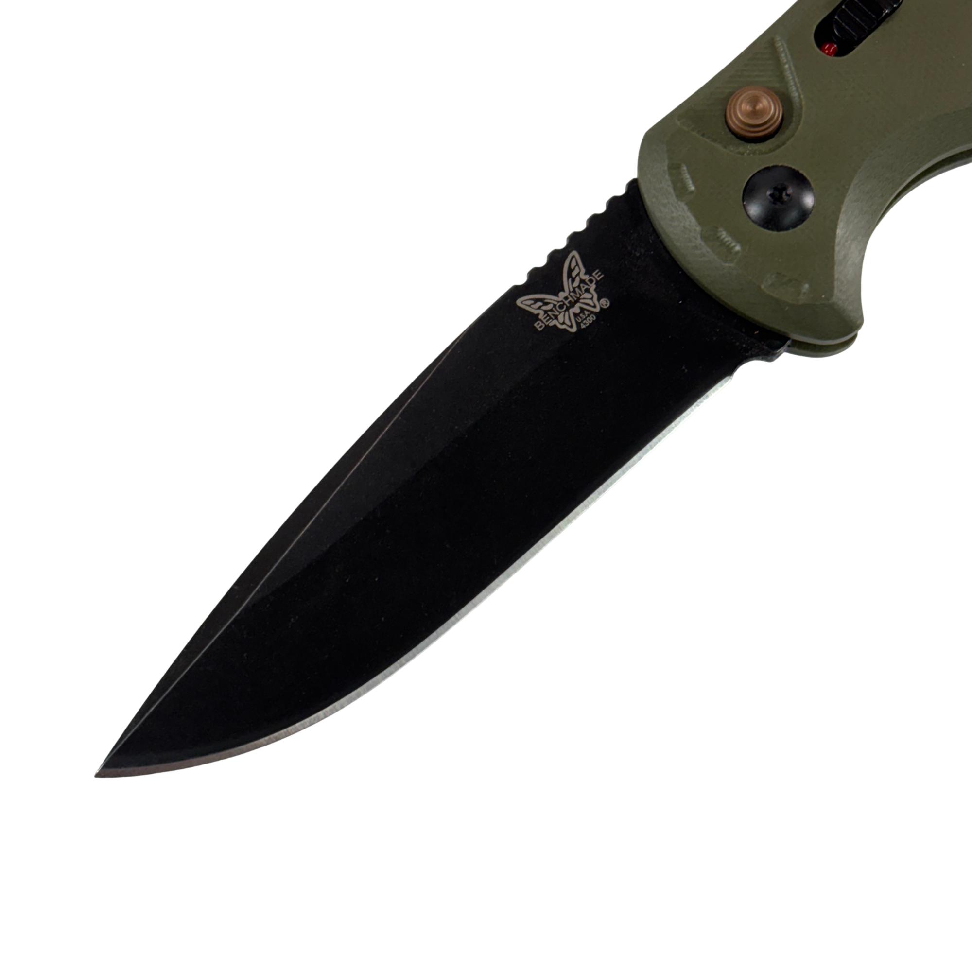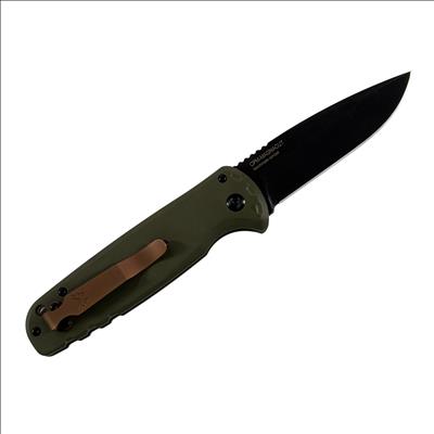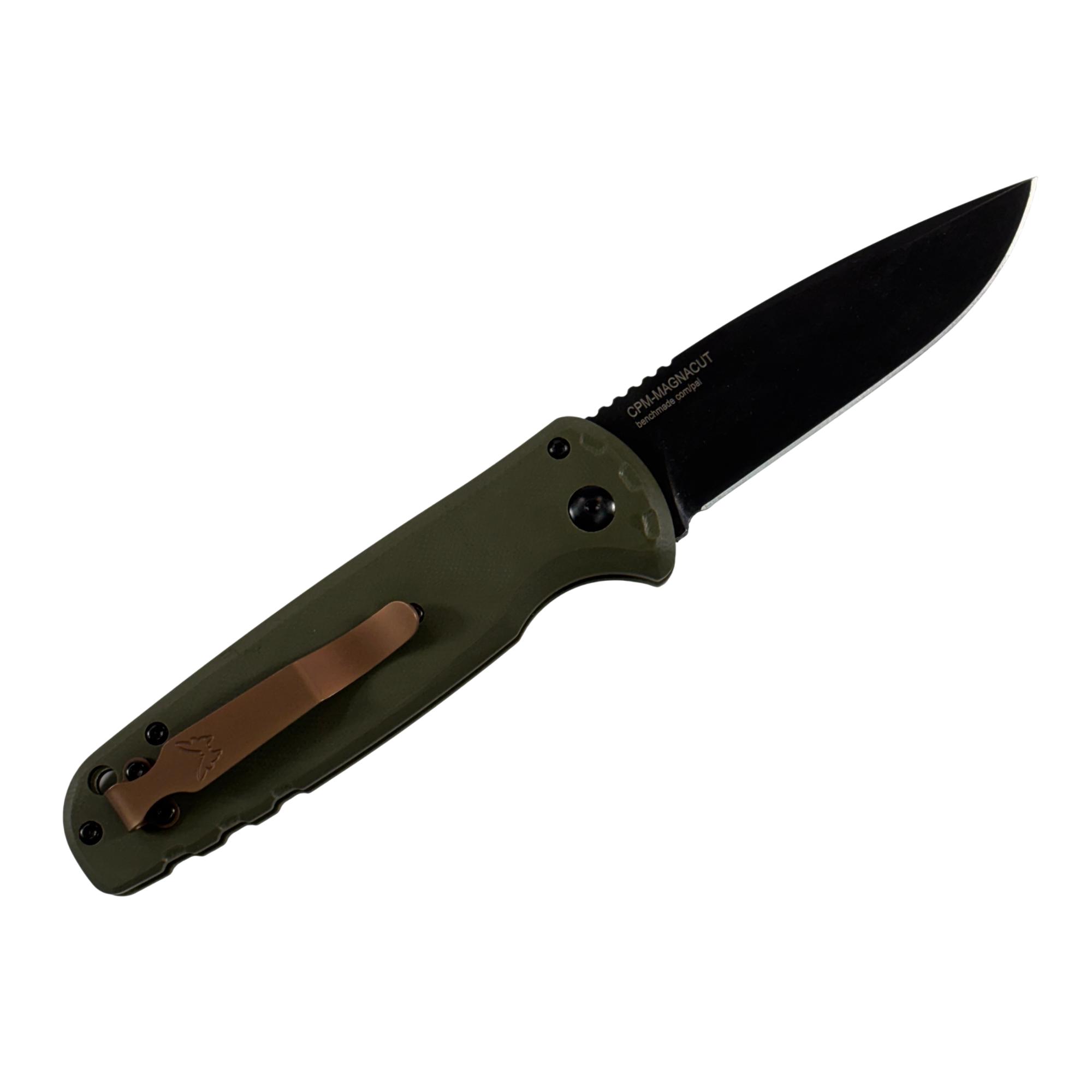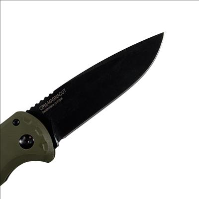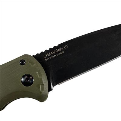 Compact and lightweight automatic folding knife featuring a 3.4" drop-point blade made from durable MagnaCut stainless steel with a black DLC battlewash finish. The push-button automatic action includes an integrated safety for secure handling, while the OD green G10 handle provides a solid, textured grip in a slim 4.45" closed profile.