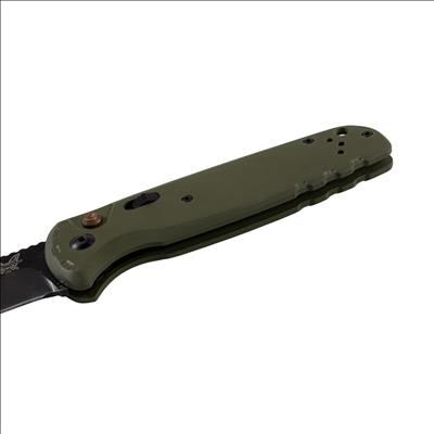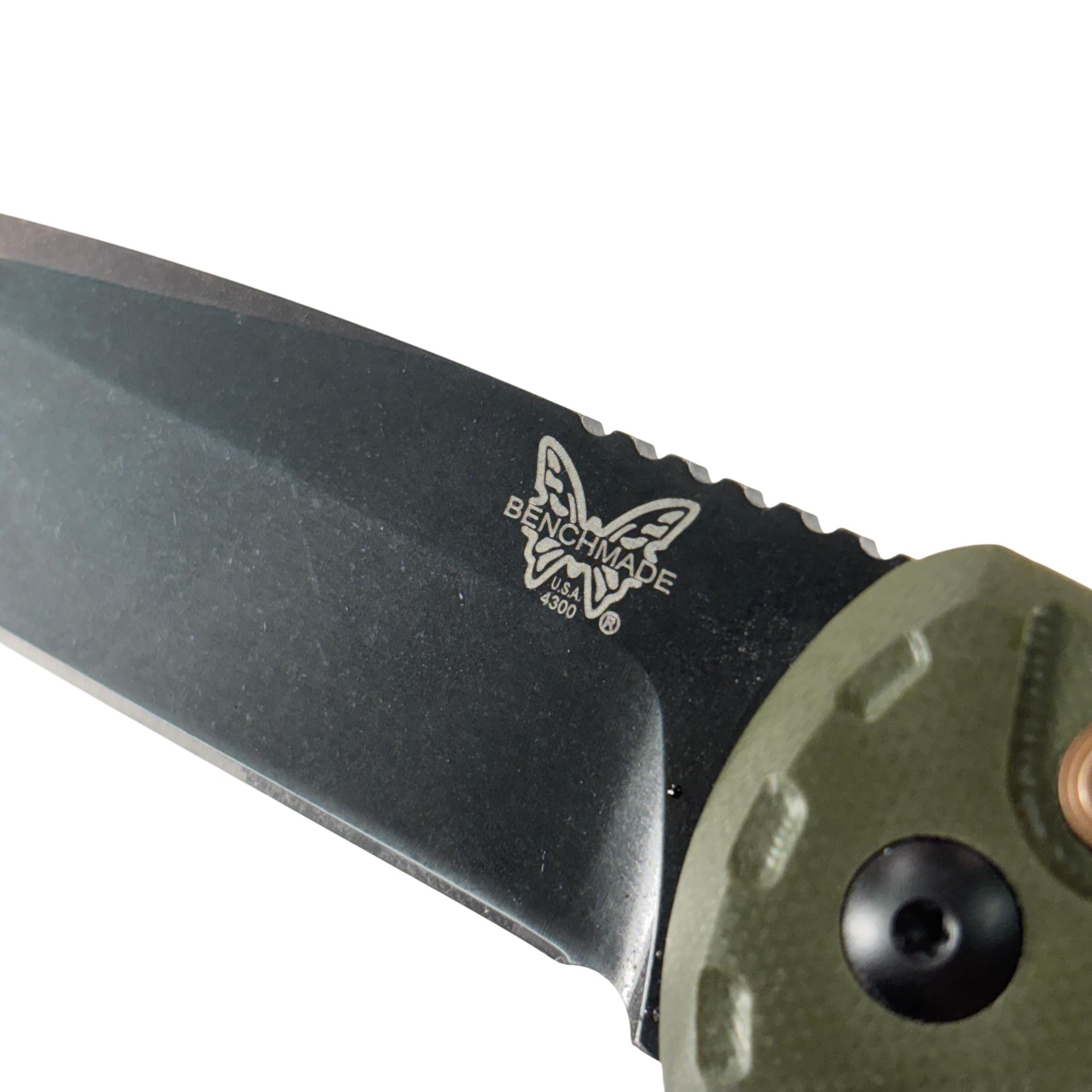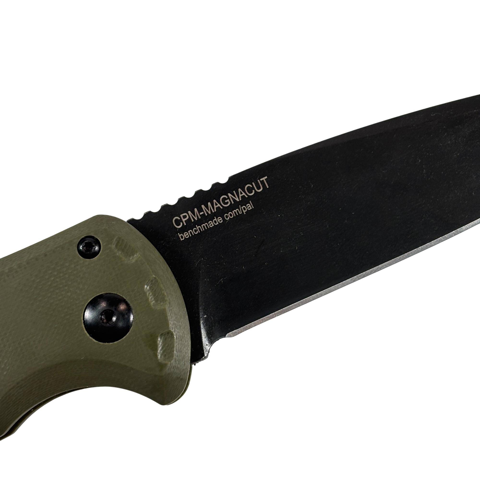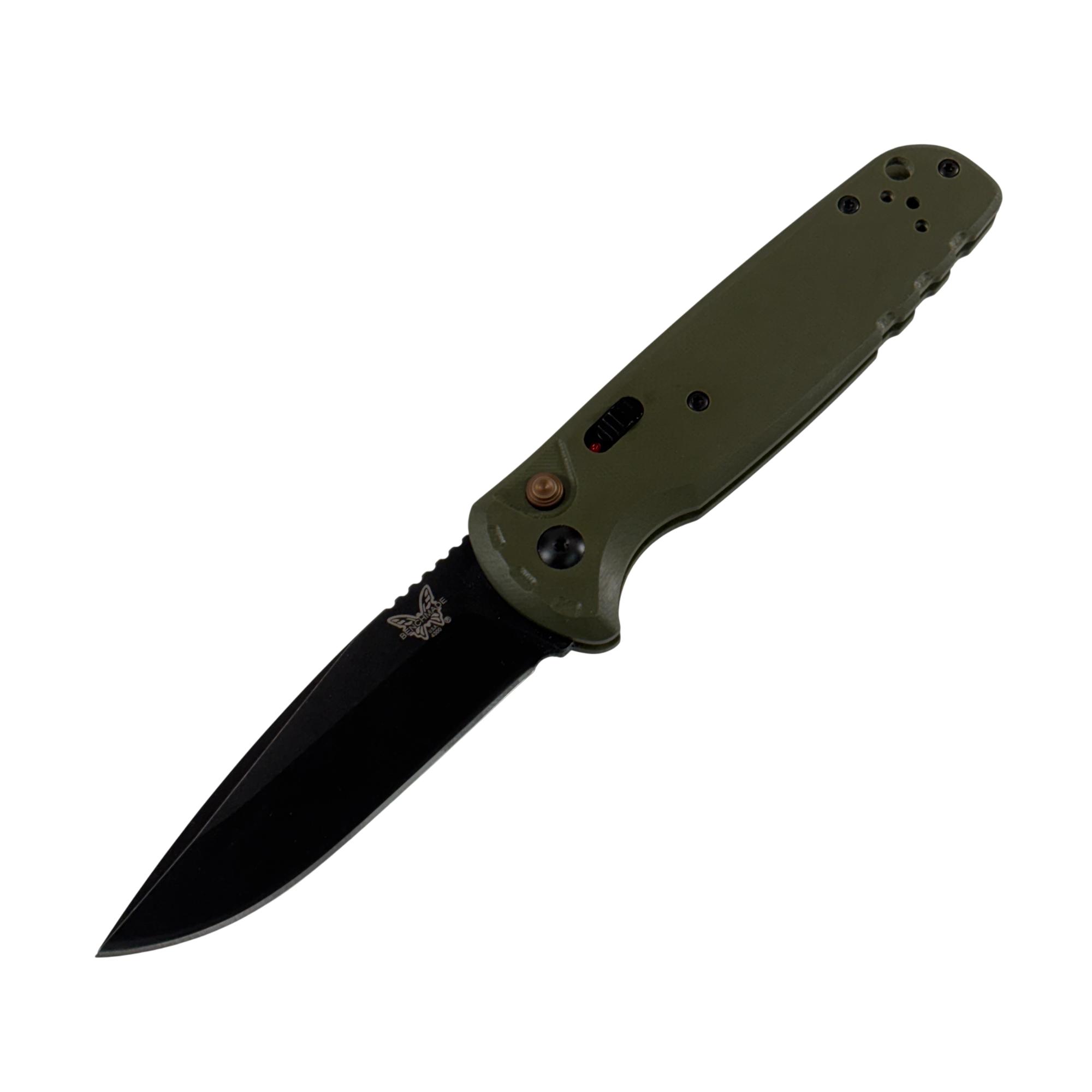 Compact and lightweight automatic folding knife featuring a 3.4" drop-point blade made from durable MagnaCut stainless steel with a black DLC battlewash finish. The push-button automatic action includes an integrated safety for secure handling, while the OD green G10 handle provides a solid, textured grip in a slim 4.45" closed profile.