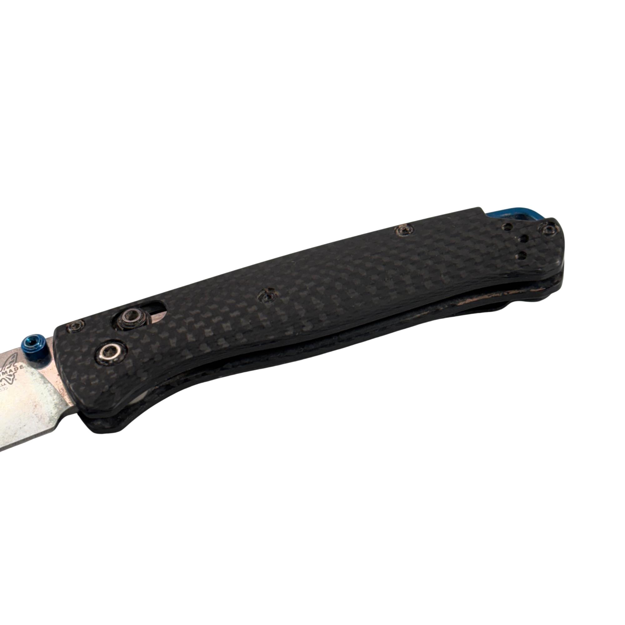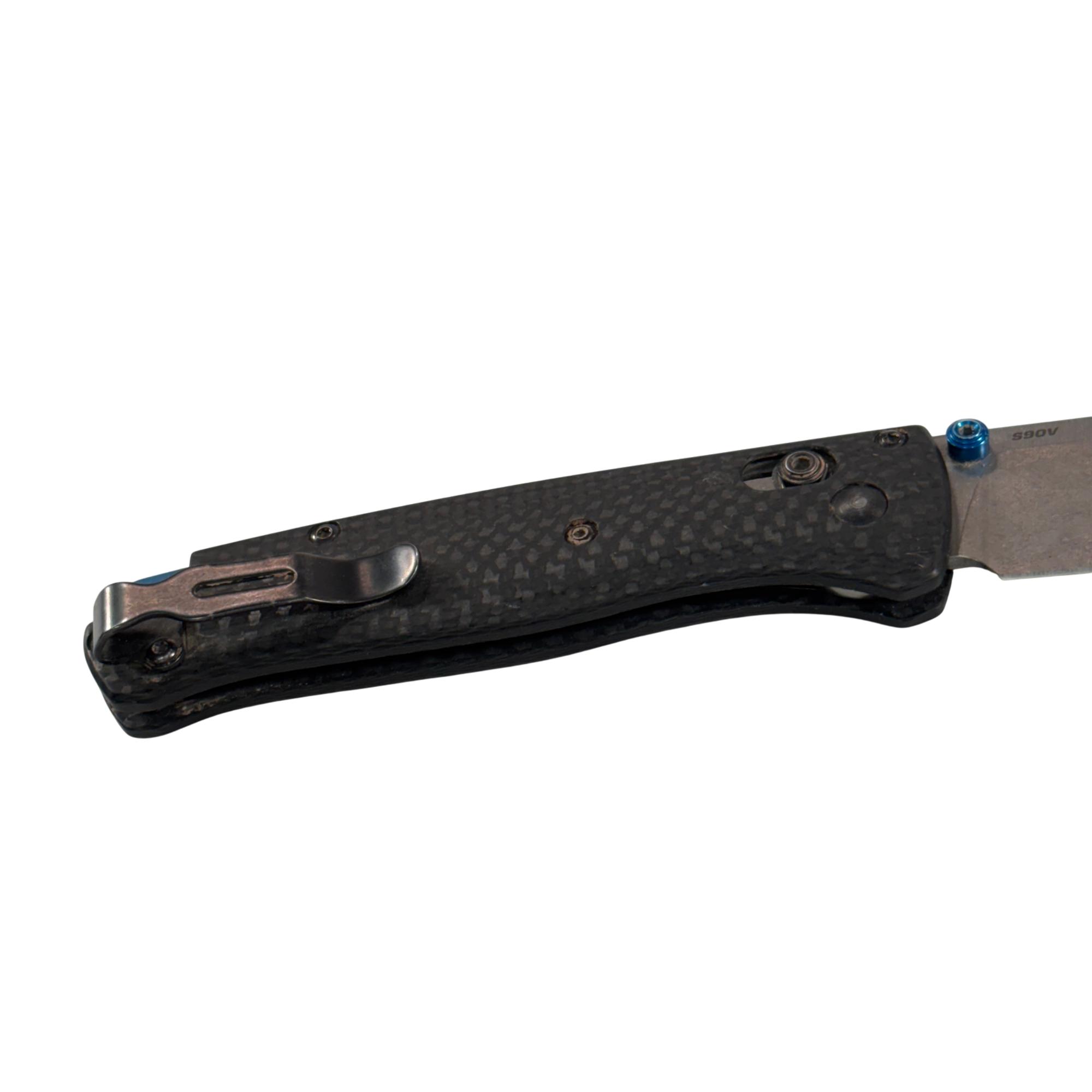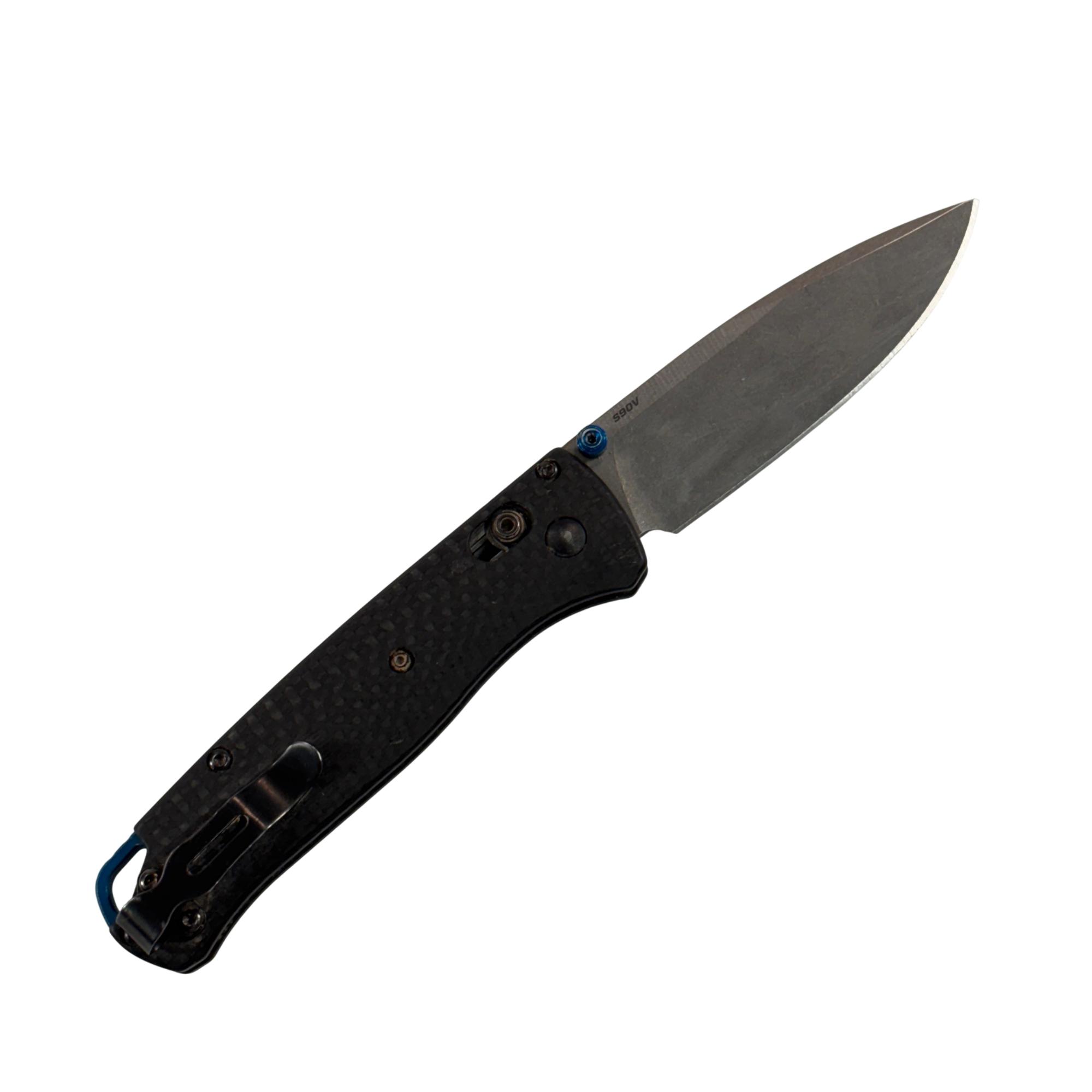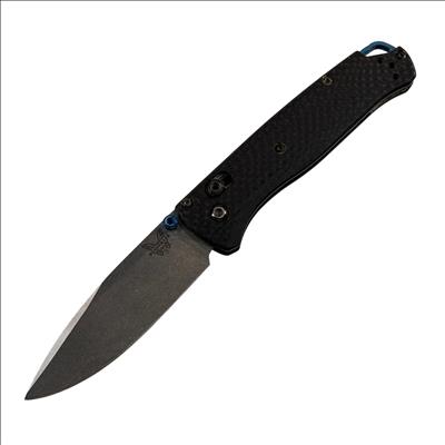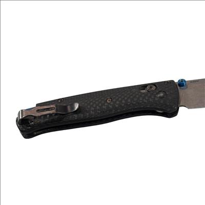 Benchmade 535-3 Bugout folding pocket knife featuring a lightweight carbon fiber handle and a slim, easy-carry profile. It has a 3.24-inch drop-point blade with a satin finish for precise cutting and everyday versatility, paired with a smooth Axis lock mechanism for secure one-handed operation. Compact when closed and comfortable in hand, this knife is designed for reliable performance with a tip-up deep-carry pocket clip for discreet everyday carry.