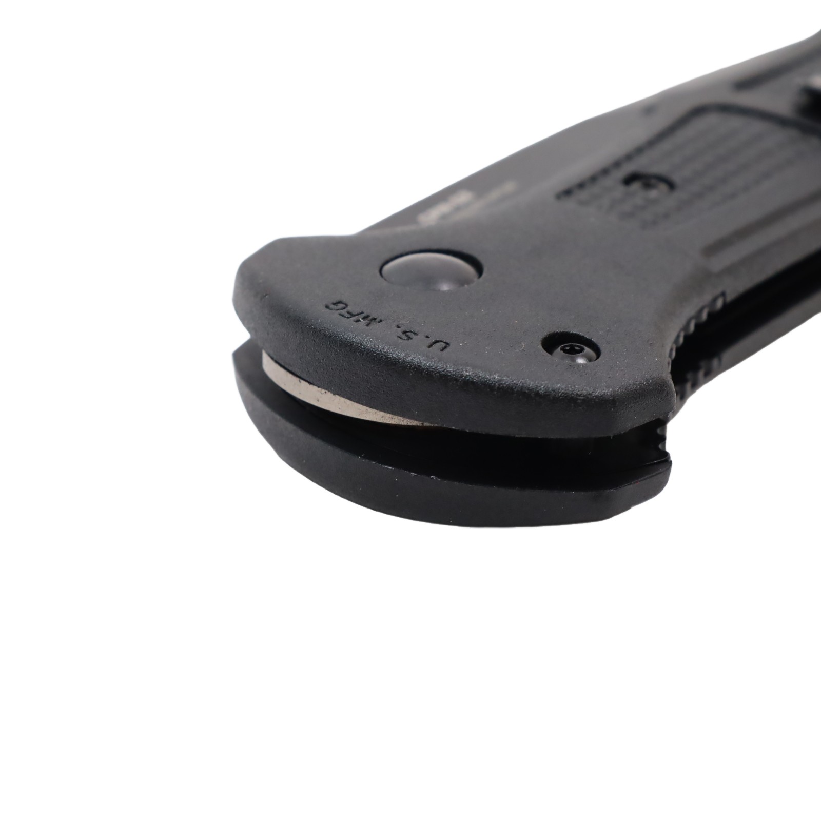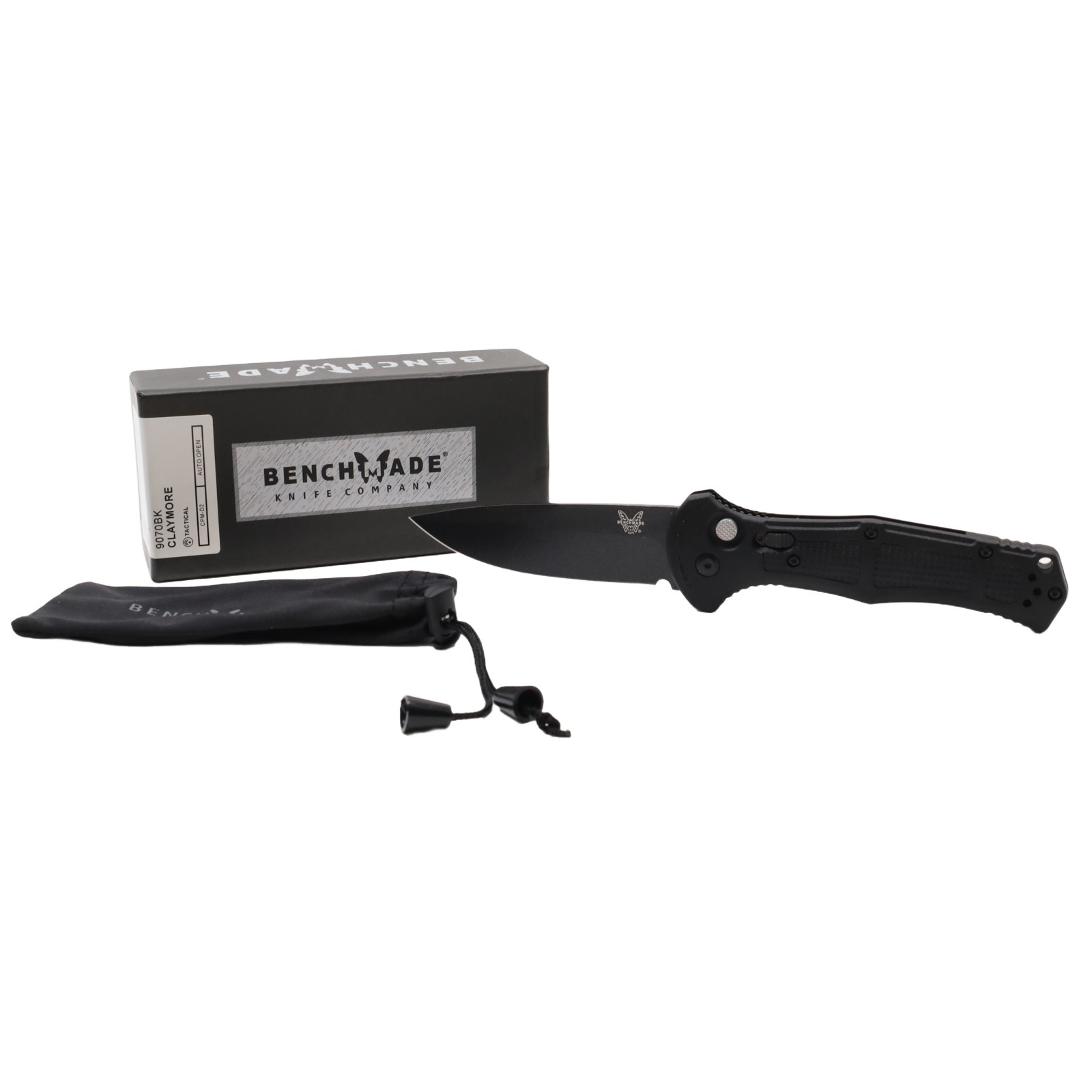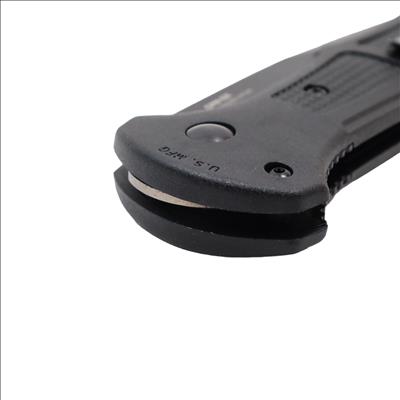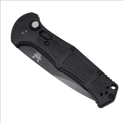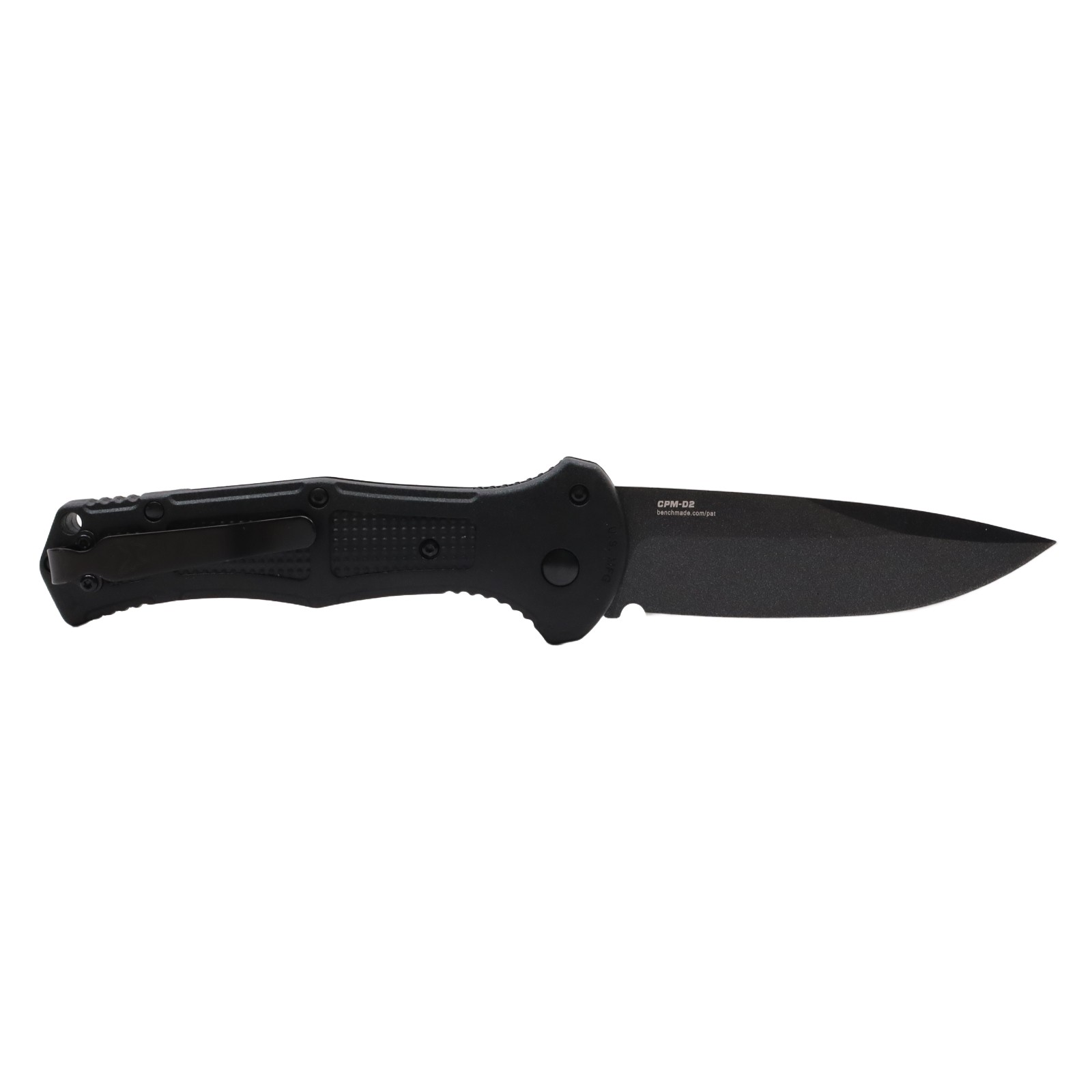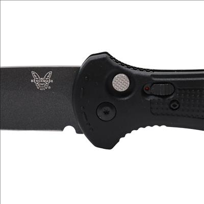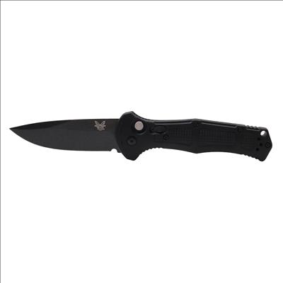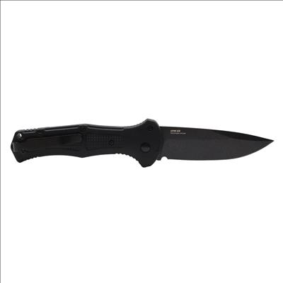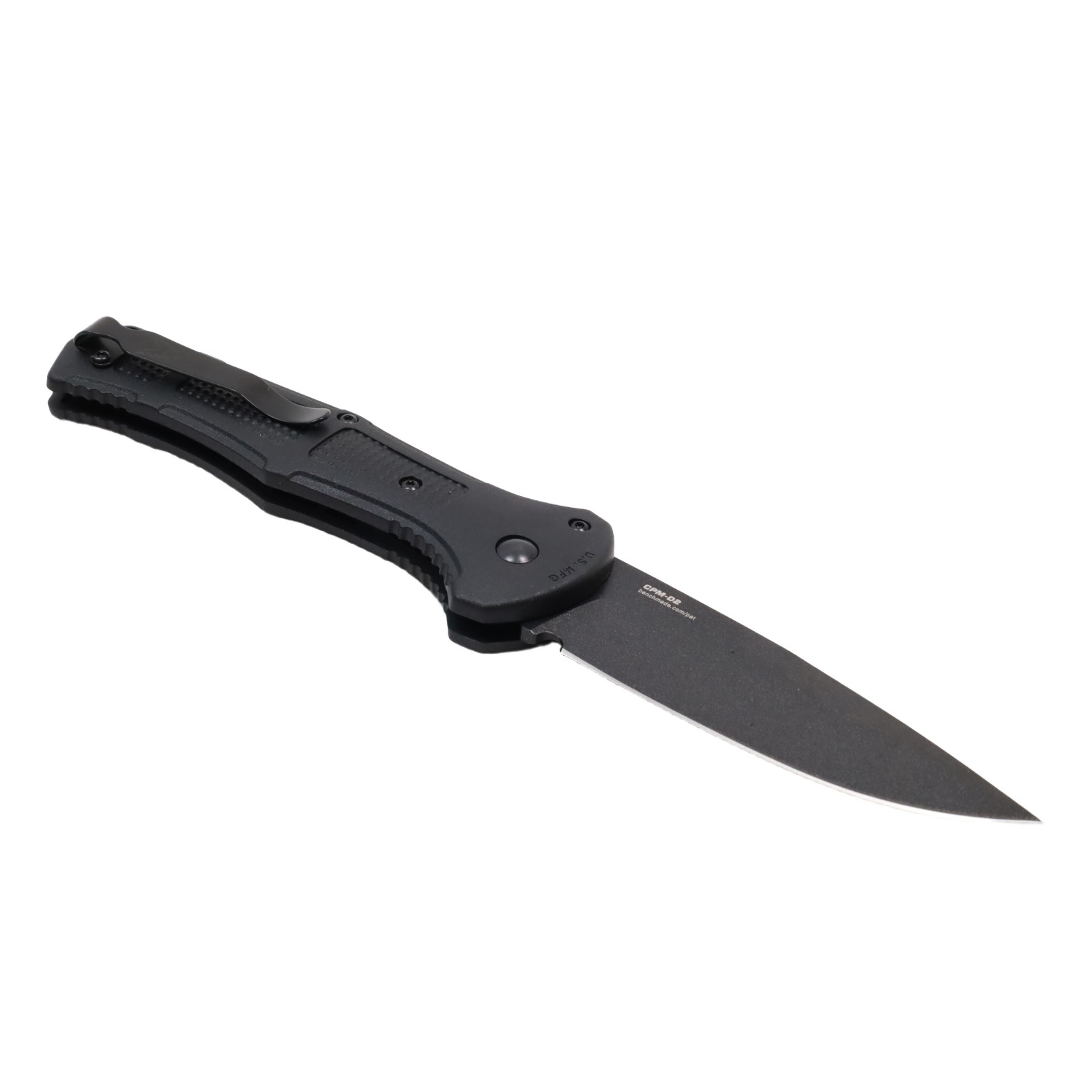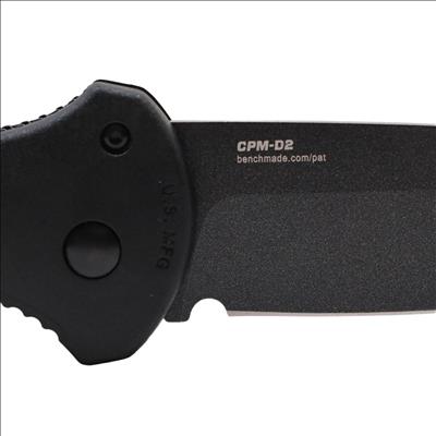 Features a 3.60-inch drop point blade constructed from CPM-D2 tool steel with a hardness rating of 60-62HRC and a cobalt black finish. The handle consists of black Grivory material measuring 0.60 inches in thickness and houses an automatic push-button mechanism for deployment. A deep-carry reversible tip-up pocket clip is included, and the blade measures 0.114 inches in thickness.
