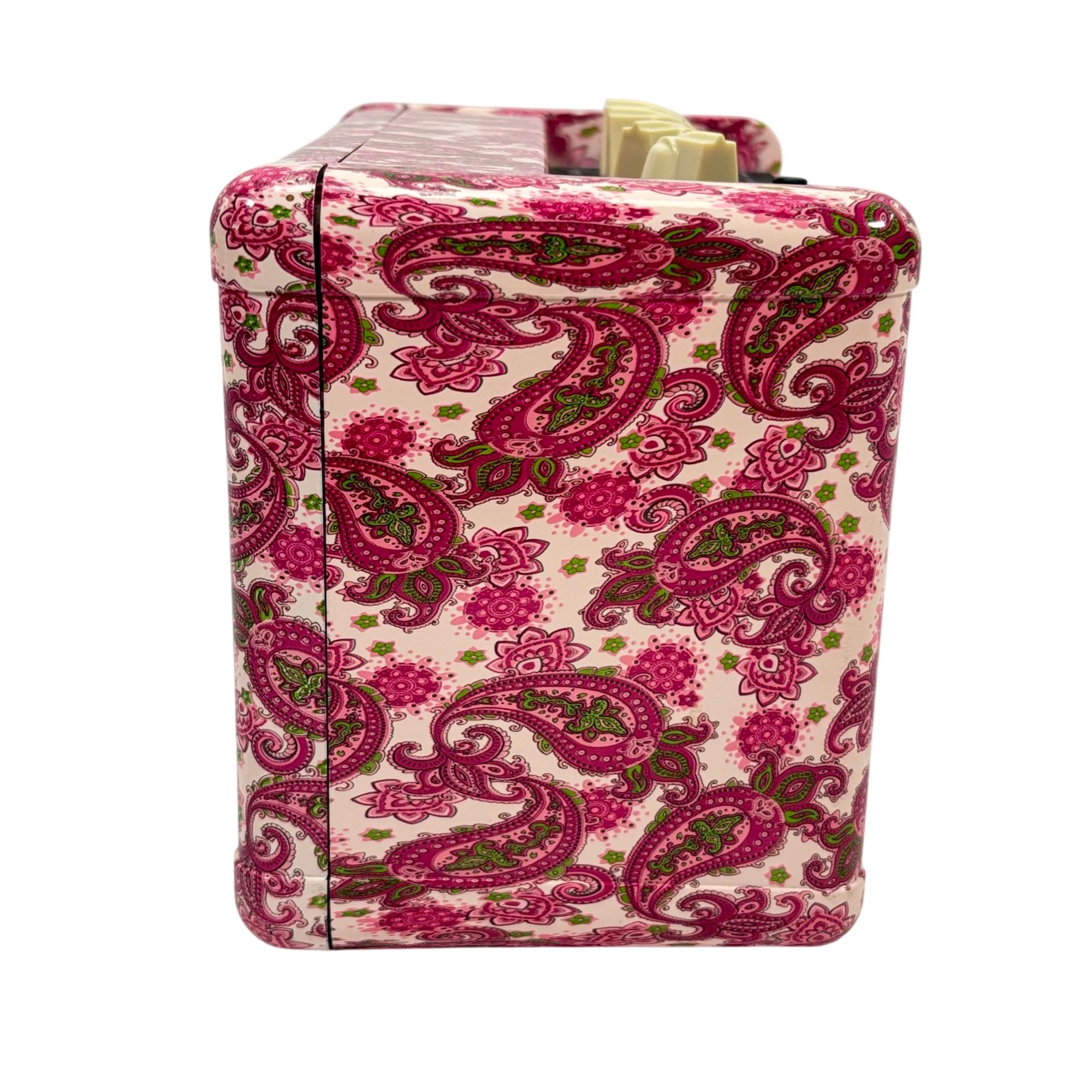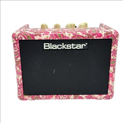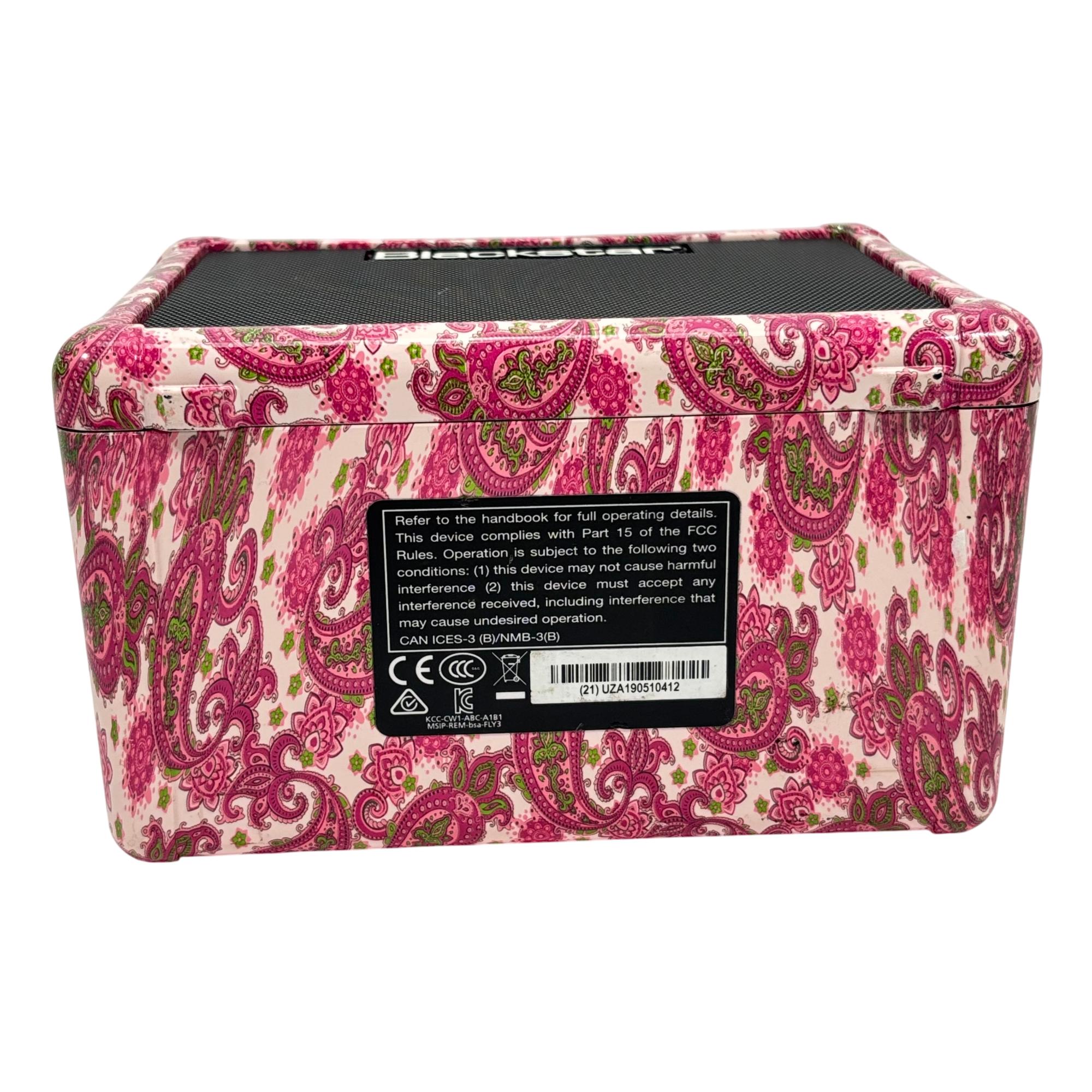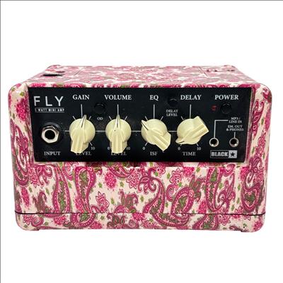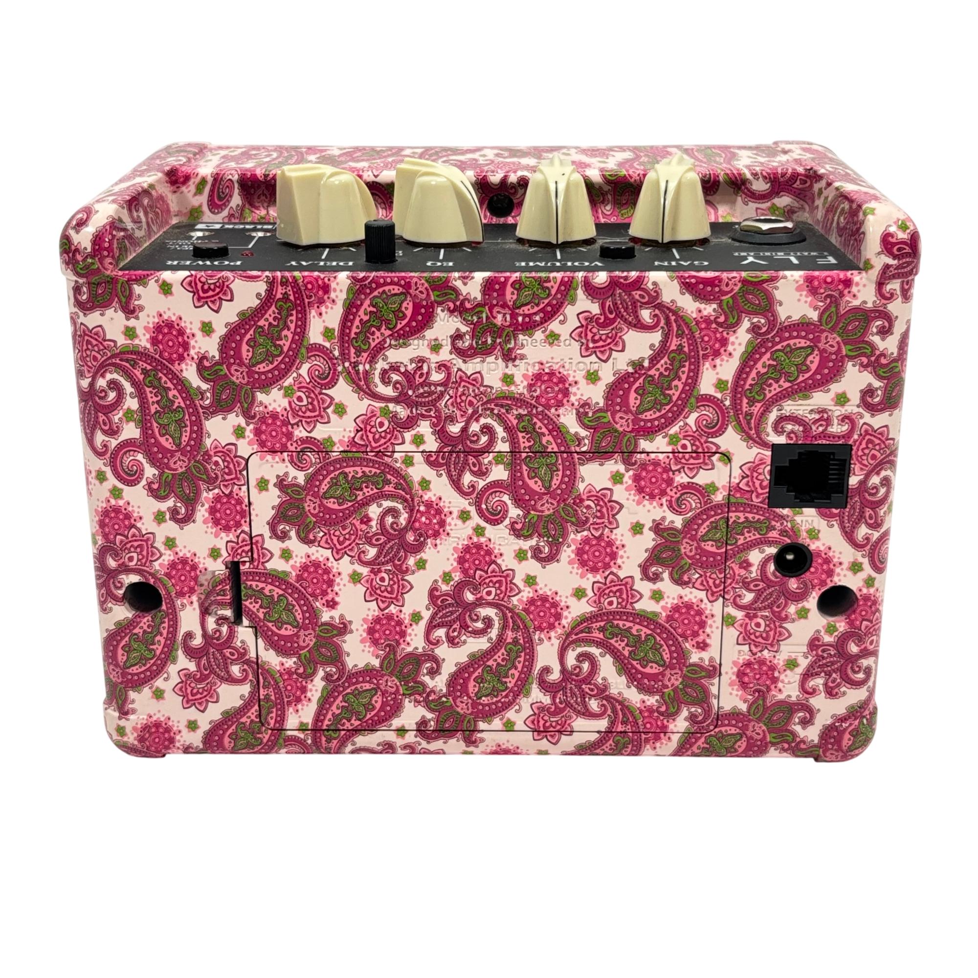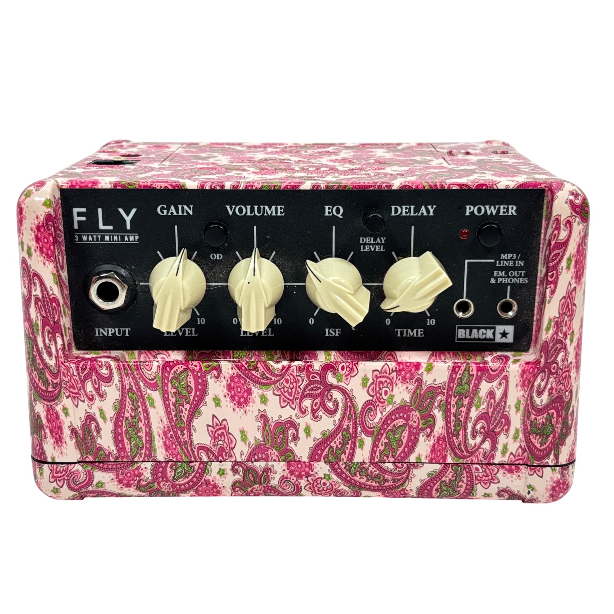 Blackstar FLY 3 Limited Edition Pink Paisley 3-Watt Mini Guitar Amplifier features a distinctive pink and white paisley pattern on a compact design that delivers up to 3 watts of power. This mini combo amp offers an array of controls including gain, volume, EQ, delay, and ISF settings for tonal versatility in a portable package optimized for practice and travel.