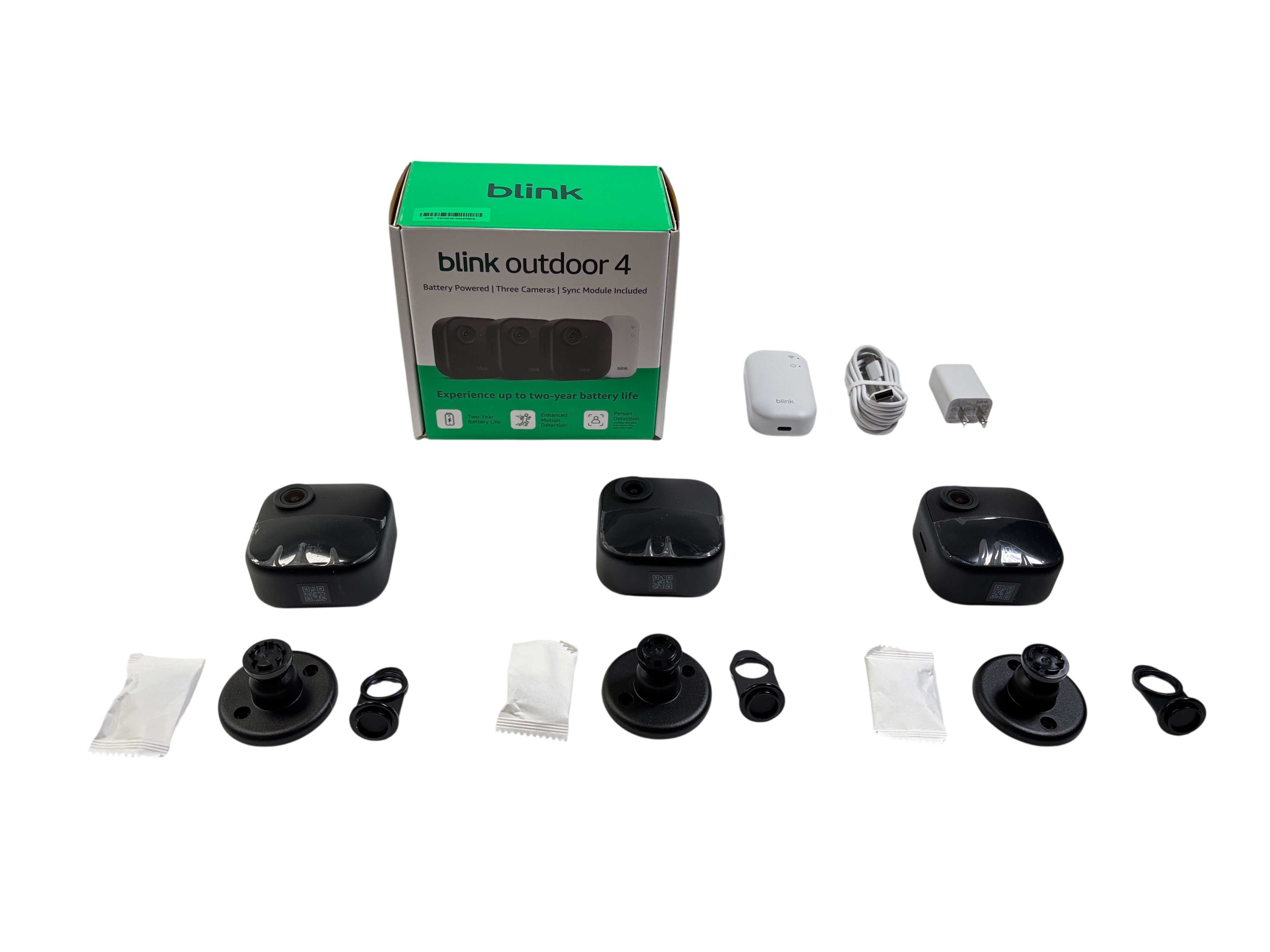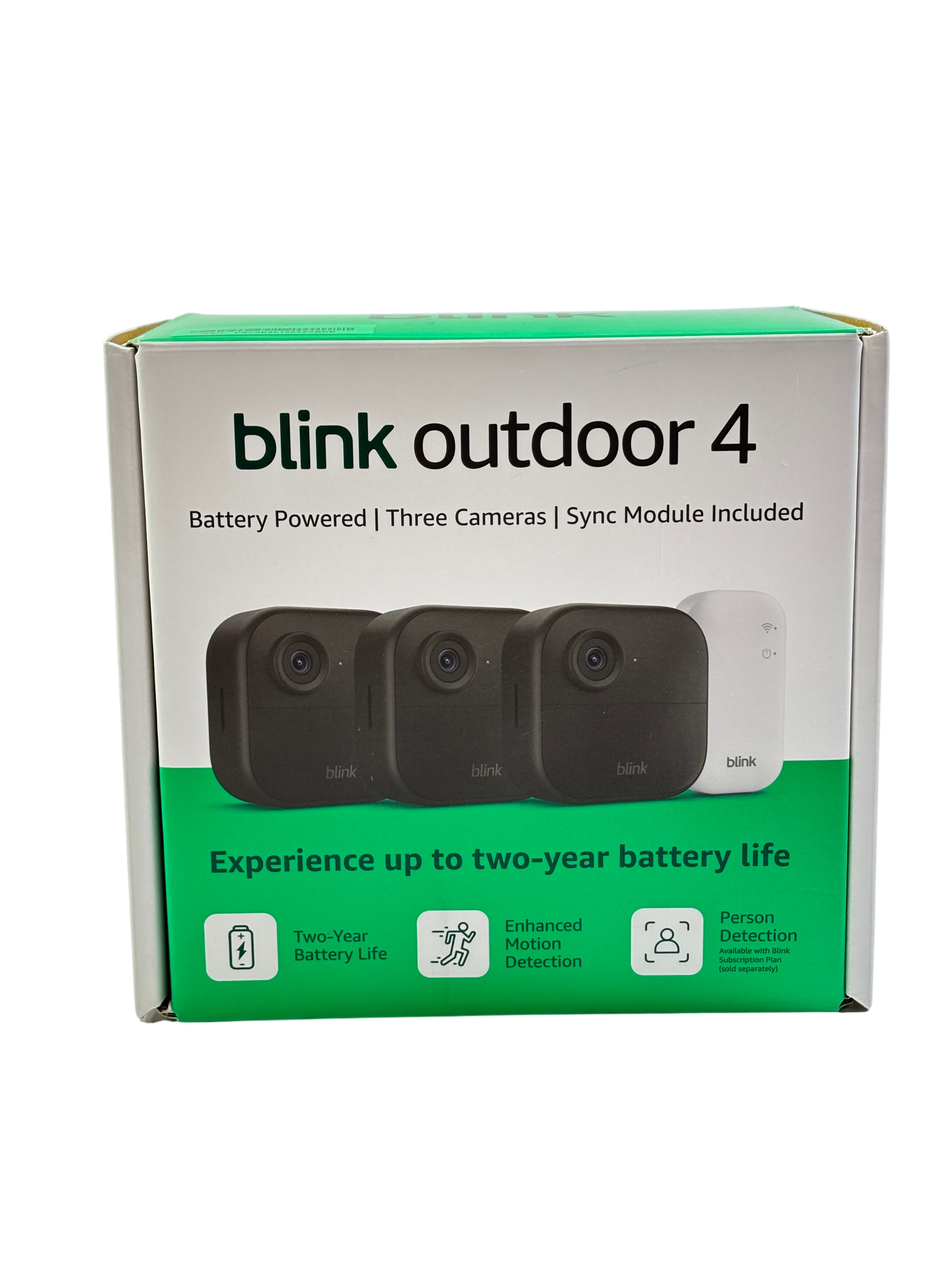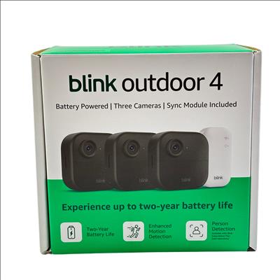 Blink Outdoor 4 Battery Powered Camera System features three weather-resistant security cameras with 1080p HD video resolution and enhanced motion detection. The system includes a Blink Sync Module Core for seamless connectivity. Each camera is compact and easy to install outdoors. Ideal for home security and remote surveillance.