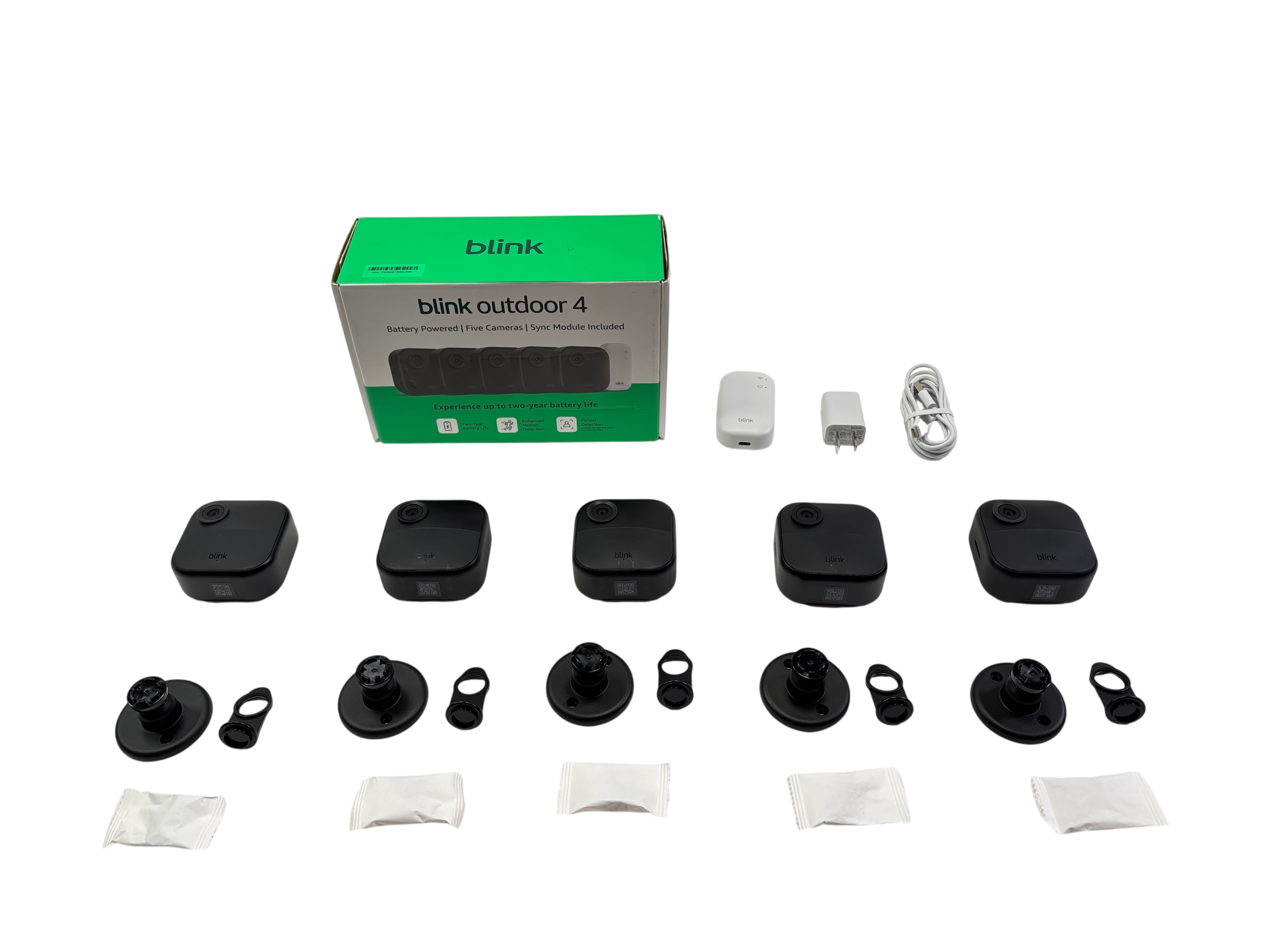 The Blink Outdoor 4 Security Camera System includes five battery-powered cameras and a sync module for seamless wireless connectivity. Designed for outdoor use, each camera features advanced person detection and enhanced motion detection for reliable home security. This system is ideal for homeowners seeking a flexible, wireless security solution with long-lasting performance.