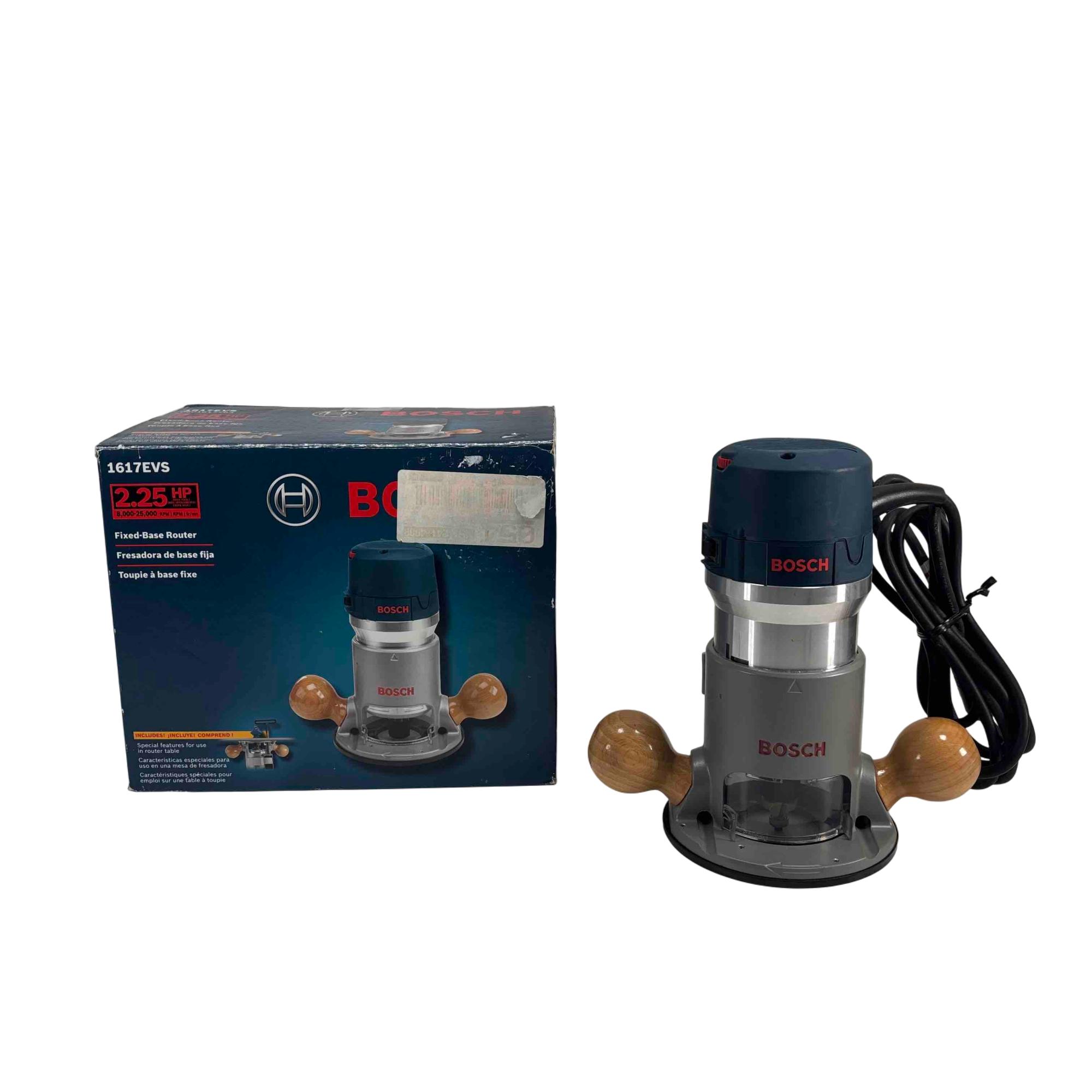 Unleash your woodworking potential with the Bosch 1617EVS Corded Fixed-Base Router. This powerful 2.25 HP tool offers variable speeds from 8,000 to 25,000 RPM, perfect for any precision routing task. With a sturdy fixed-base design and elegant wooden handles, this router delivers both power and ease of use. Ideal for professionals and DIY enthusiasts alike, it comes complete with its original box for easy storage and transport.