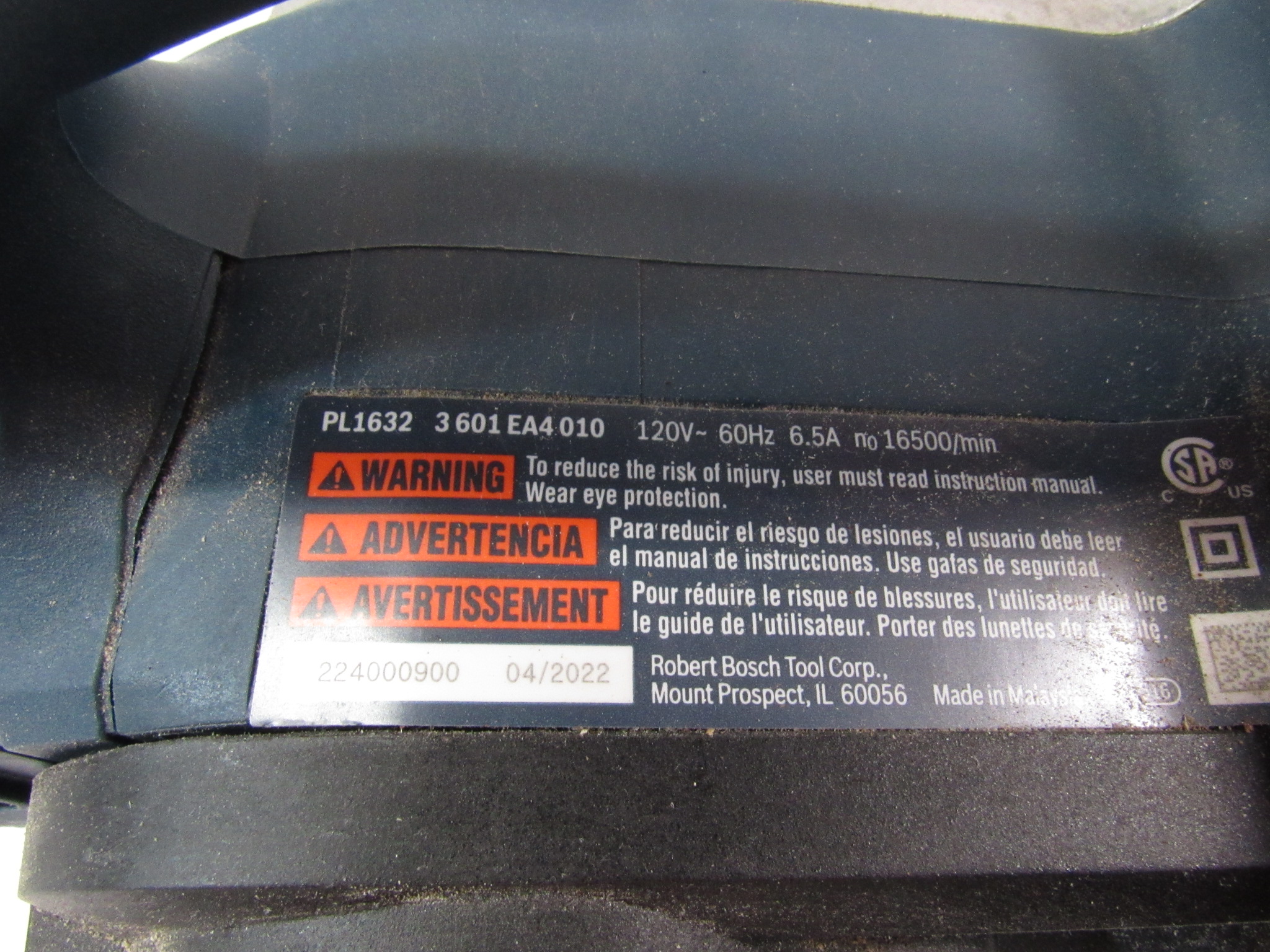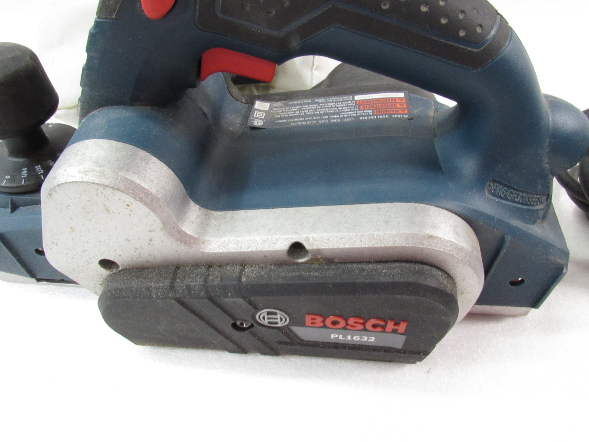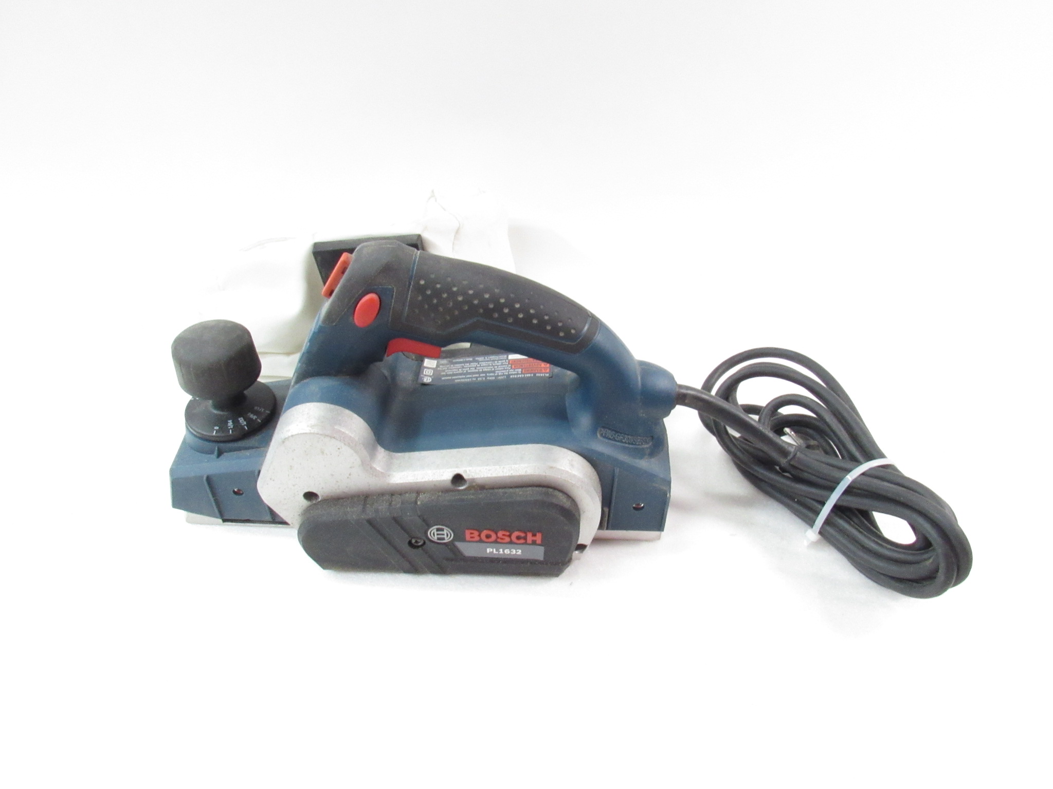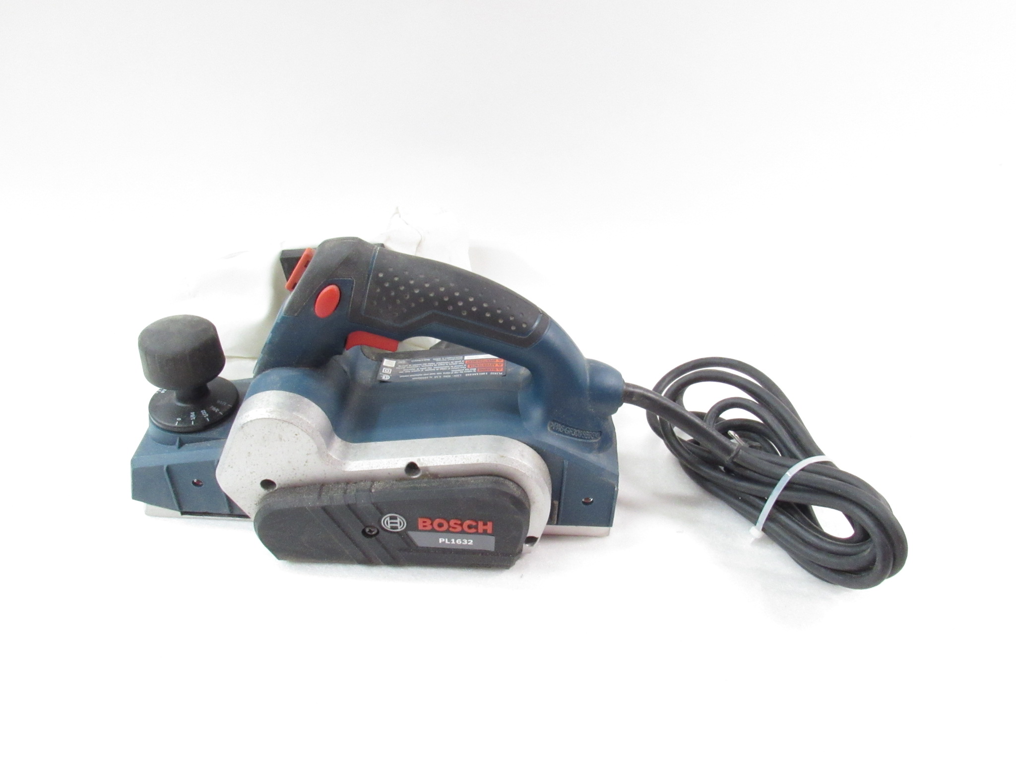 The Bosch PL1632 3-1/4 In. Planer delivers for pros who need to plane doors or other surfaces quickly and evenly. It delivers performance, convenience and security – with an outstanding planer-guidance system. It has a 6.5 Amp motor that produces 16,500 RPM for fast stock removal and smooth finishes. The tool's ambidextrous lock-off release button helps prevent avoid accidental starts, and it has a lock-on button for extended operation, a combination that is unique to Bosch planers. The aluminum front and rear shoes are precision-machined together for accuracy, and the tool has a machined groove for chamfering. Its counterbalanced blade design puts the blade at an ideal cutting angle and eliminates uneven planing caused by misaligned blades. It comes equipped with a reversible Bosch Woodrazor micrograin carbide blade. The tool also provides a spring-loaded stand that elevates the planer to protect the blade. The dual-mount guide fence can be mounted on either side of tool, with a plastic overshoe that offers protection for the workpiece surface. The dust port accommodates a large shavings bag. This planer is built with a poly micro-V drive belt for enhanced belt durability and a ball-joint cord swivel for enhanced ease of positioning the tool and cord.
