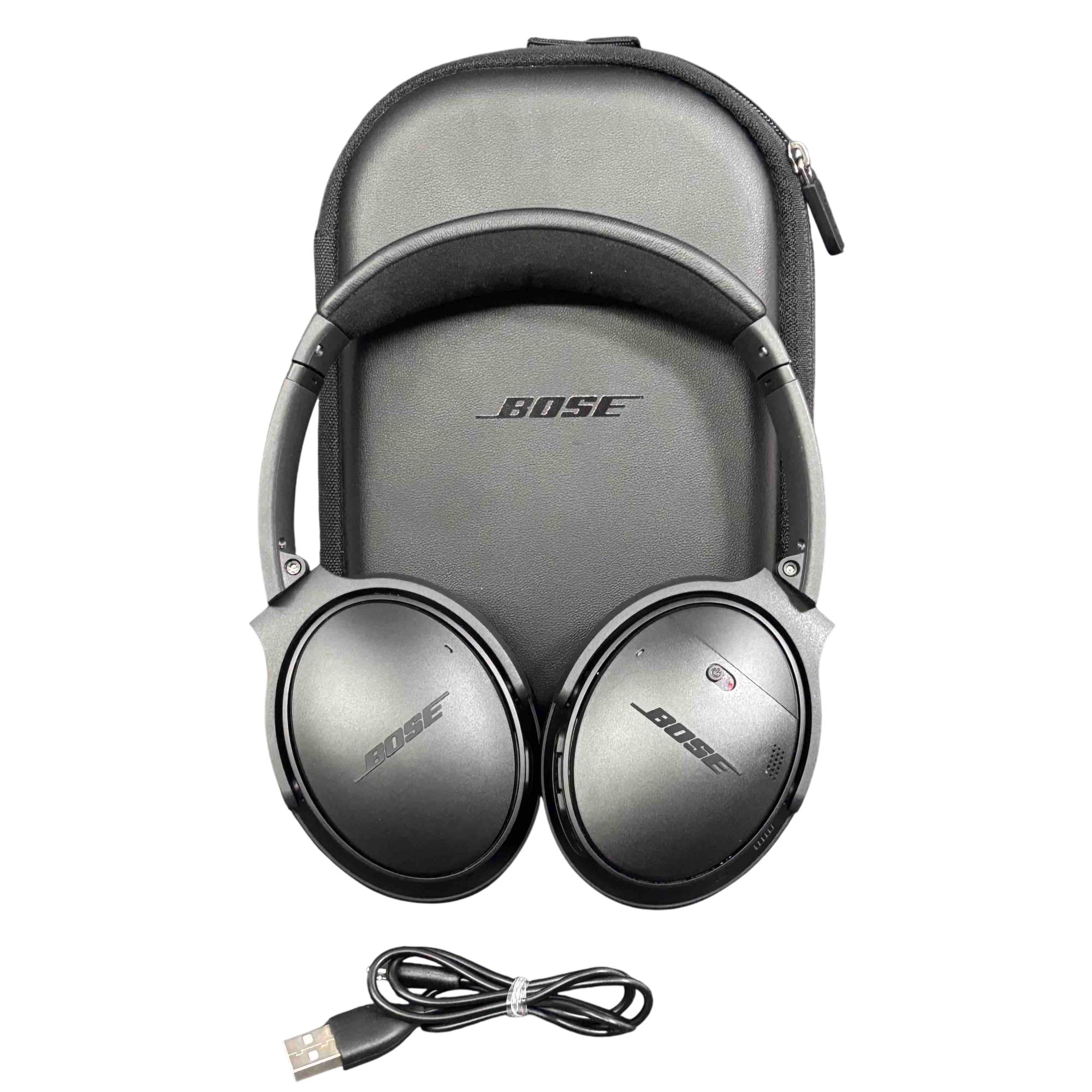 Bose QuietComfort 35 Wireless Noise Cancelling Headphones (QC35) deliver premium audio quality with advanced noise cancellation technology, designed for immersive listening experiences. These black over-ear headphones come with a protective carrying case and a USB cable for convenient charging and connectivity, making them ideal for travel and everyday use.