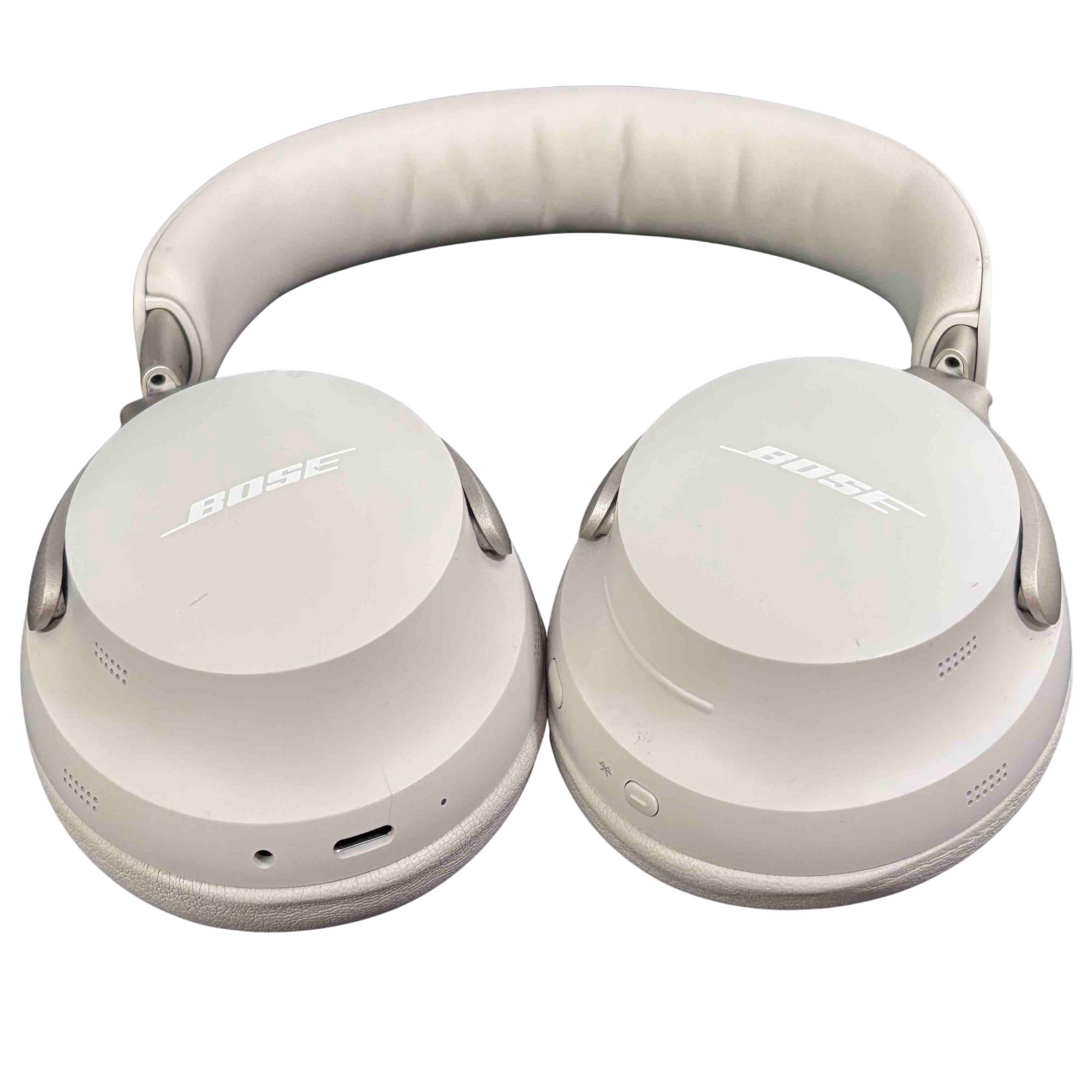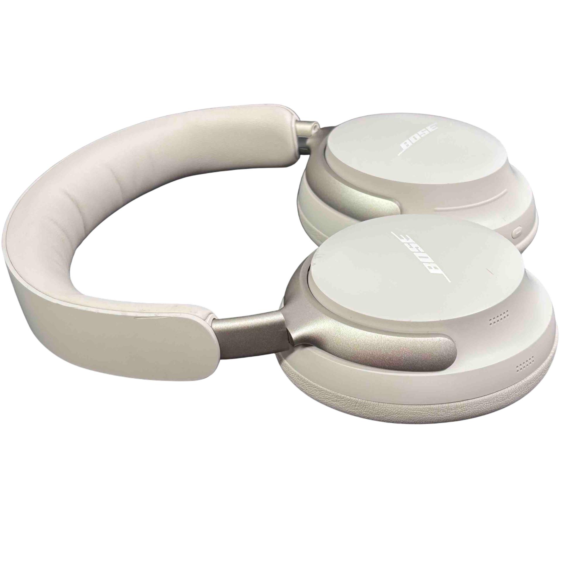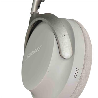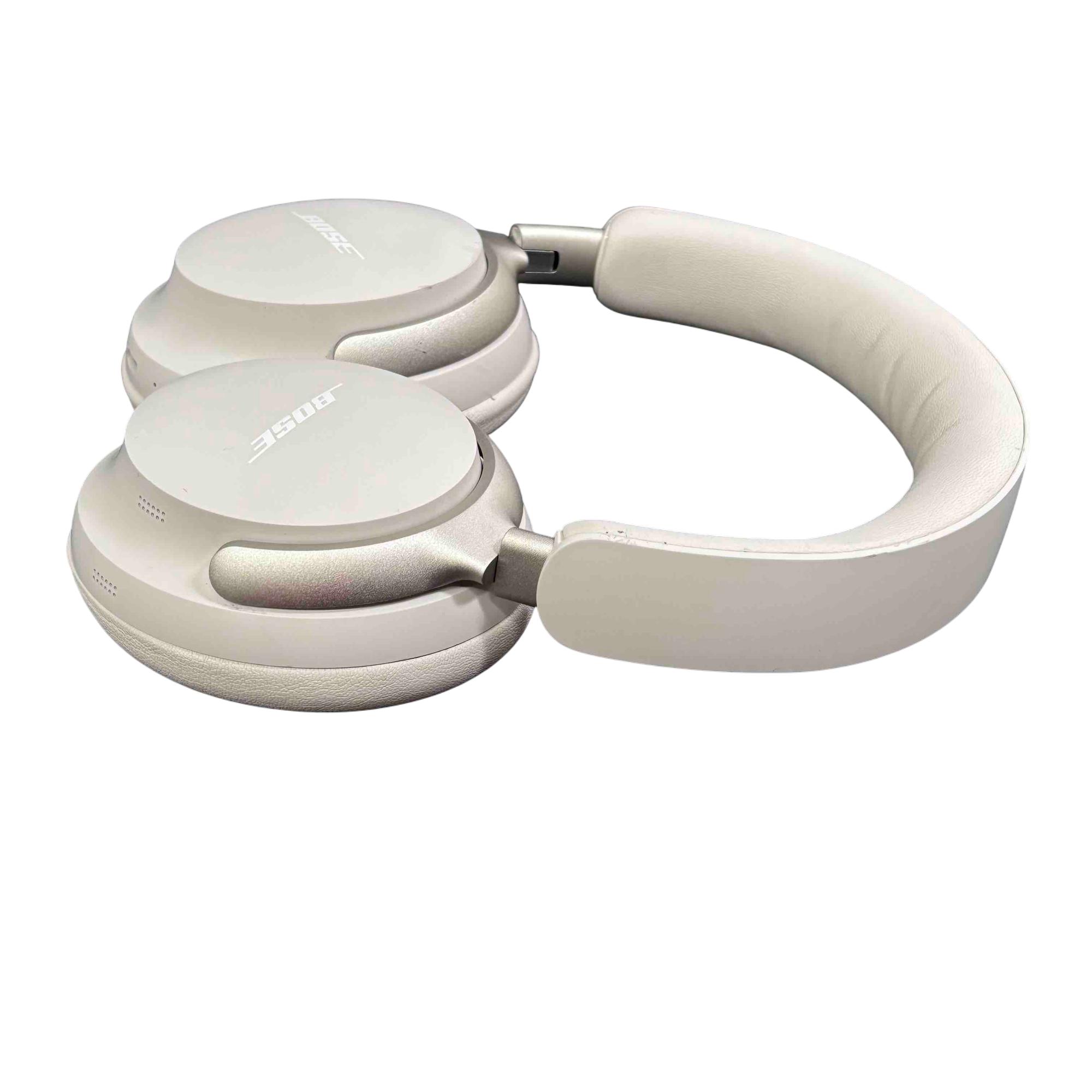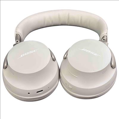 Bose QuietComfort Ultra 440108 Wireless Noise Cancelling Headphones in White deliver premium audio quality with advanced noise-cancelling technology. Featuring a sleek white design with silver metal accents and a comfortable over-ear fit, these headphones provide immersive sound and long-lasting comfort for everyday use.