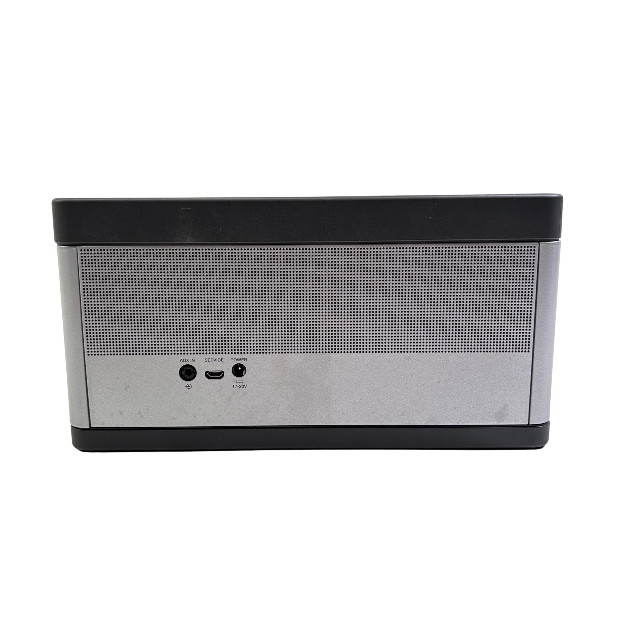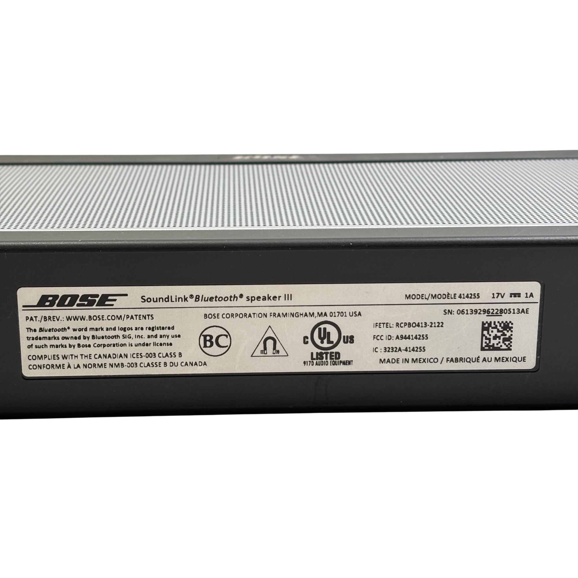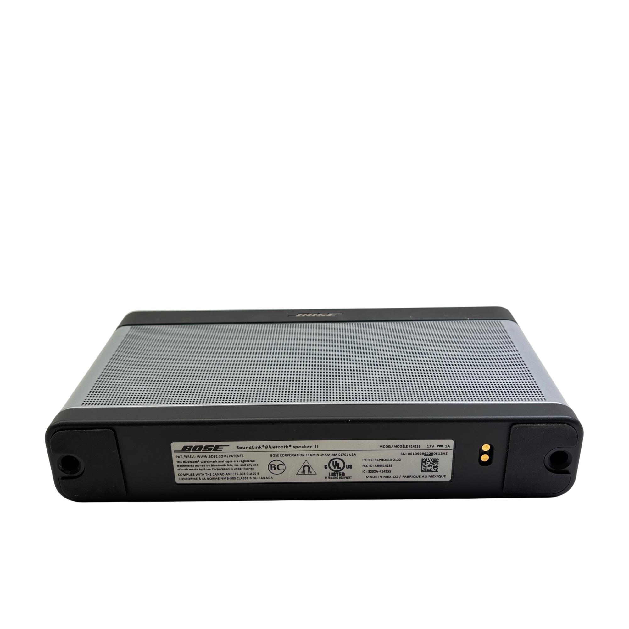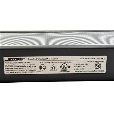 Bose SoundLink Bluetooth Speaker III 414255 (Silver/Black) delivers rich, immersive sound with a sleek black and silver design that complements any setting. This portable Bluetooth speaker features a durable rectangular metal casing with intuitive controls and powerful audio performance optimized for wireless connectivity and on-the-go use.