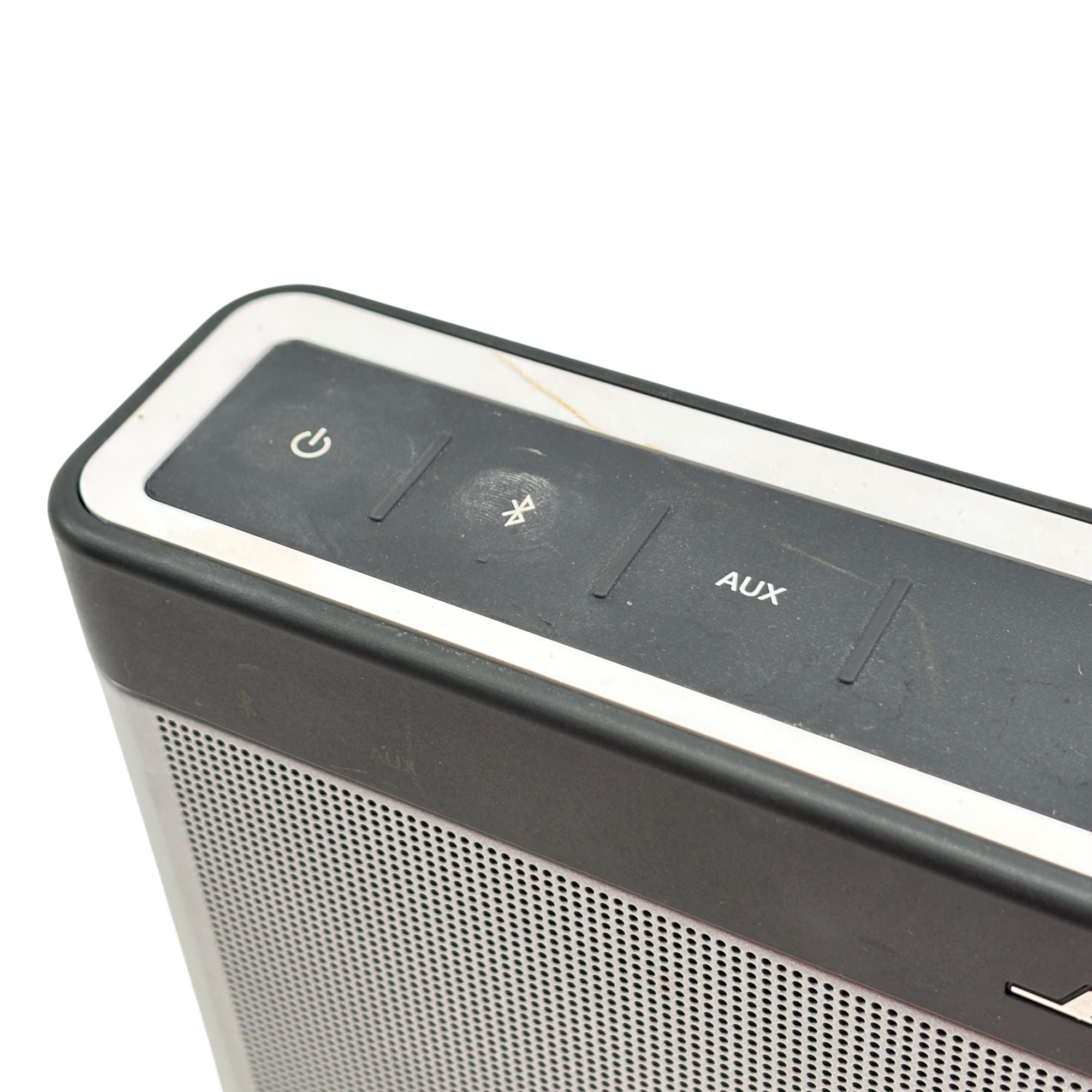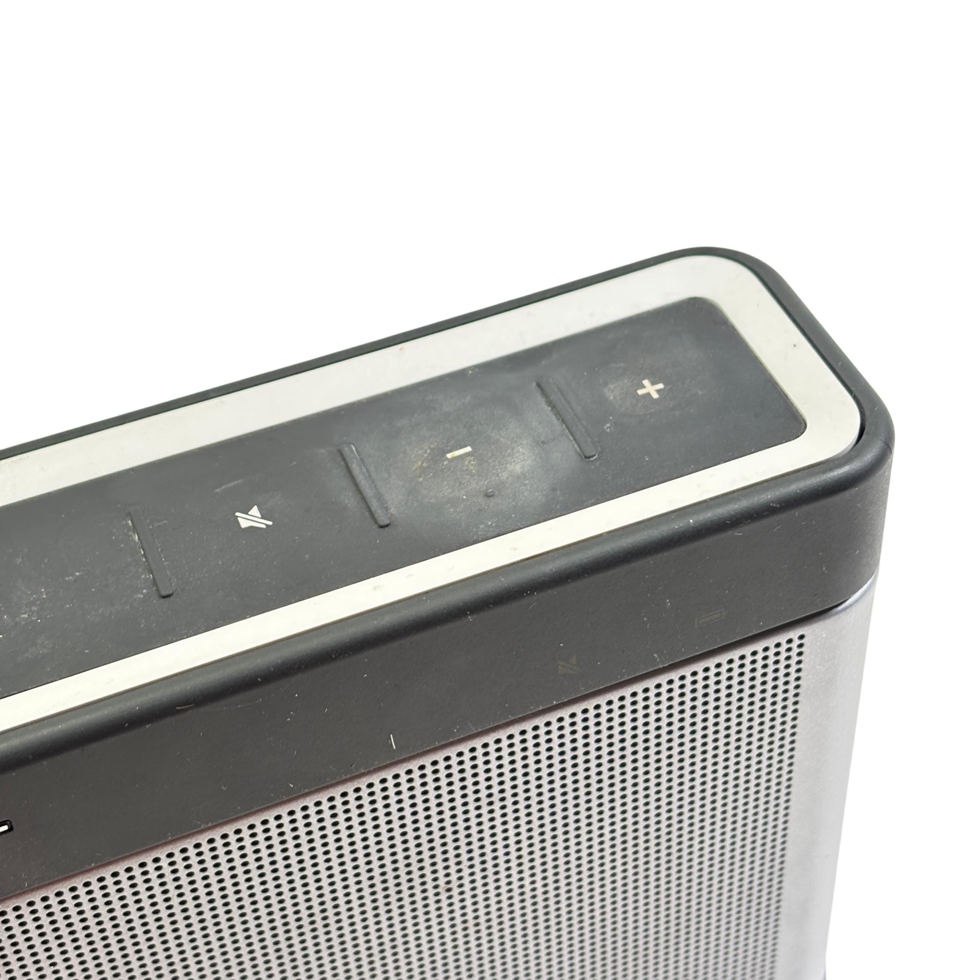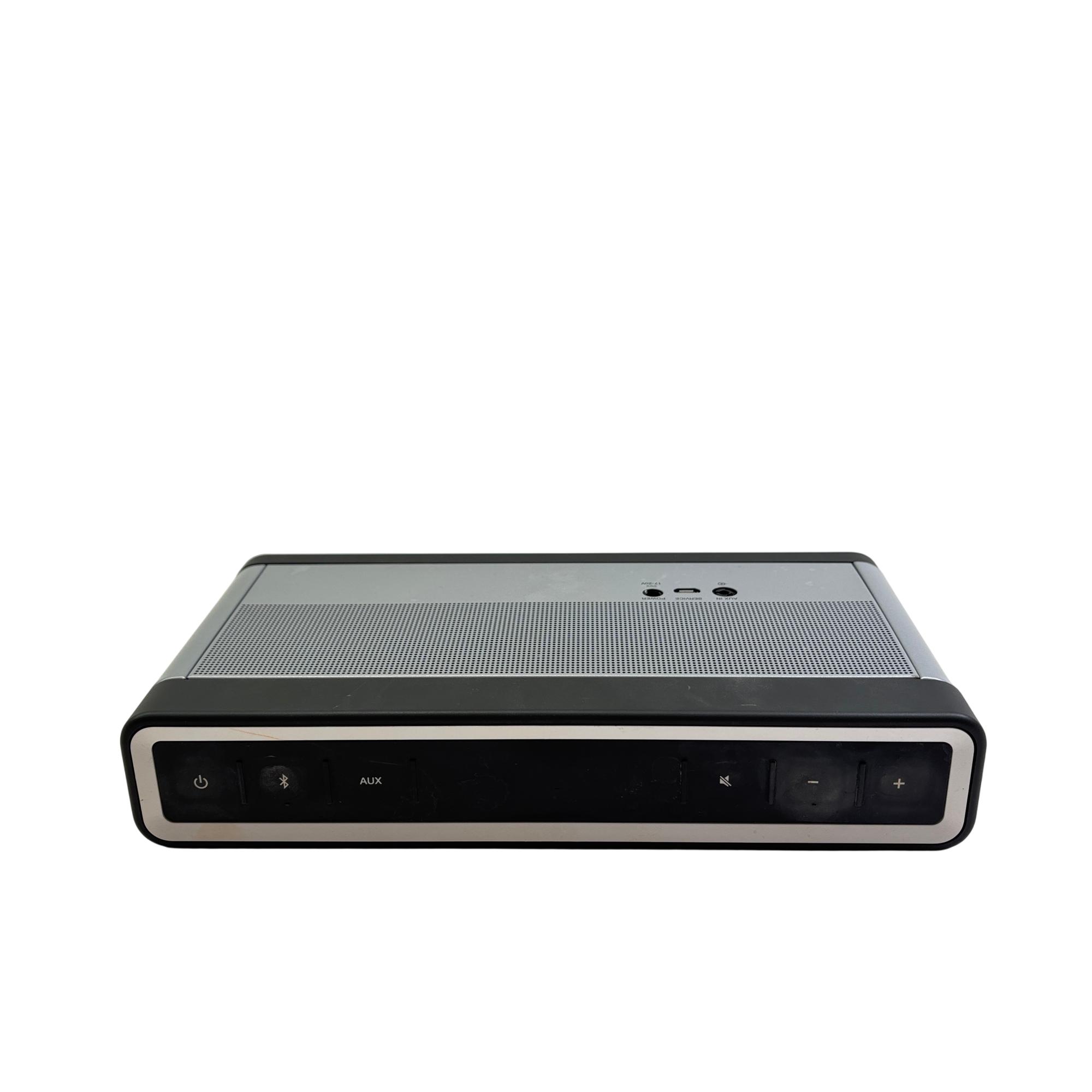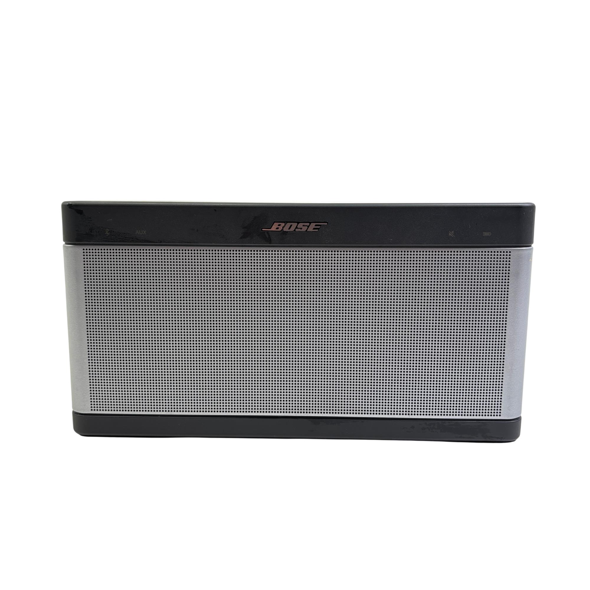 Bose SoundLink Bluetooth Speaker III 414255 (Silver/Black) delivers rich, immersive sound with a sleek black and silver design that complements any setting. This portable Bluetooth speaker features a durable rectangular metal casing with intuitive controls and powerful audio performance optimized for wireless connectivity and on-the-go use.