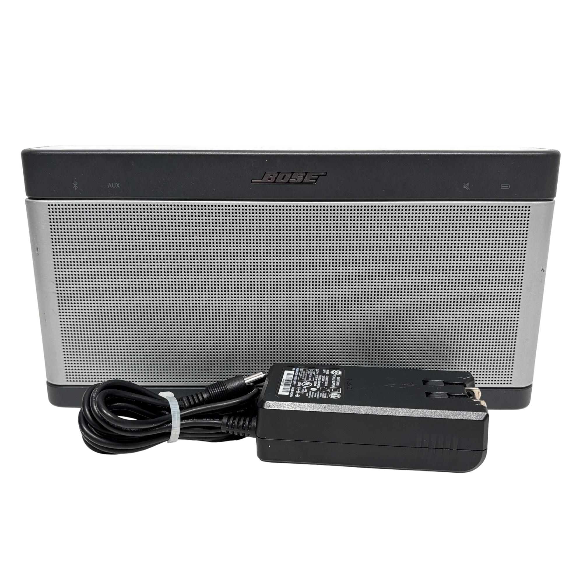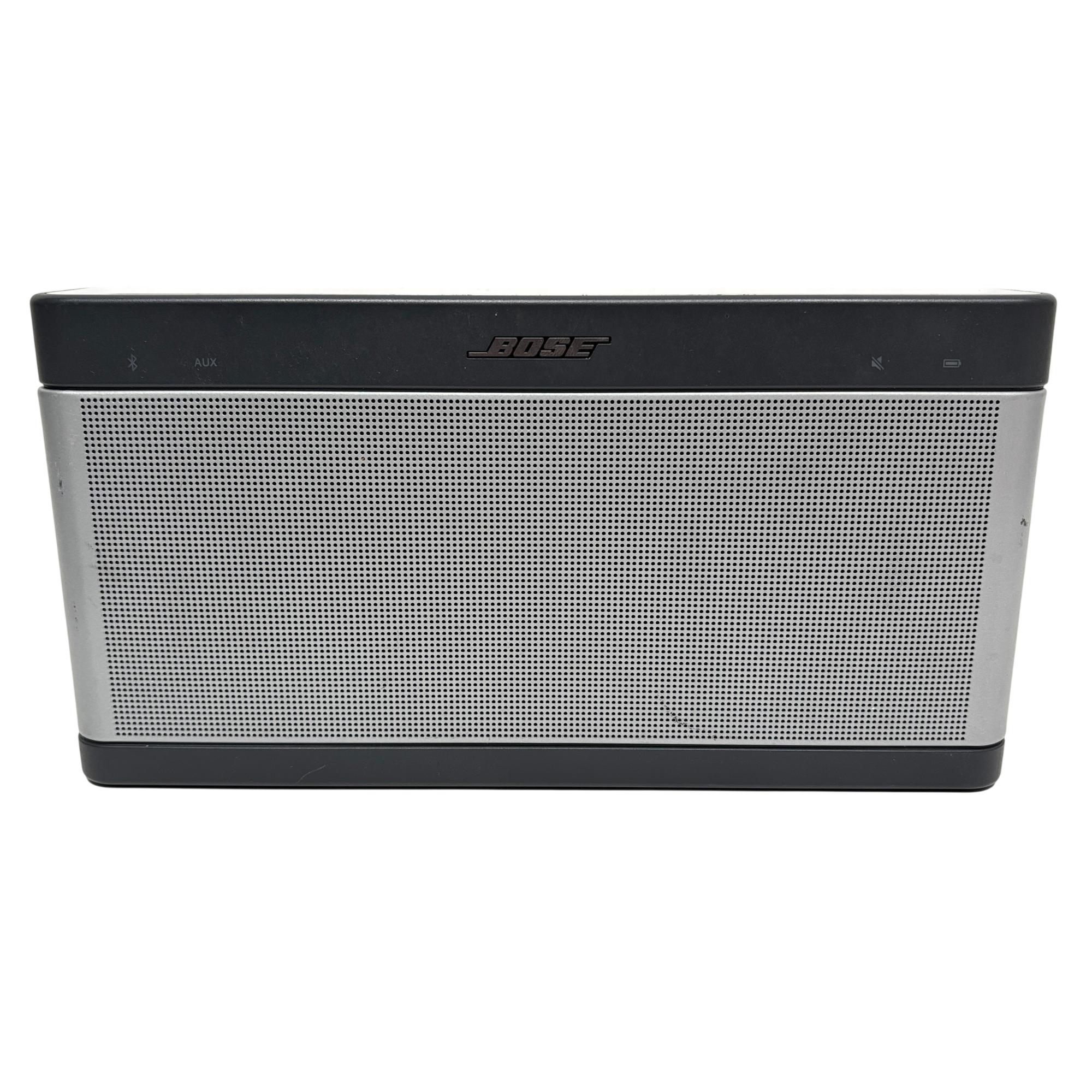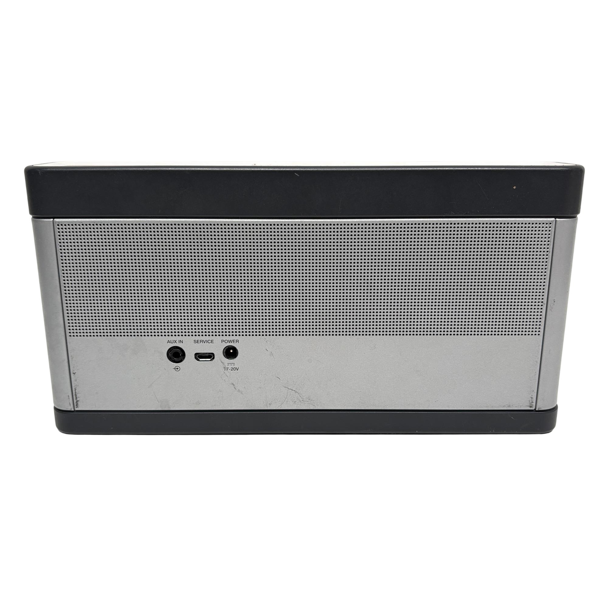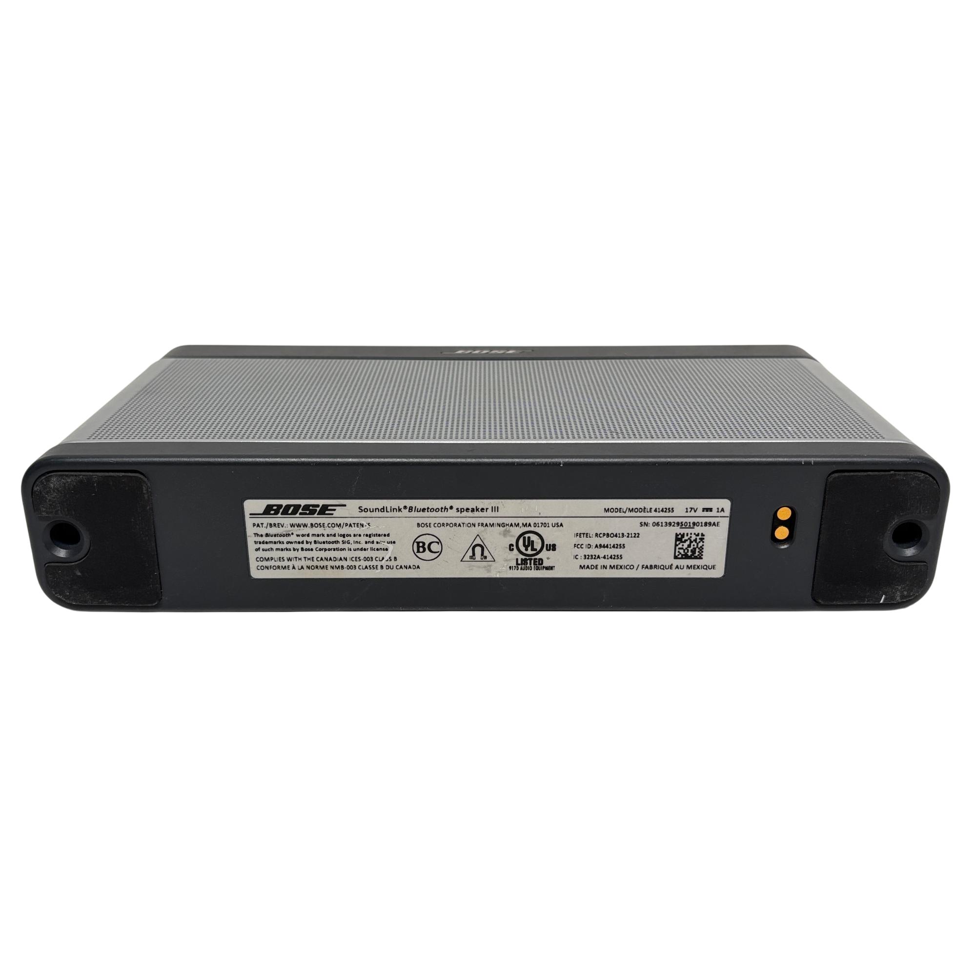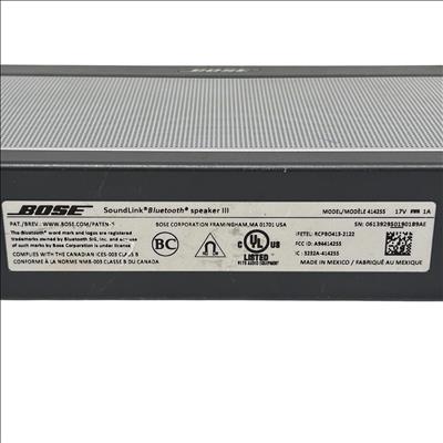 Bose SoundLink Bluetooth Speaker III Model 414255 delivers high-quality wireless audio with a sleek black and grey rectangular design. This portable speaker features powerful sound performance and seamless Bluetooth connectivity, making it ideal for both indoor and outdoor use. Its compact form includes a durable build complemented by a white square pattern on the speaker grille and easy-to-use controls for enhanced user experience.