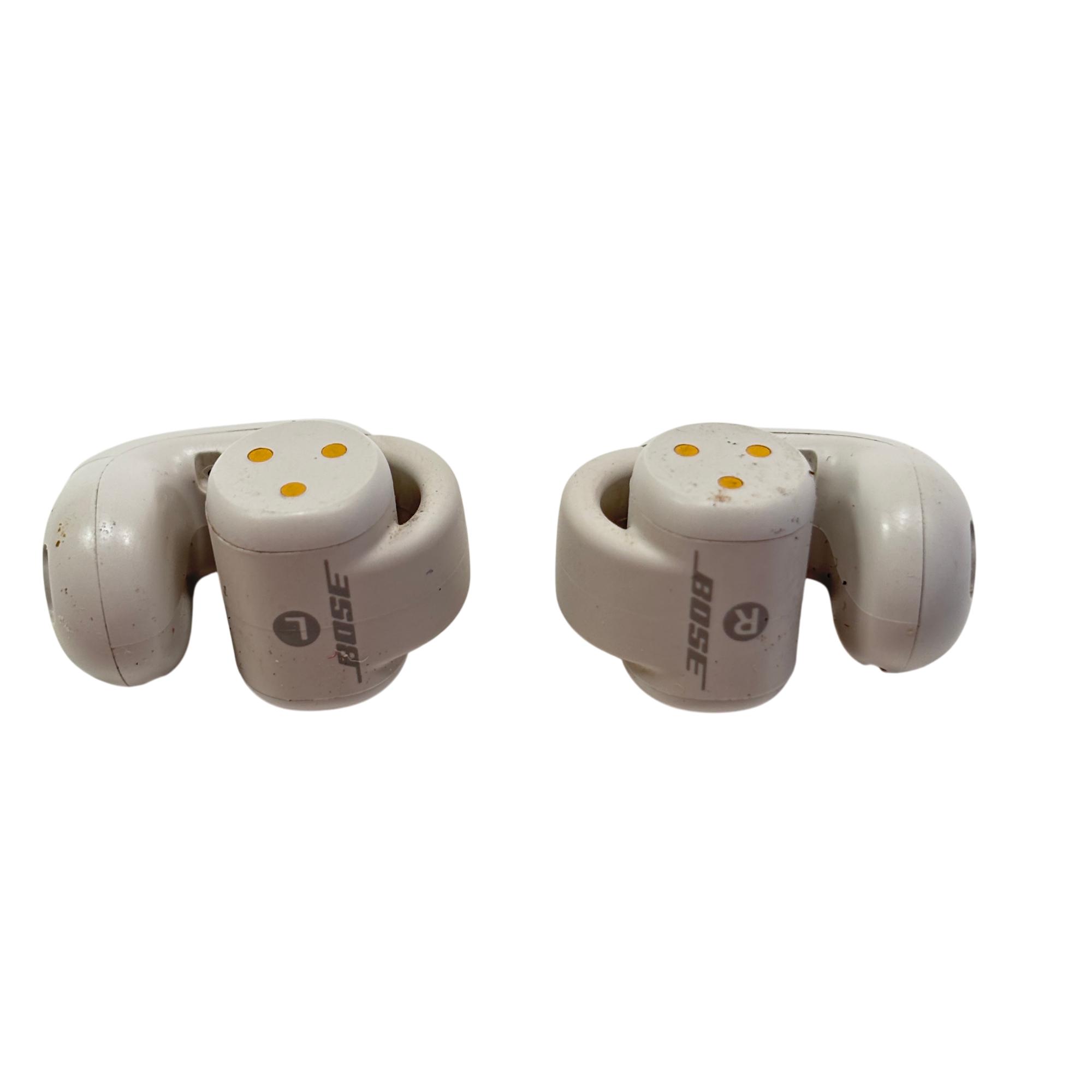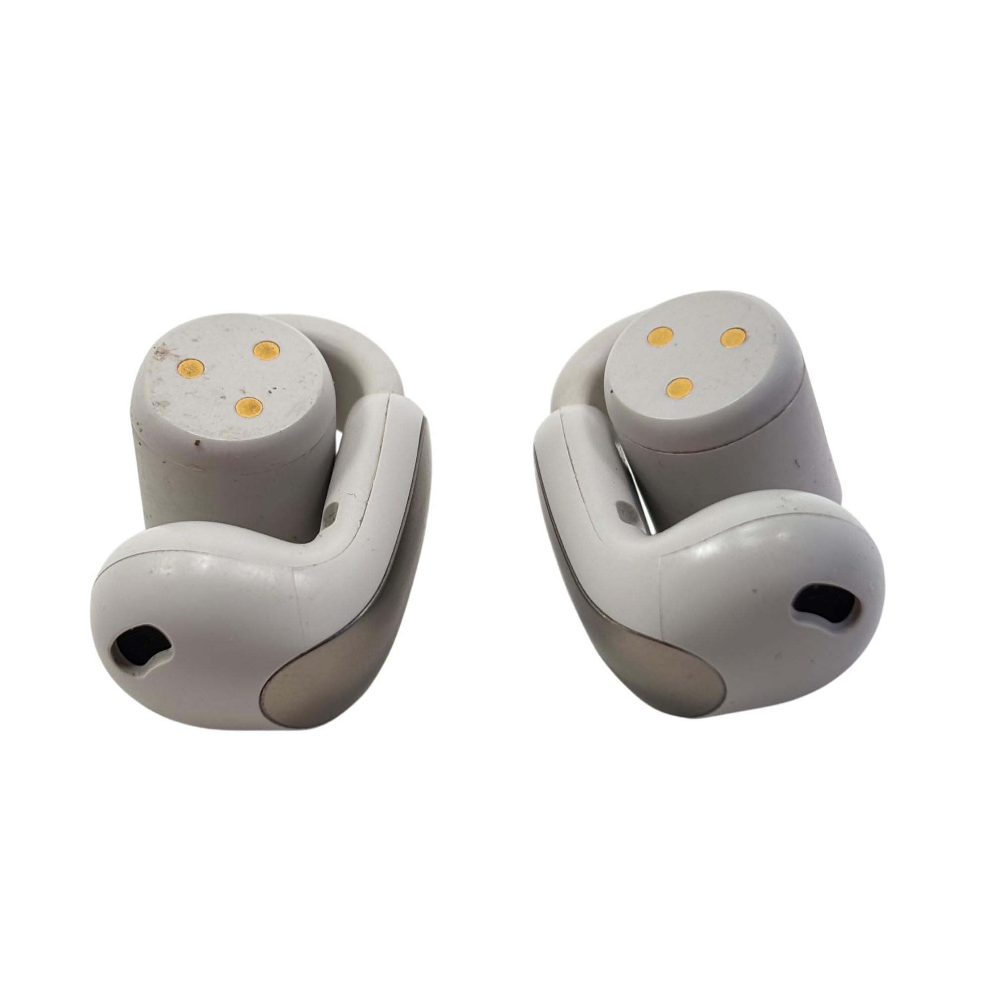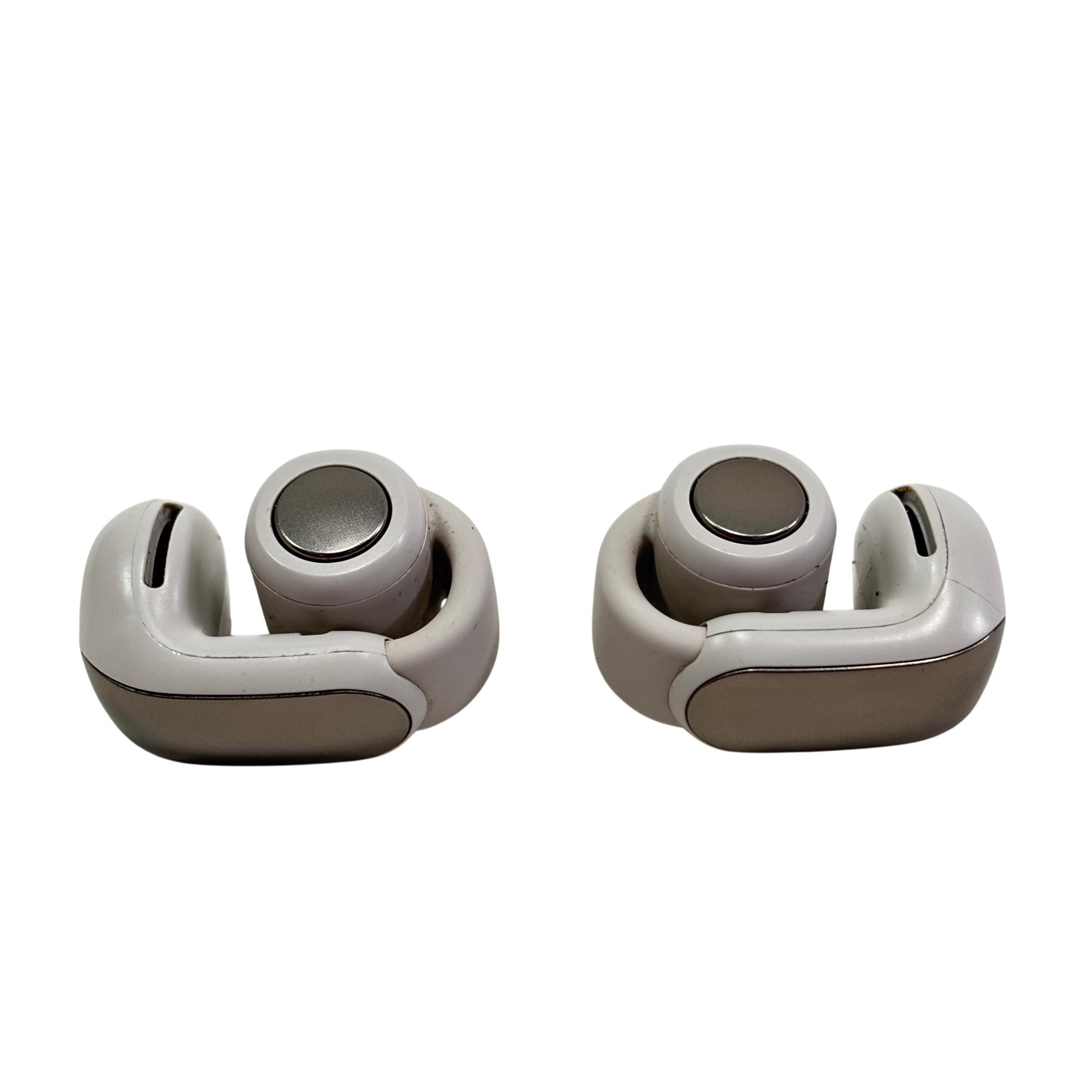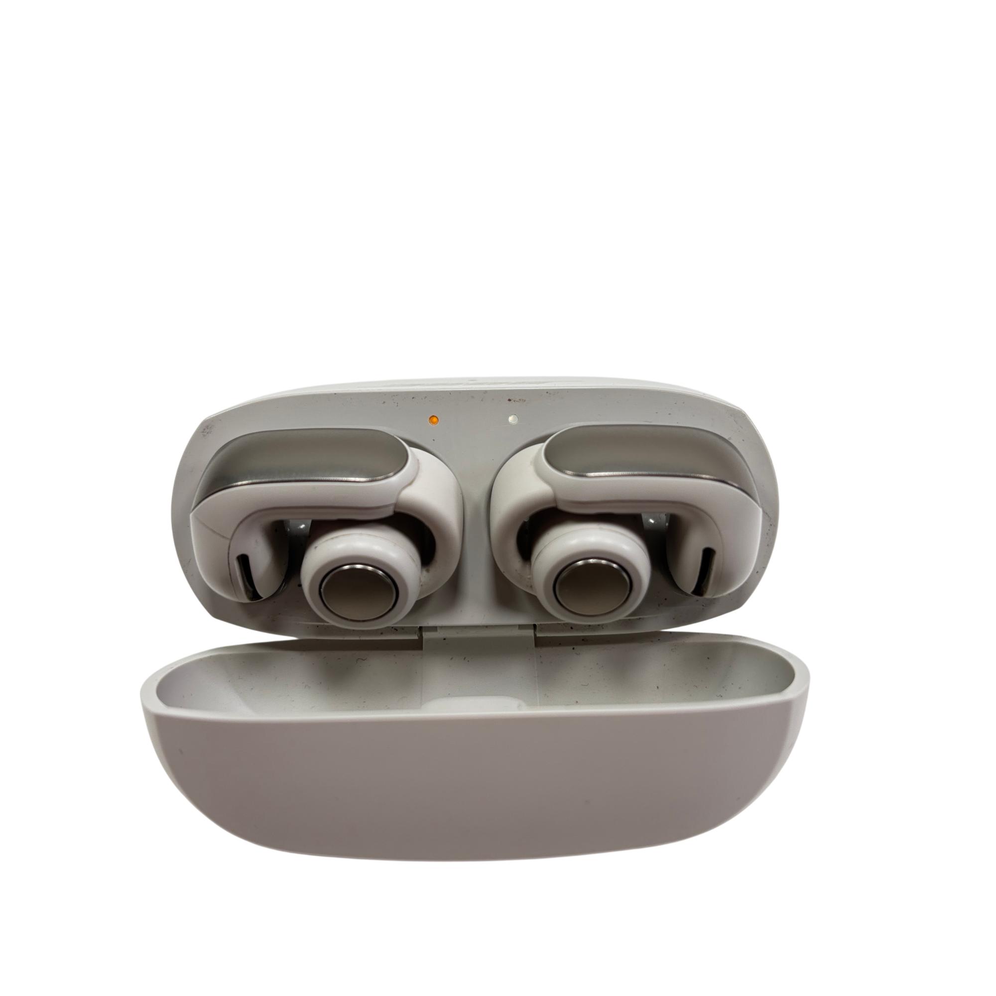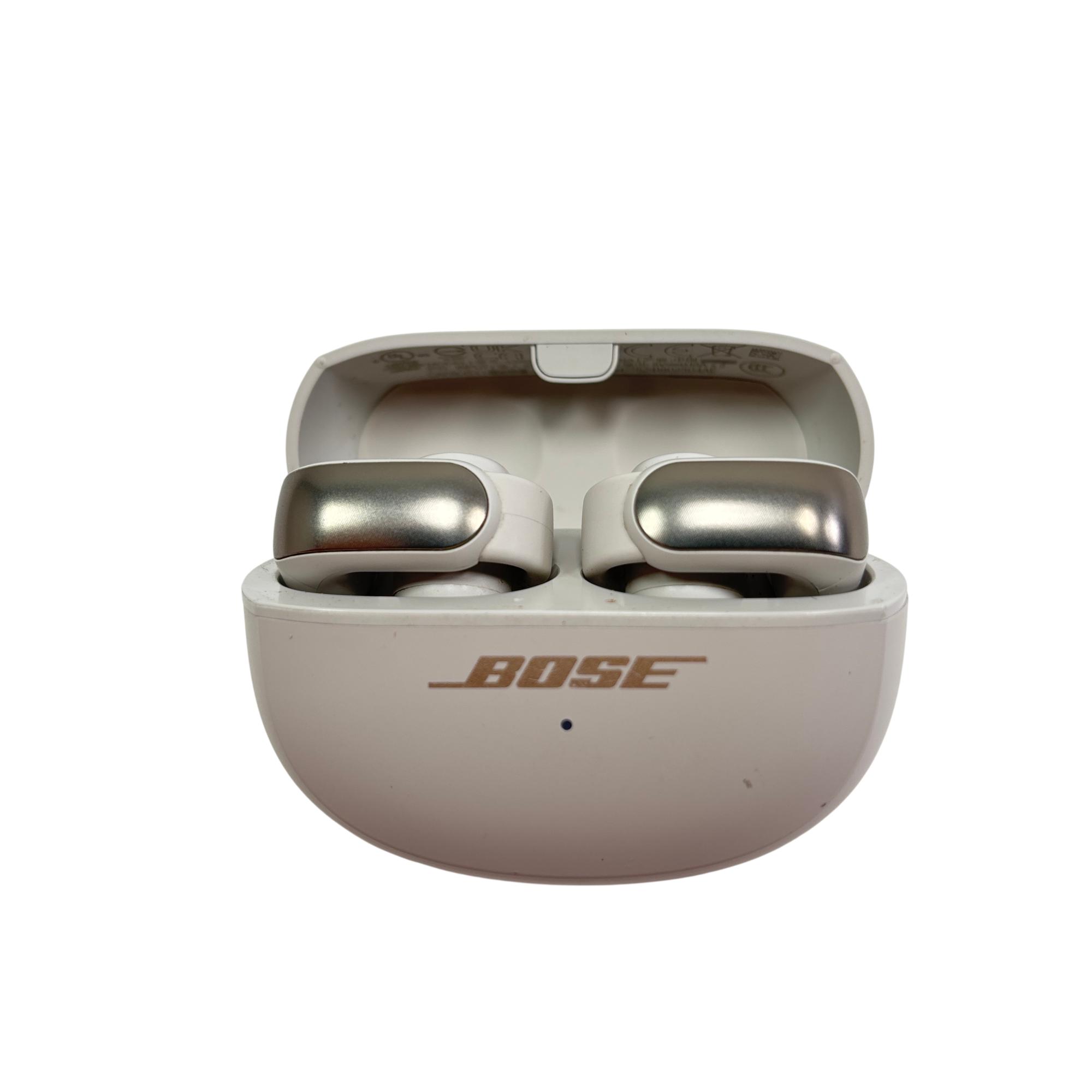 Bose Ultra Open Earbuds are true wireless Bluetooth earbuds designed for a comfortable, open-ear listening experience that keeps users aware of their surroundings. Featuring a sleek white finish with IPX4 water resistance and built-in microphones, these earbuds deliver clear sound and easy connectivity through a compact charging case. Their innovative open design promotes natural sound and breathability, making them ideal for active lifestyles.
