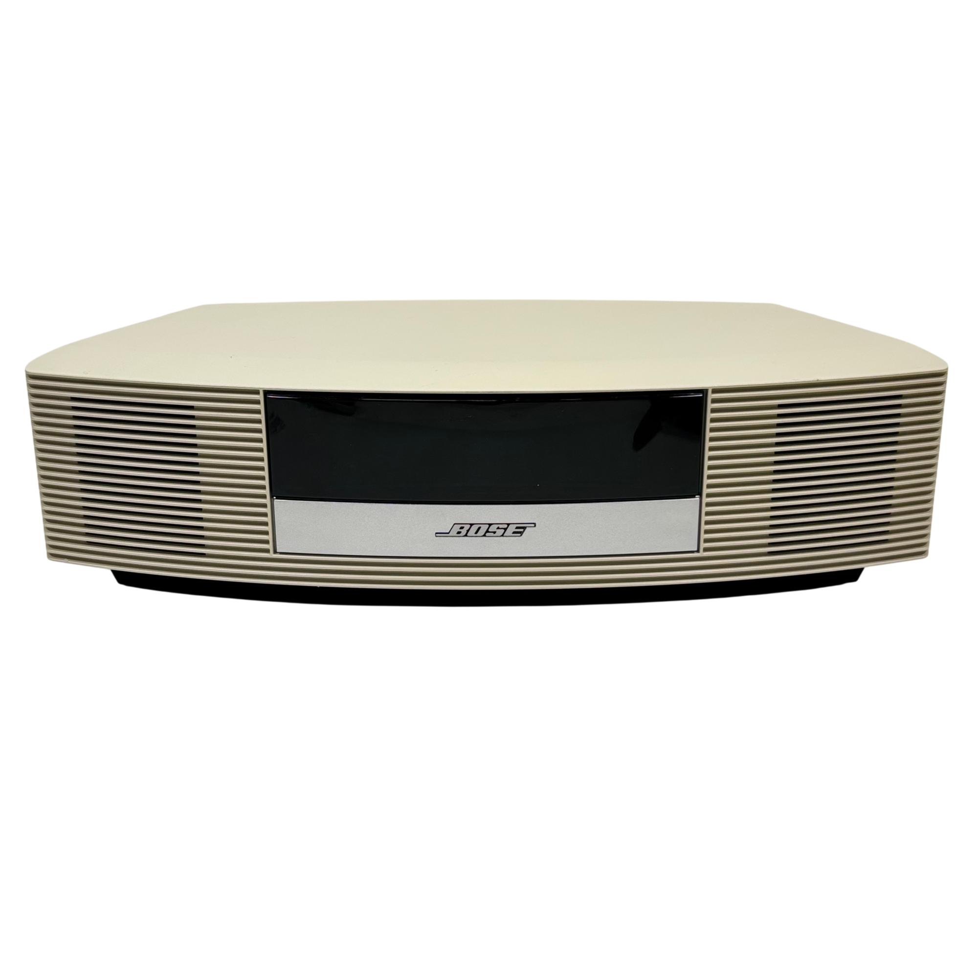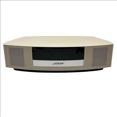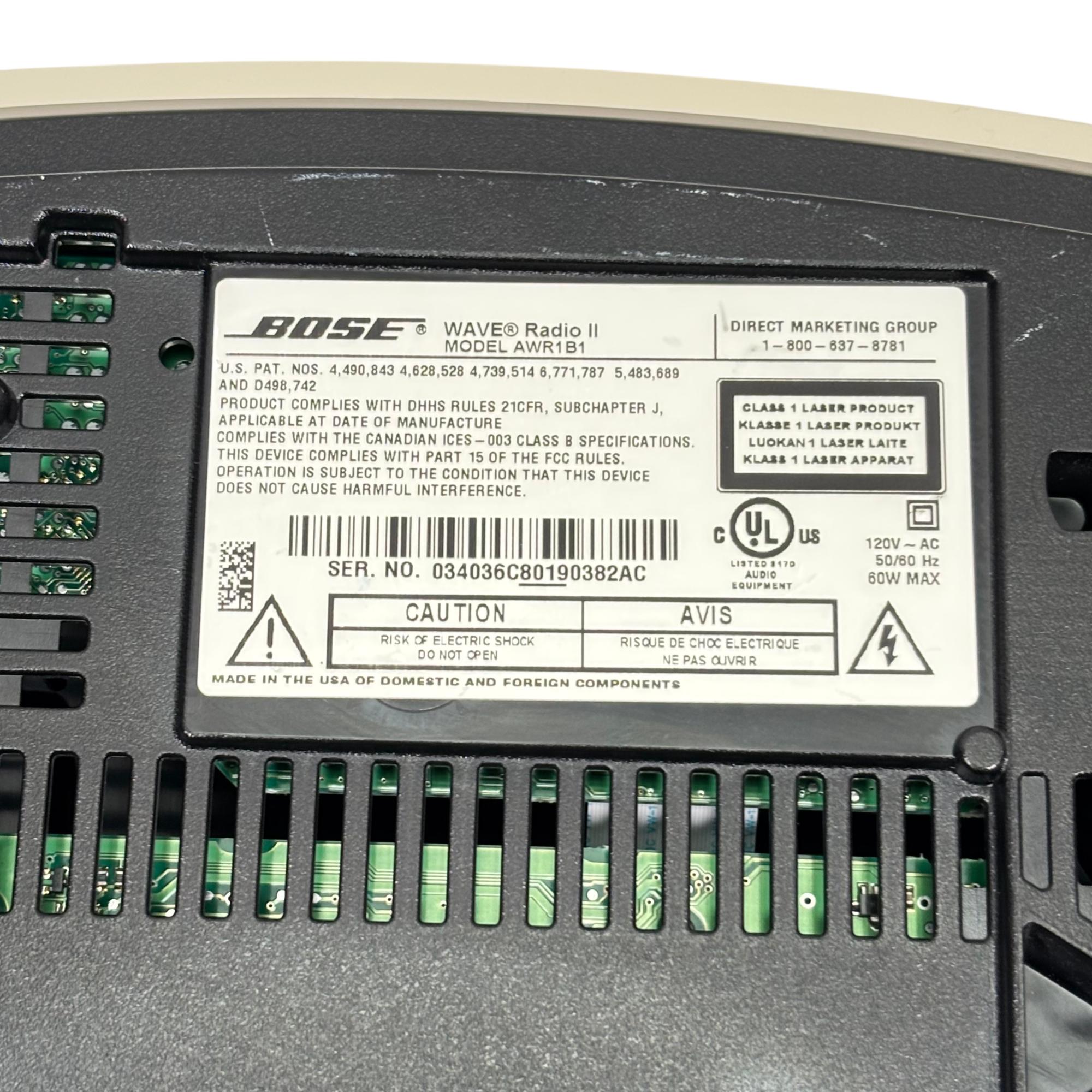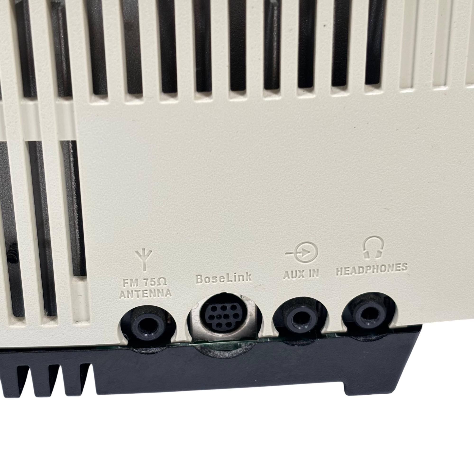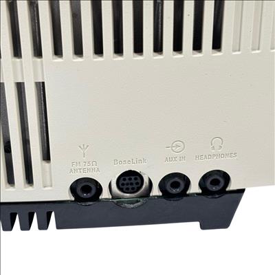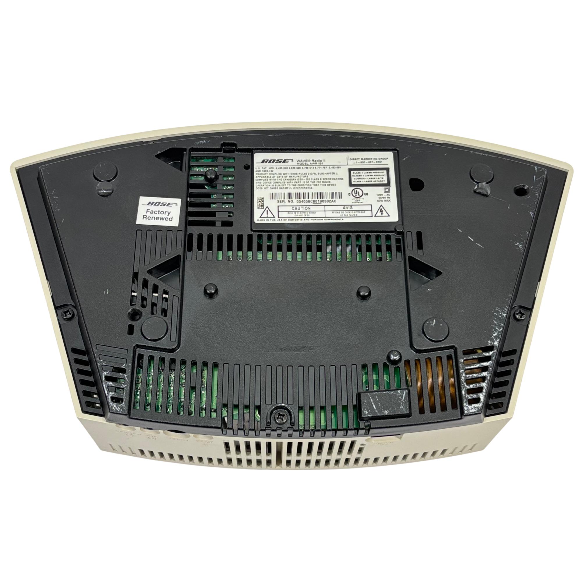 Bose Wave Radio II features a sleek white rectangular design with a contrasting black base, combining modern style with functional audio performance. This tabletop music system offers FM and AM radio tuning along with multiple audio input options including AUX and headphone ports, designed to deliver clear and rich sound. Its compact form includes integrated vents and easy-to-access controls, making it a refined addition to any living space.