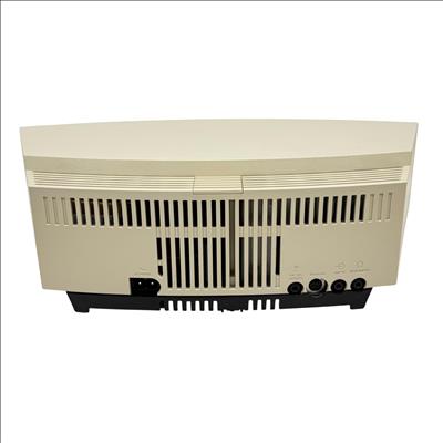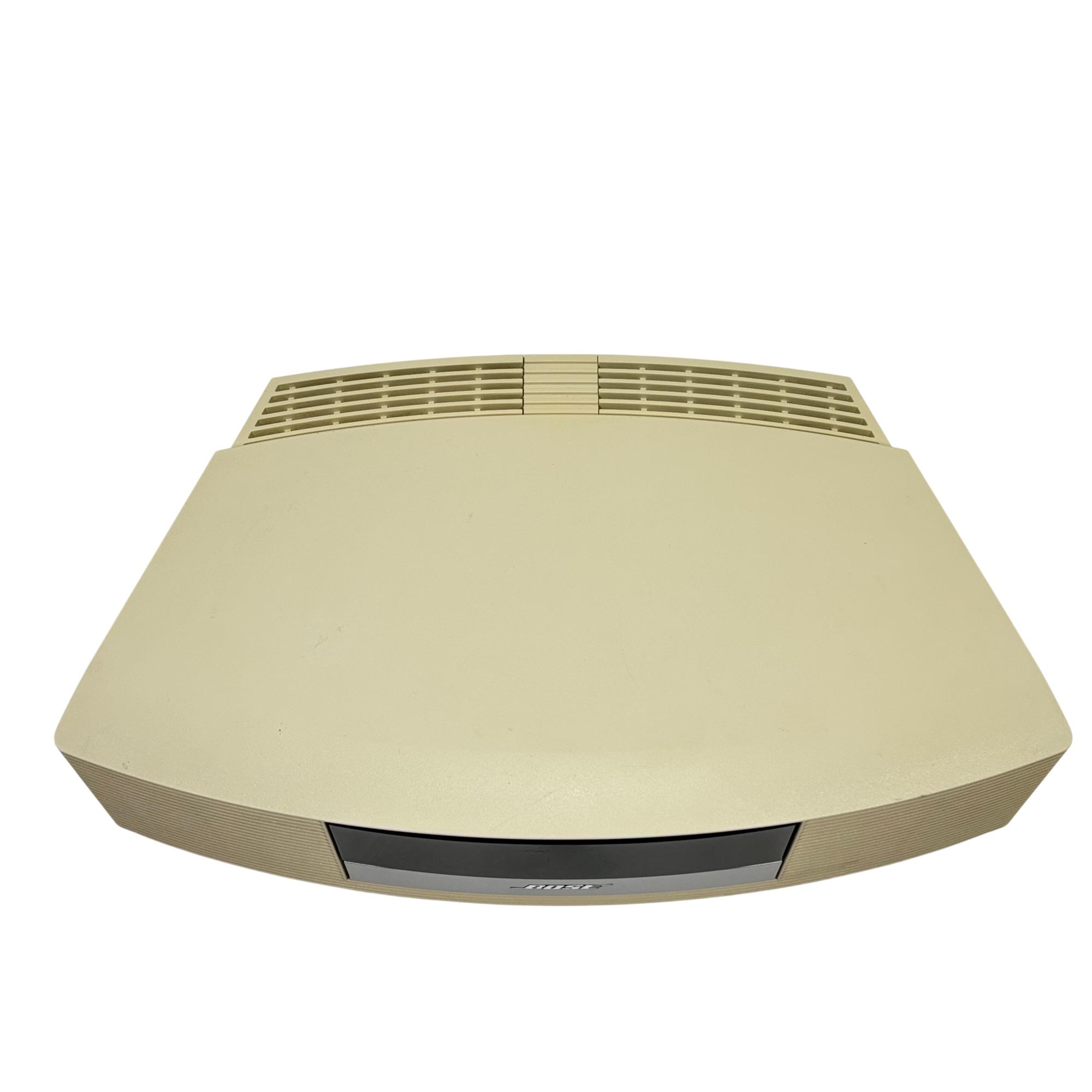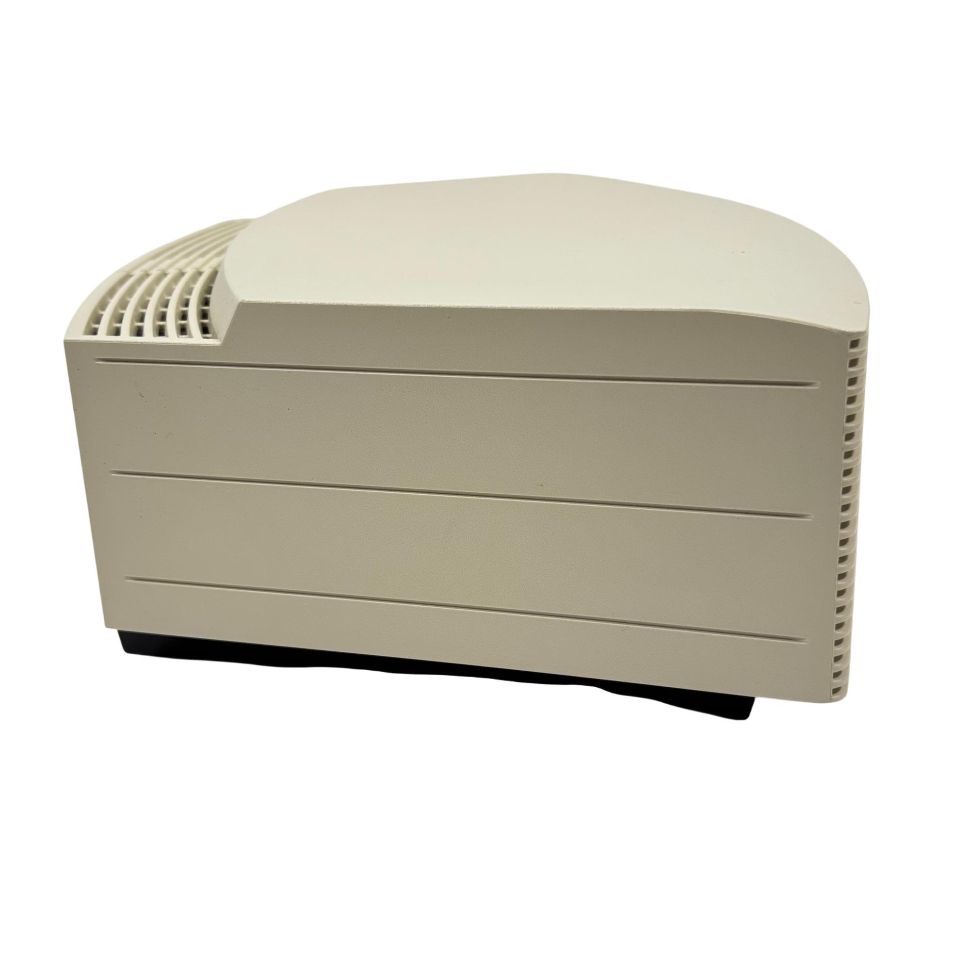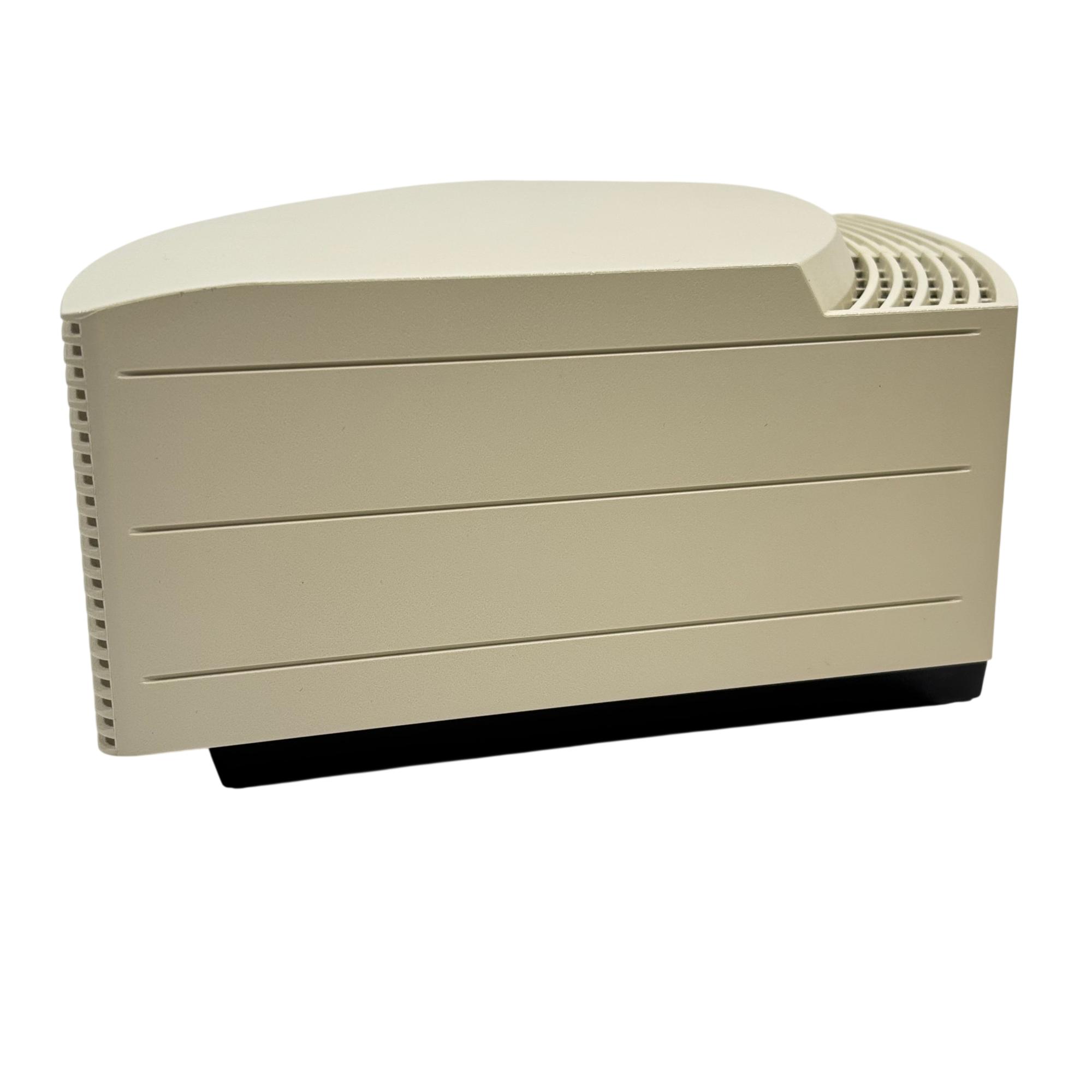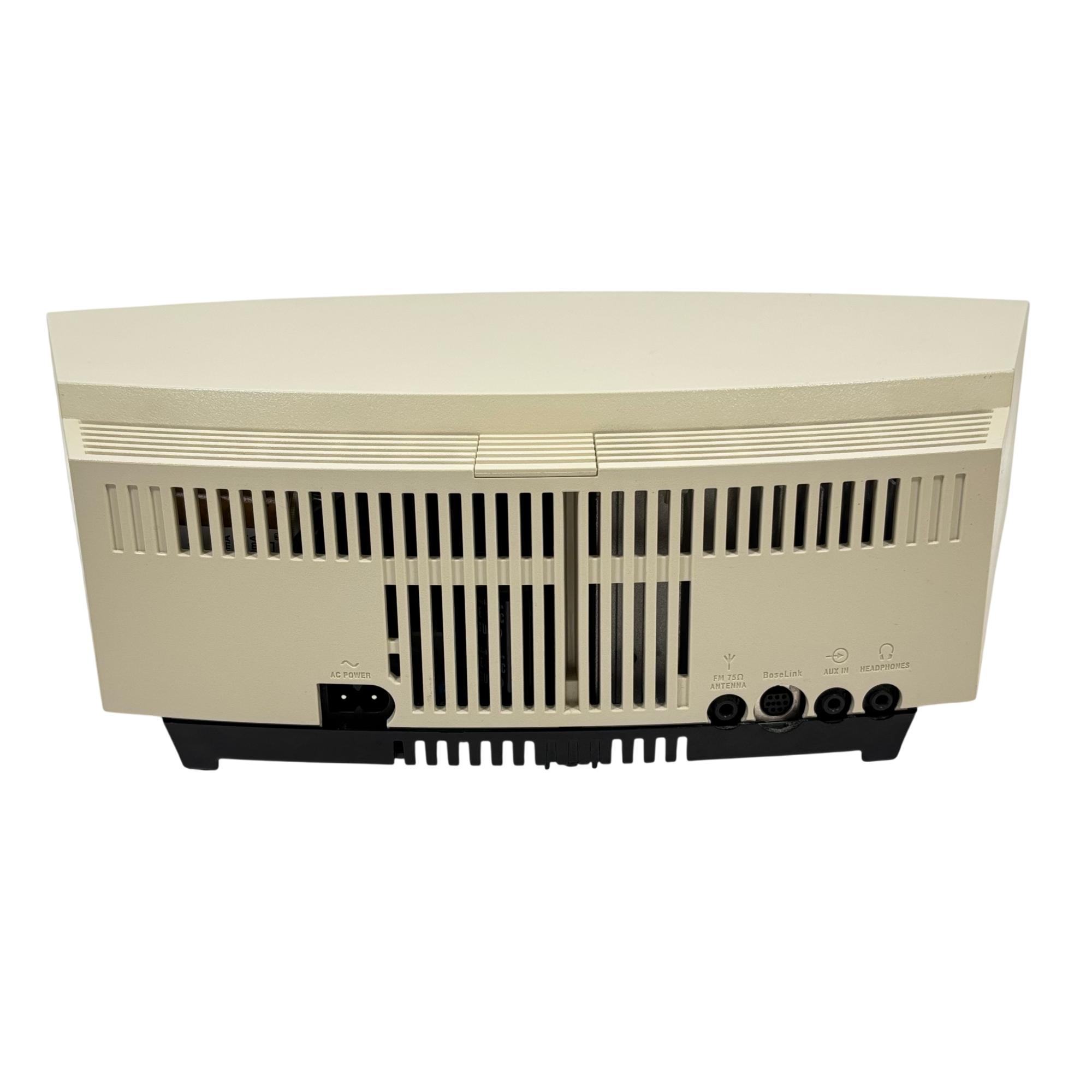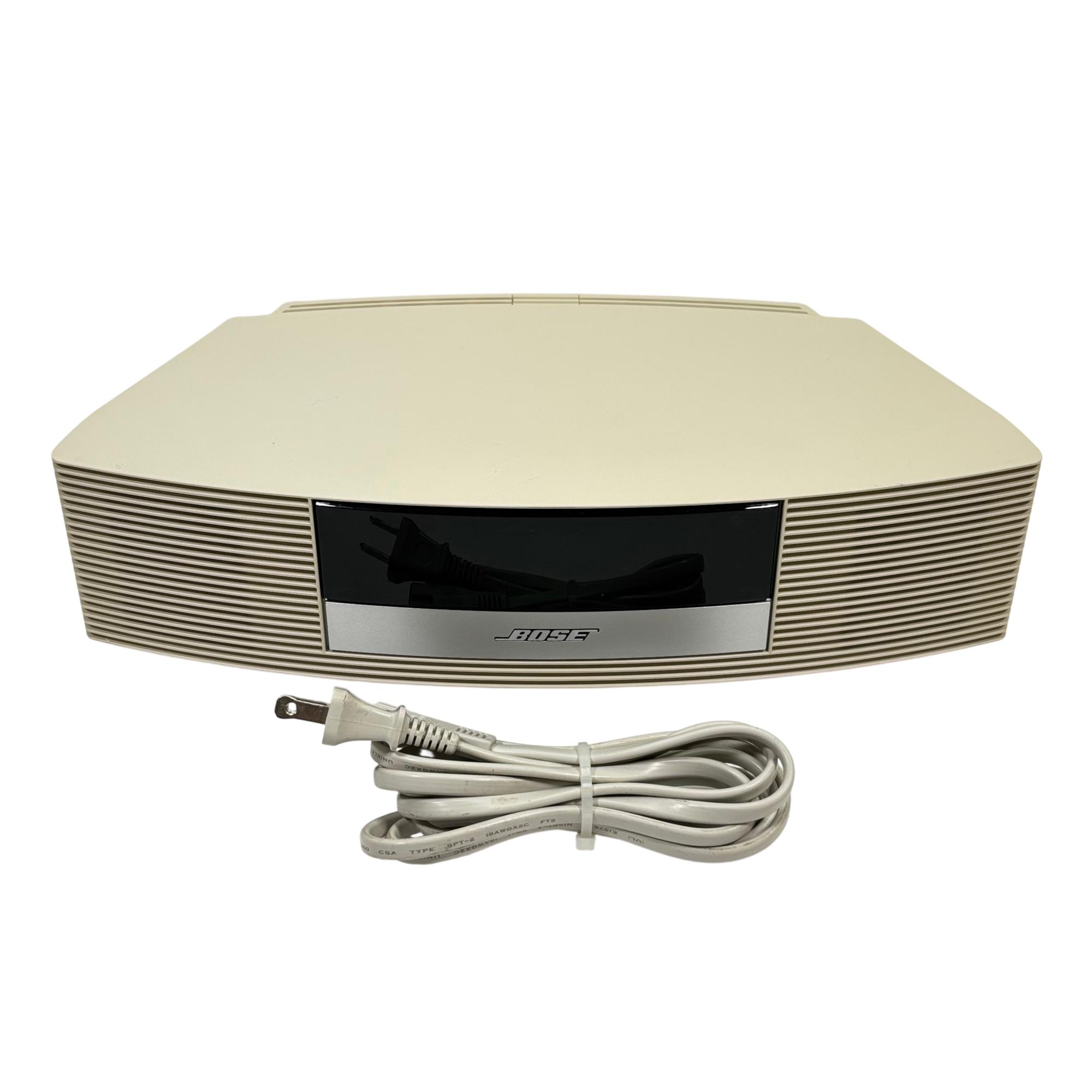 Bose Wave Radio II features a sleek white rectangular design with a contrasting black base, combining modern style with functional audio performance. This tabletop music system offers FM and AM radio tuning along with multiple audio input options including AUX and headphone ports, designed to deliver clear and rich sound. Its compact form includes integrated vents and easy-to-access controls, making it a refined addition to any living space.