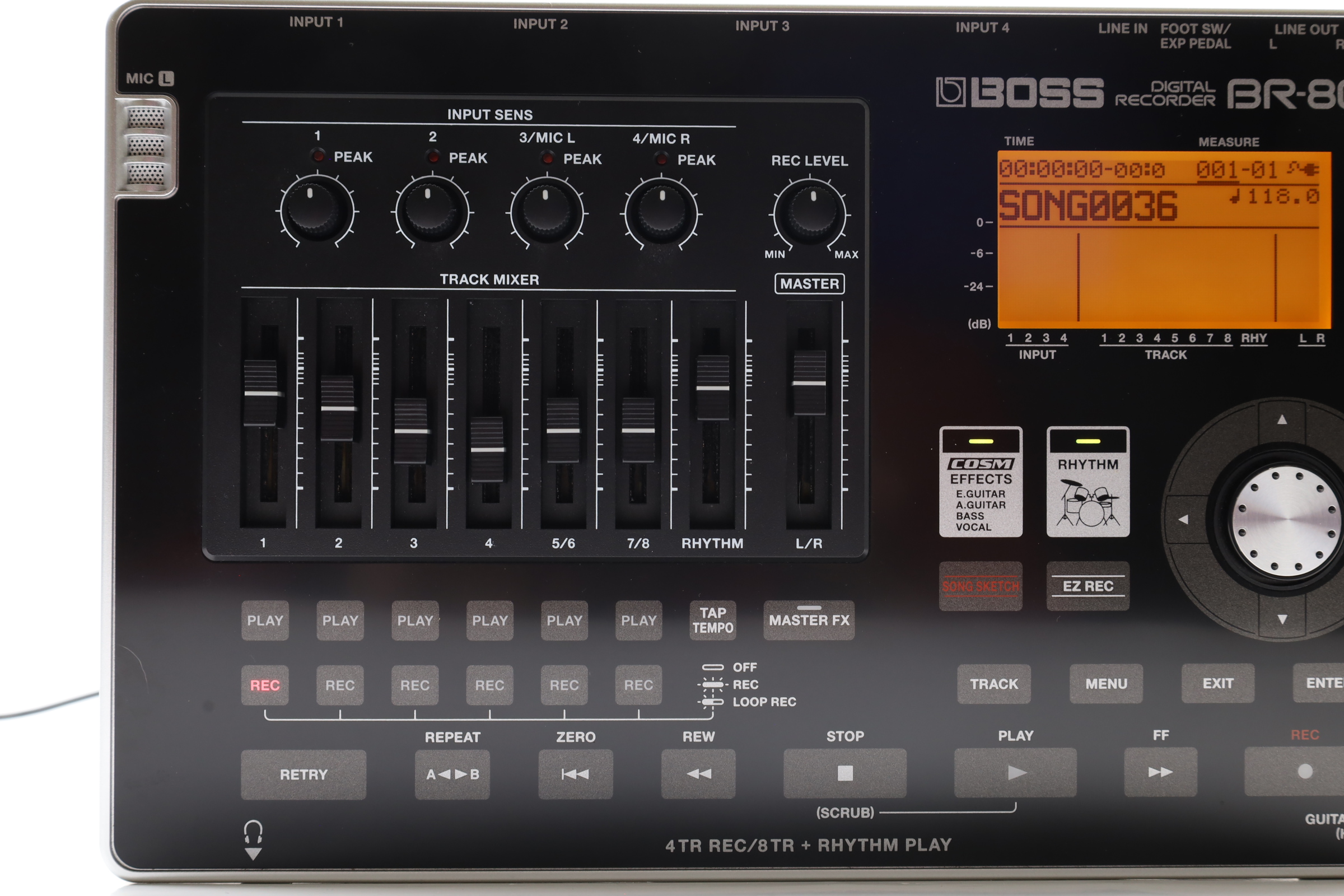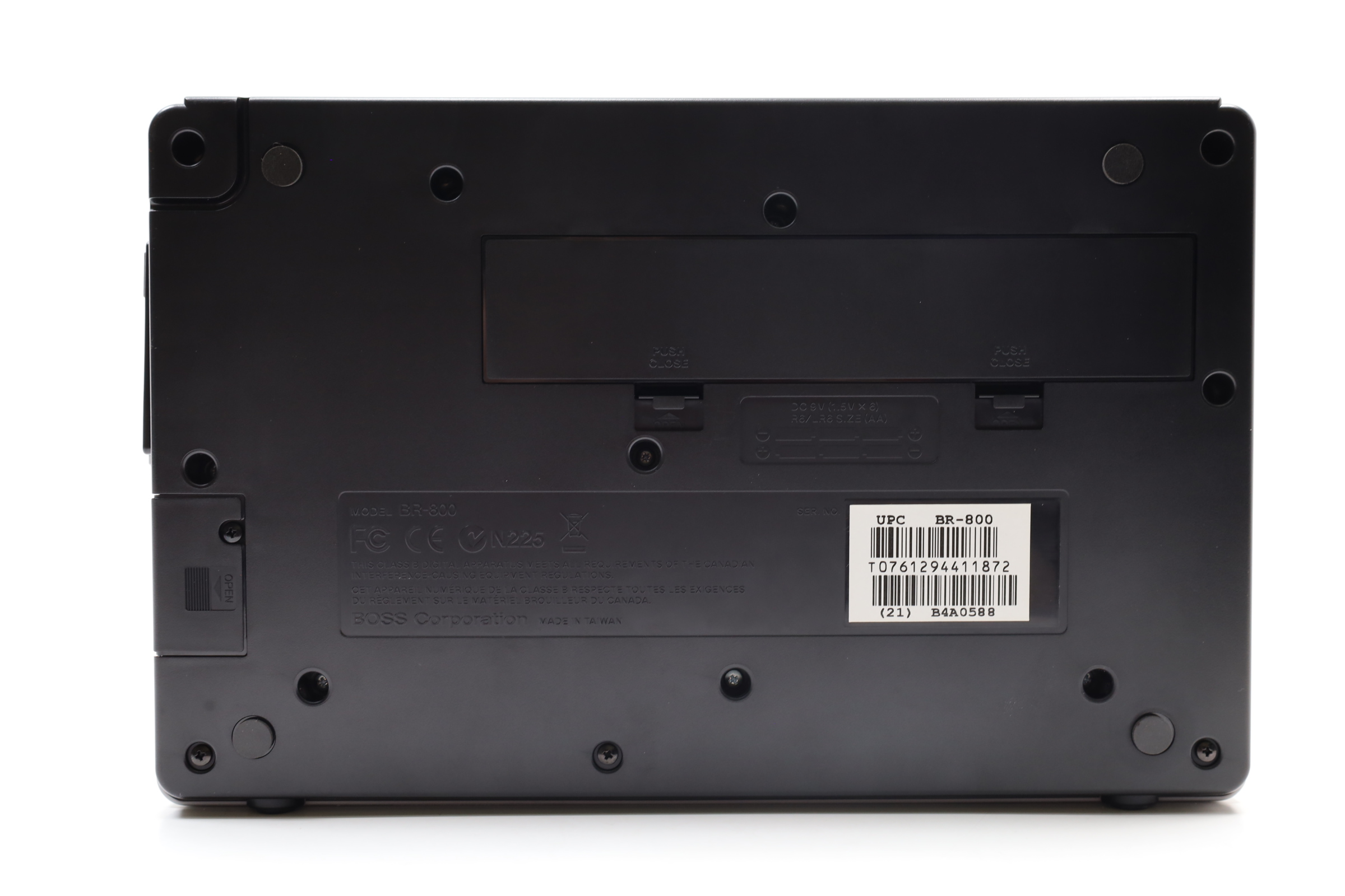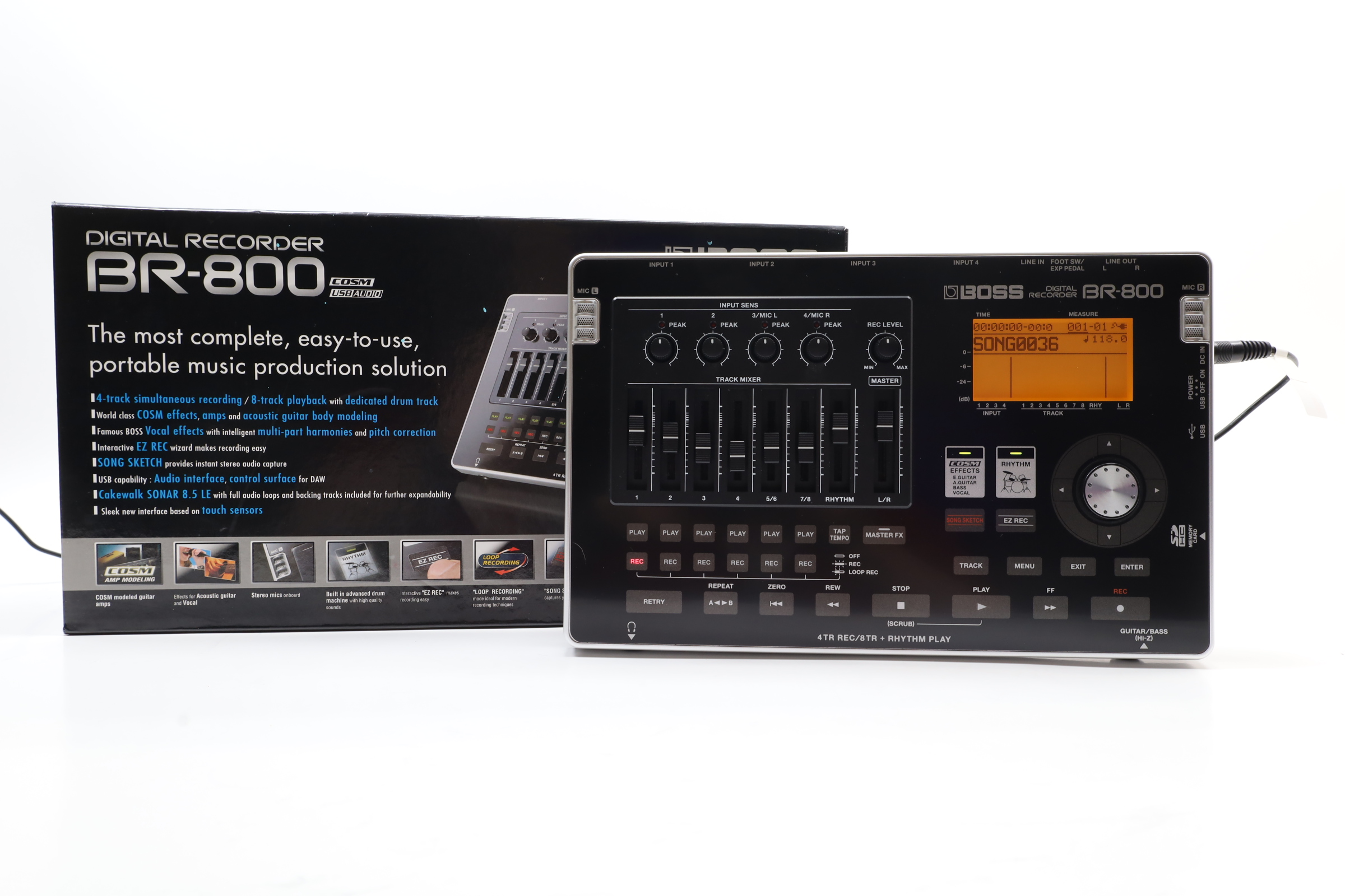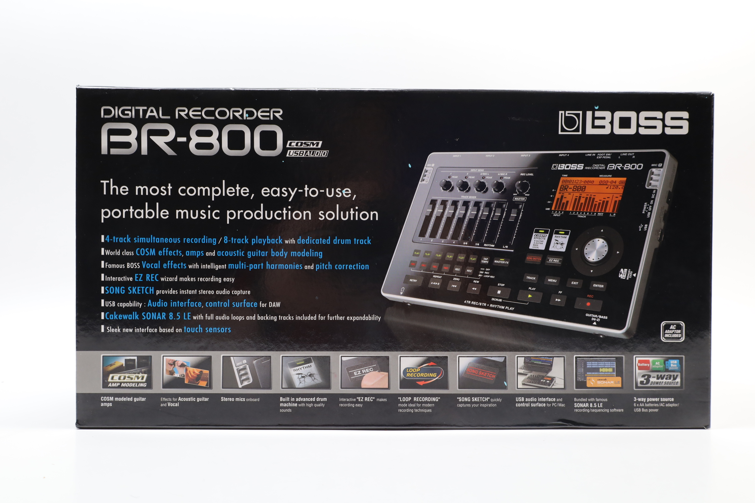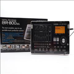 Offers a compact, portable studio with touch-sensor switches and SD-card recording media. It allows simultaneous recording on up to four tracks with playback on eight tracks, plus an additional stereo track for its built-in rhythm generator. The BR-800 features a powerful effects processor including GT-10/10B effects, VE-20 vocal effects and harmonies, and COSM-based acoustic-guitar body modeling. The EZ Recording function guides users through the recording process interactively. Additionally, it has a built-in stereo microphone for quick "Song Sketch" recordings, making it a versatile tool for capturing musical inspiration on the go. It supports a sample rate of 44.1 kHz, frequency response of 20 Hz to 20 kHz, and 24-bit AD/DA conversion using Roland's proprietary Adaptive Focus method for improved signal-to-noise ratio.