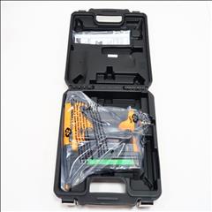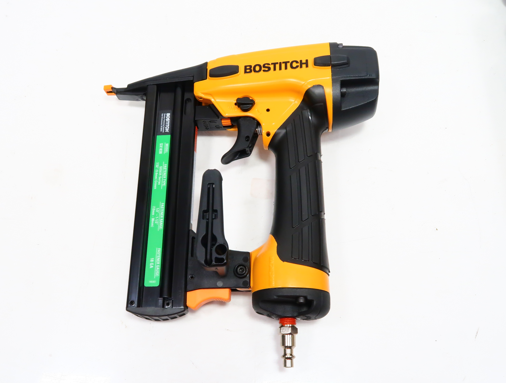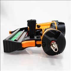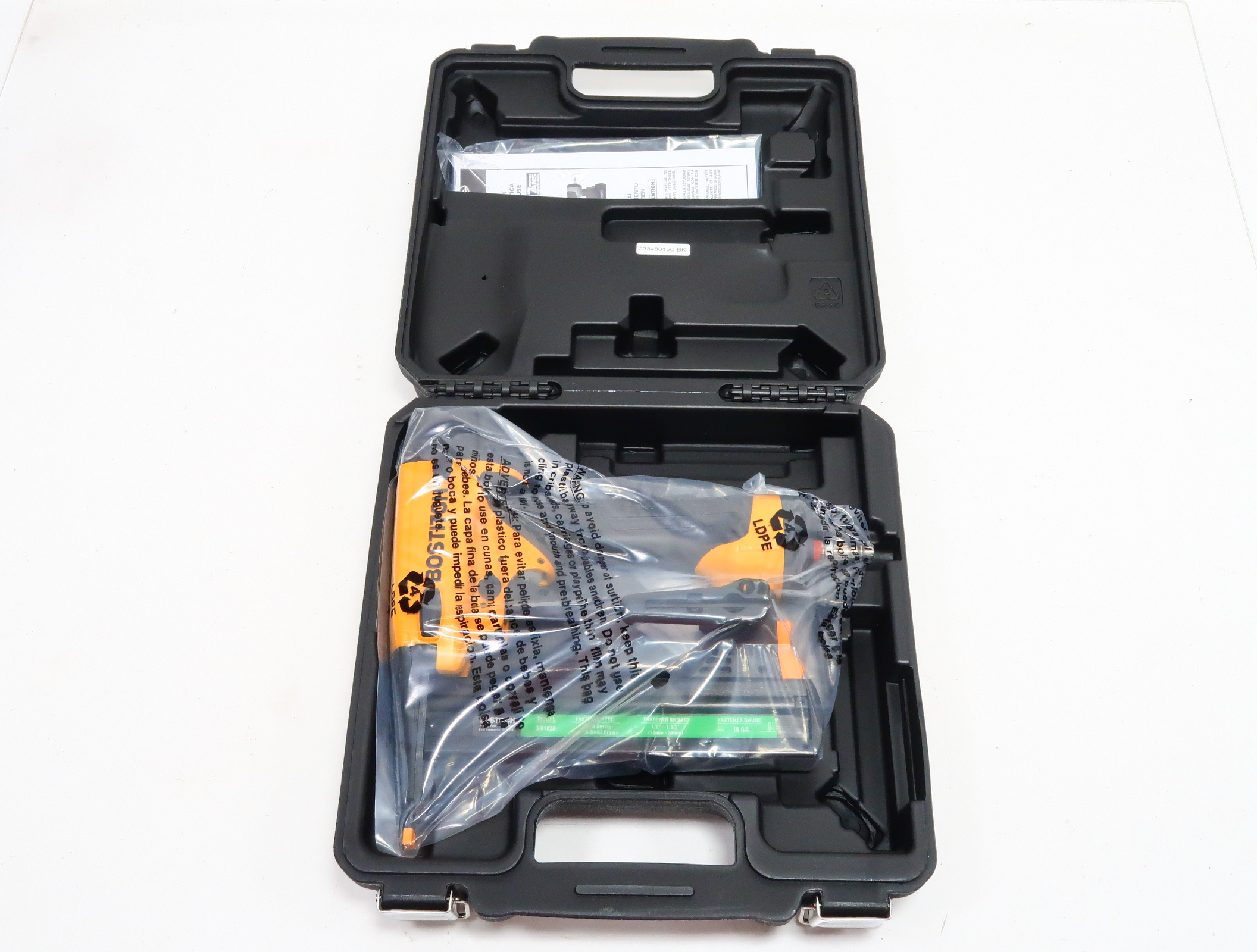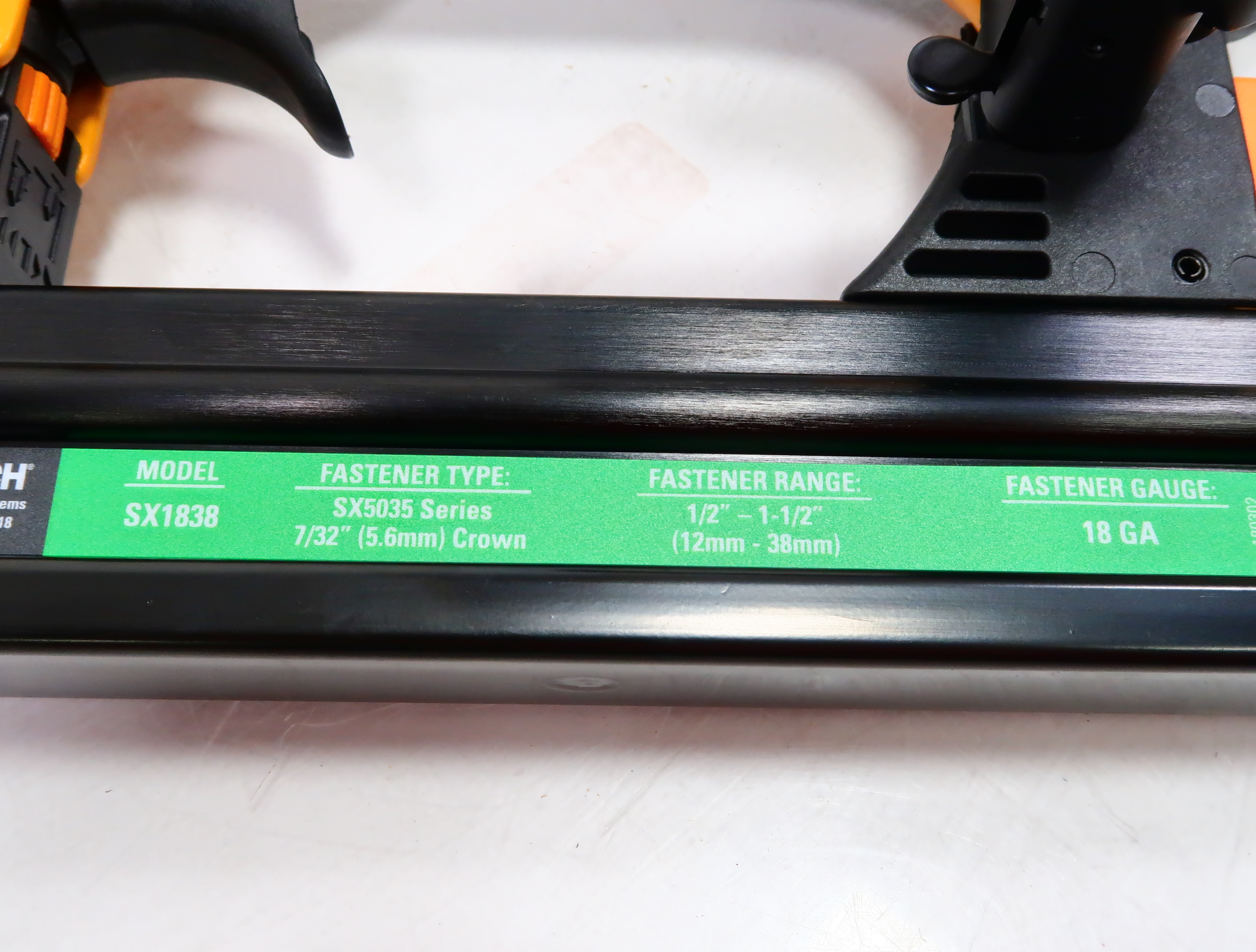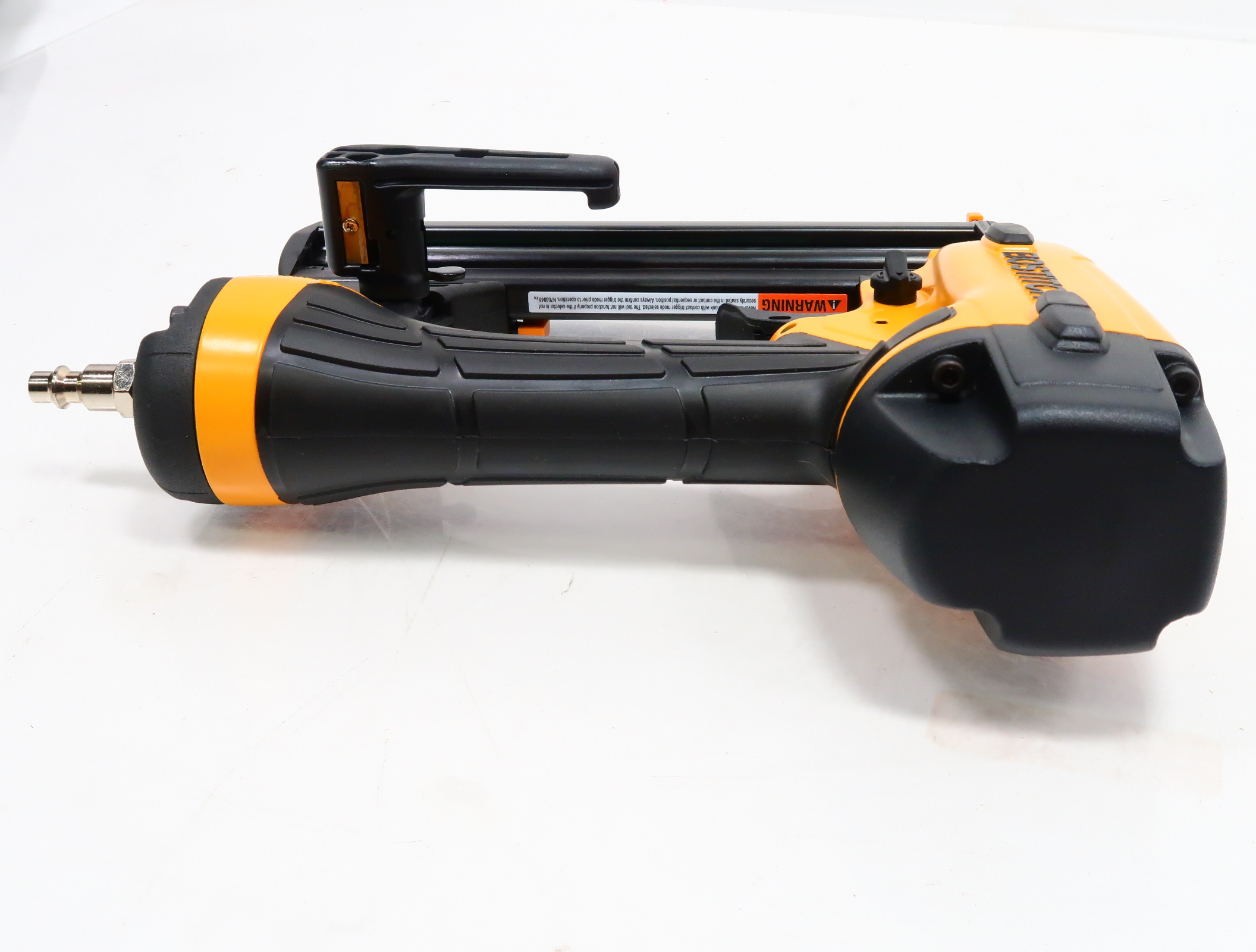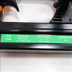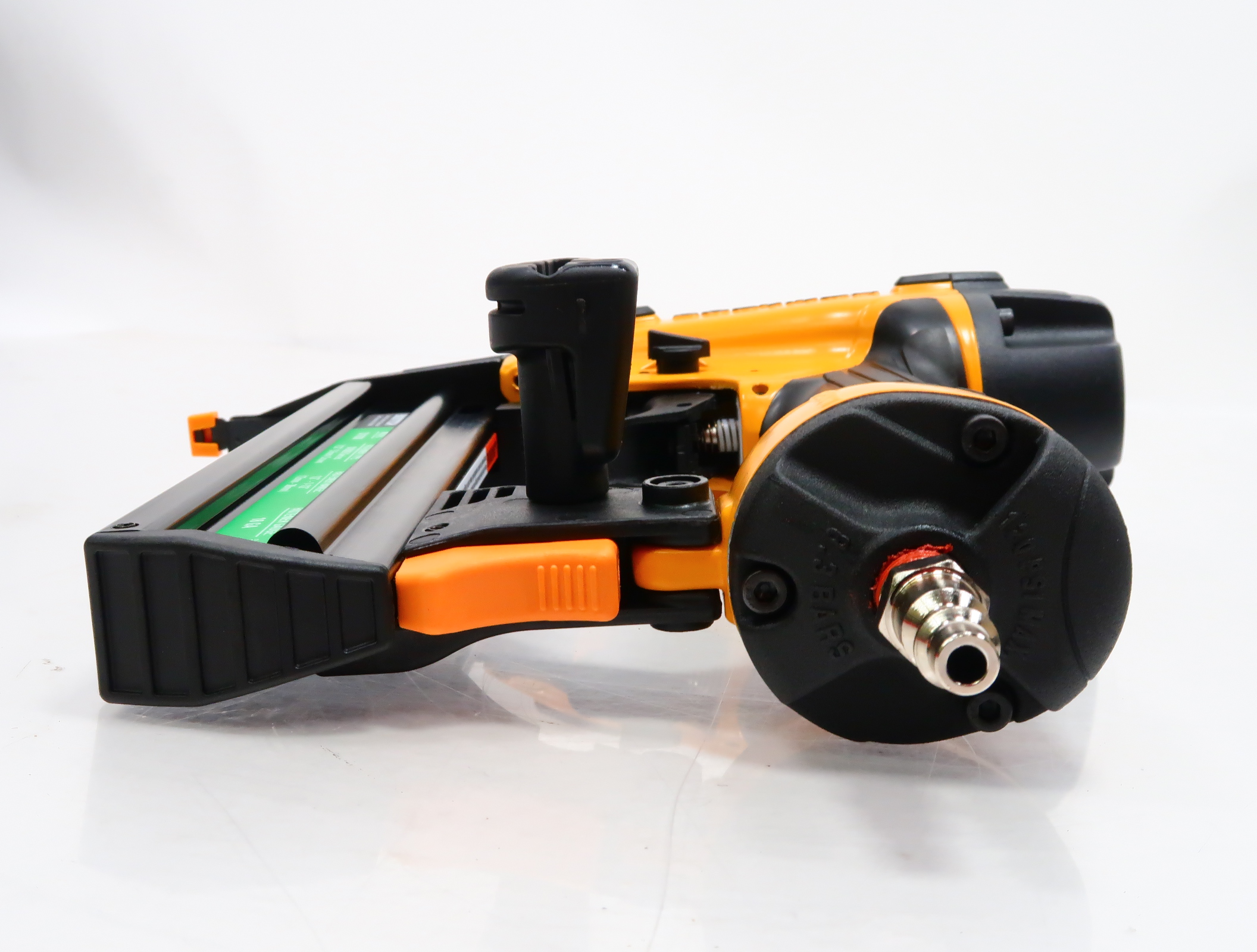 A versatile 18-gauge pneumatic crown finish stapler, notable for its user-friendly features and durable construction. It offers a selectable trigger system, allowing users to switch between sequential and contact operation effortlessly. The oil-free operation of this stapler ensures maintenance-free usage and eliminates the risk of oil stains on work surfaces. It includes a unique Low Nail Lockout feature that prevents dry firing, enhancing the tool's longevity. For user convenience, the stapler is equipped with an ultra-quiet rear exhaust with a muffler, directing air away from the user, and a reversible belt hook that comes with an integrated pencil sharpener. Precision in stapling is ensured by the Dial-A-Depth control, which allows for exact countersinking of staples. The stapler's lightweight magnesium design contributes to its durability without adding extra weight, making it easier to handle. It has a staple crown size of 7/32 inches, a magazine capacity of 100 staples, and can accommodate a maximum staple length of 1.5 inches.