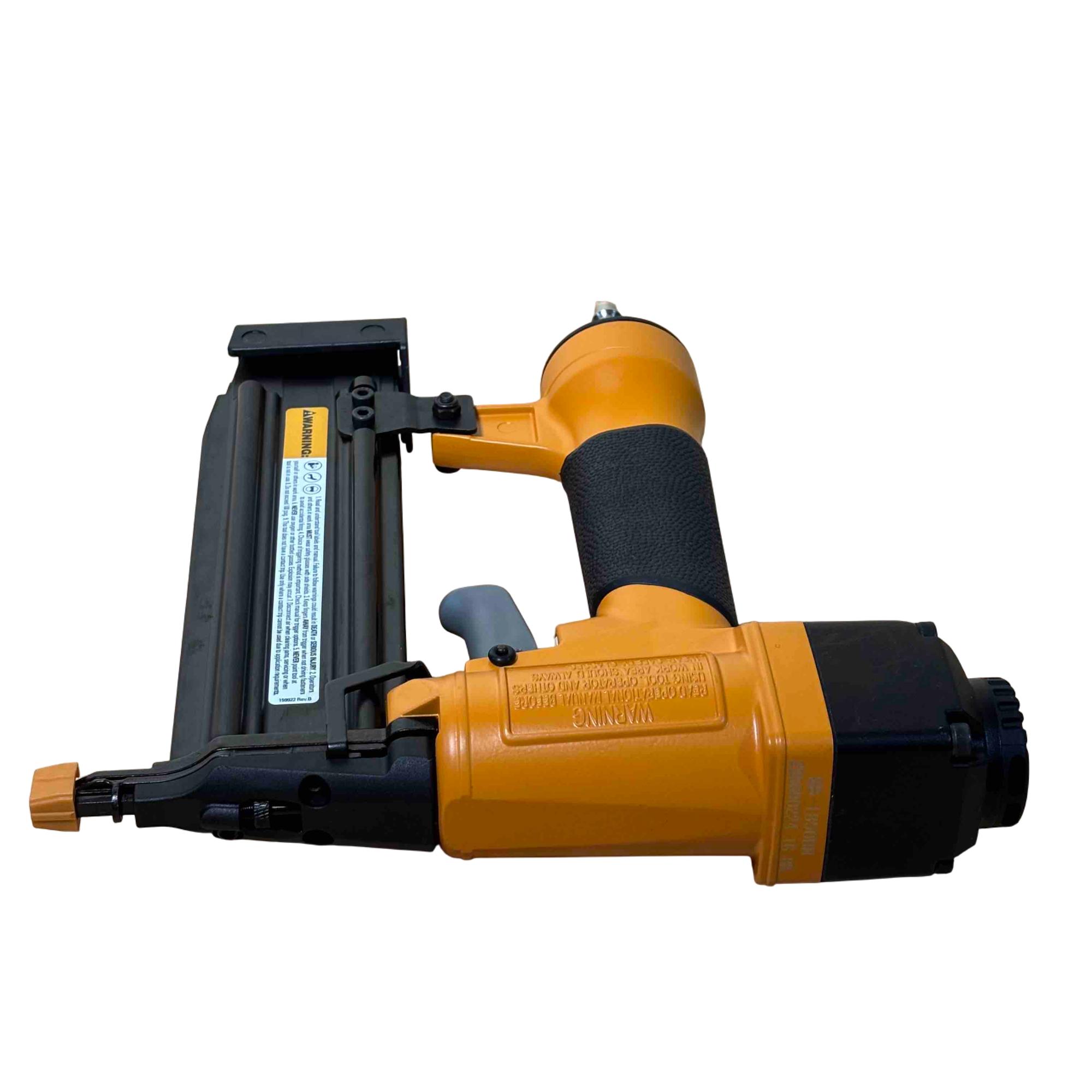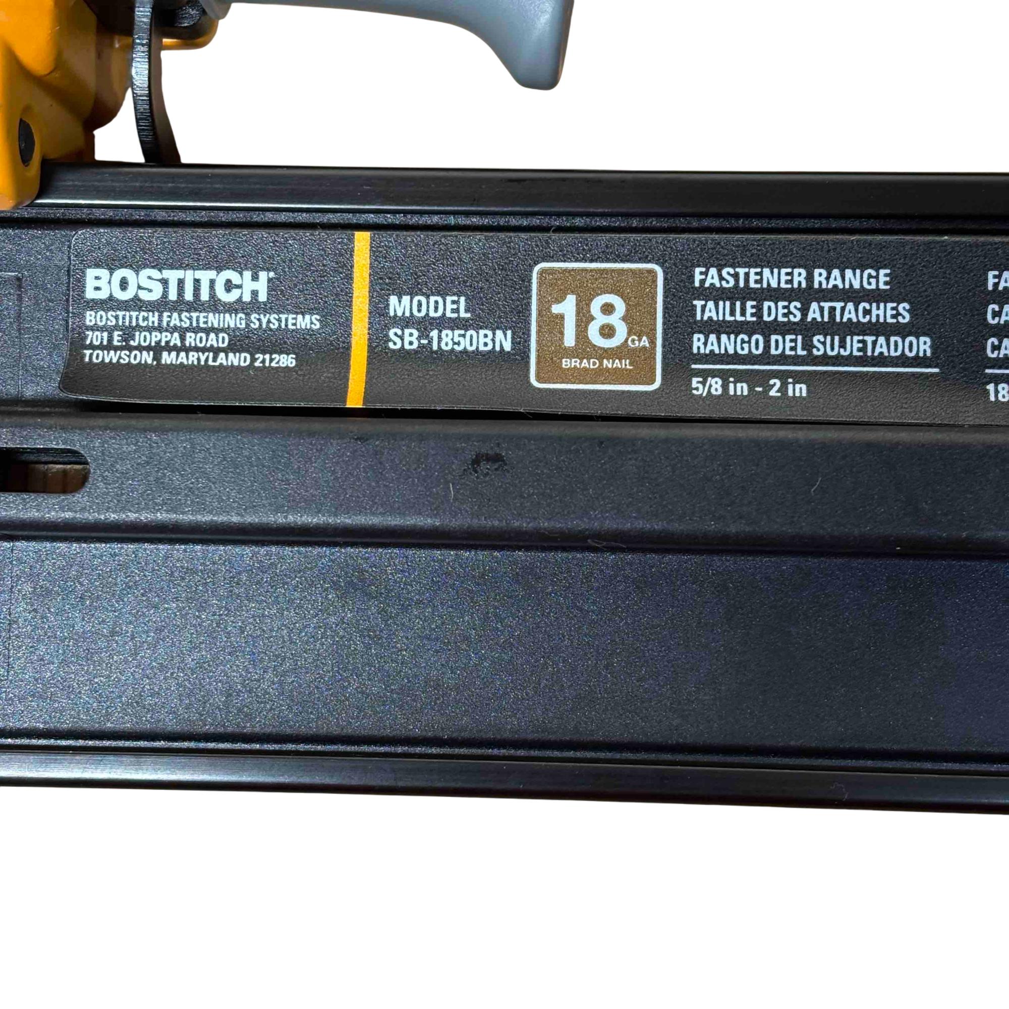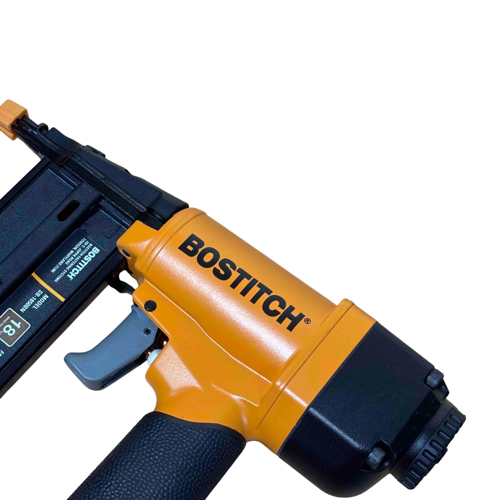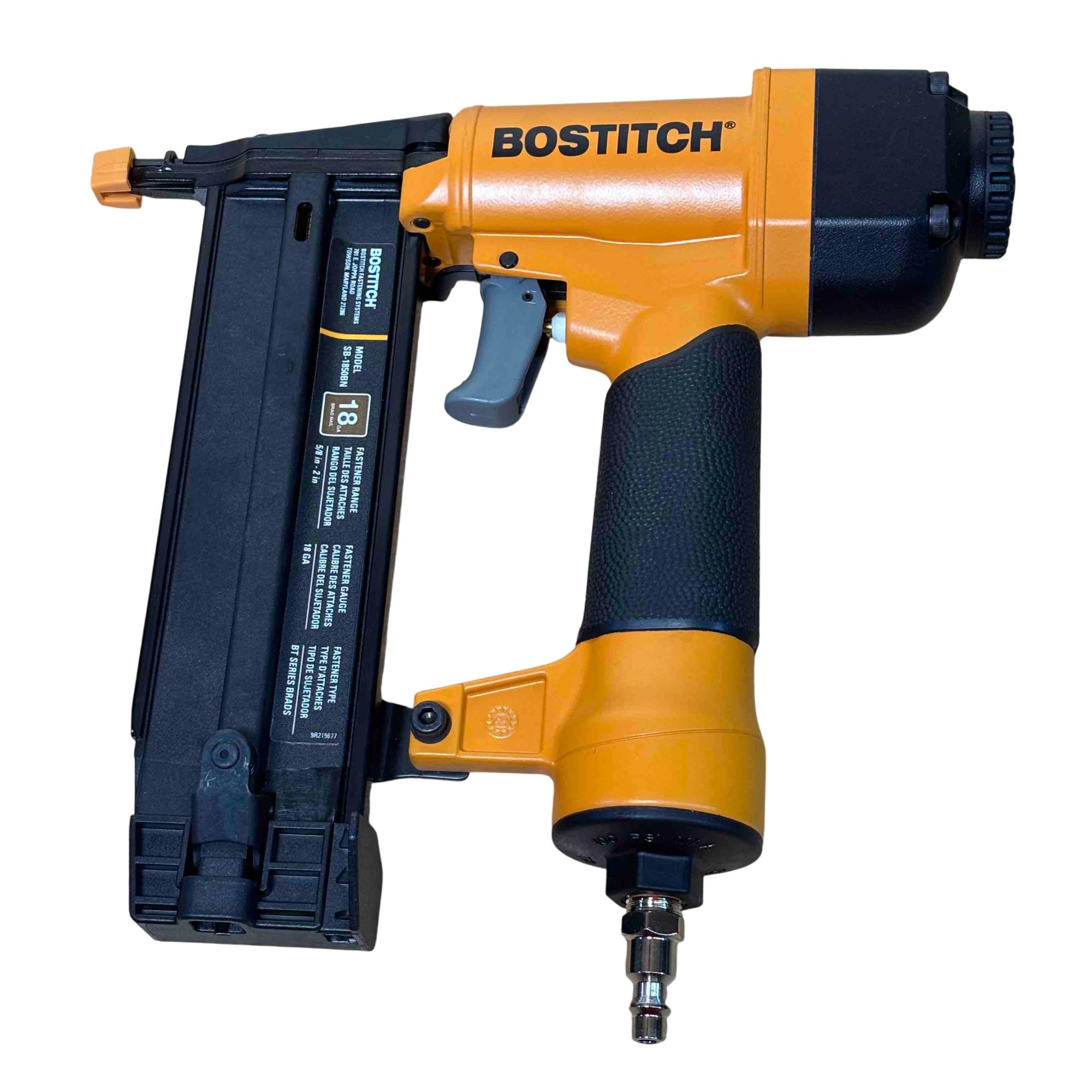Upgrade your toolbox with the BOSTITCH SB-1850BN, a durable and reliable 18-gauge pneumatic brad nailer perfect for detailed finishing work. Its yellow and black design stands out, and with adjustable depth control and compatibility with BT Series brads (5/8 in - 2 in), its ideal for carpentry, cabinetry, and DIY projects. Enjoy effortless performance and precision nailing with this light-use, professional-grade tool.