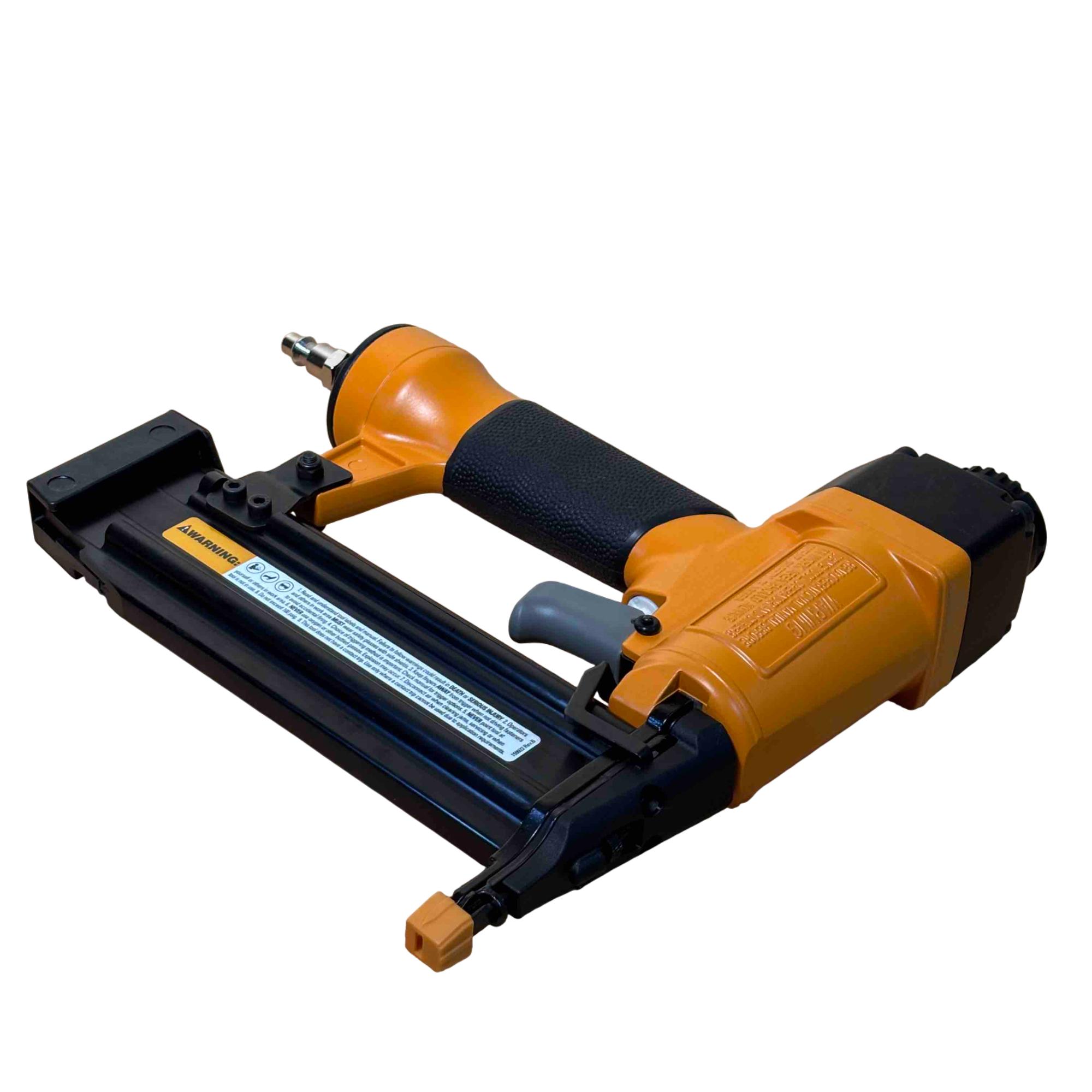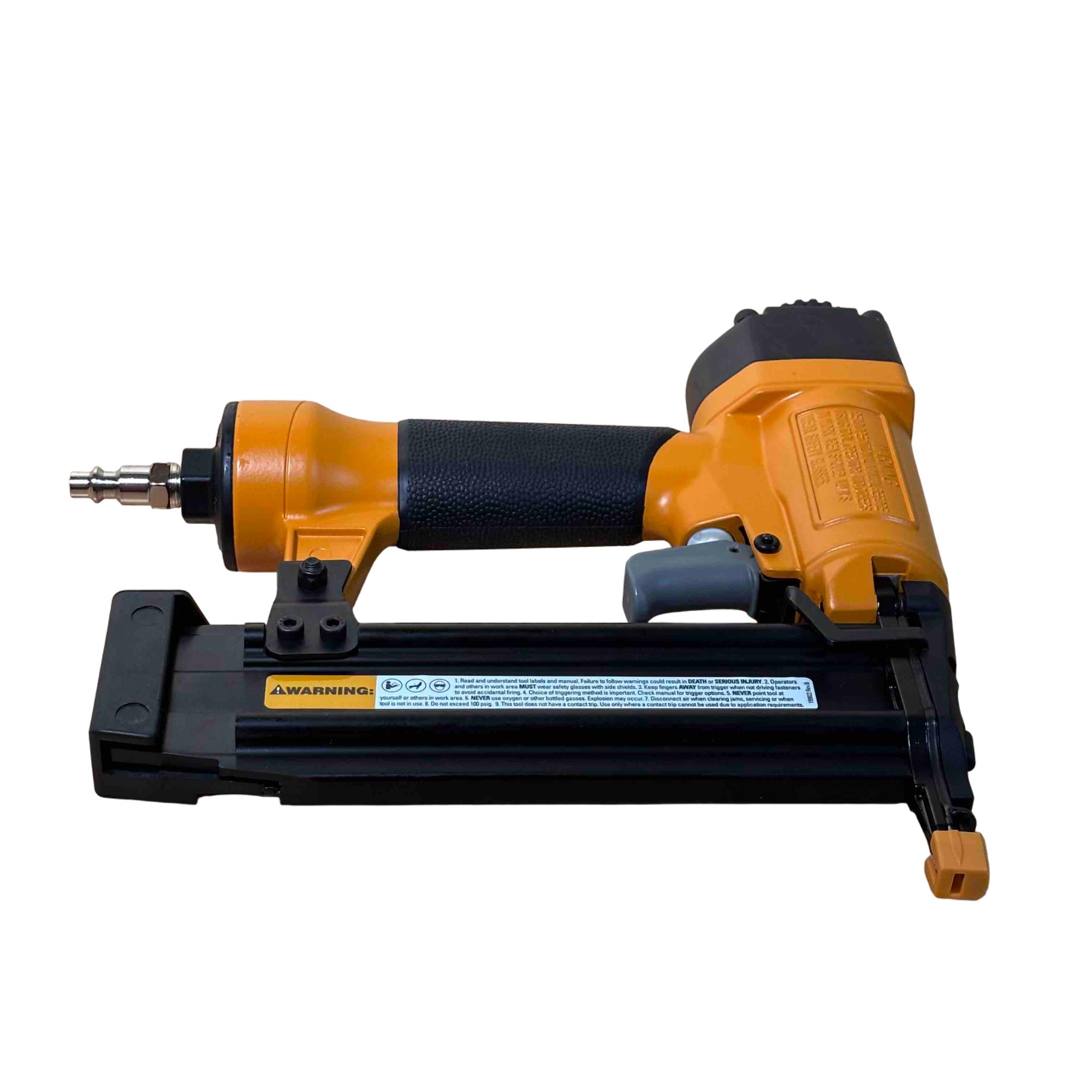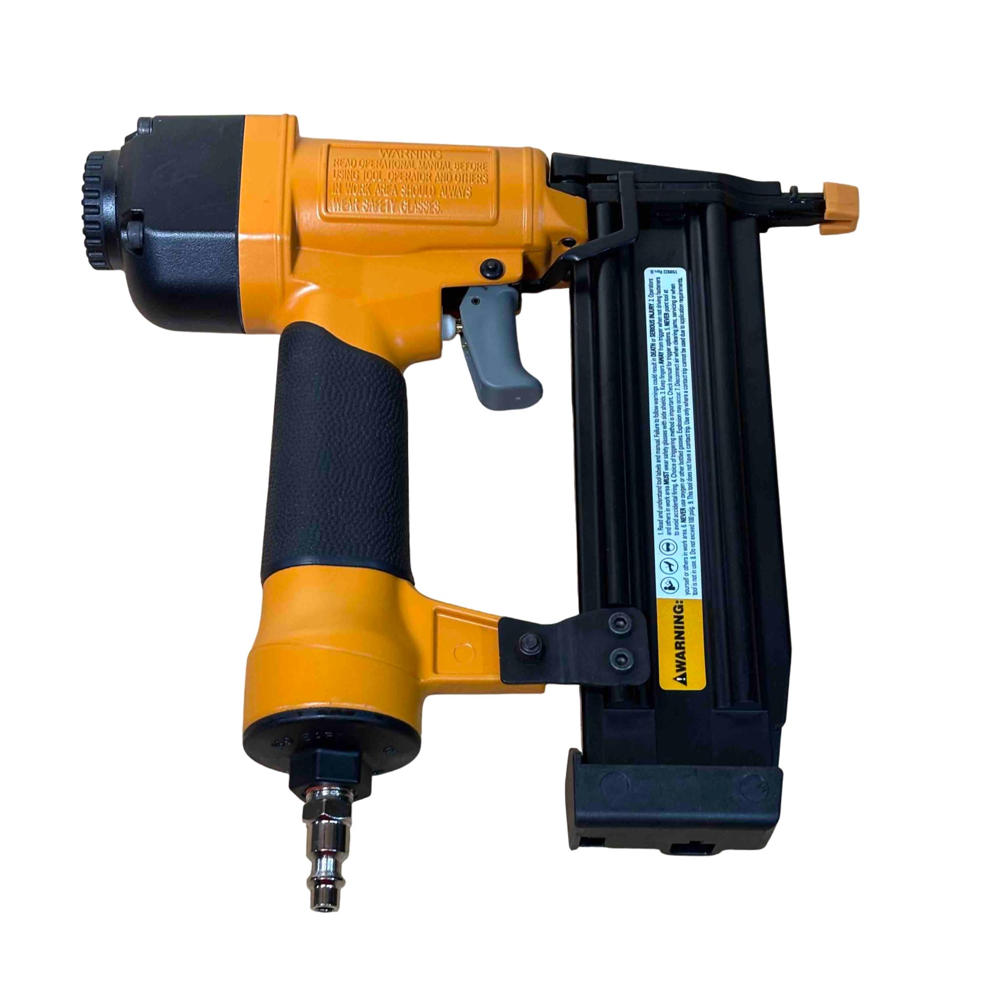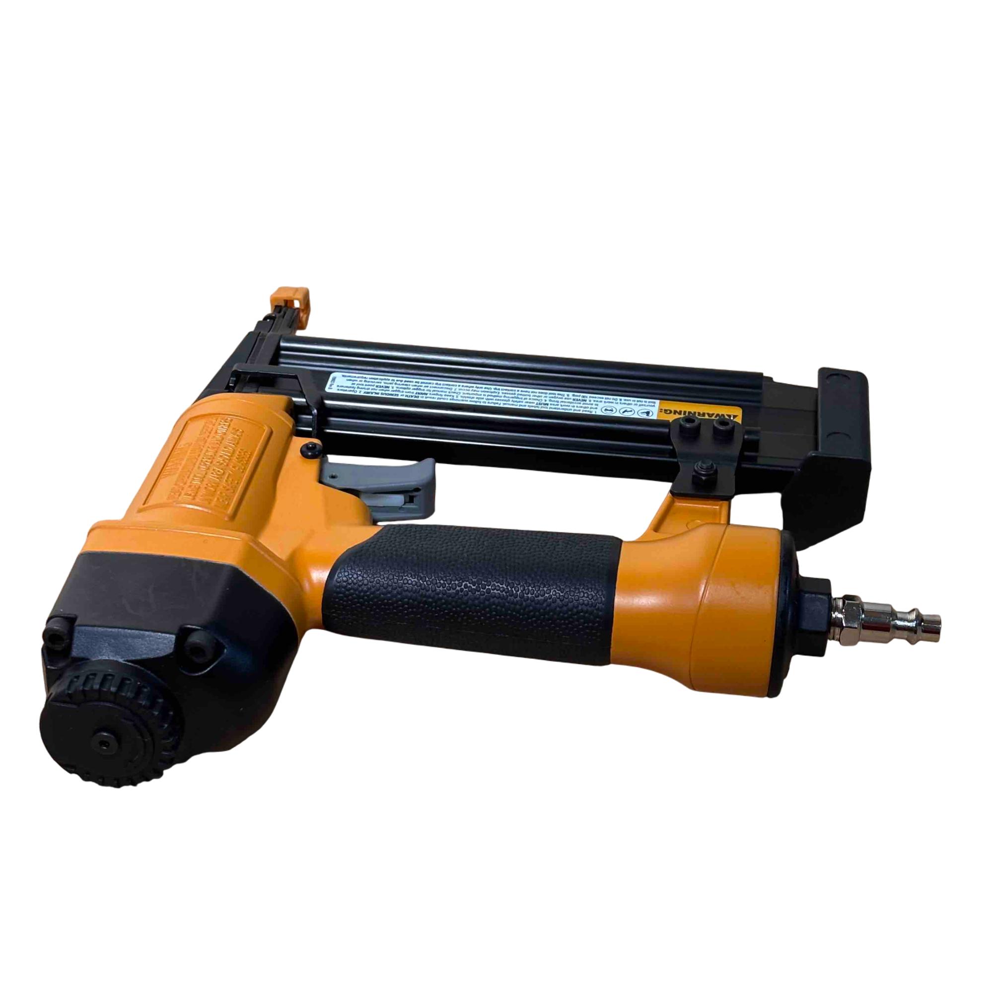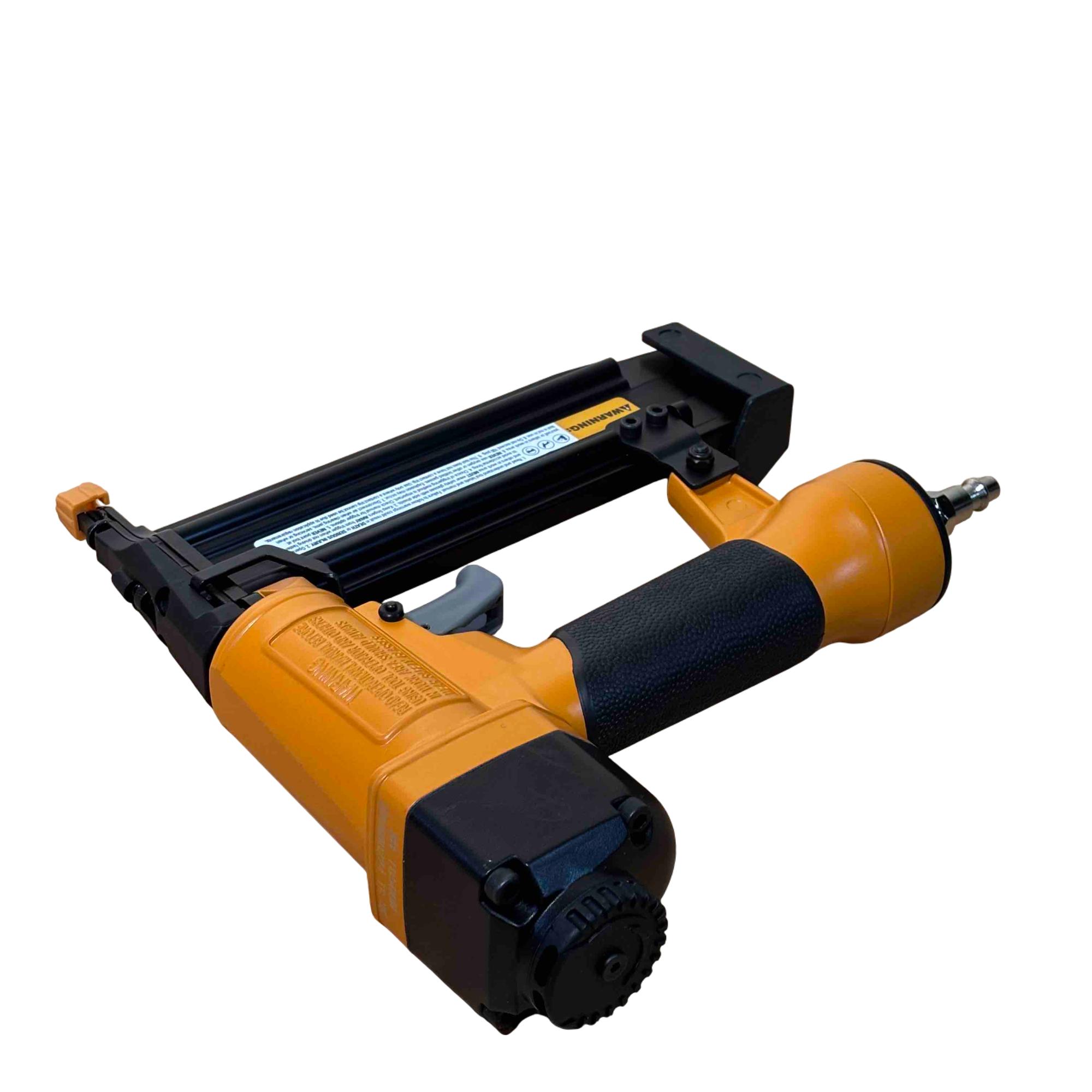 Upgrade your toolbox with the BOSTITCH SB-1850BN, a durable and reliable 18-gauge pneumatic brad nailer perfect for detailed finishing work. Its yellow and black design stands out, and with adjustable depth control and compatibility with BT Series brads (5/8 in - 2 in), its ideal for carpentry, cabinetry, and DIY projects. Enjoy effortless performance and precision nailing with this light-use, professional-grade tool.