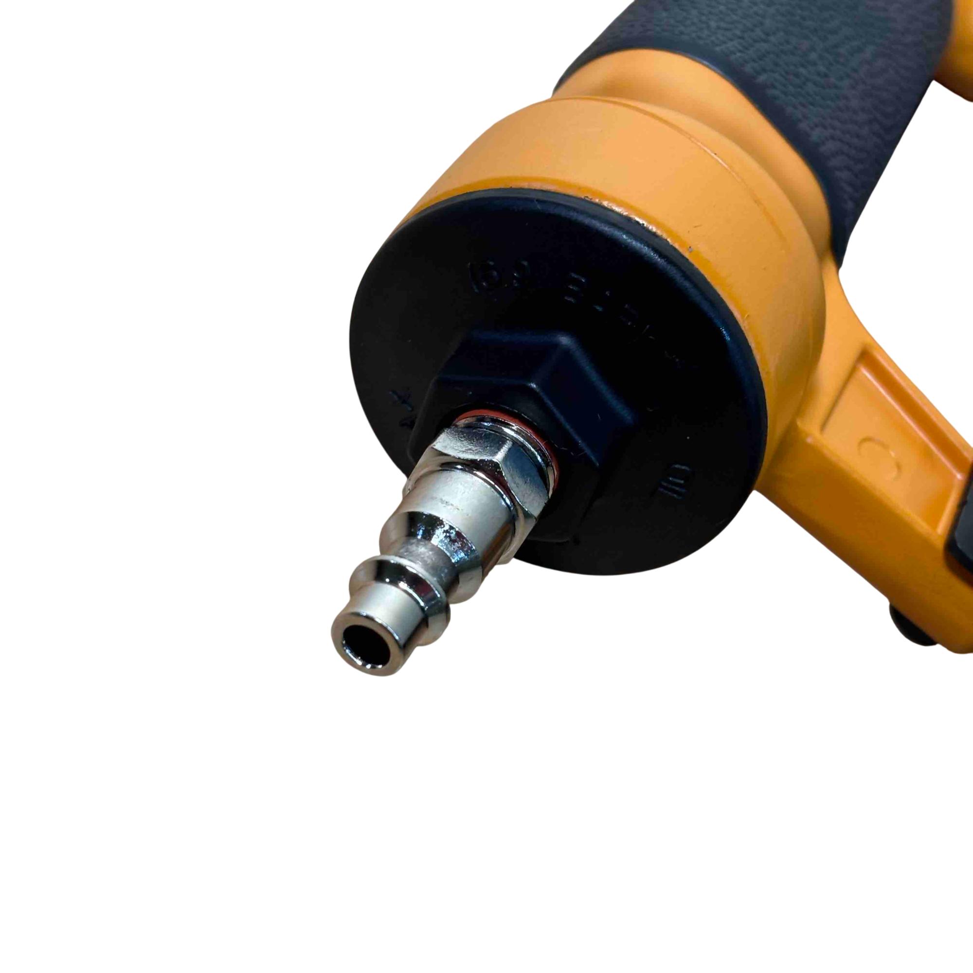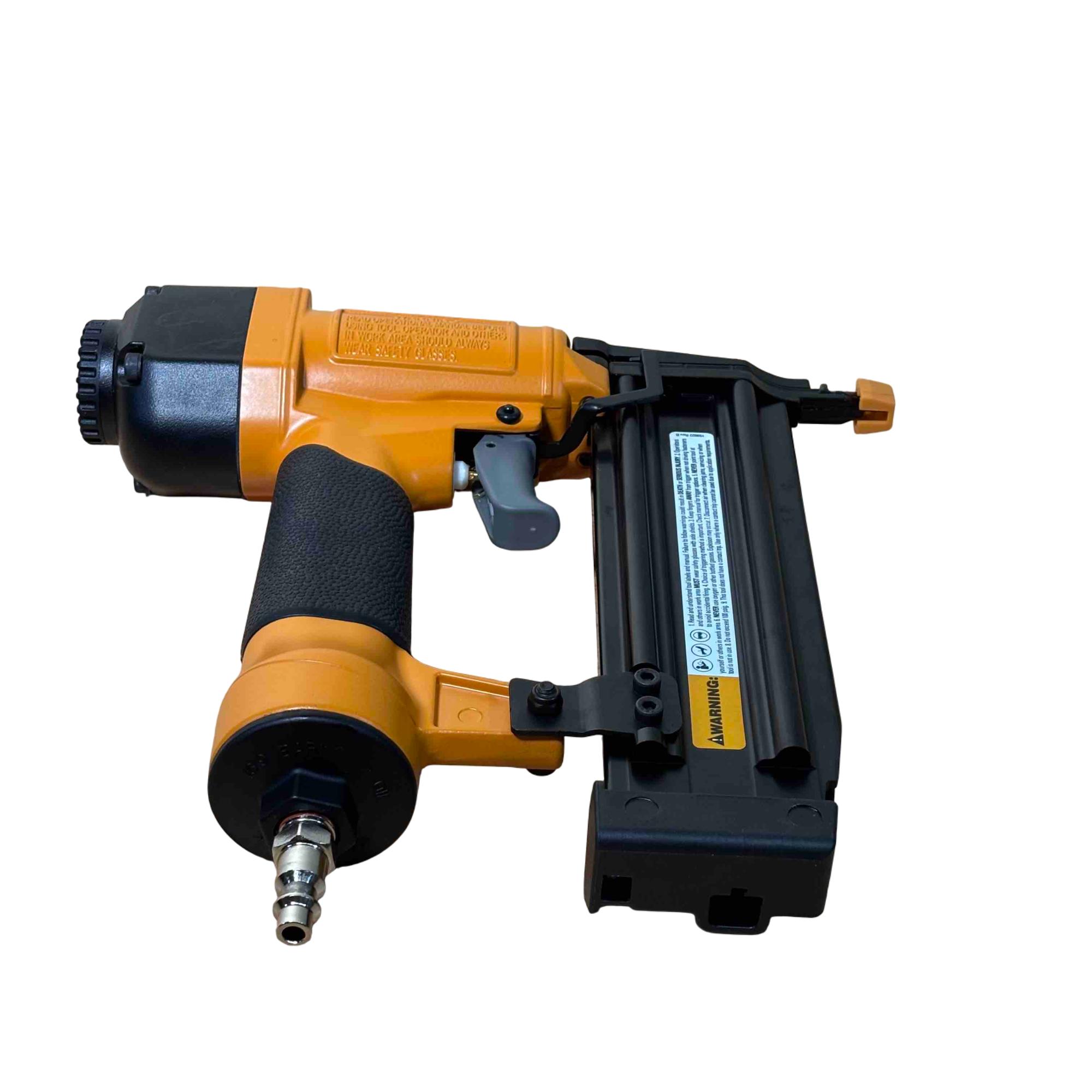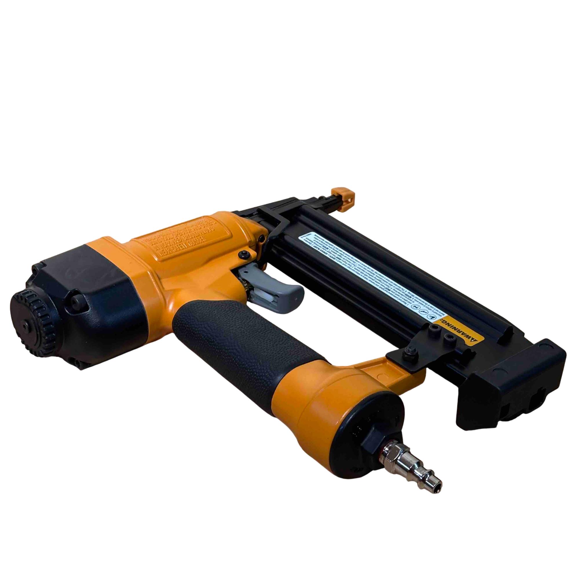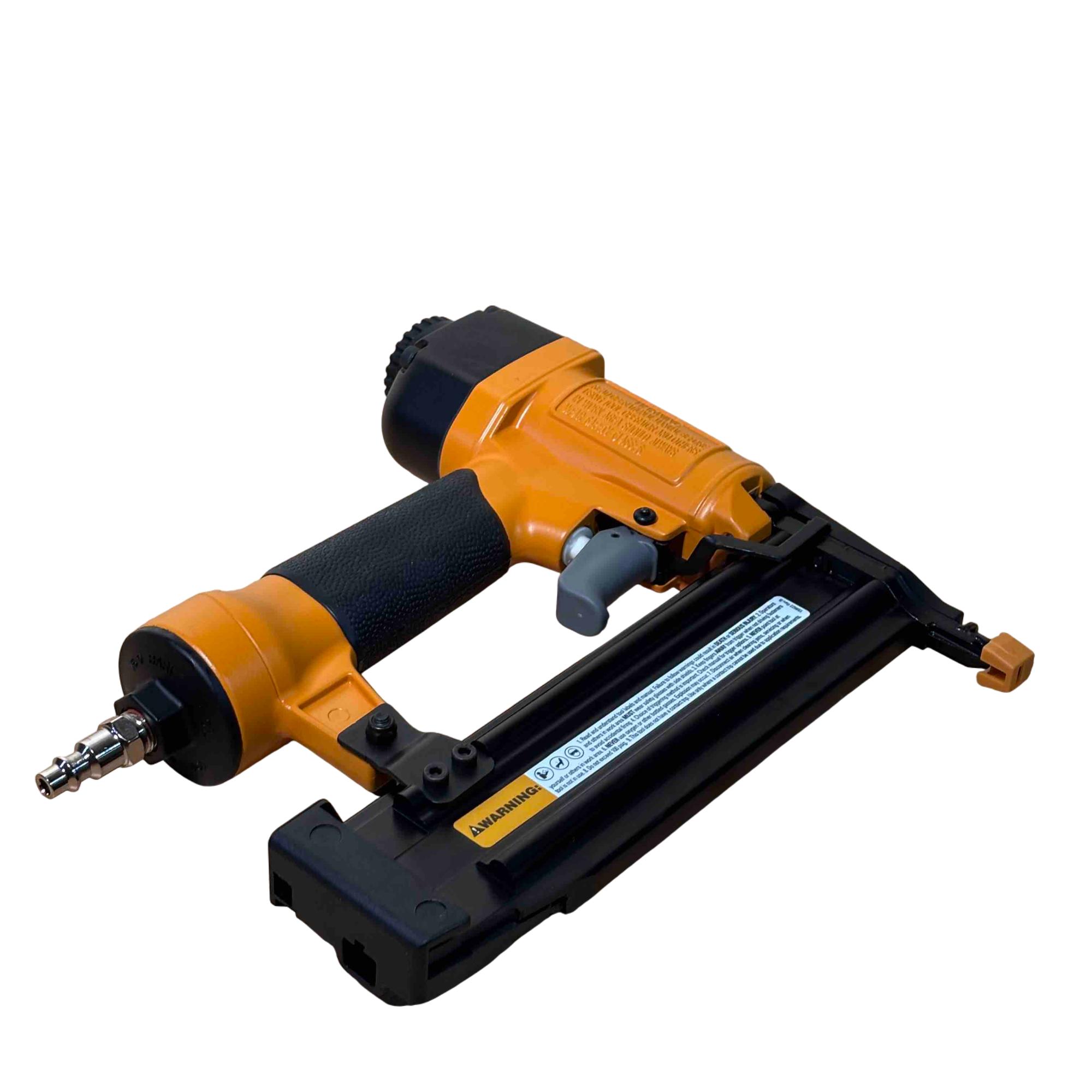 Upgrade your toolbox with the BOSTITCH SB-1850BN, a durable and reliable 18-gauge pneumatic brad nailer perfect for detailed finishing work. Its yellow and black design stands out, and with adjustable depth control and compatibility with BT Series brads (5/8 in - 2 in), its ideal for carpentry, cabinetry, and DIY projects. Enjoy effortless performance and precision nailing with this light-use, professional-grade tool.