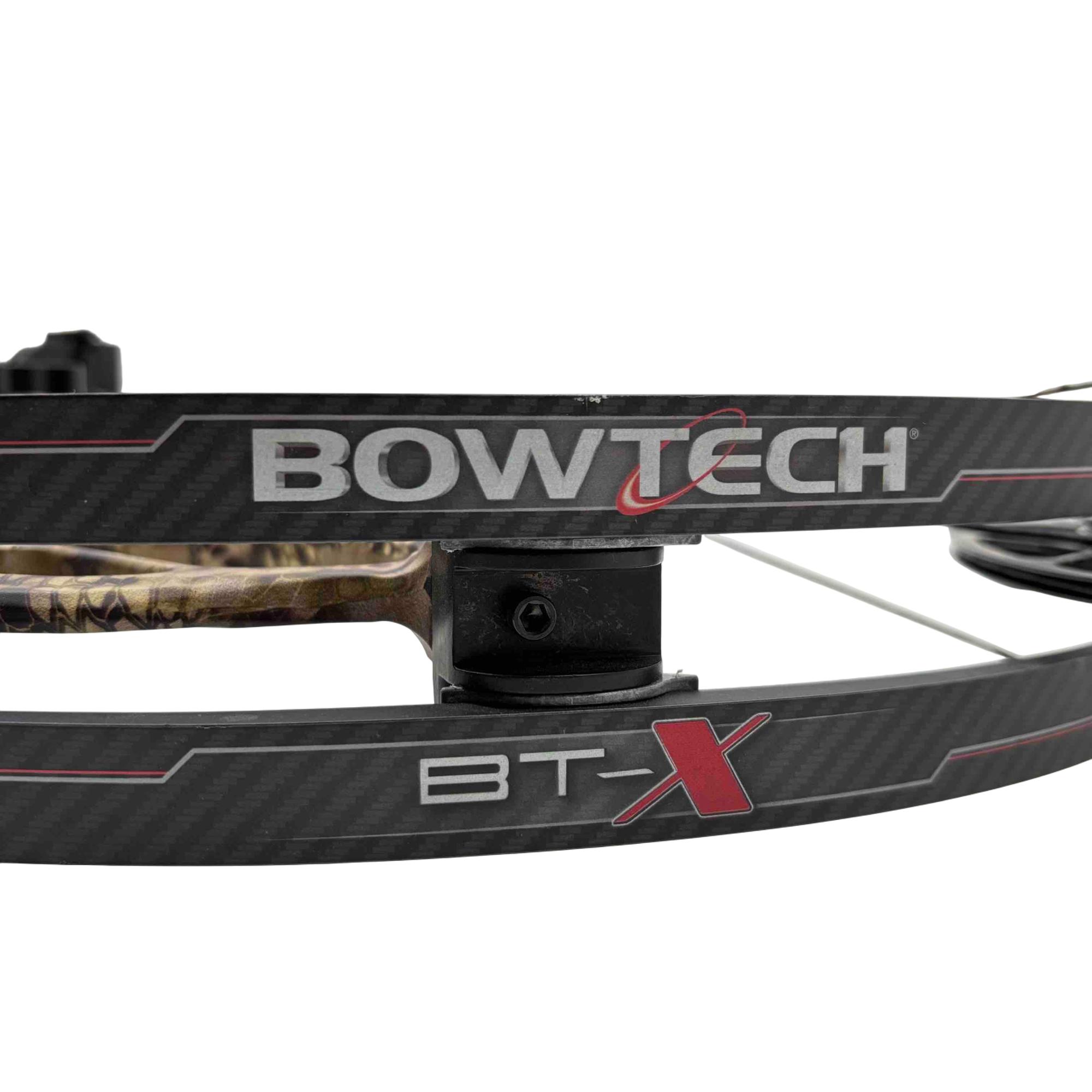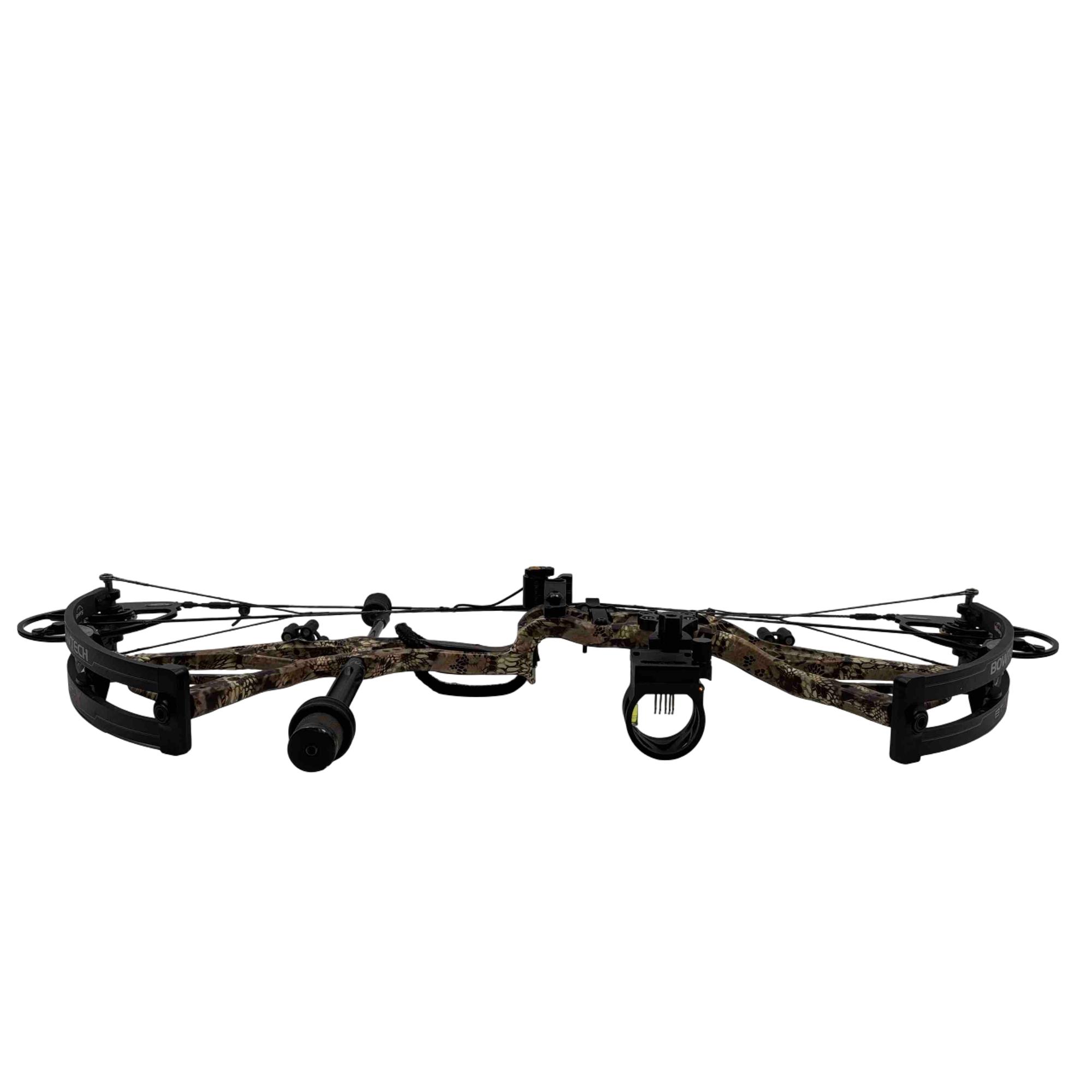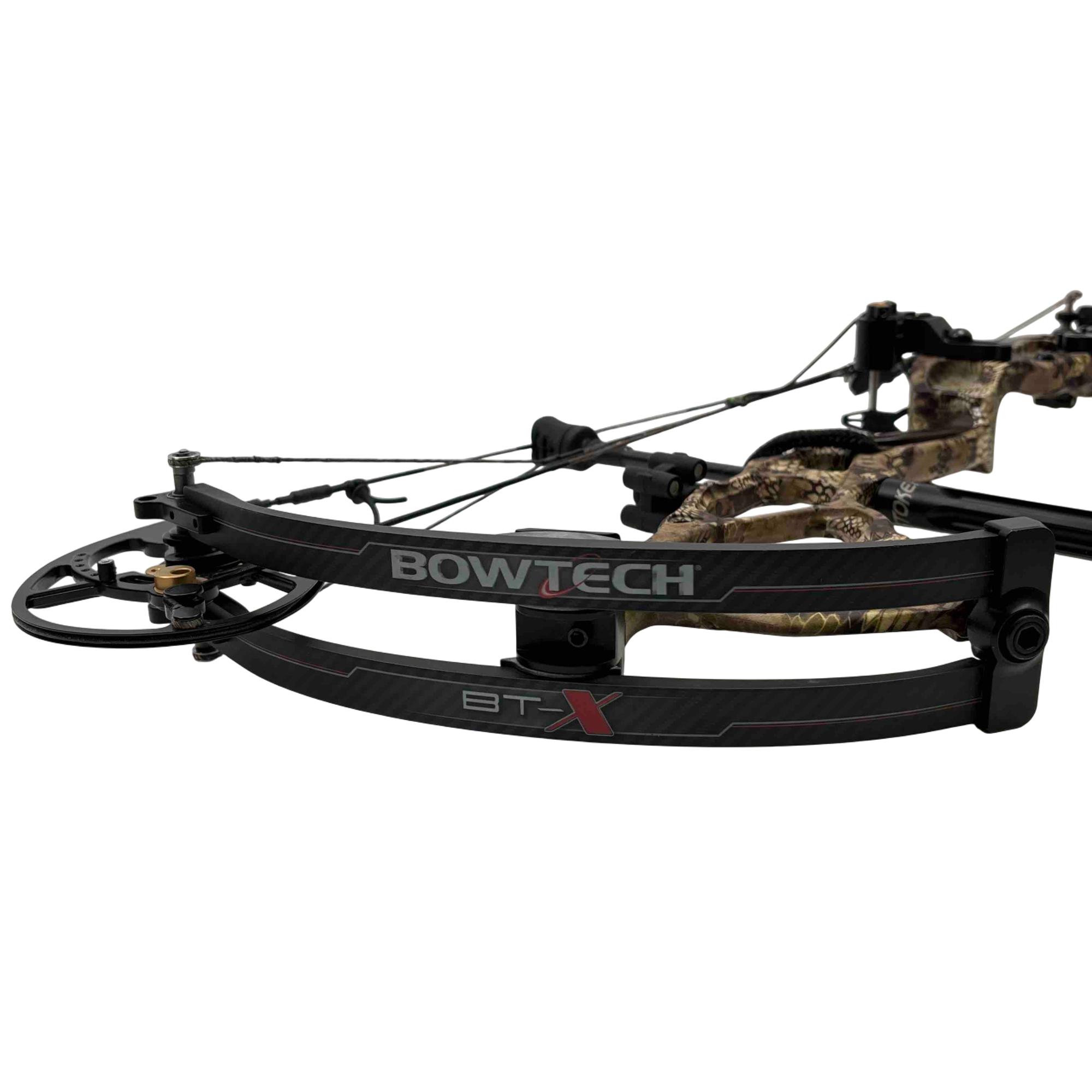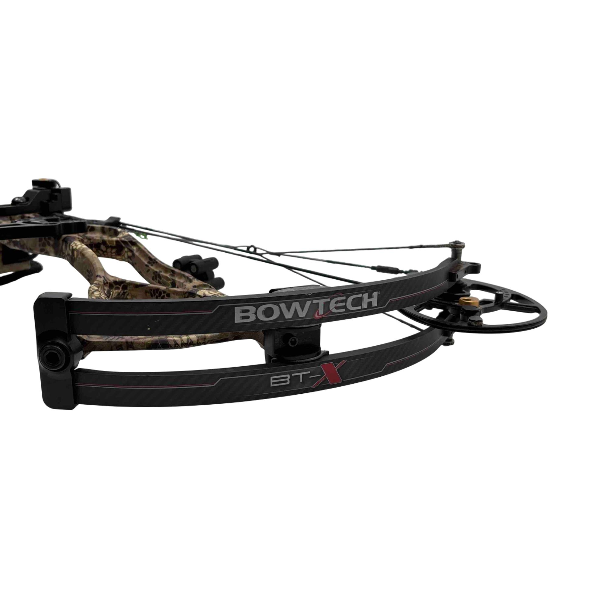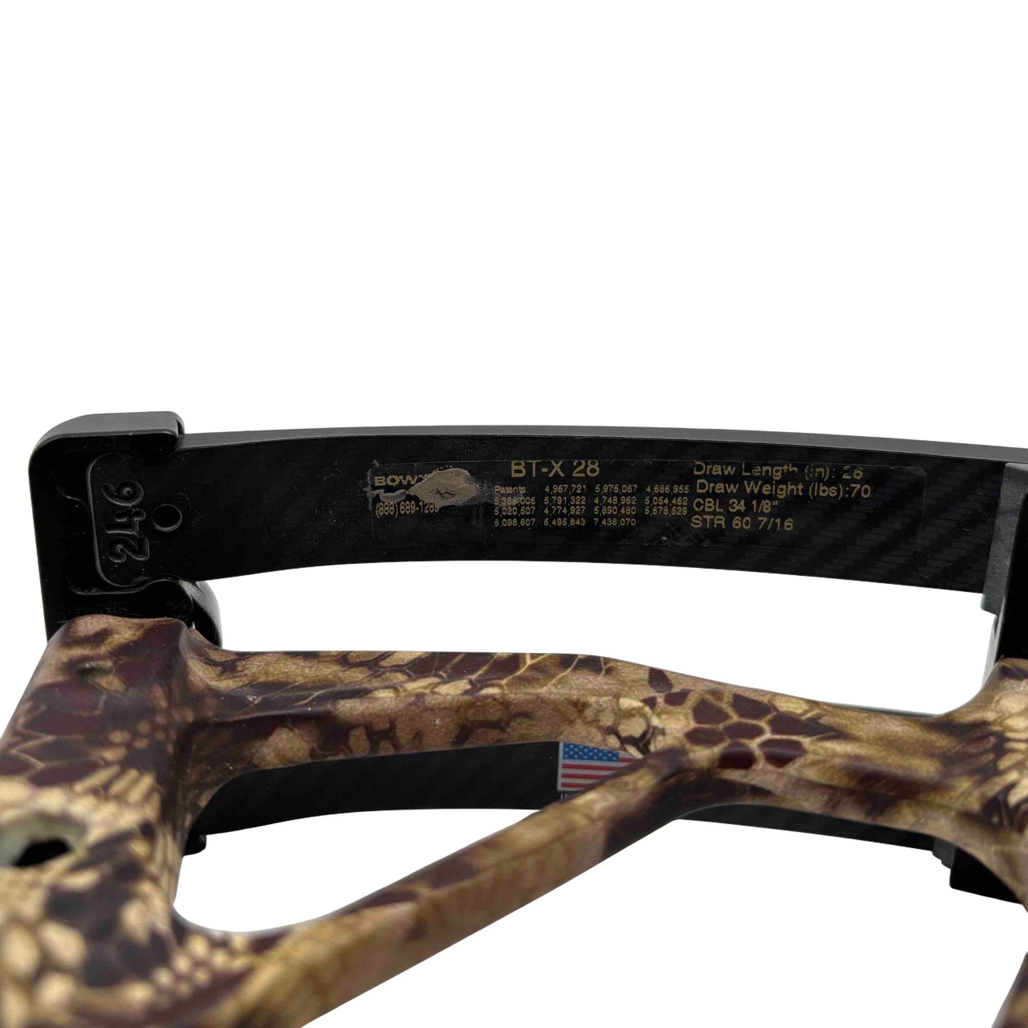 A compact, high-performance right-handed compound bow designed for hunting. It features a 26" draw length, 70-pound draw weight, and a 28" cam system capable of achieving an IBO speed of 333 FPS. The bow measures 31" axle-to-axle, has a 6" brace height, and weighs 4.1 pounds. It offers a draw length range of 25.5" to 28" and an adjustable draw weight of 50, 60, 70, or 80 pounds, with an 80% let-off for added comfort. Engineered with a skeletal riser for improved balance and stability, the BT-X delivers 86.2 foot-pounds of kinetic energy, making it a reliable and powerful option for hunters.
