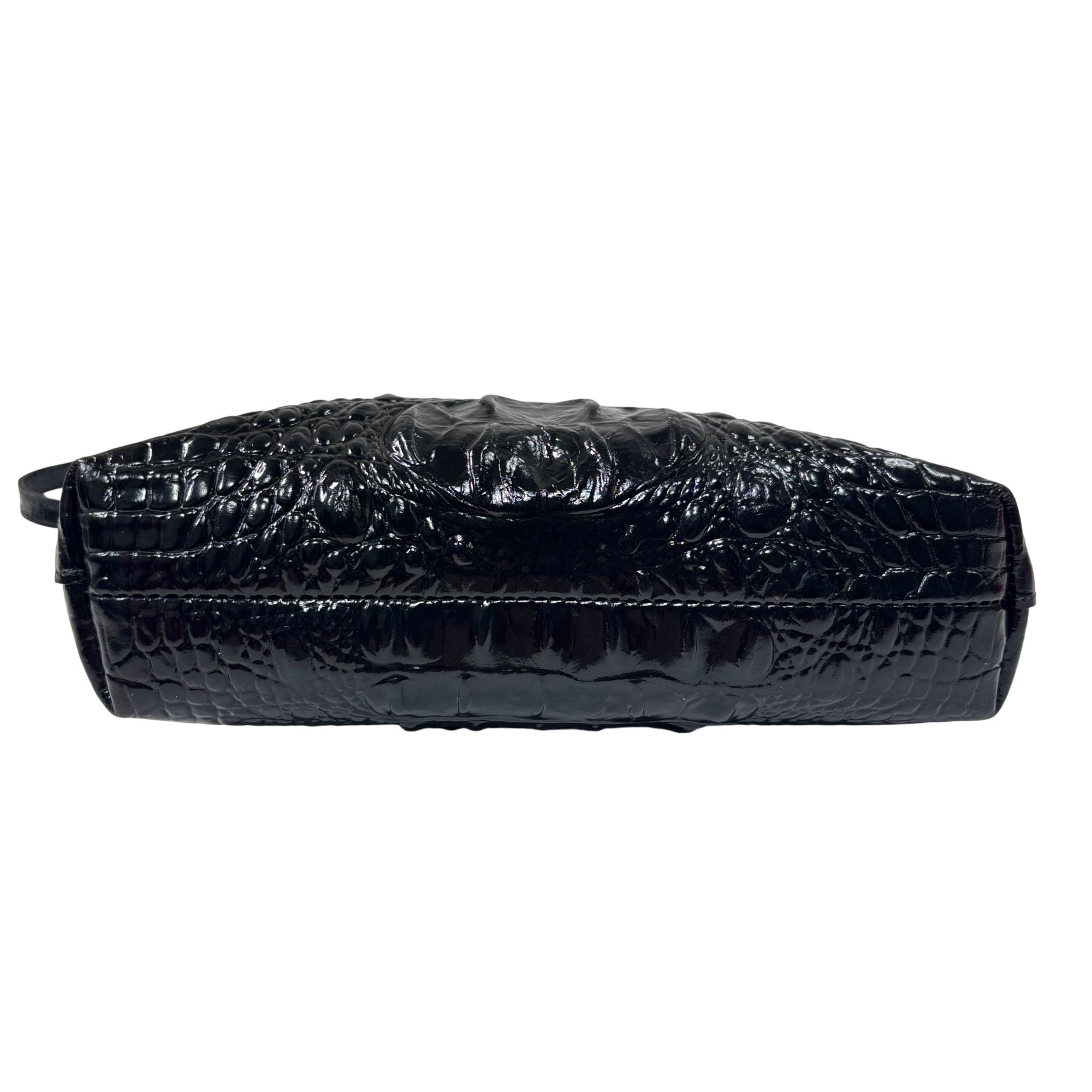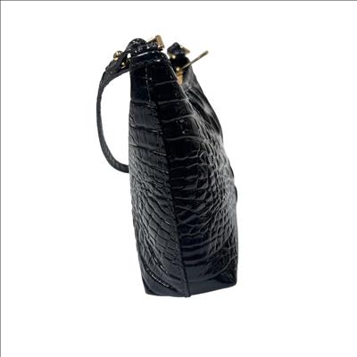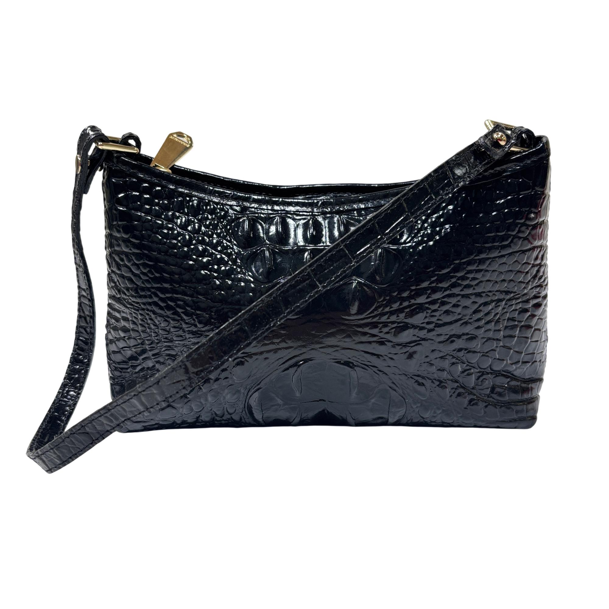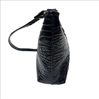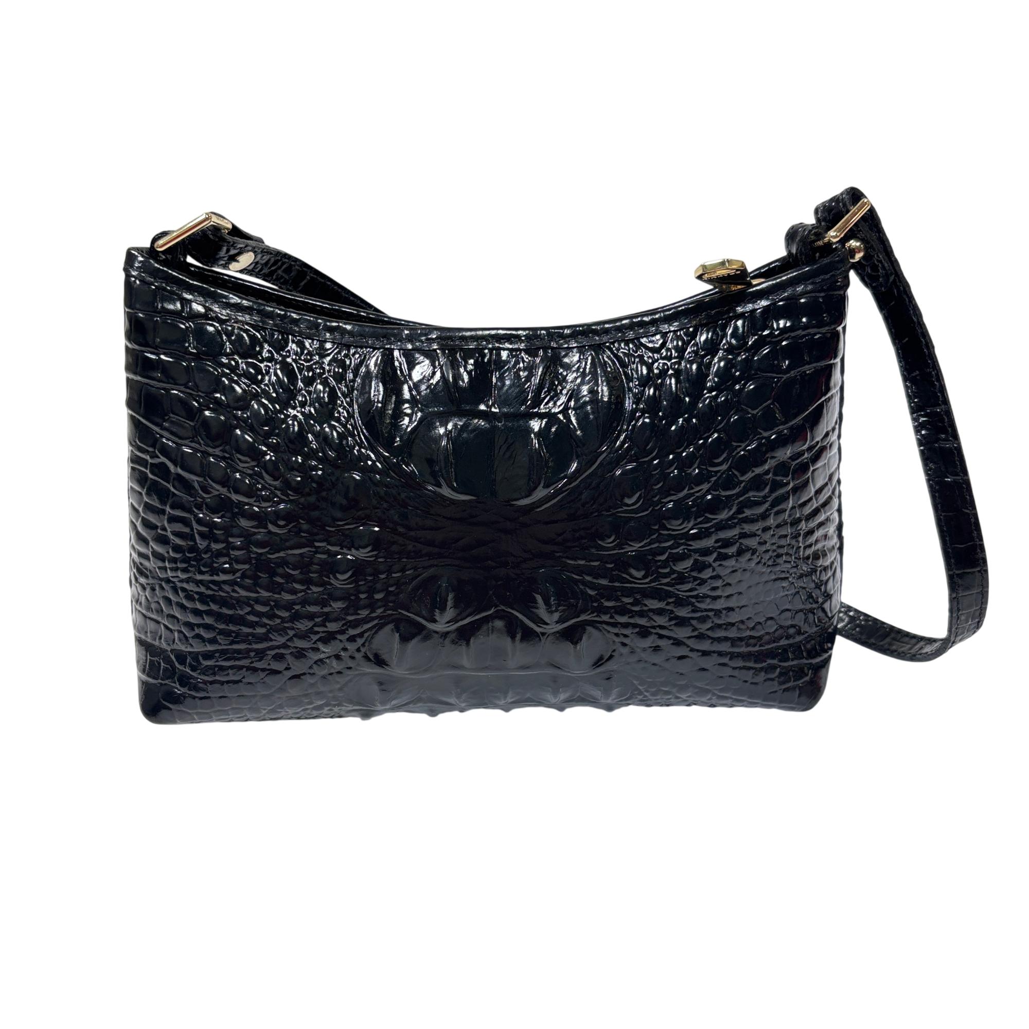Brahmin Lorelei Black Melbourne Crocodile-Embossed Leather Crossbody Purse is crafted from premium black leather featuring a distinctive crocodile texture that enhances its sophisticated appeal. This elegant purse includes a gold zipper and a comfortable strap, making it a versatile accessory for everyday wear or special occasions. Designed with attention to detail and quality, it combines fashion and function for the modern user.