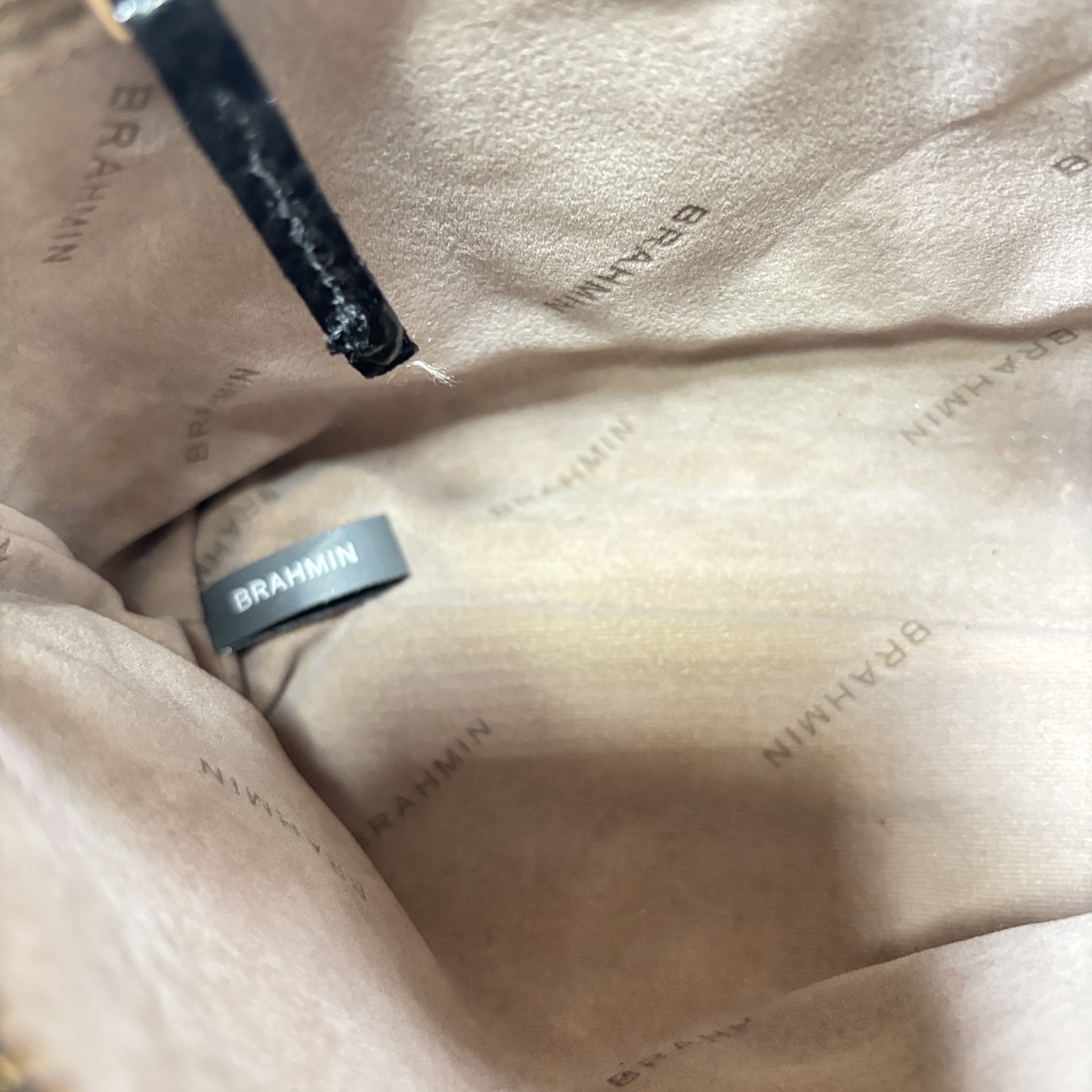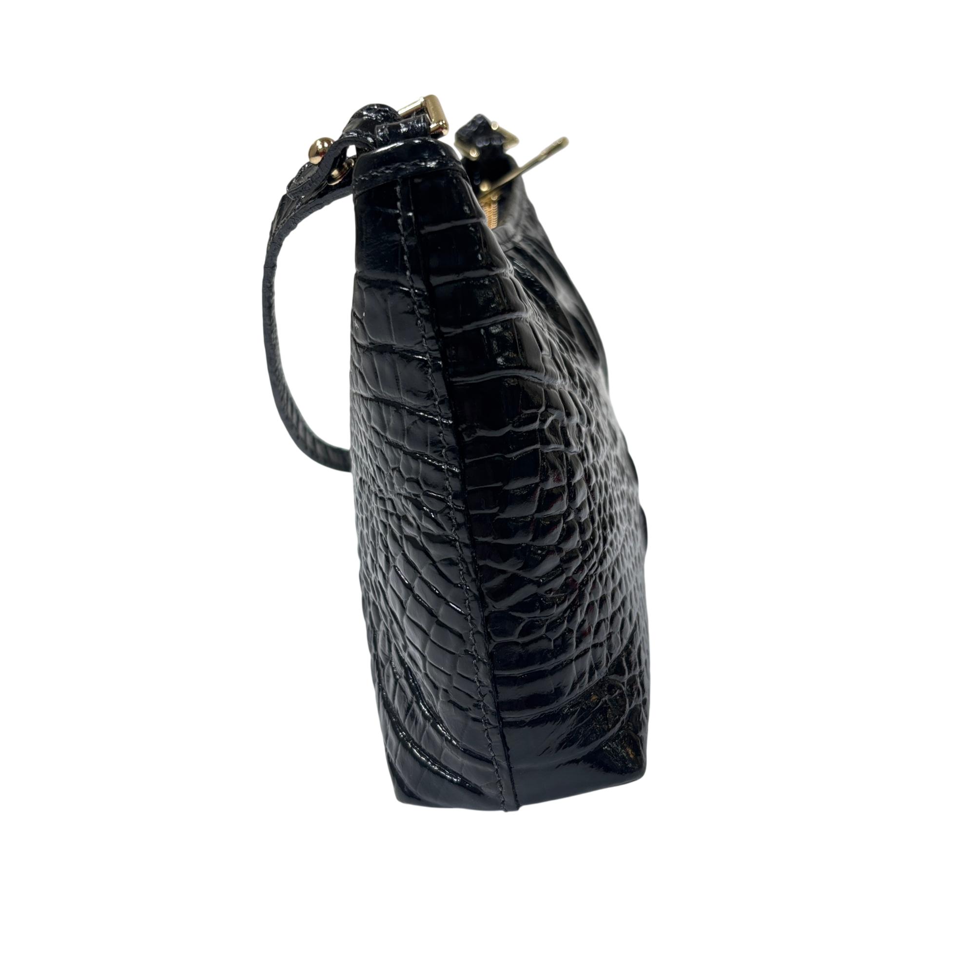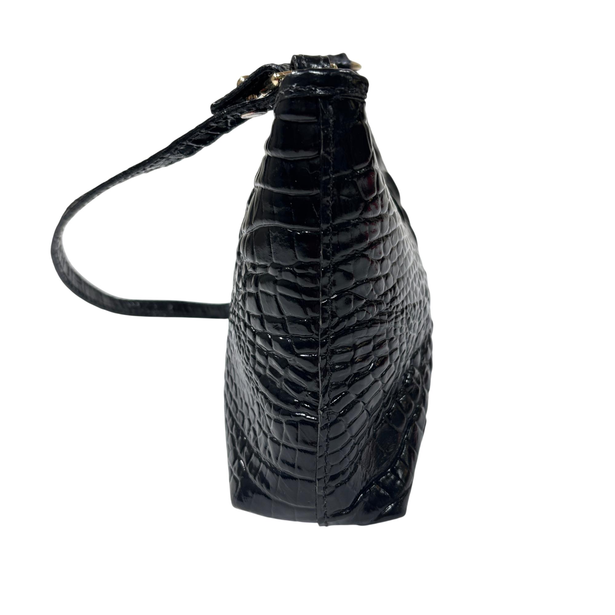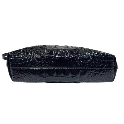 Brahmin Lorelei Black Melbourne Crocodile-Embossed Leather Crossbody Purse is crafted from premium black leather featuring a distinctive crocodile texture that enhances its sophisticated appeal. This elegant purse includes a gold zipper and a comfortable strap, making it a versatile accessory for everyday wear or special occasions. Designed with attention to detail and quality, it combines fashion and function for the modern user.
