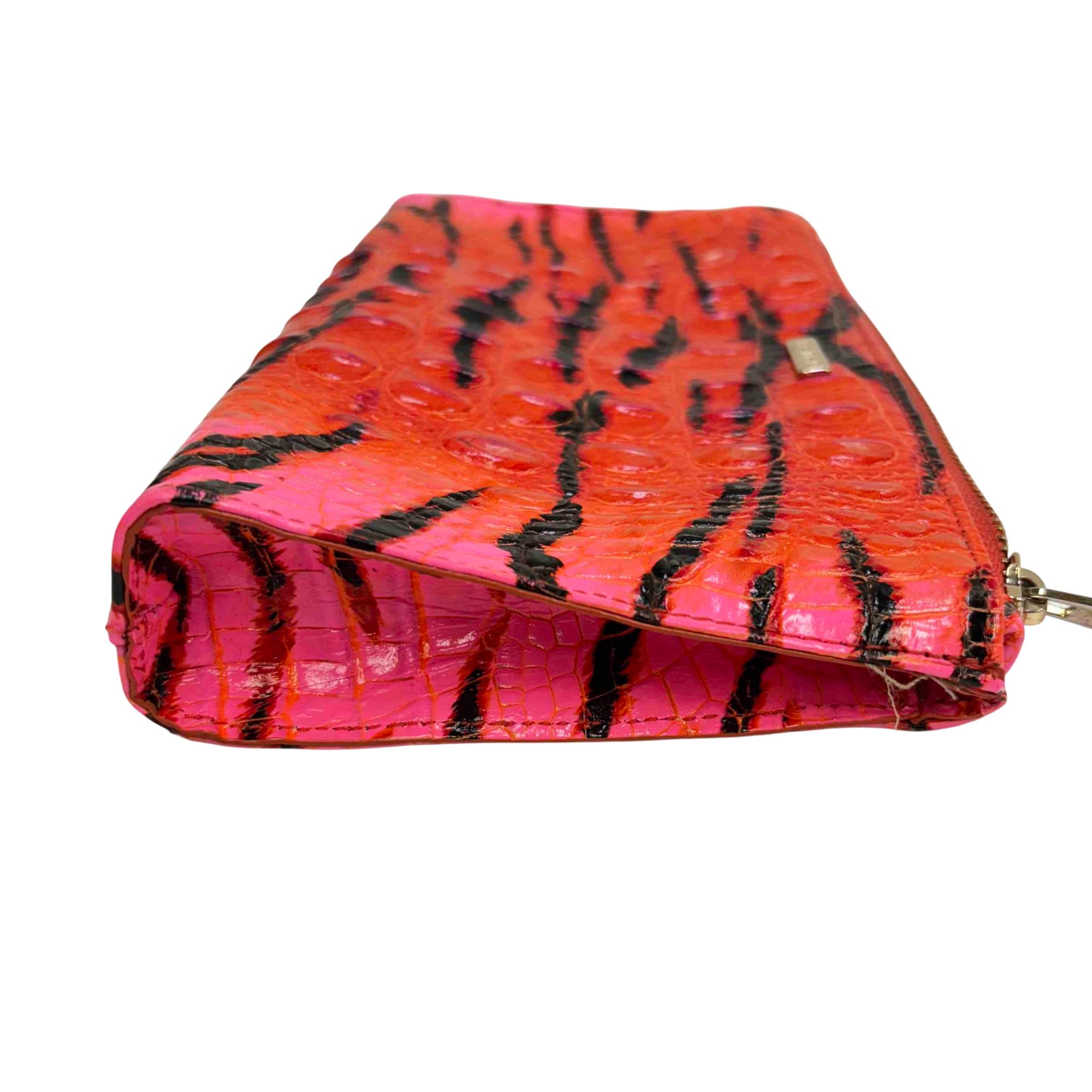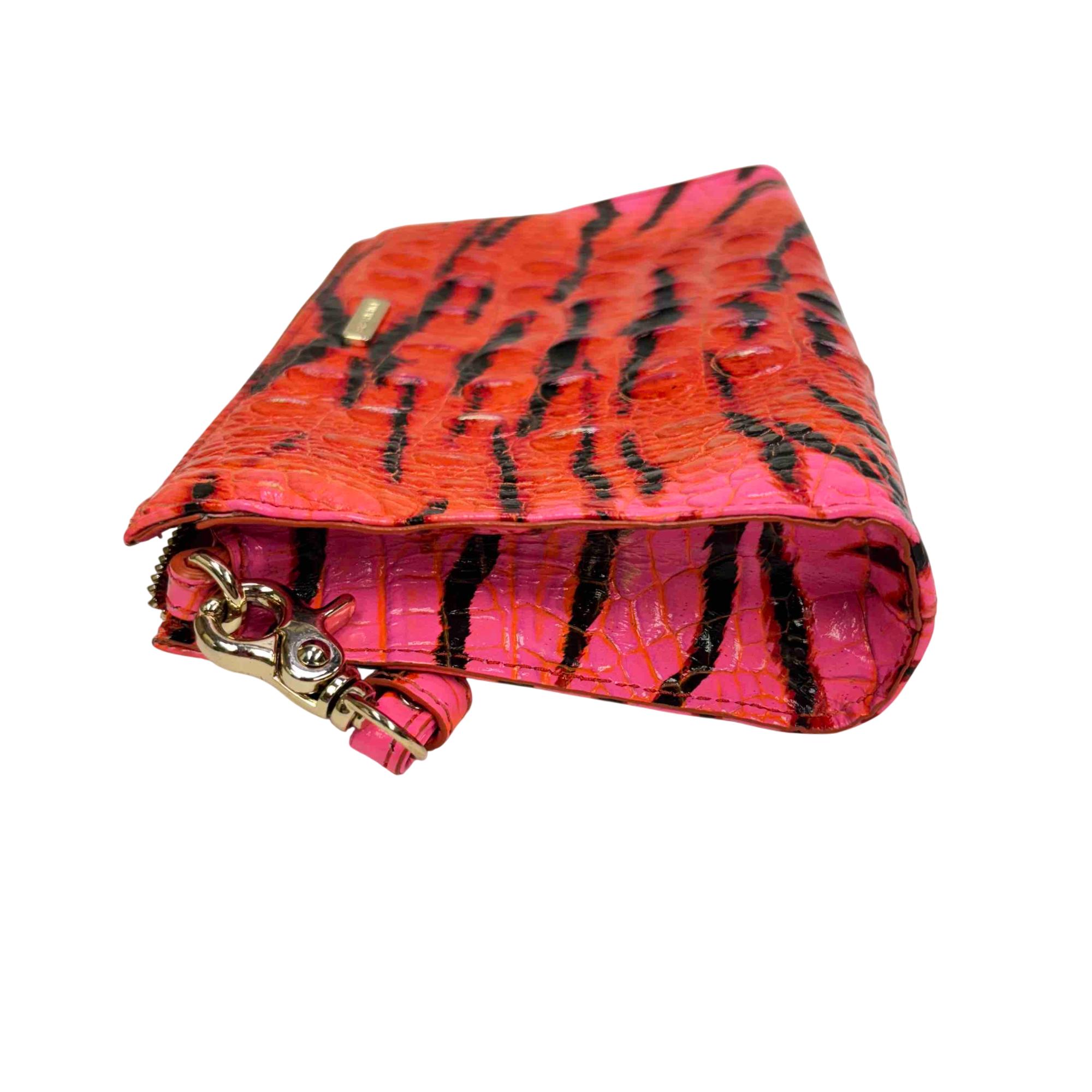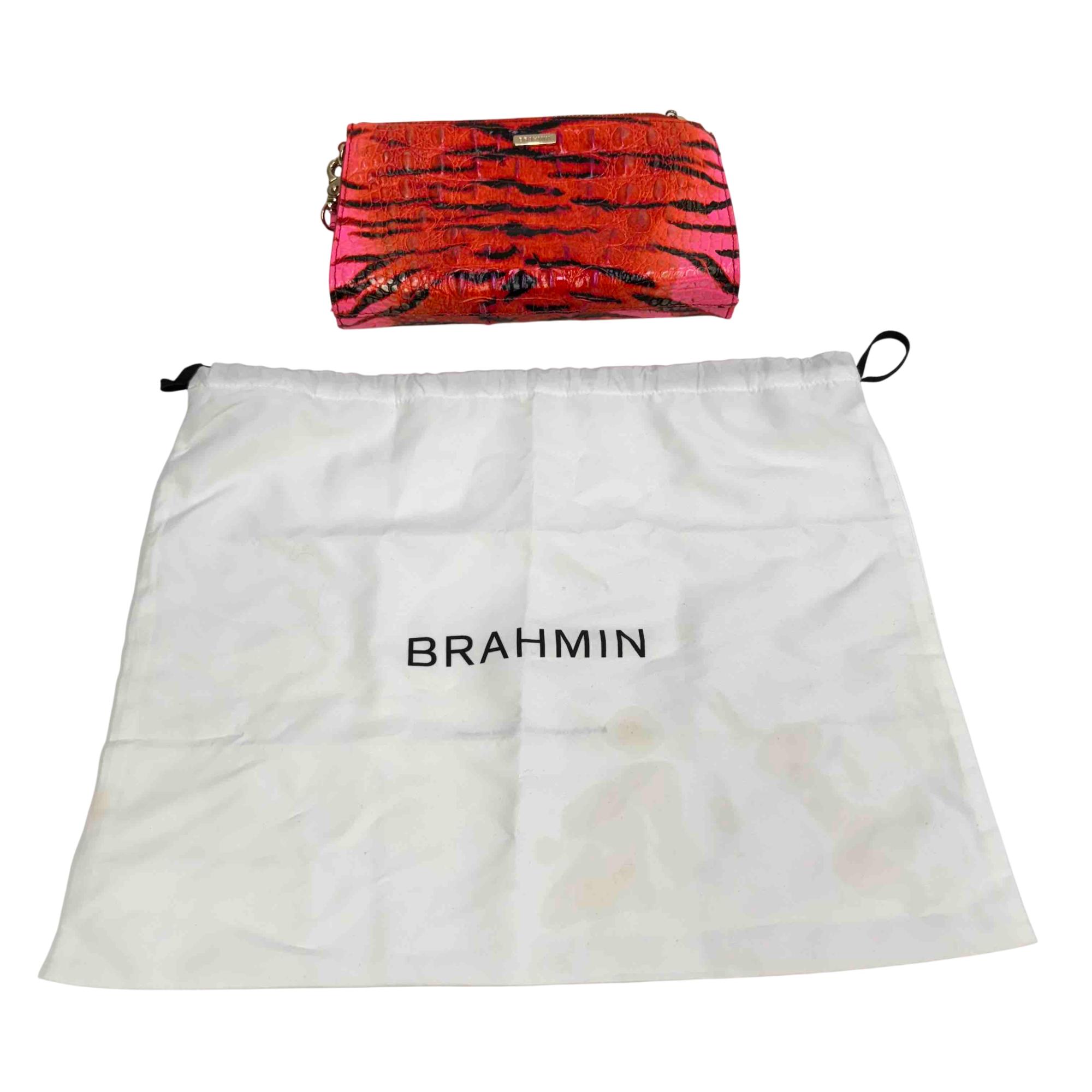 Elevate your fashion game with this stunning Brahmin Pink and Black Croc Embossed Leather Purse. This exquisitely crafted accessory combines vibrant pink and black hues in a chic crocodile pattern, perfect for making a bold style statement. Complete with a dust bag, its an ideal choice for both daily use and special occasions.