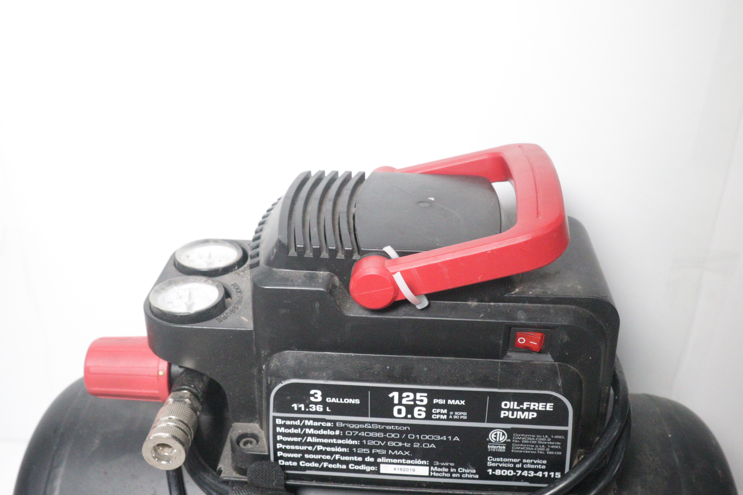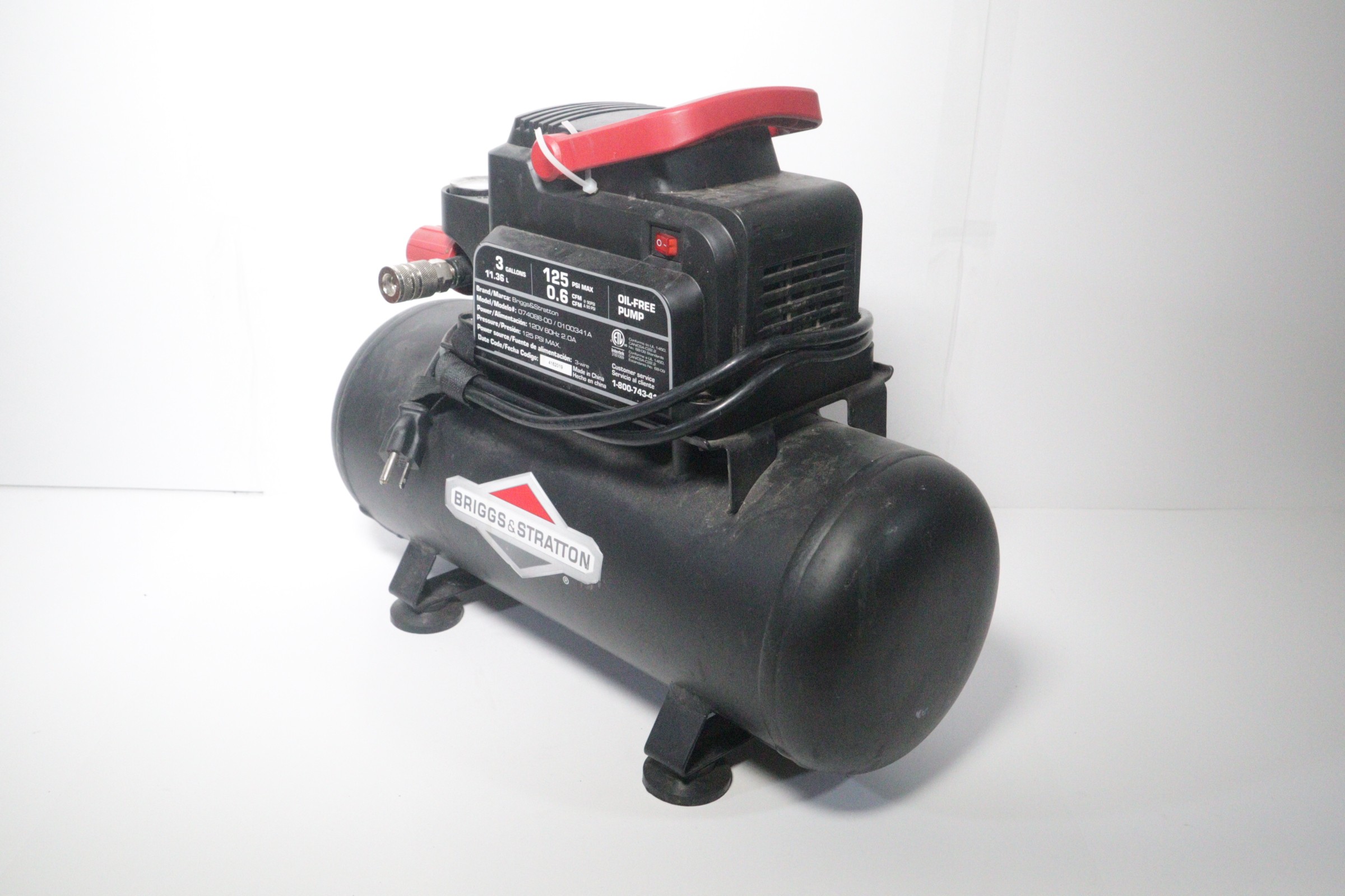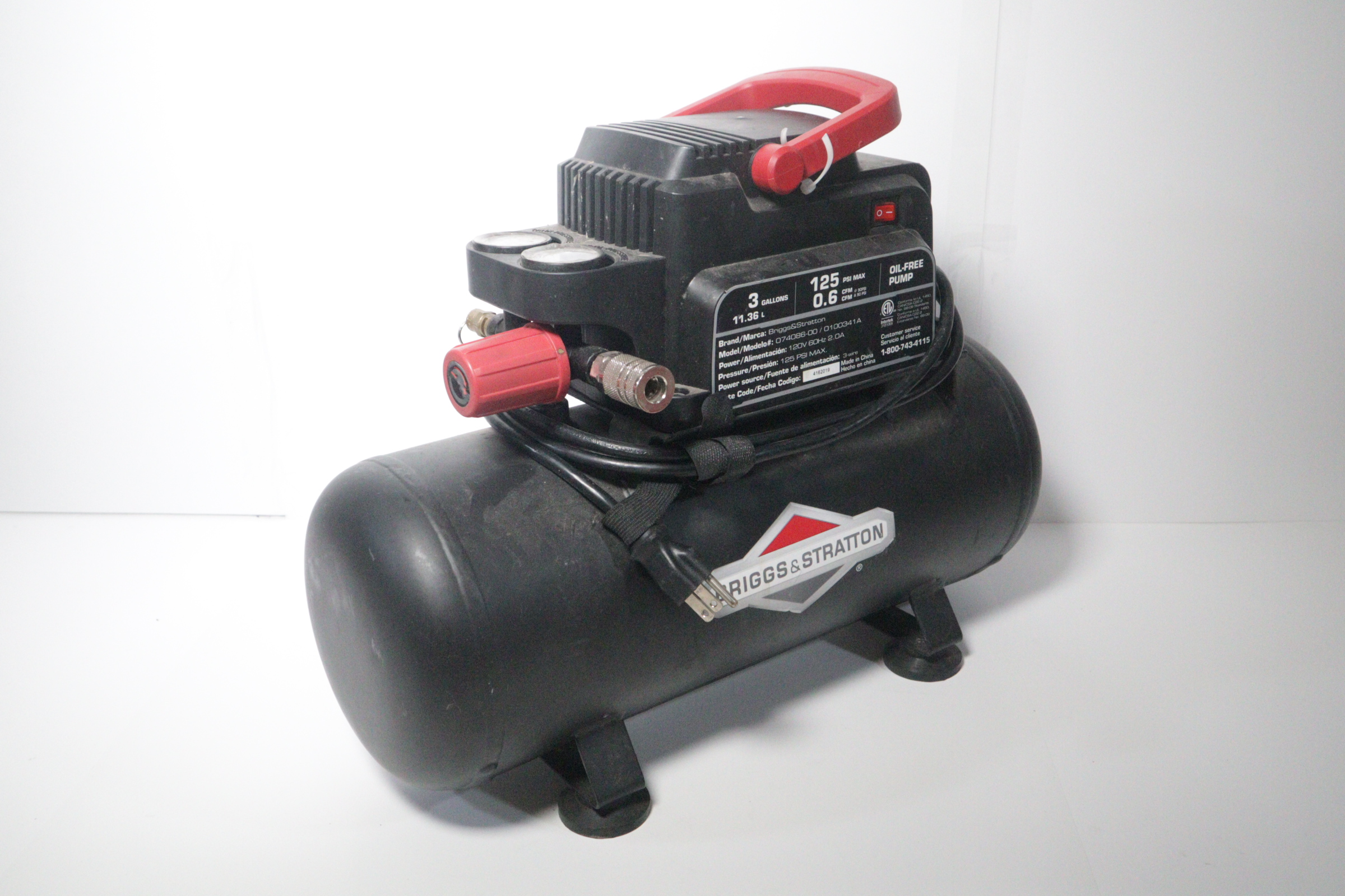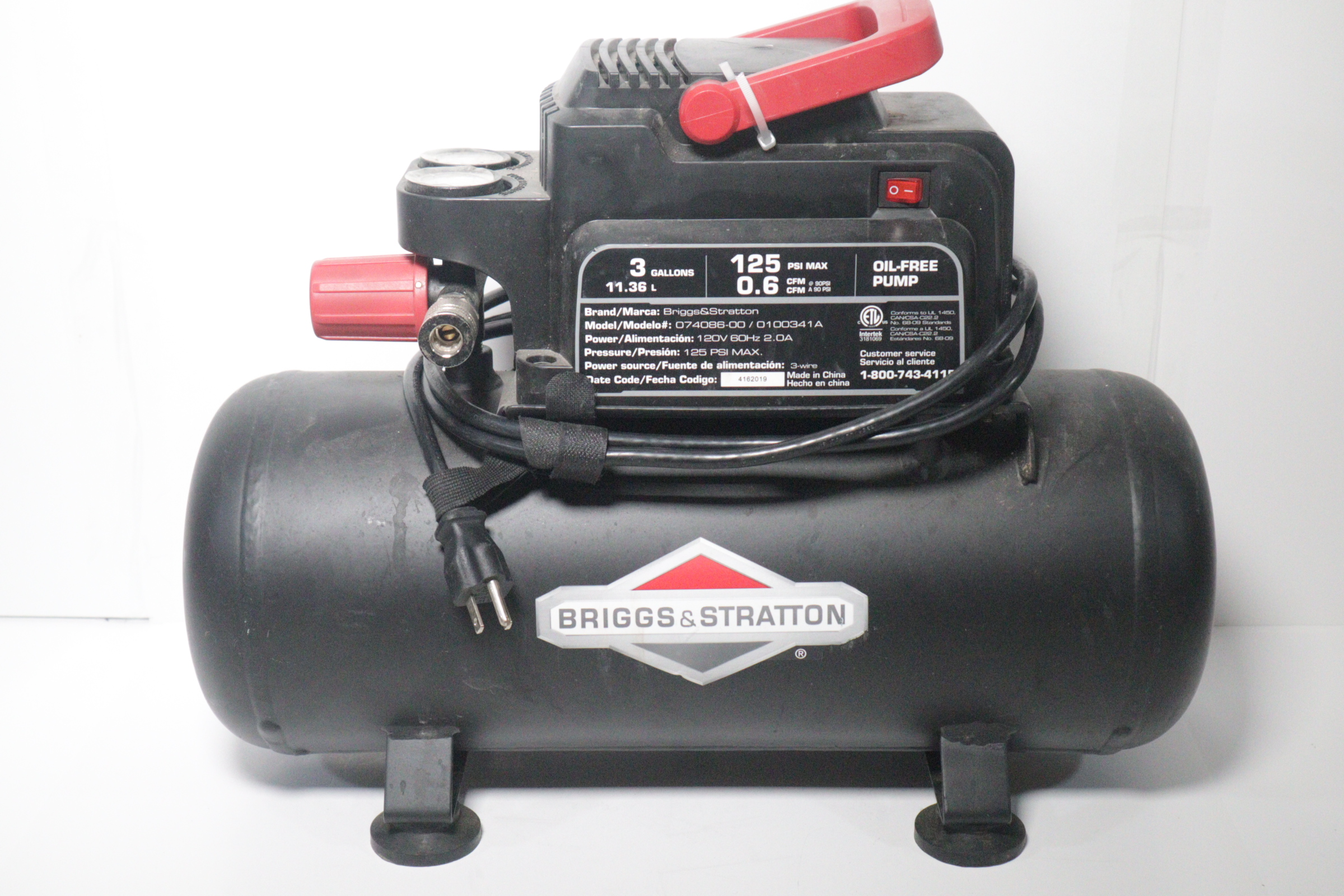 The Briggs & Stratton 3-gallon Air Compressor has 125 maximum PSI and 0.5 HP and can perform a variety of tasks and operate air tools with ease. The dual pressure gauges with a large regulator knob allow for easy operation during any task, whether at home or on the job. The Briggs & Stratton air compressor generates 0.8 CFM at 40 PSI and 0.6 CFM at 90 PSI, so it has a lot of power behind it.