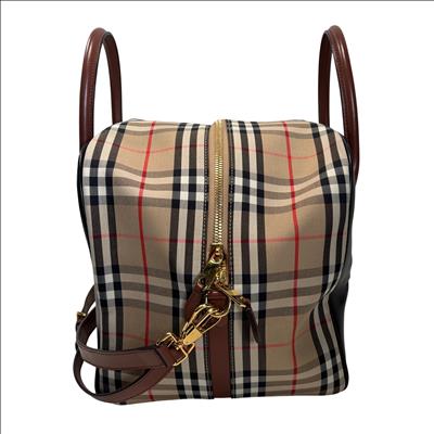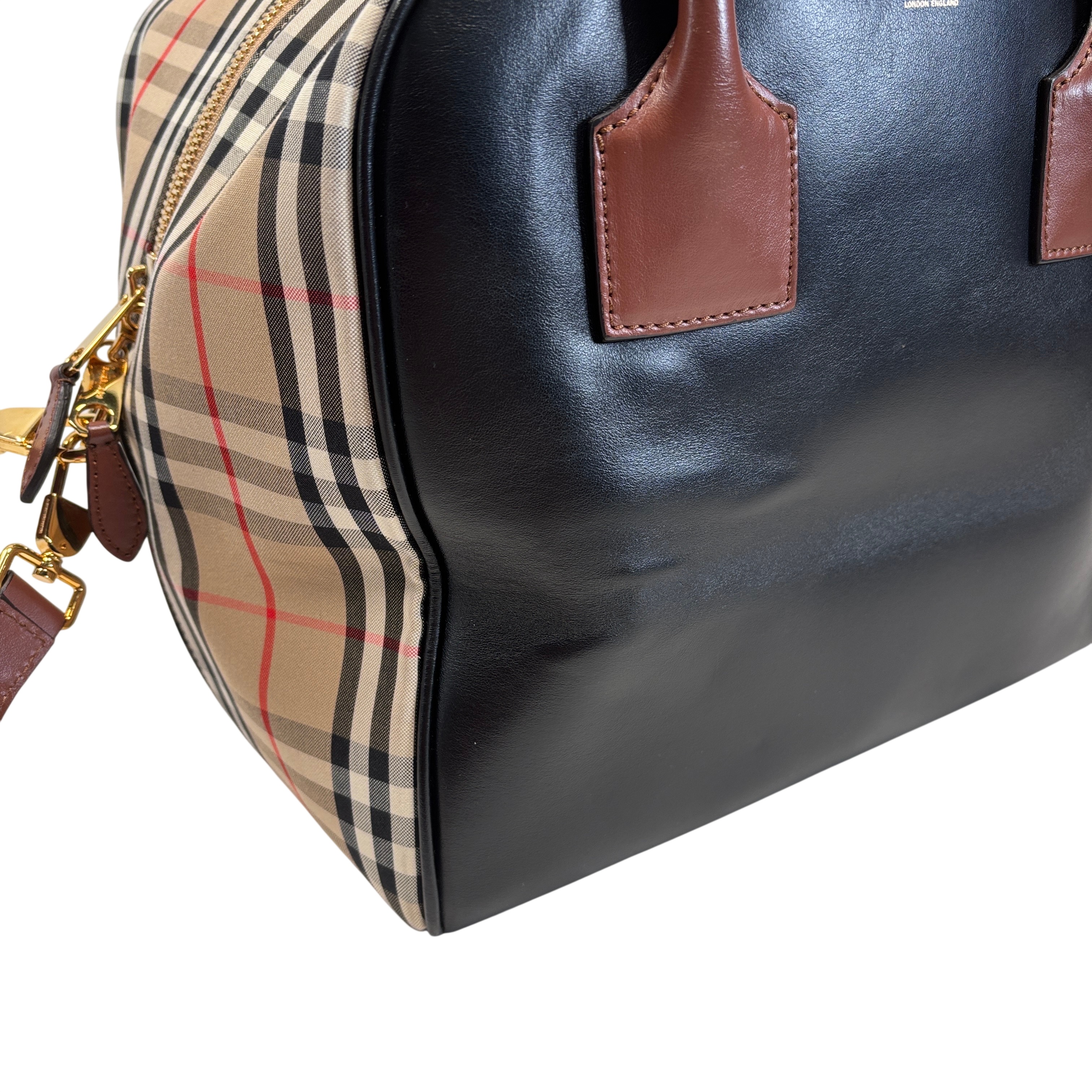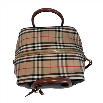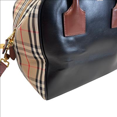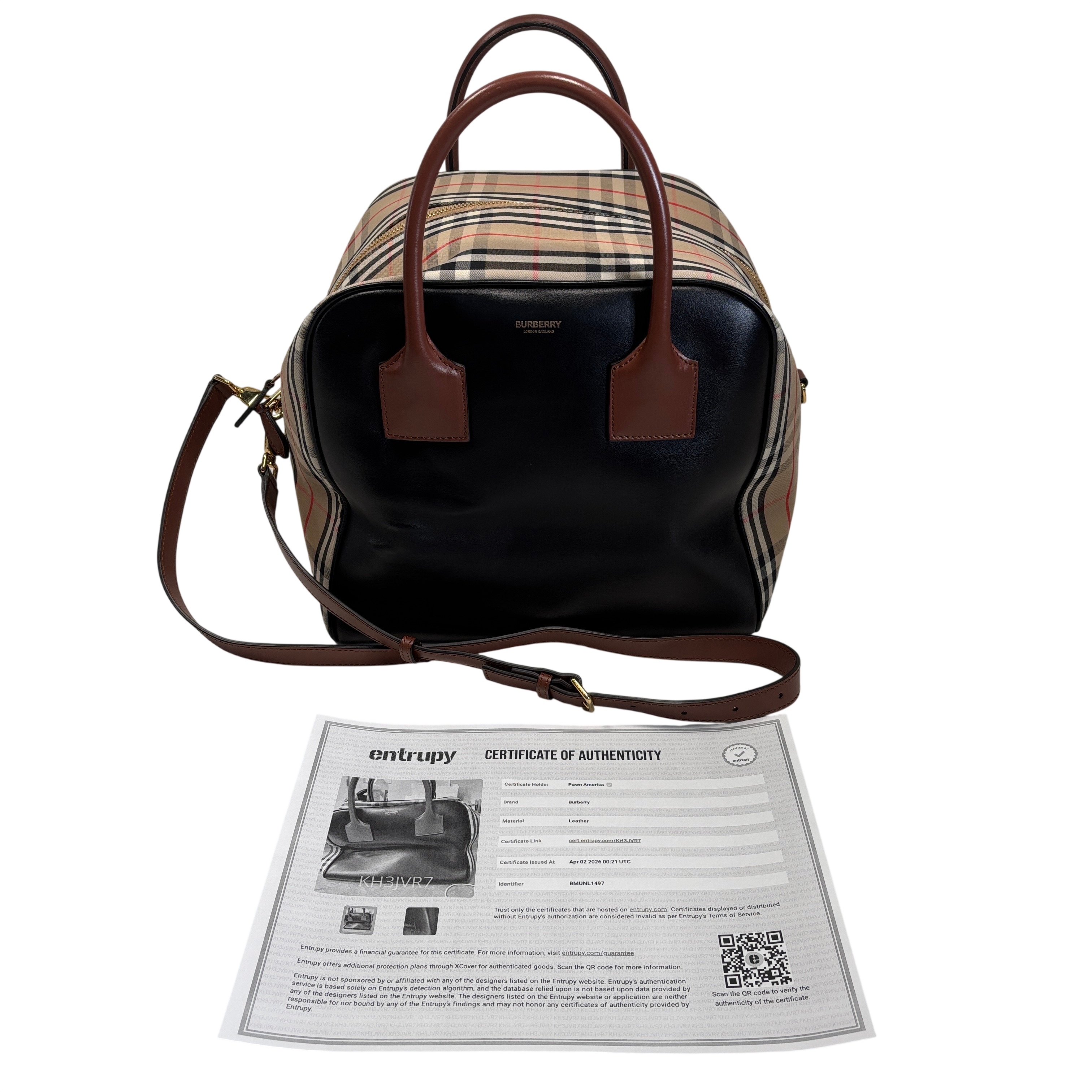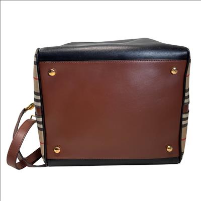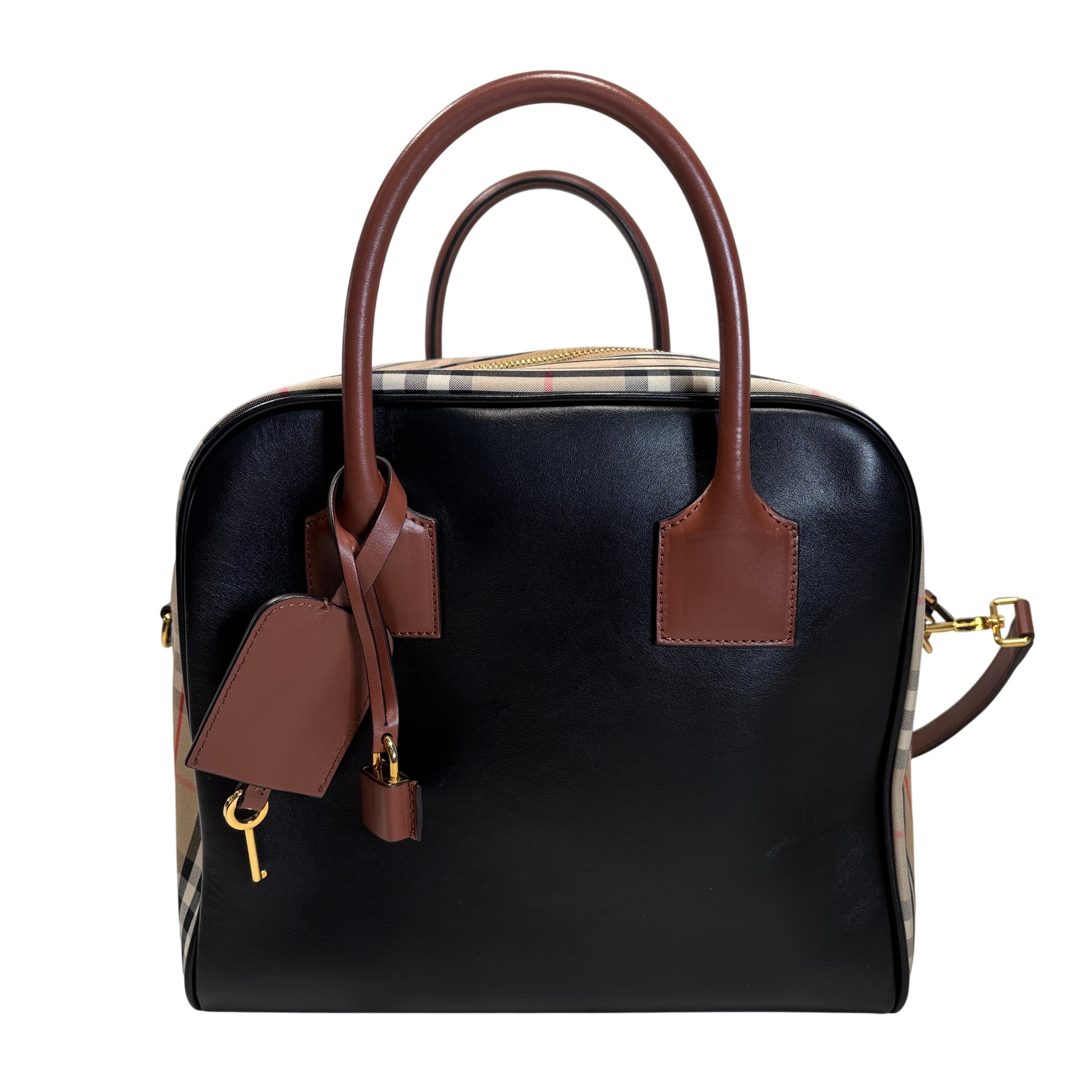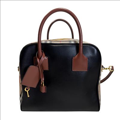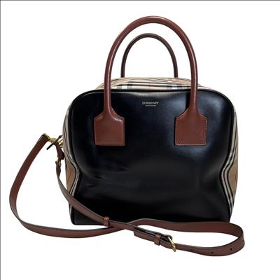 The Burberry Checkered Women's Satchel Bag BMUNL1497 features the iconic Burberry check pattern combined with smooth black leather front panel and brown leather handles. This stylish purse includes gold-tone hardware, branded zipper pulls, and an adjustable/removable shoulder strap for versatile carrying options. This authentic Burberry bag is perfect for everyday use or special occasions. The included Entrupy Certificate of Authenticity ensures the genuine quality and craftsmanship of this luxury item.