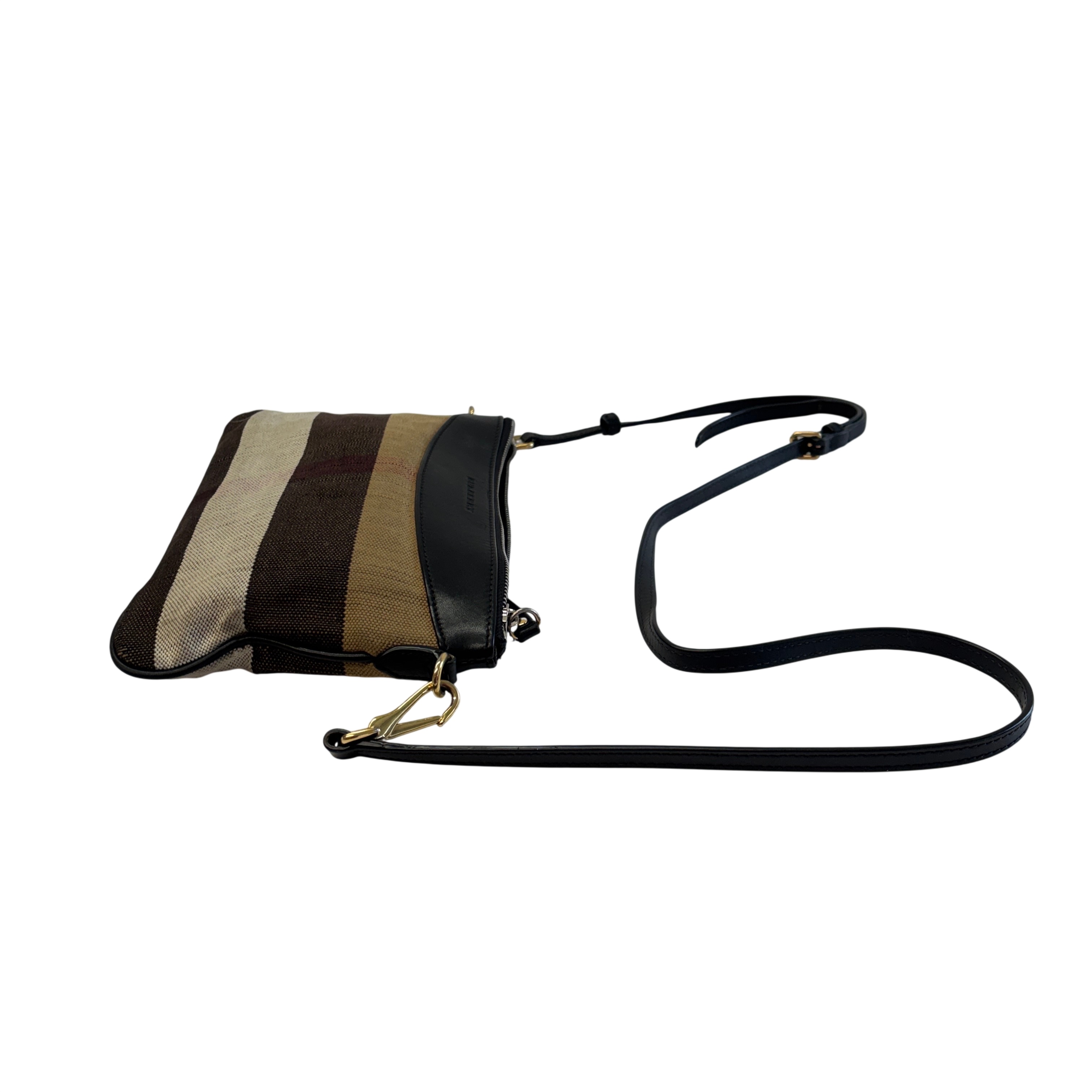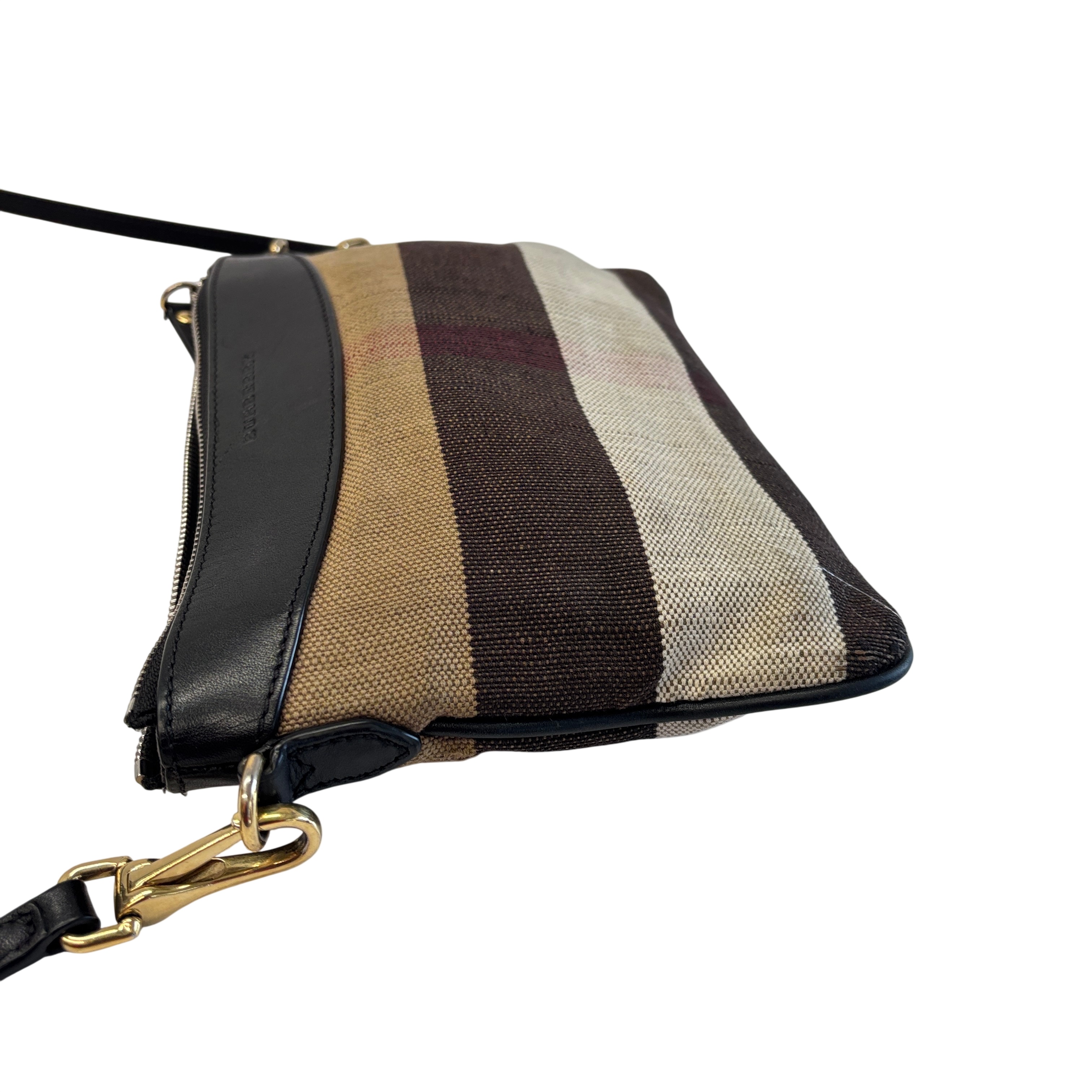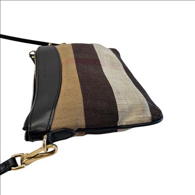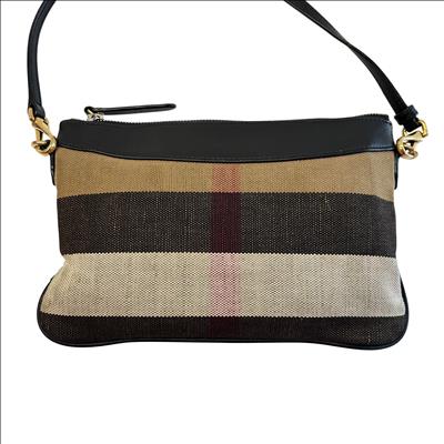 The Other Peyton Burberry Purse features a classic striped canvas design accented with black leather trim and gold-tone hardware. This compact shoulder bag includes an adjustable leather strap and secure zipper closure, making it ideal for everyday use or special occasions. Measuring approximately 9 inches in length, 5 inches in height, and 1.5 inches in width, this lightweight purse offers a stylish and practical accessory for carrying essentials with ease.