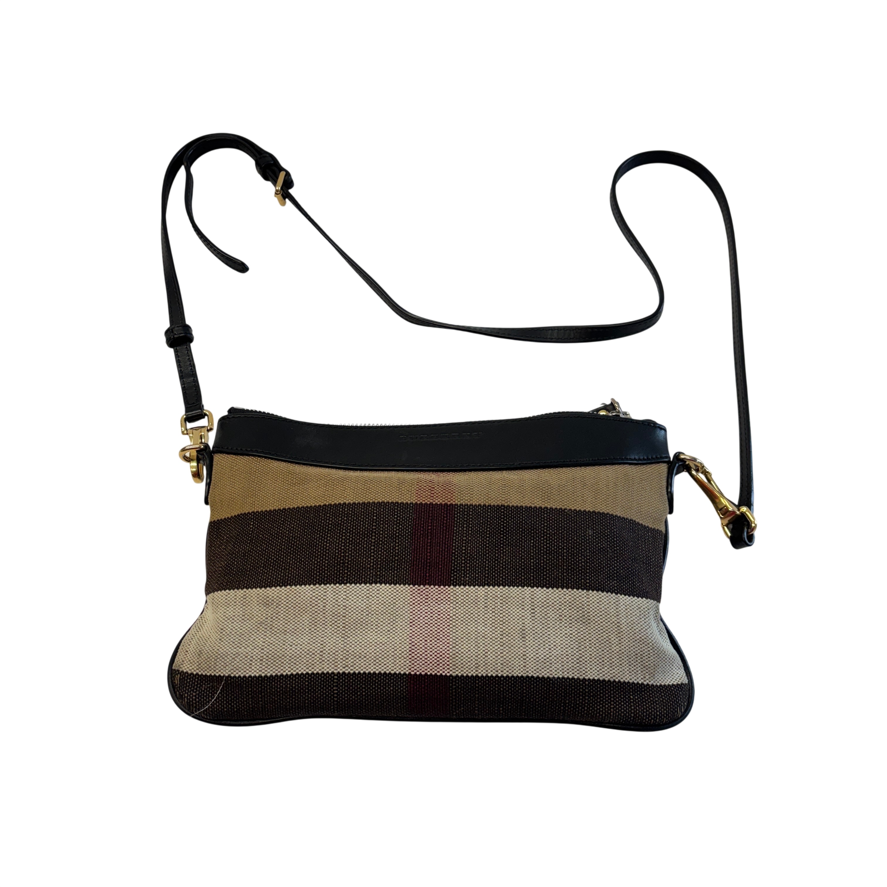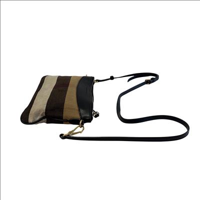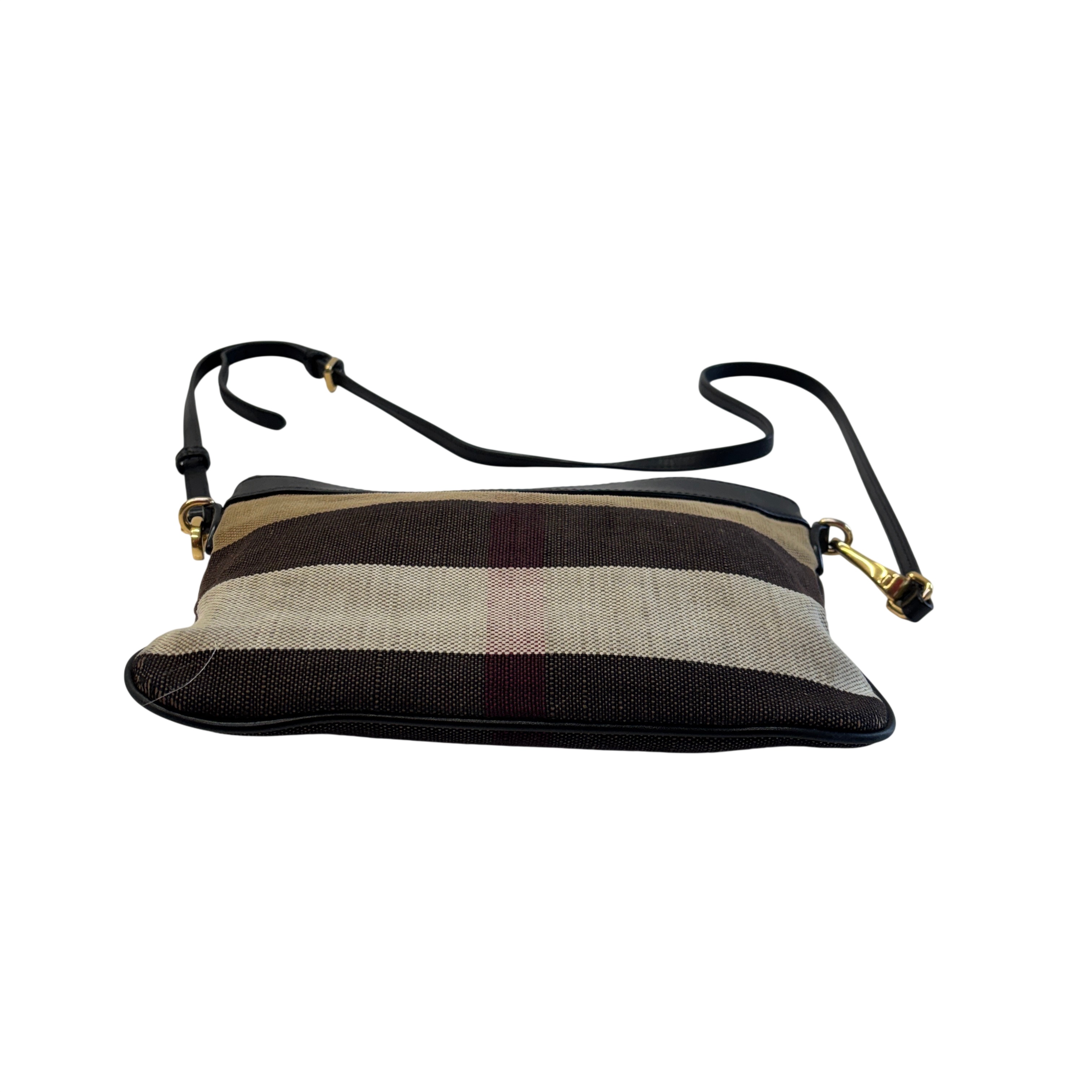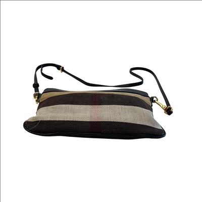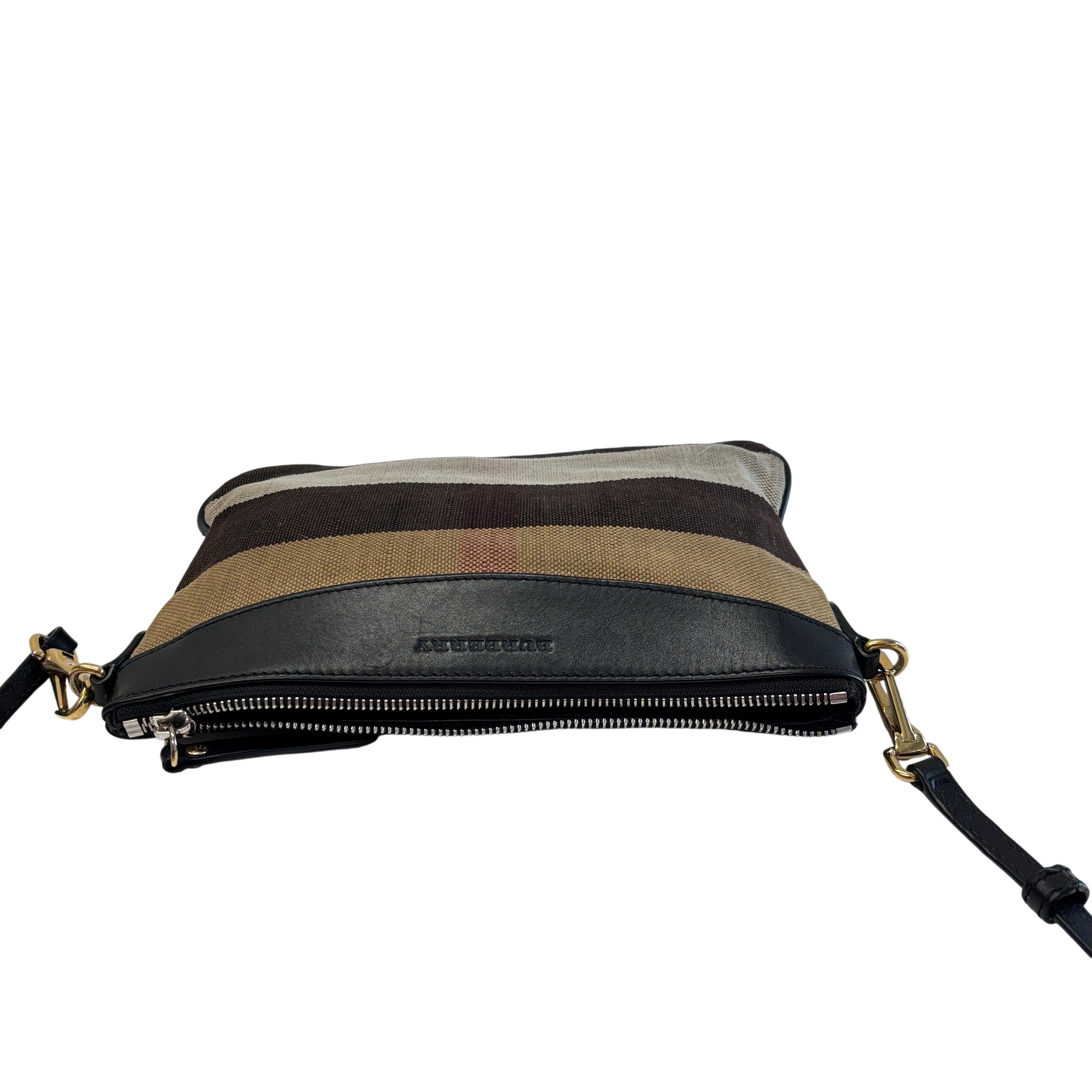 The Other Peyton Burberry Purse features a classic striped canvas design accented with black leather trim and gold-tone hardware. This compact shoulder bag includes an adjustable leather strap and secure zipper closure, making it ideal for everyday use or special occasions. Measuring approximately 9 inches in length, 5 inches in height, and 1.5 inches in width, this lightweight purse offers a stylish and practical accessory for carrying essentials with ease.