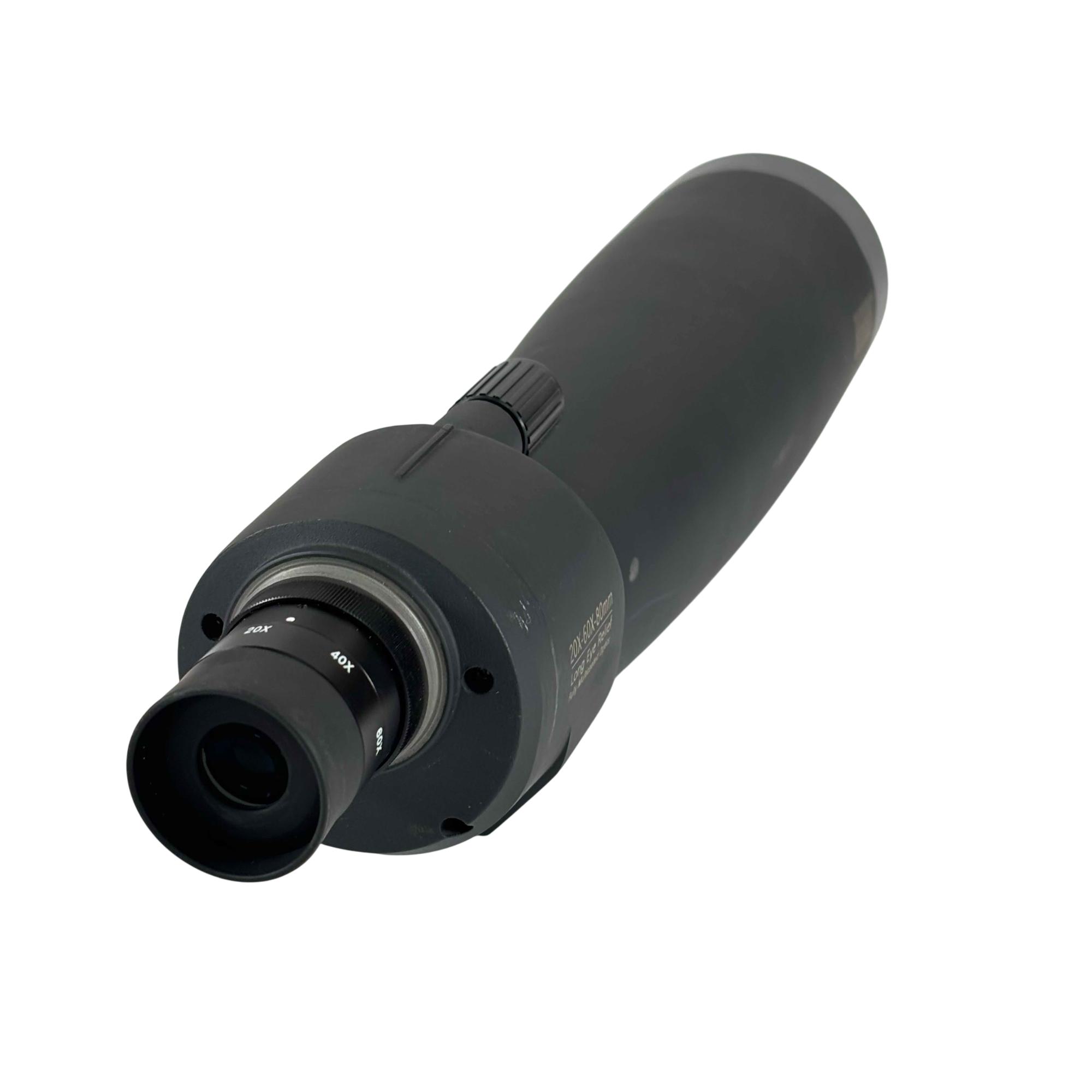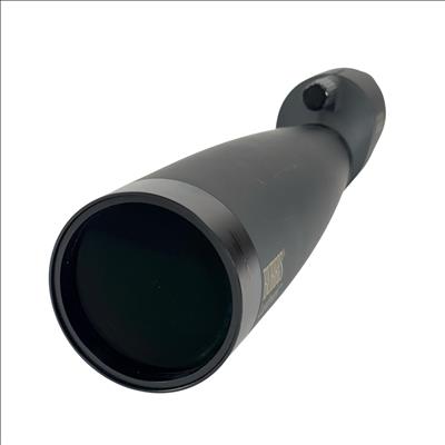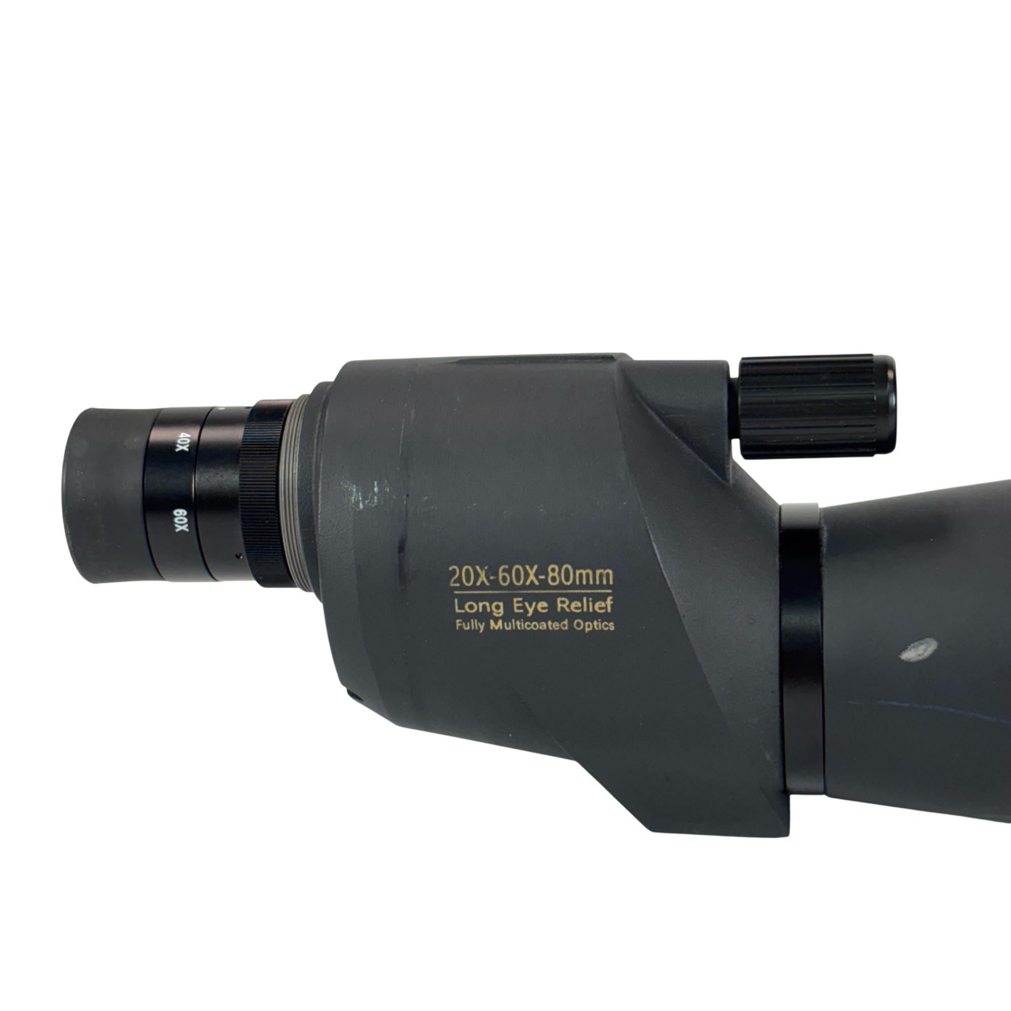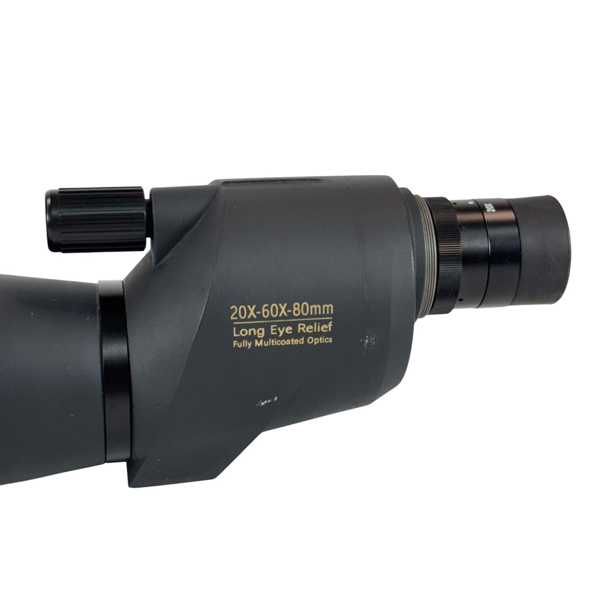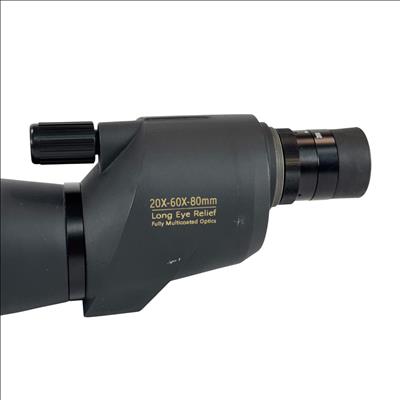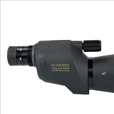 This spotting scope features fully multi-coated optics for a sharp, clear image and a durable charcoal rubber weather-resistant exterior. It offers a variable 20–60x magnification with an 80 mm objective lens, .8 inch eye relief, and a field of view ranging from 105 feet at 20x to 52 feet at 60x. The scope measures 17.5 inches, weighs 42 ounces, and is built to be fogproof and shockproof for reliable performance in demanding conditions.