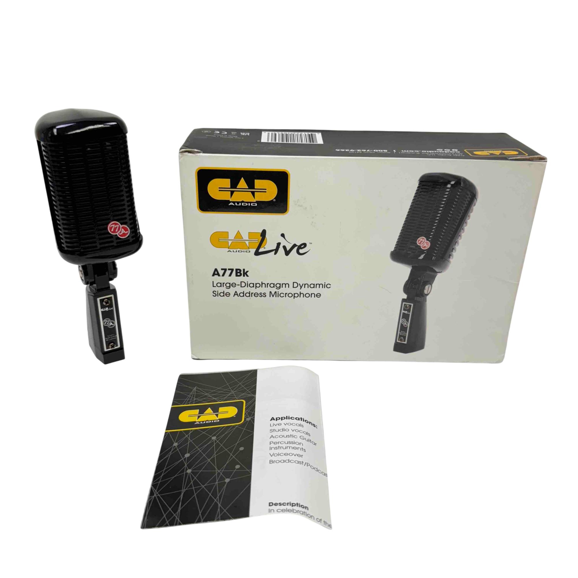 Experience classic sound with the CAD Audio A77Bk, a large-diaphragm dynamic side address microphone crafted for both studio and live applications. Featuring a vintage-inspired design and advanced internal components, the A77Bk delivers exceptional clarity for vocals, instruments, podcasts, and broadcasting. Complete with its original box and manual, this microphone makes a stylish and reliable addition to any audio setup.