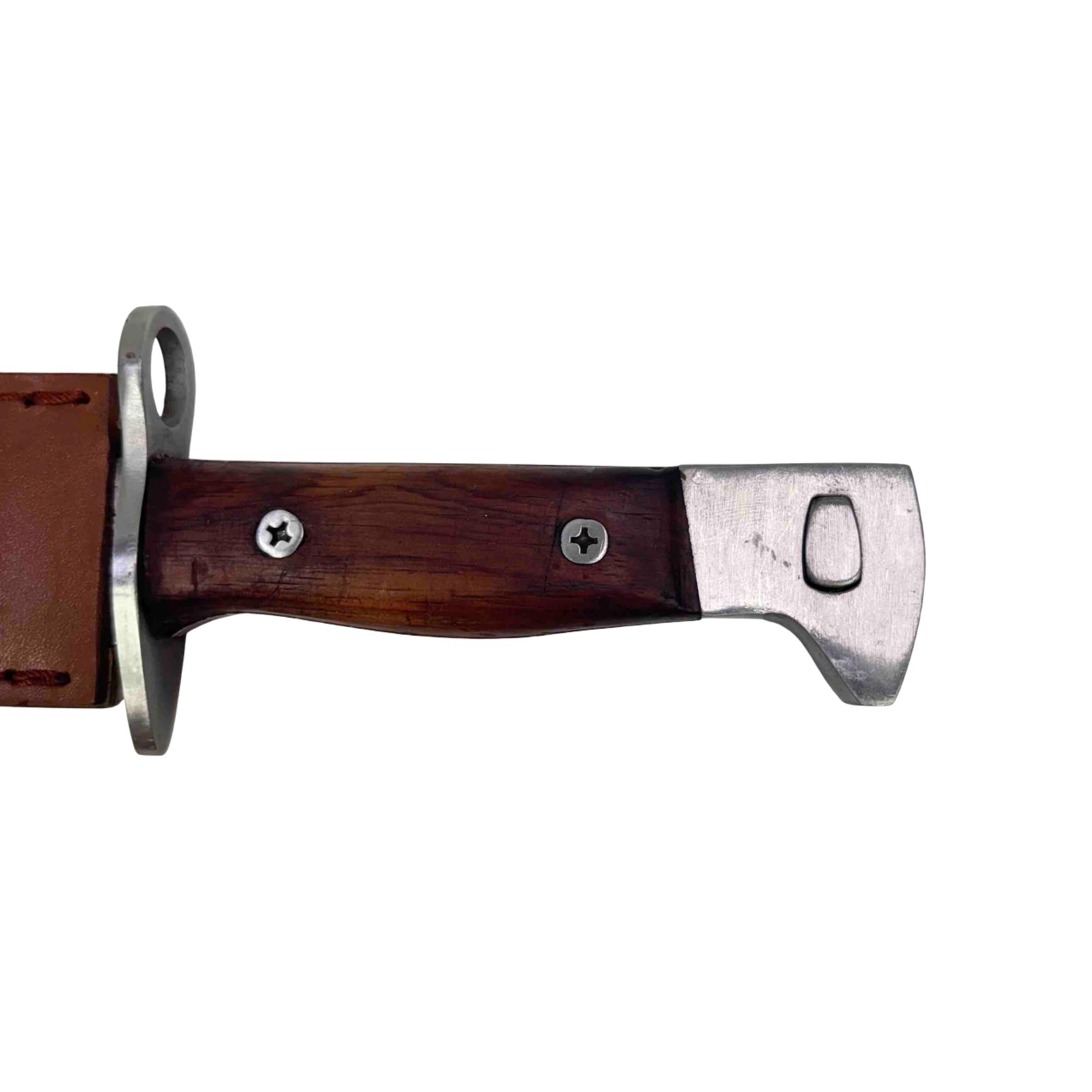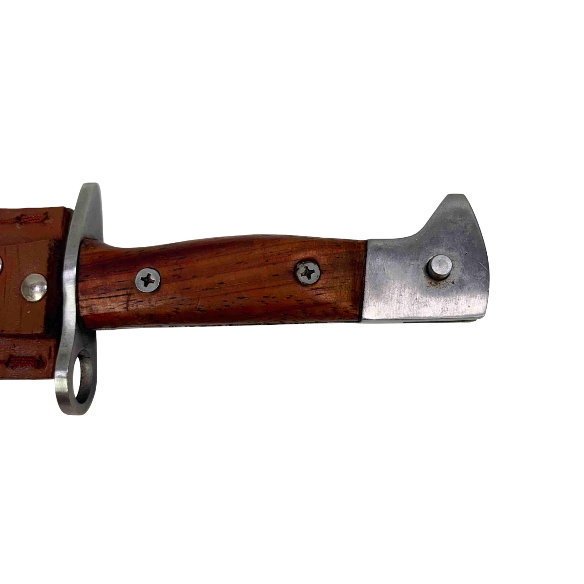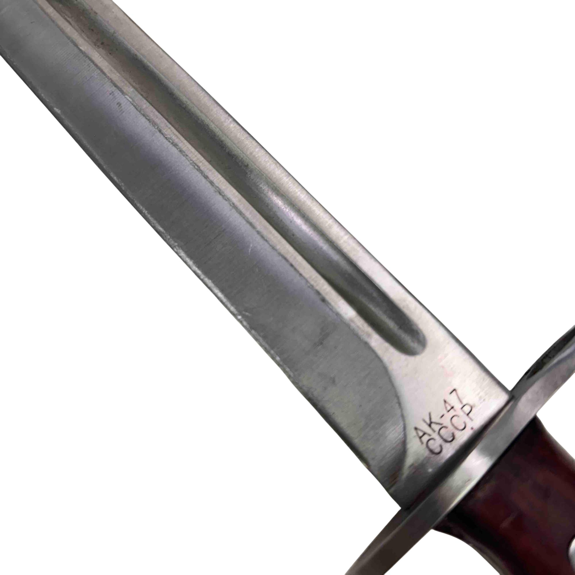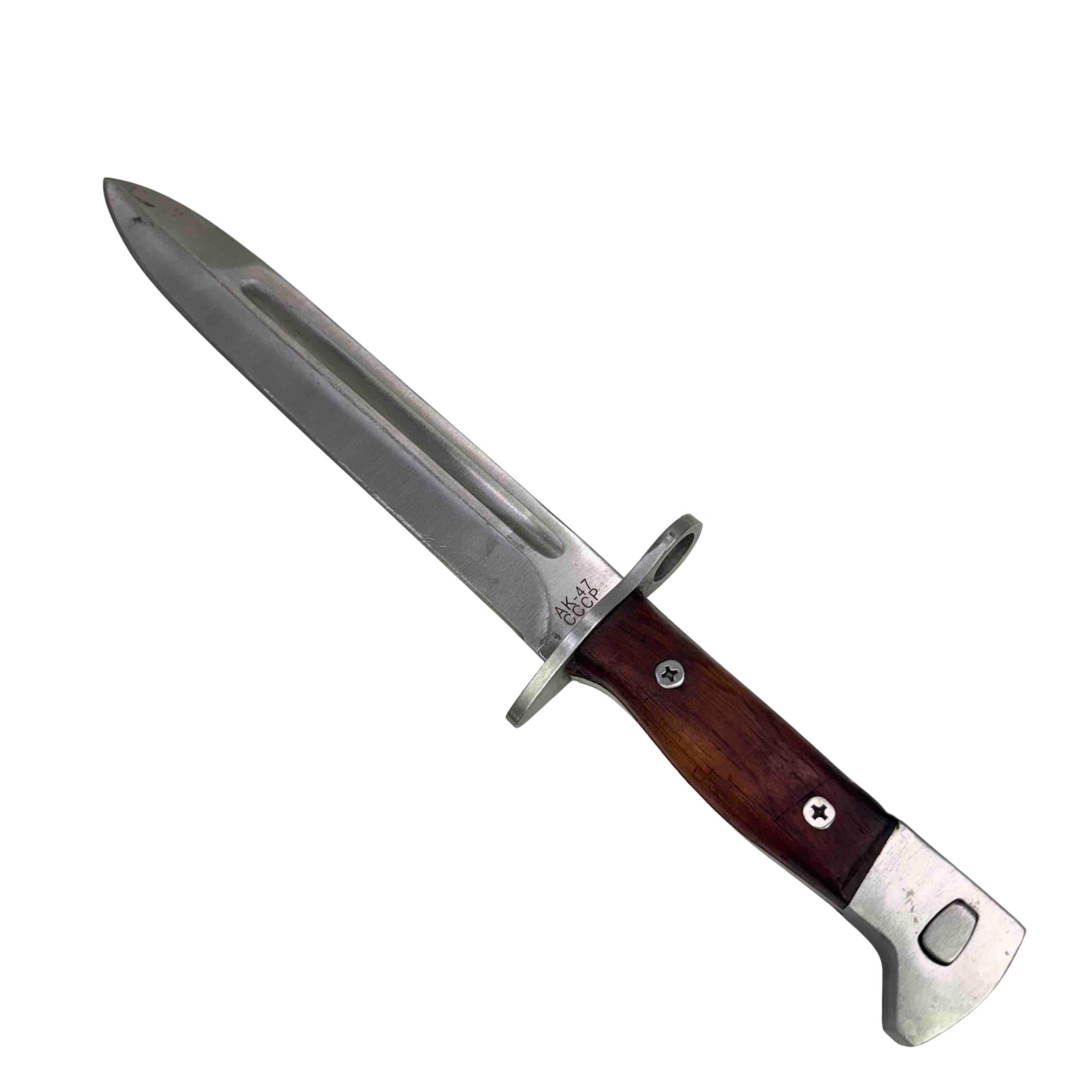 Embrace a piece of history with this CCCP AK-47 Bayonet Reproduction Knife. Meticulously crafted to resemble an iconic Cold War weapon, this knife features a striking wooden handle and comes with a durable leather sheath, making it an impressive addition to any collection. Whether for display or practical use, this reproduction knife captures the essence of the original with remarkable detail.