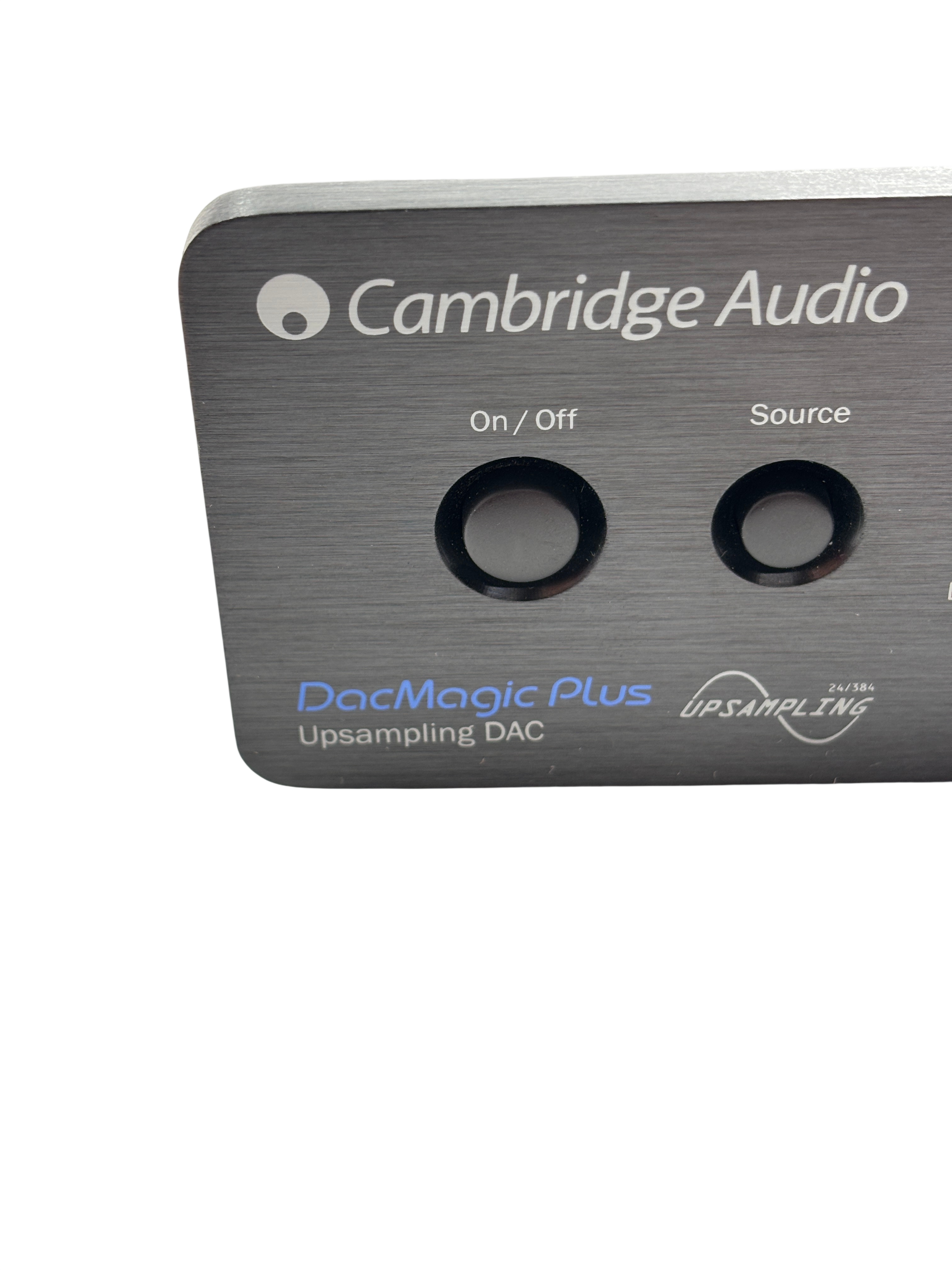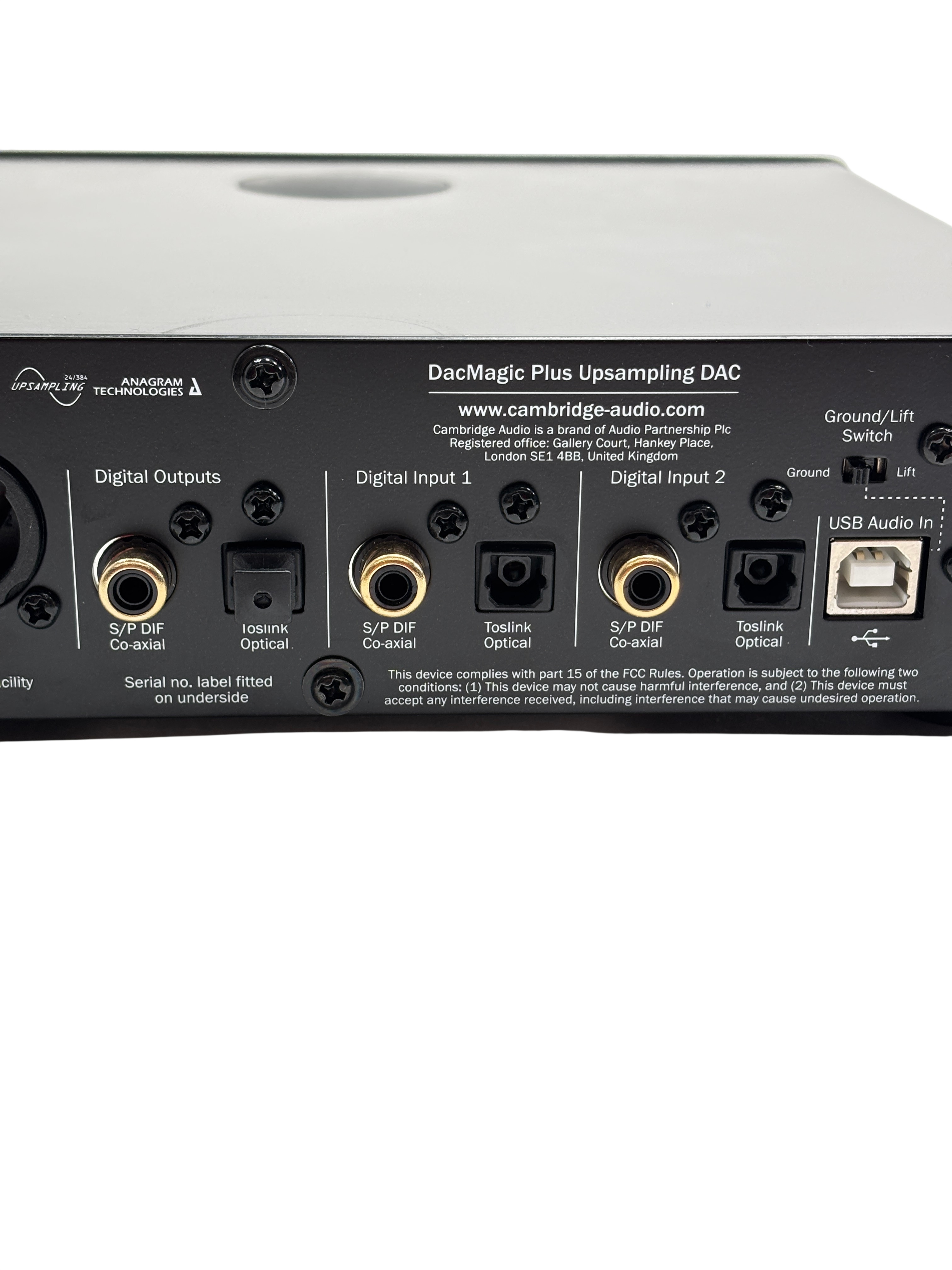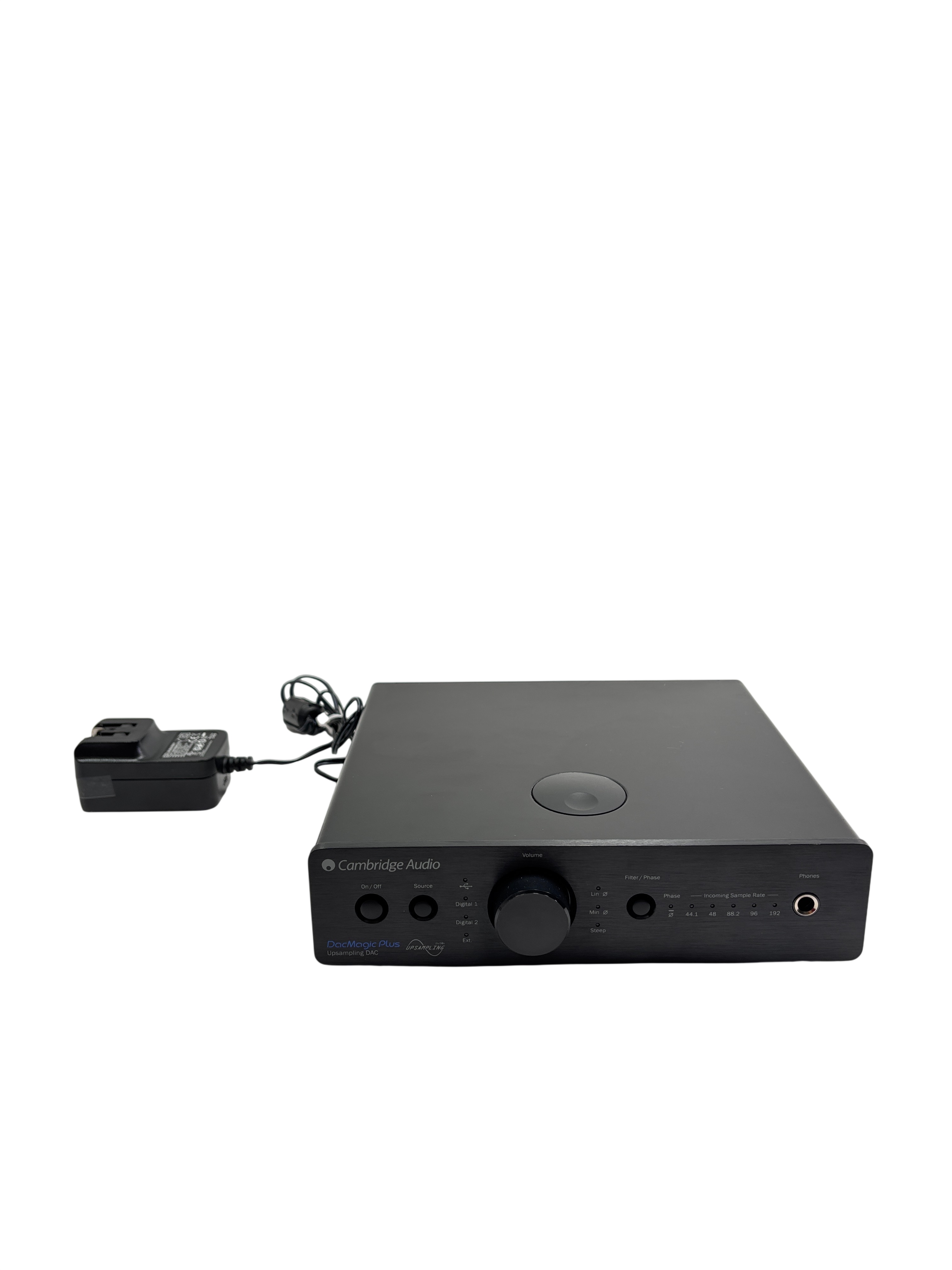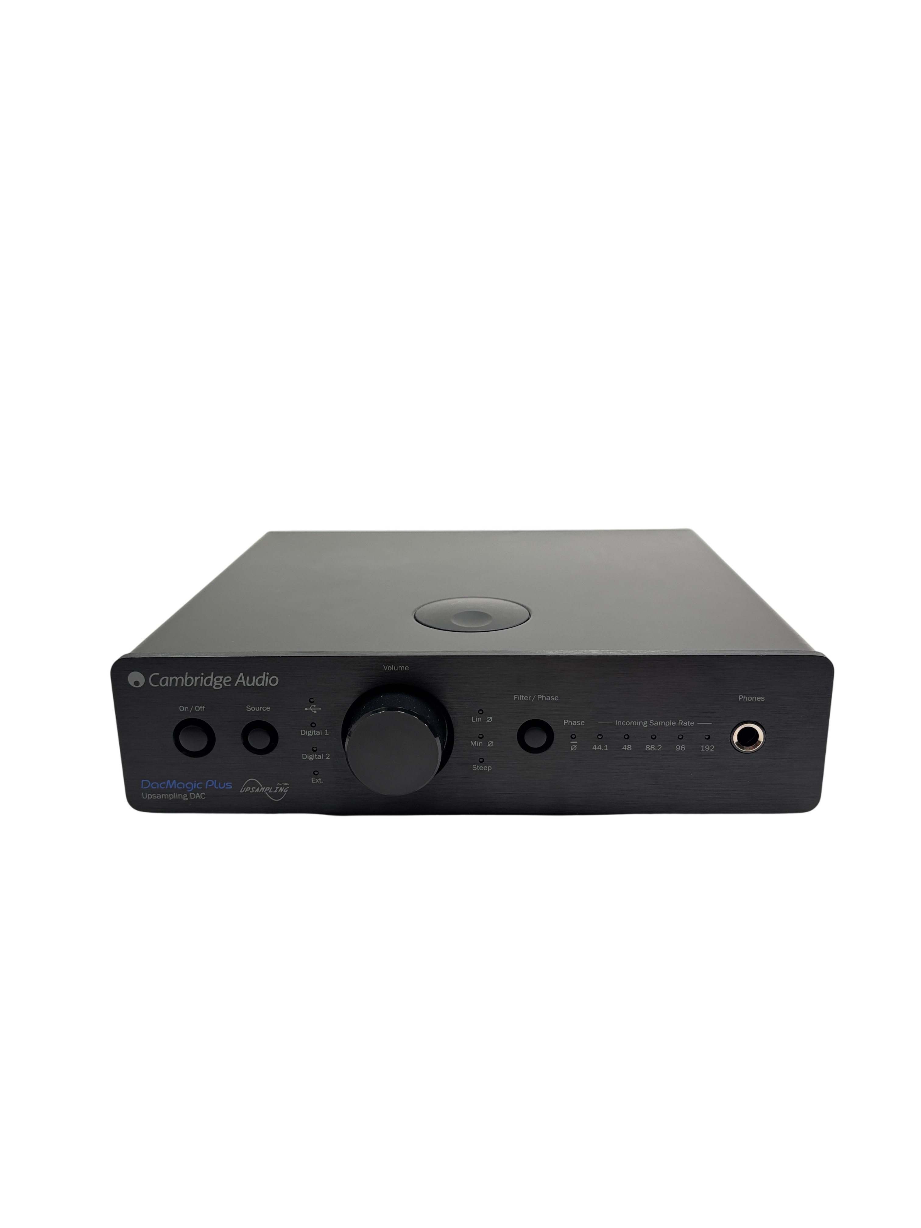 The Cambridge Audio DacMagic Plus Upsampling DAC is a high-quality digital to analog converter designed to enhance your audio experience. Featuring multiple digital inputs including USB, coaxial, and optical, this DAC supports high-resolution audio up to 192 kHz. It includes a ground/lift switch to reduce interference, a headphone output with volume control, and filter/phase adjustment options. Ideal for audiophiles seeking improved sound quality from digital sources.