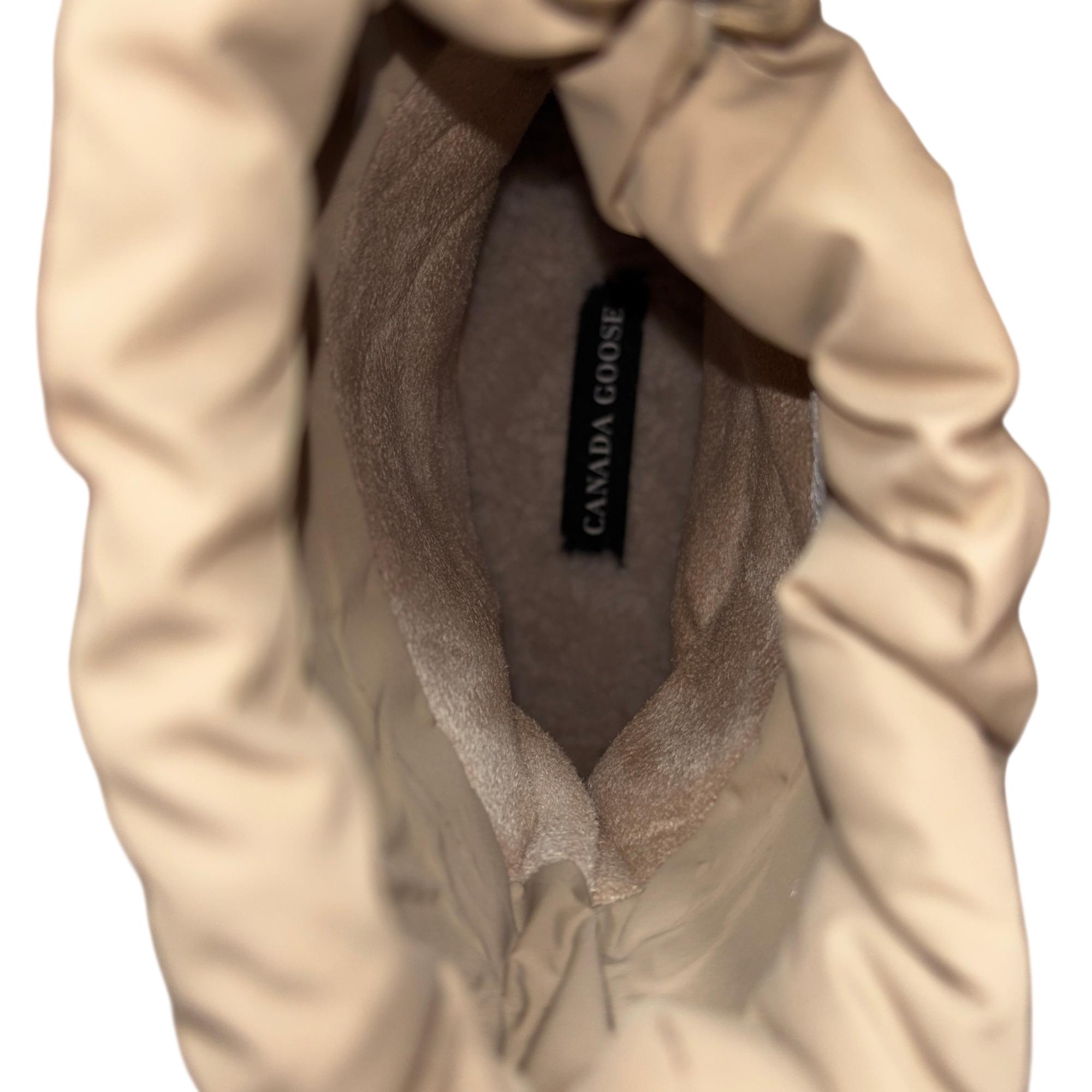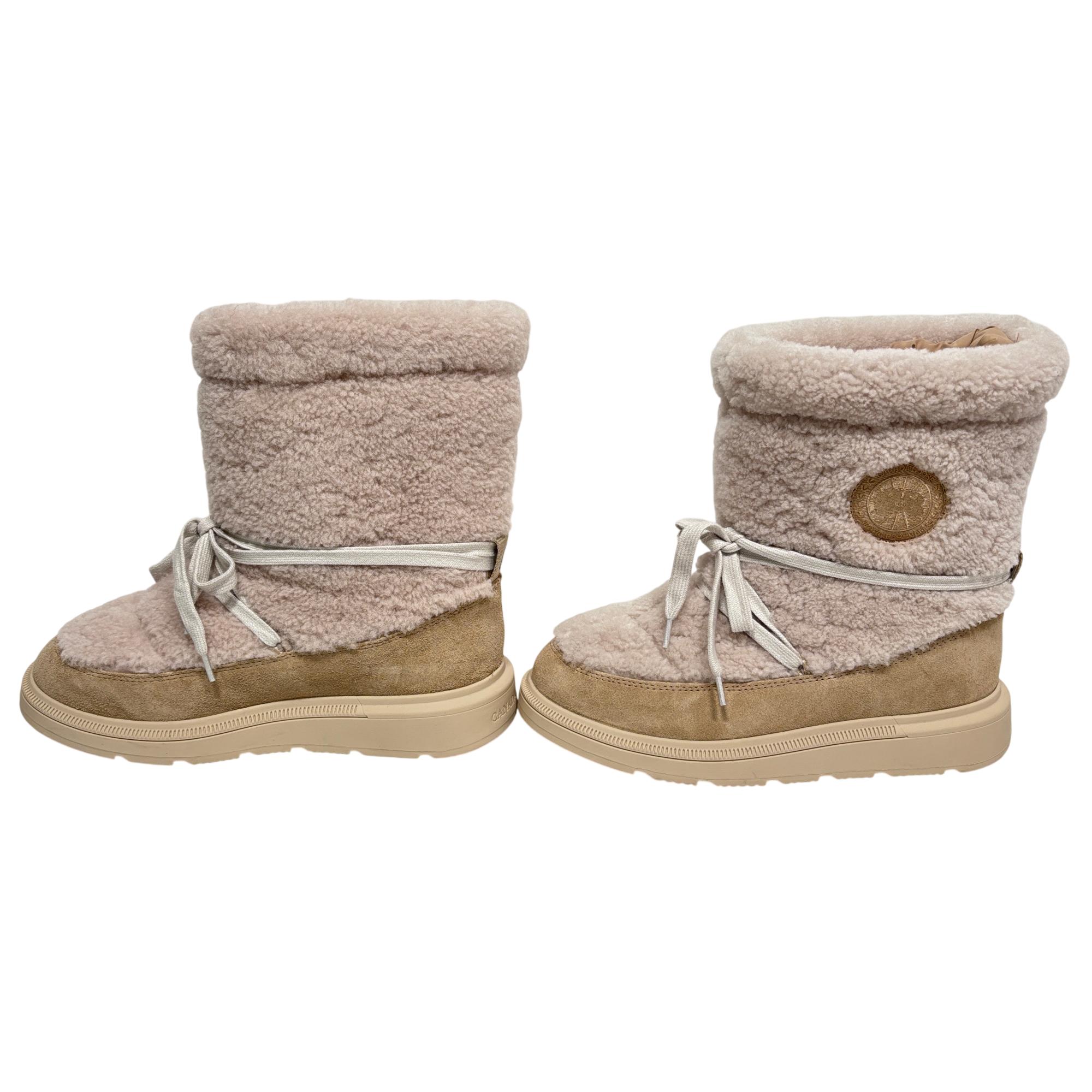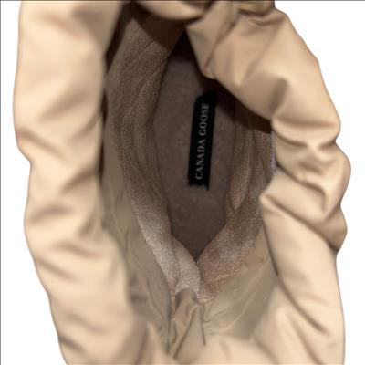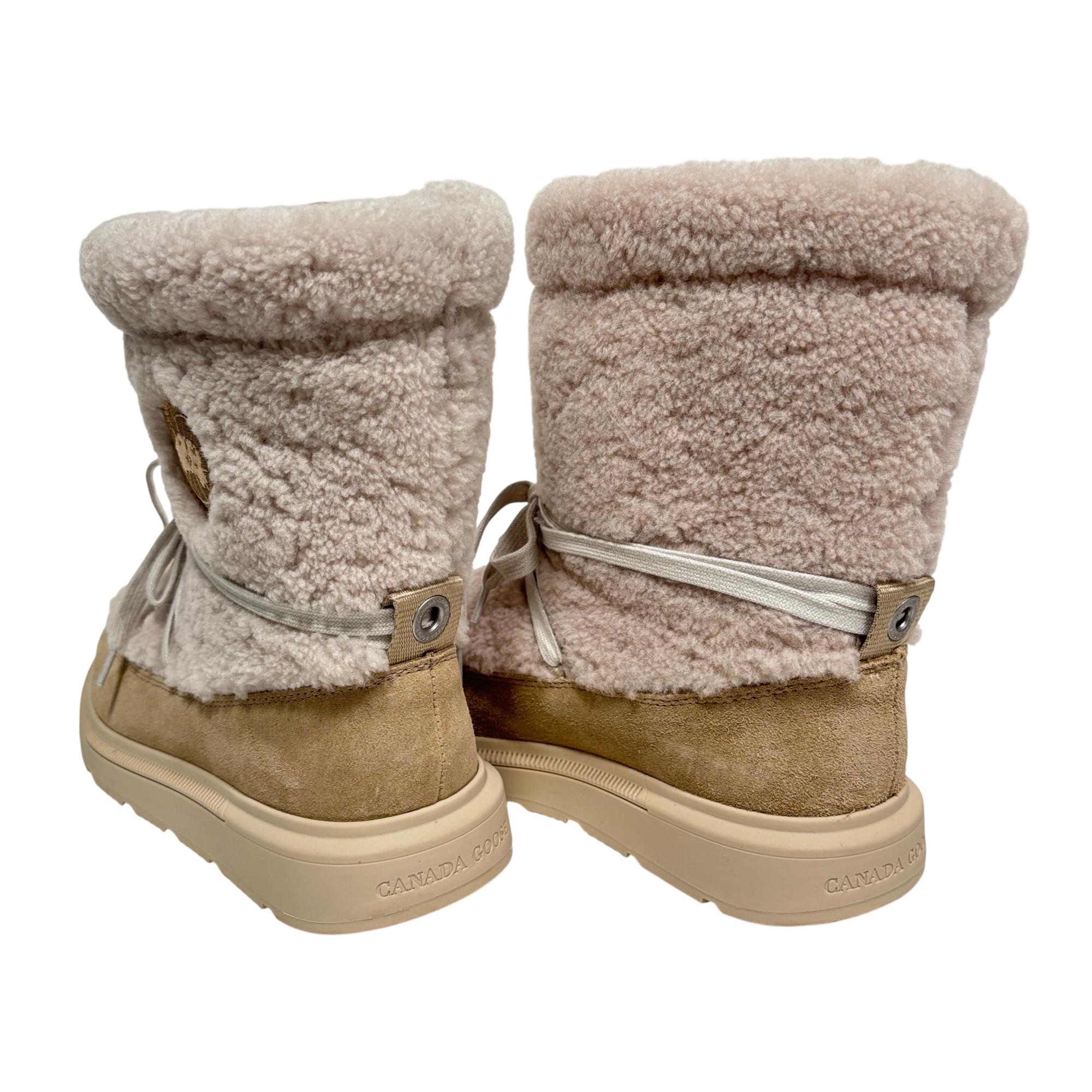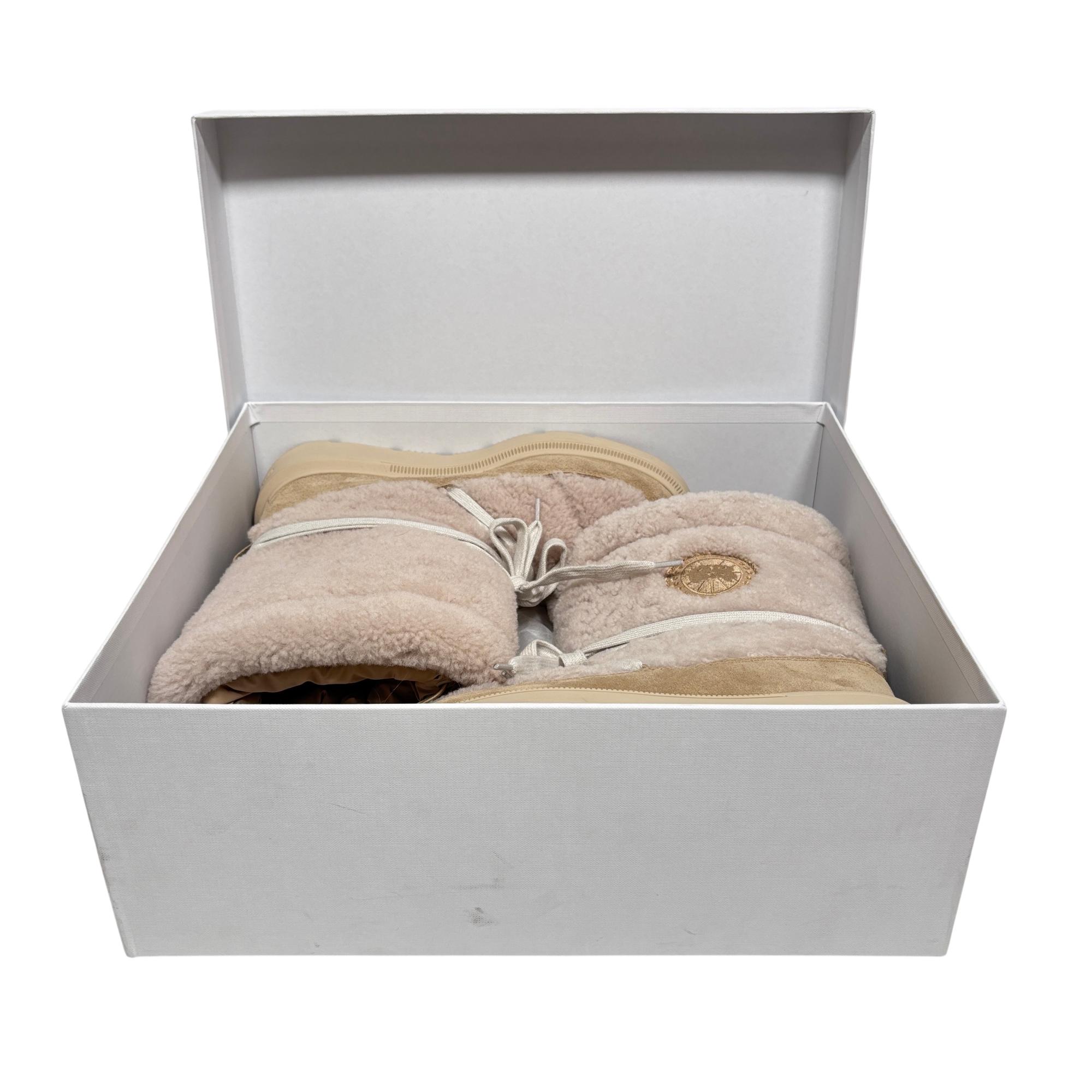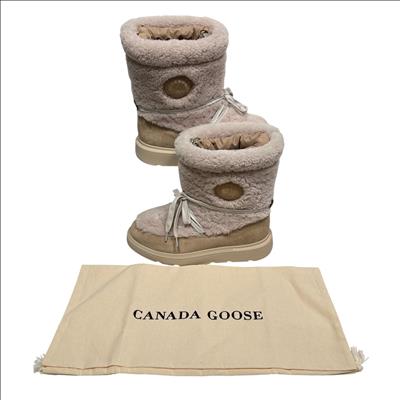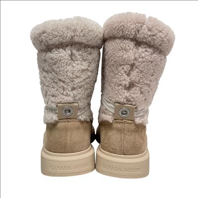 Canada Goose Demma Shearling Puffer Boots in beige feature a luxurious shearling lining and a puffer-style exterior crafted for exceptional warmth and comfort. Designed with premium materials, these boots combine suede and plush shearling for a stylish yet functional winter footwear option. Their detailed construction includes durable soles and secure closures, making them ideal for cold weather conditions.