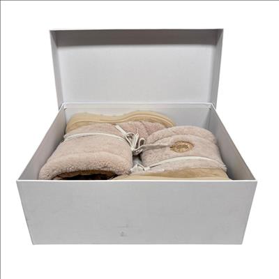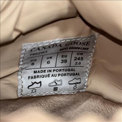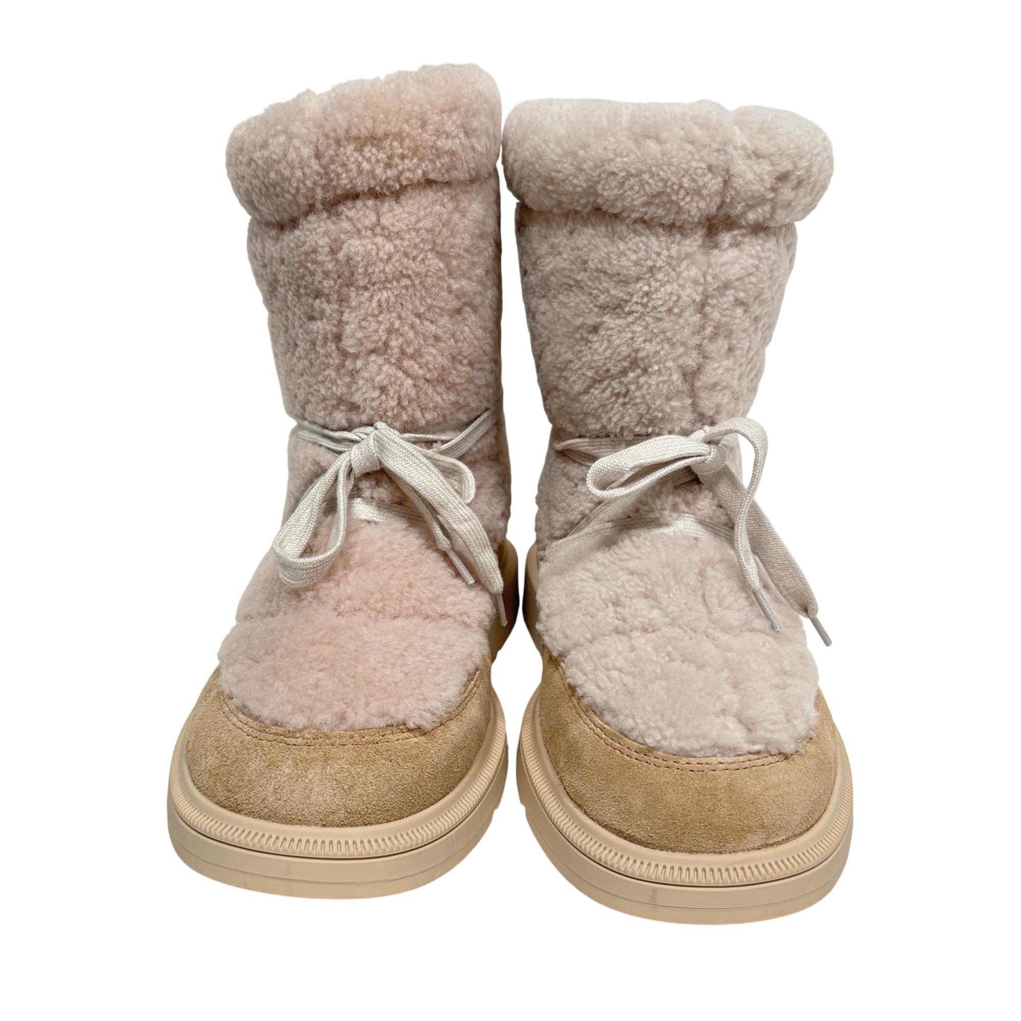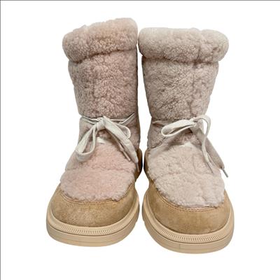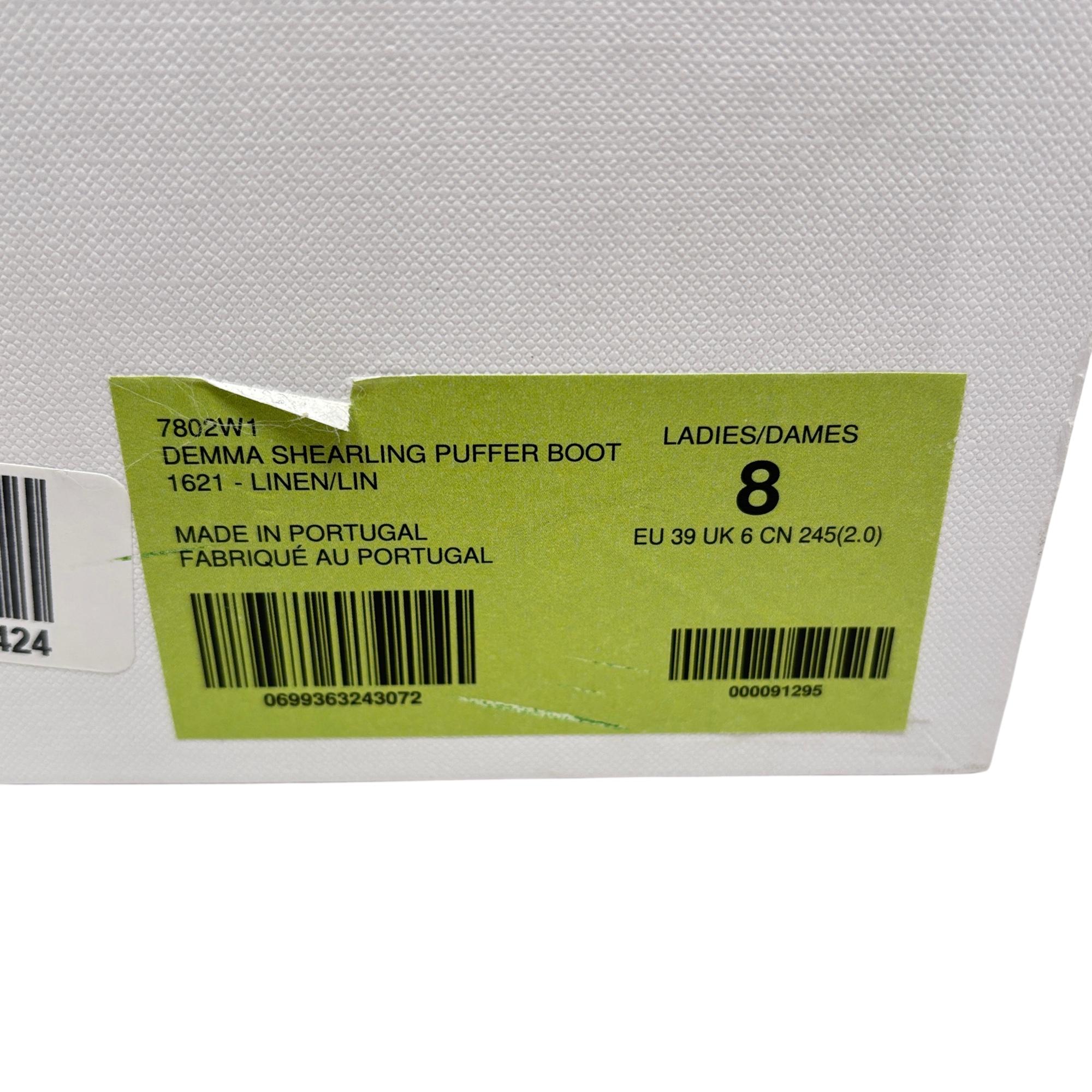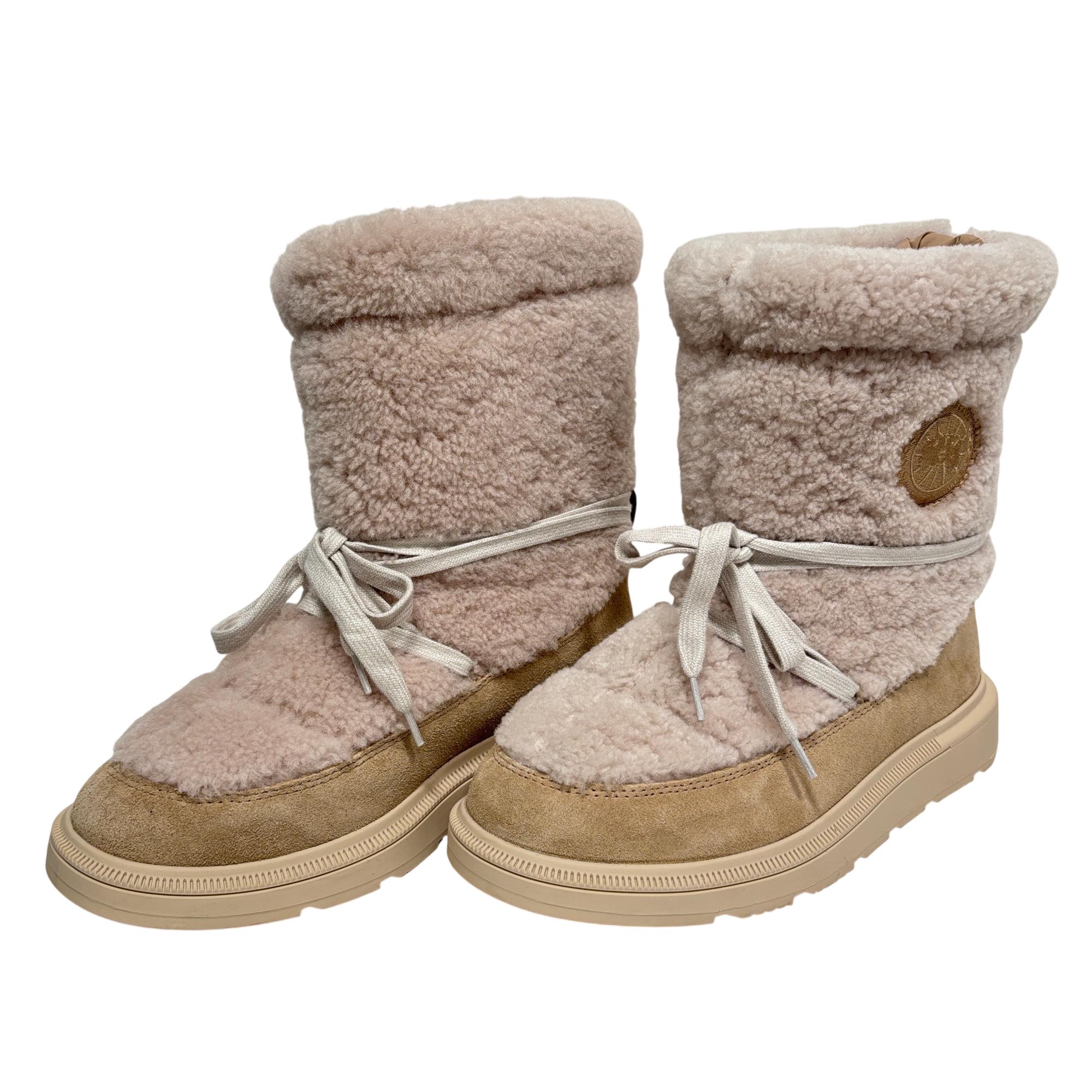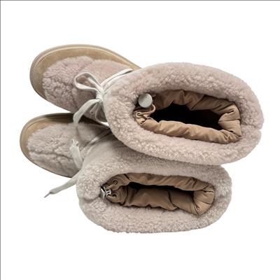 Canada Goose Demma Shearling Puffer Boots in beige feature a luxurious shearling lining and a puffer-style exterior crafted for exceptional warmth and comfort. Designed with premium materials, these boots combine suede and plush shearling for a stylish yet functional winter footwear option. Their detailed construction includes durable soles and secure closures, making them ideal for cold weather conditions.