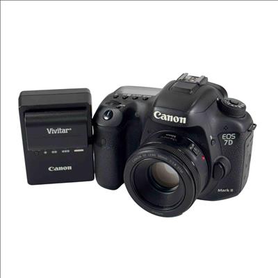 The Canon EOS 7D Mark II is a high-performance DSLR designed to handle demanding shooting conditions with speed and precision. Its 20.2MP APS-C CMOS sensor works with dual DIGIC 6 processors for fast image handling and excellent detail. A 65-point all cross-type autofocus system tracks subjects accurately across a wide area of the frame, making it ideal for action and wildlife. Built with a durable, ergonomic body, it delivers reliable performance and responsive control for serious photographers.