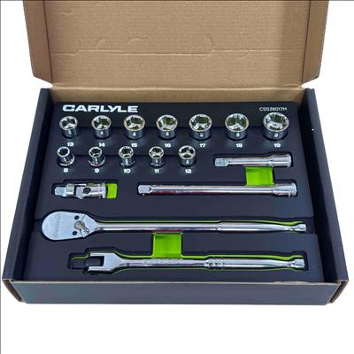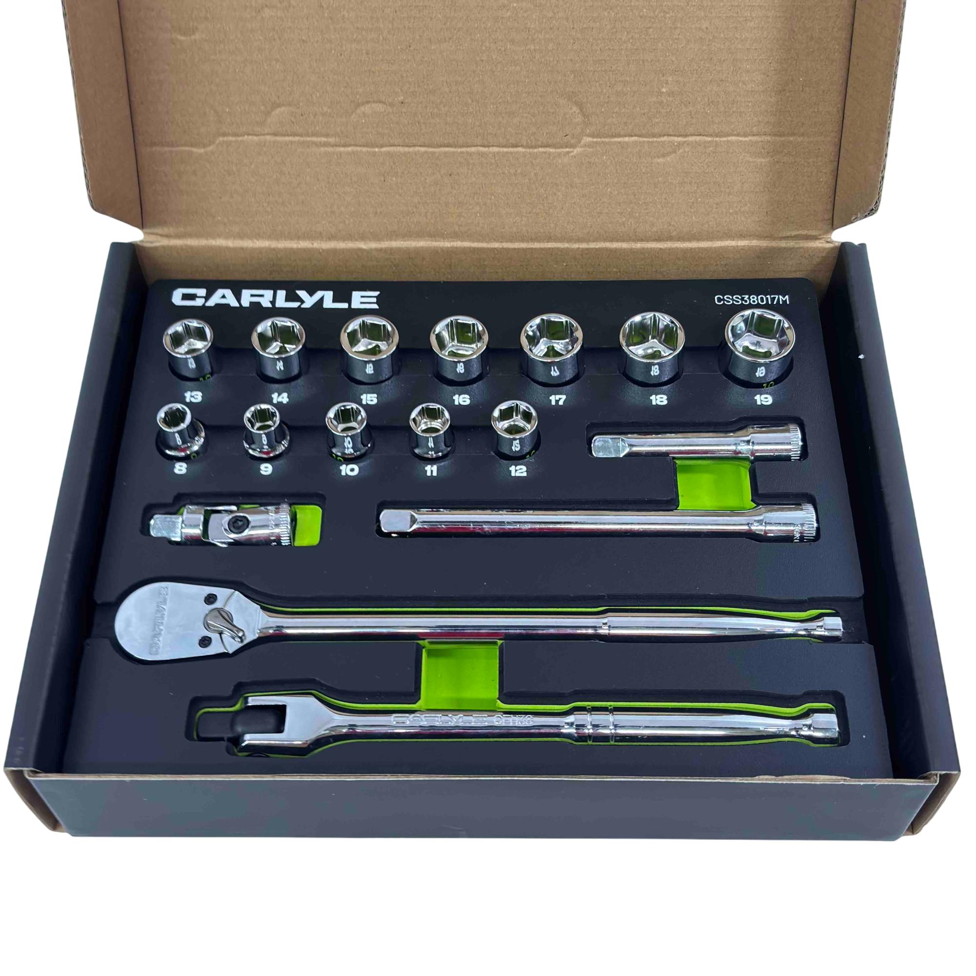 Upgrade your toolbox with the Carlyle CSS38017M 17-piece 3/8-inch drive metric mechanics tool set, featuring high-quality sockets and a durable ratchet for professional and DIY automotive use. This set includes metric sockets from 8mm to 19mm, along with essential accessories like extensions and a breaker bar, all housed in a sturdy organizer for convenient storage and transport. Trusted by mechanics, Carlyle delivers reliability, precision, and long-lasting performance for any repair task.