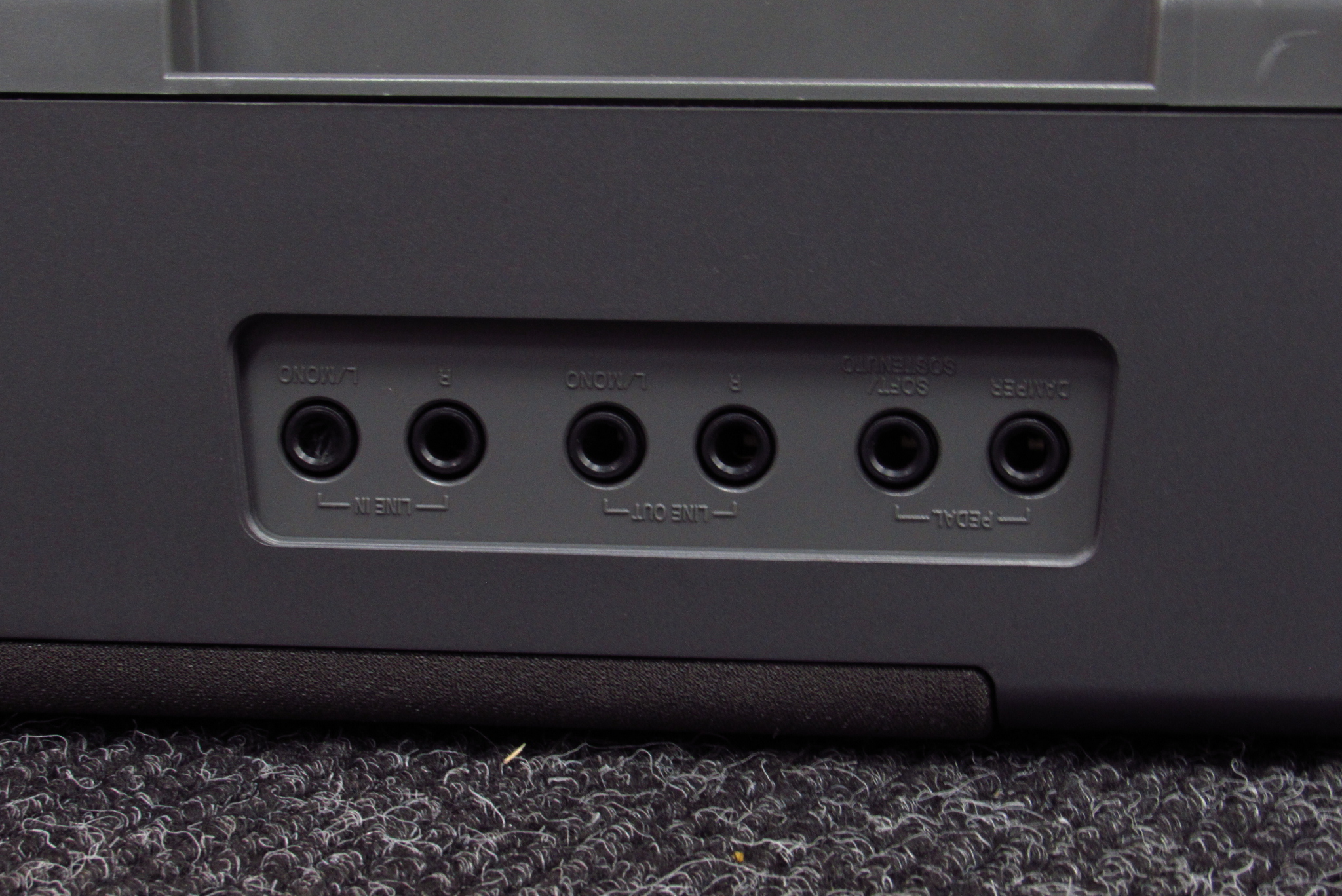 Terminals: headphones x 2, pedal x 2 (damper, soft / sostenuto), LINE IN (L/MONO, R), LINE OUT(L/MONO, R), MIDI IN/OUT/THRU