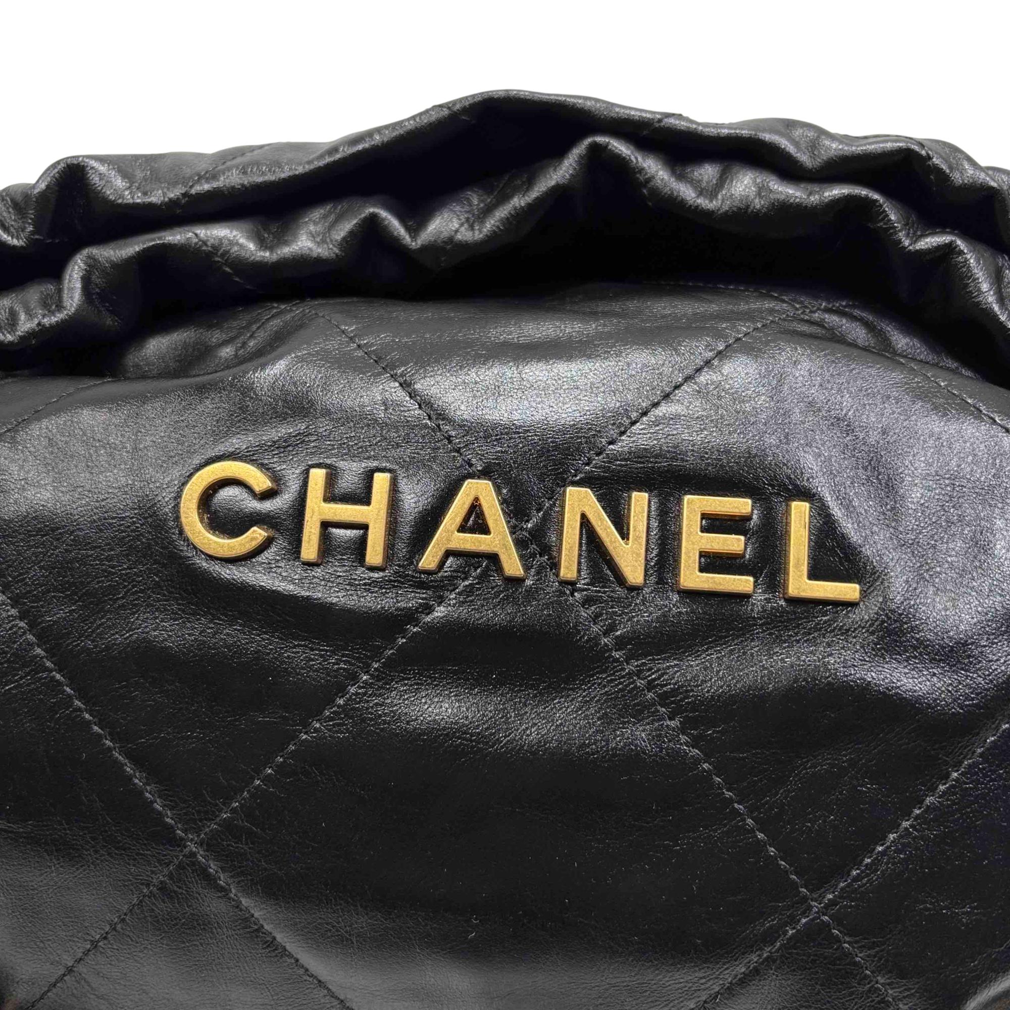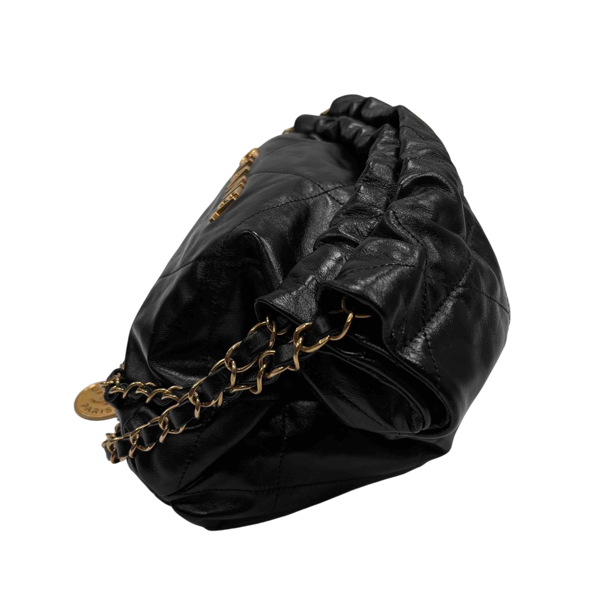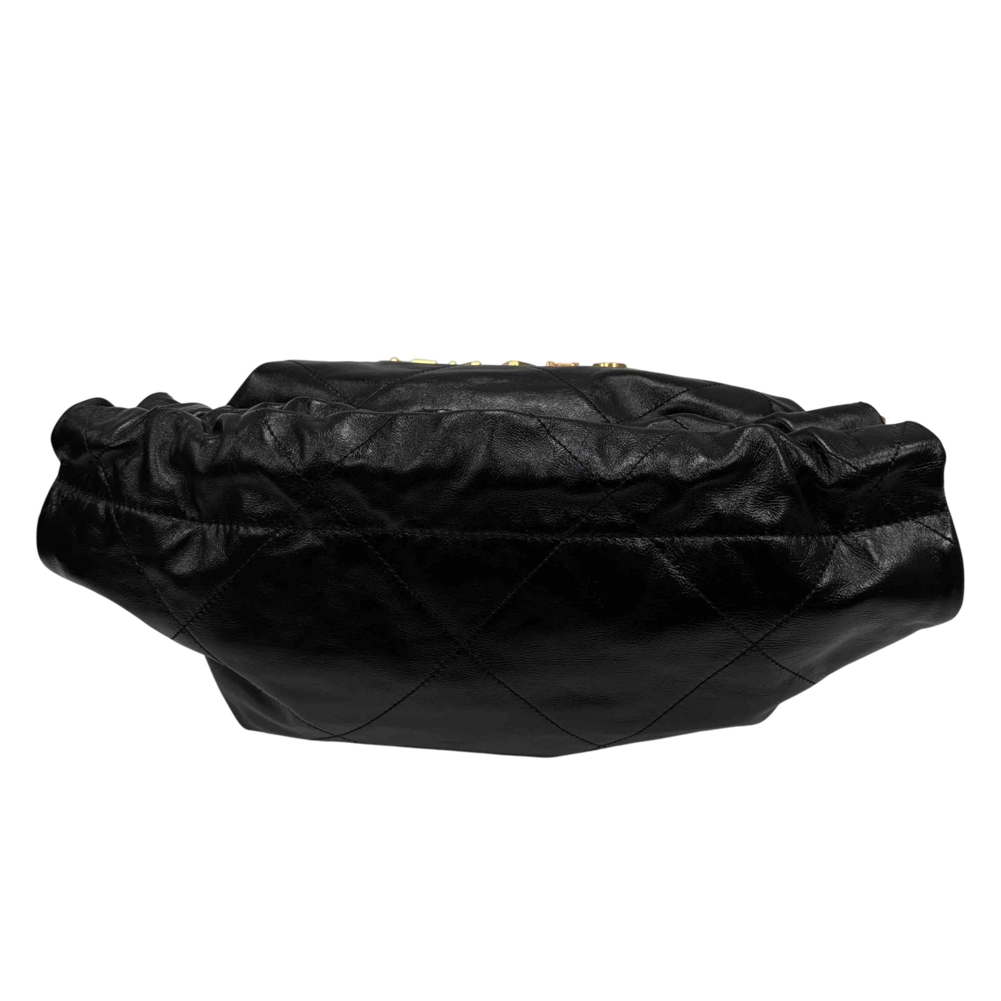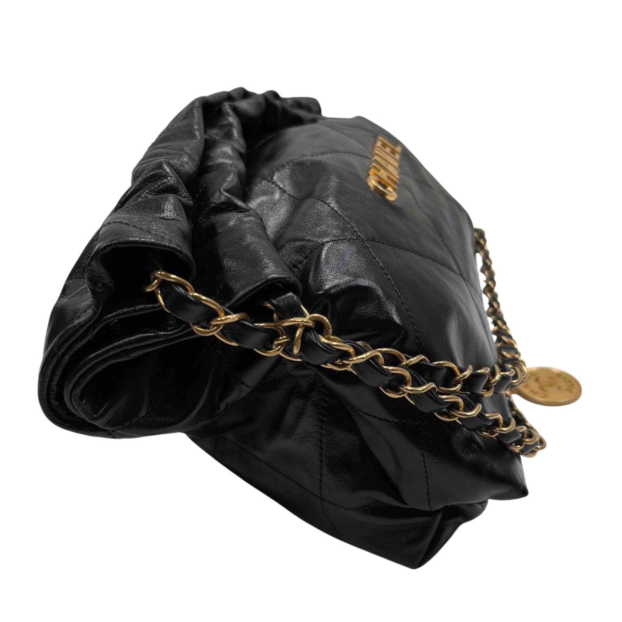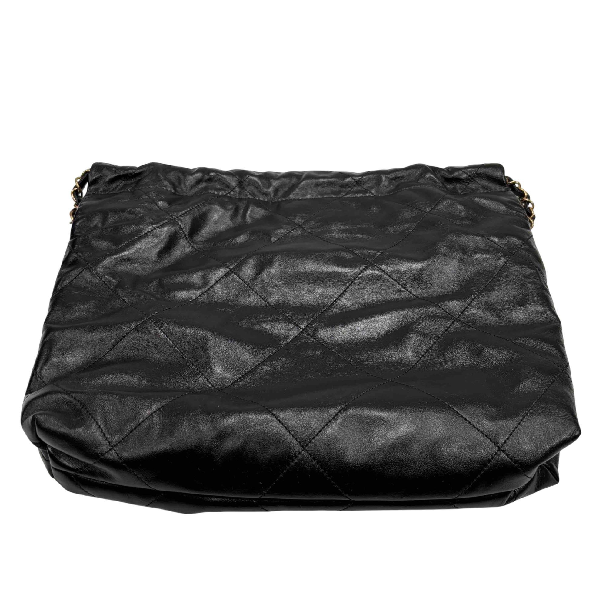 Elevate your style with the Chanel 22 Bag, expertly crafted in luxurious black quilted leather and adorned with iconic gold hardware. This stunning accessory is perfect for any occasion, providing both elegance and practicality with its spacious interior and chic design. Make a statement with this timeless piece that promises to enhance any outfit. Certified authentic by Entrupy.