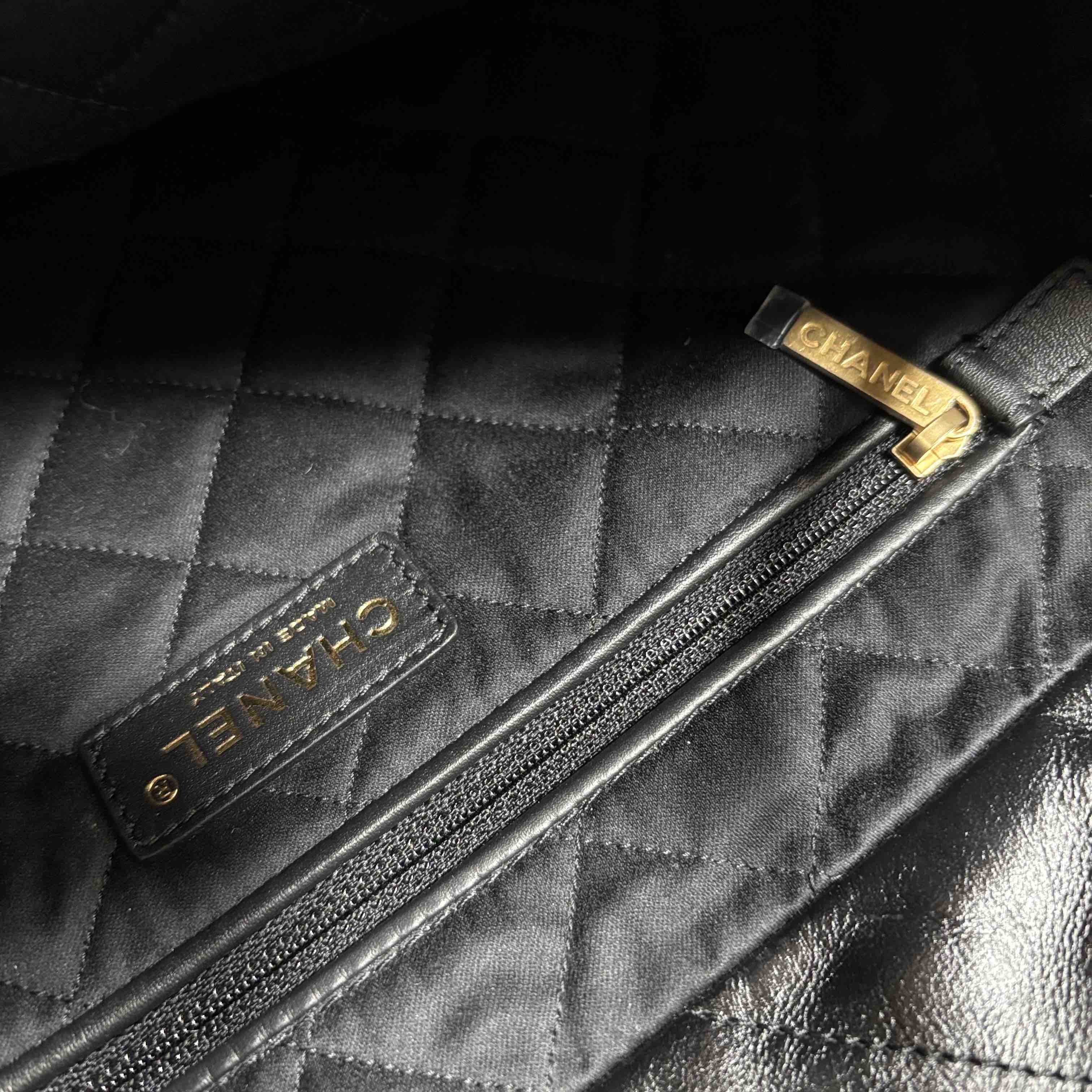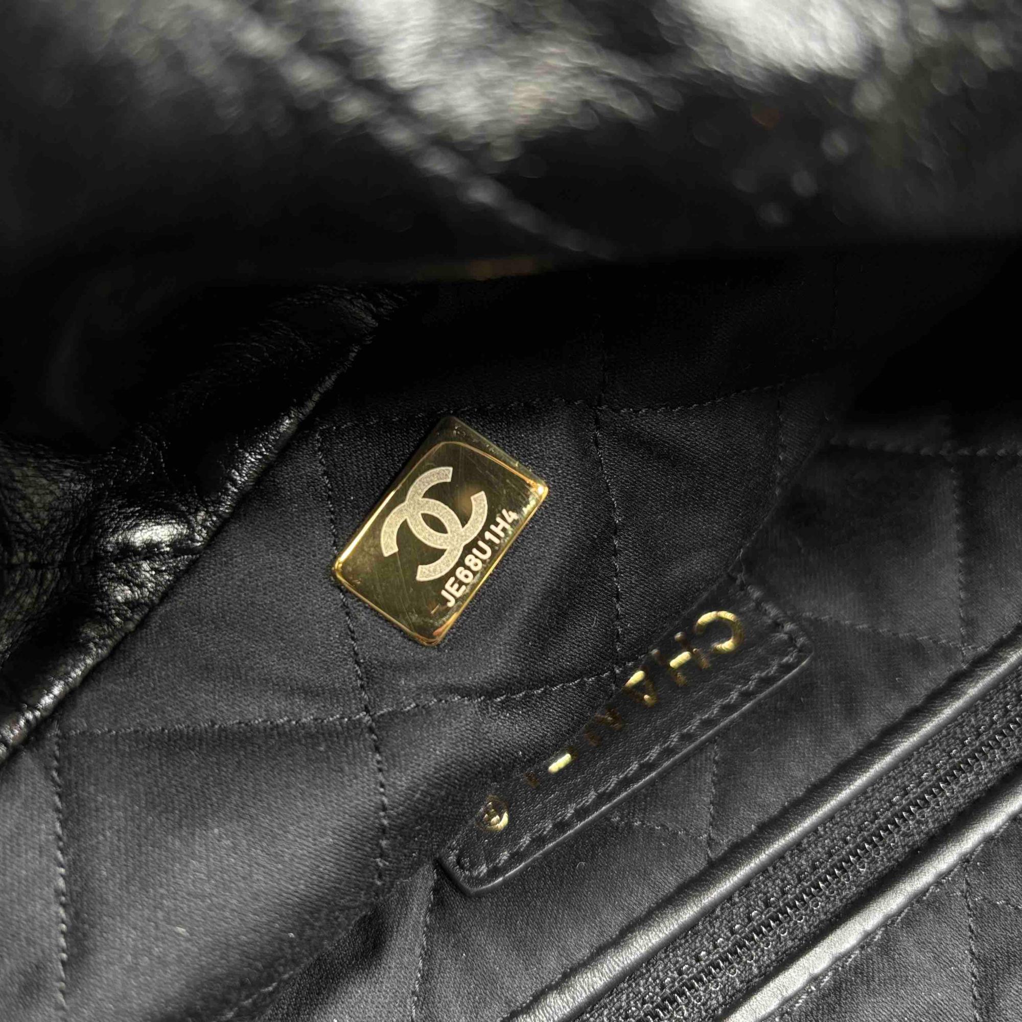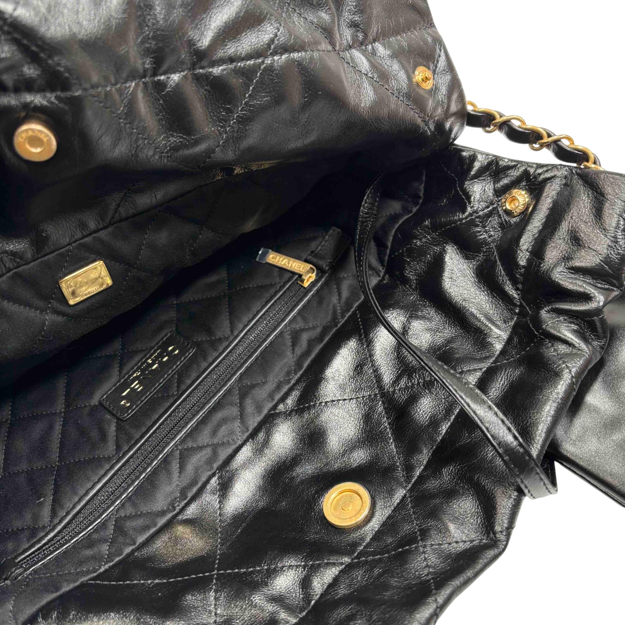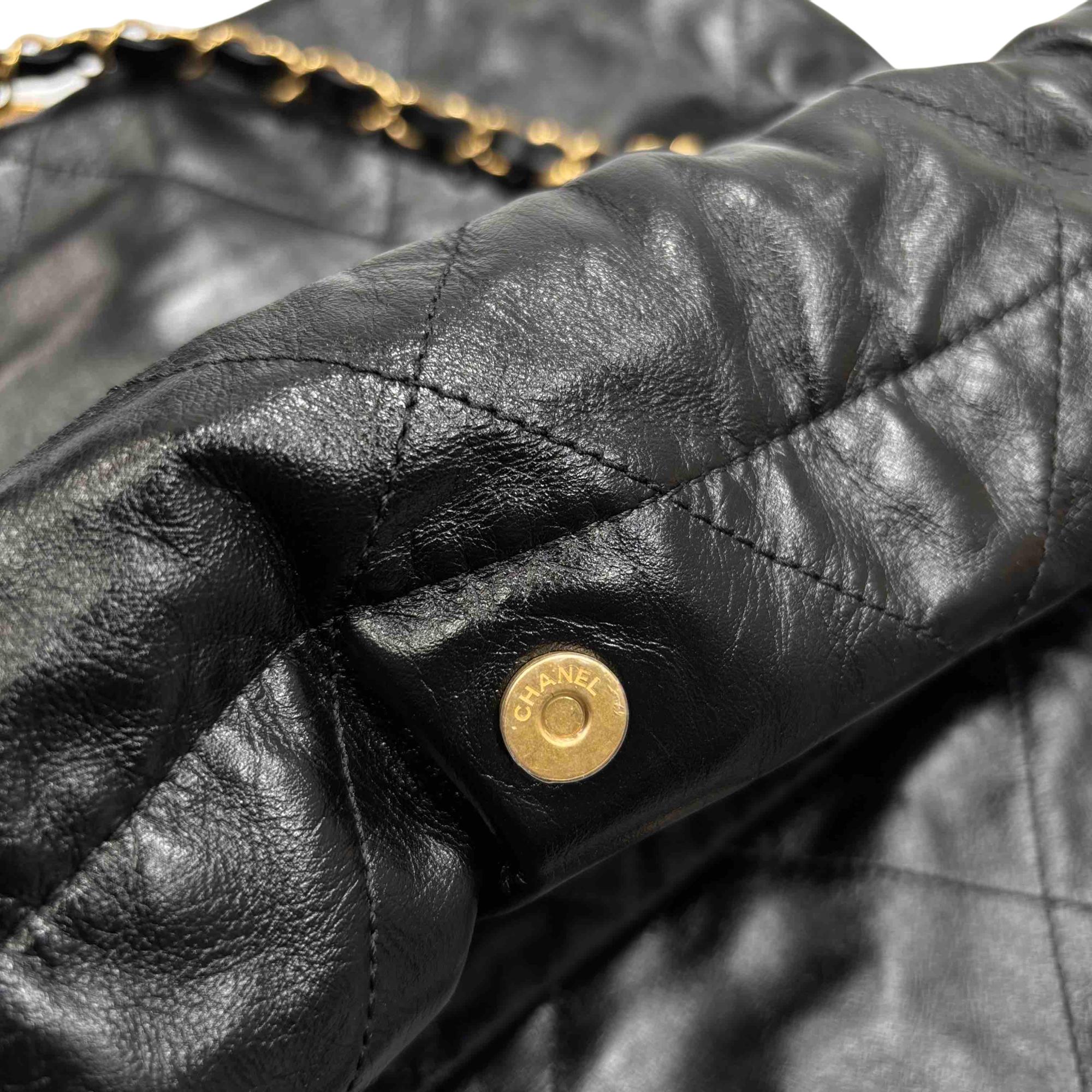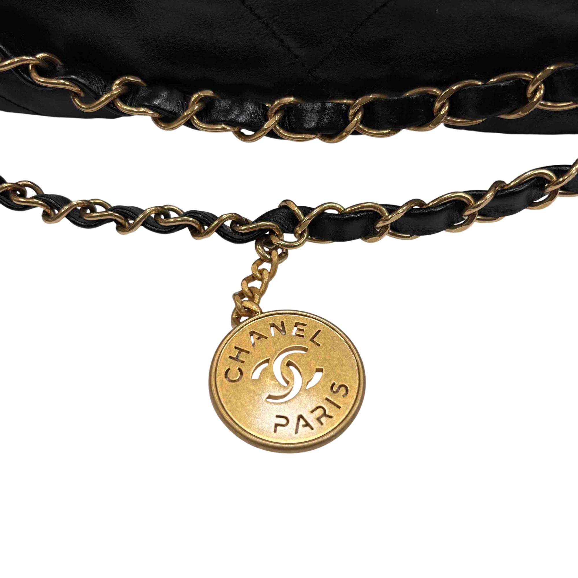 Elevate your style with the Chanel 22 Bag, expertly crafted in luxurious black quilted leather and adorned with iconic gold hardware. This stunning accessory is perfect for any occasion, providing both elegance and practicality with its spacious interior and chic design. Make a statement with this timeless piece that promises to enhance any outfit. Certified authentic by Entrupy.